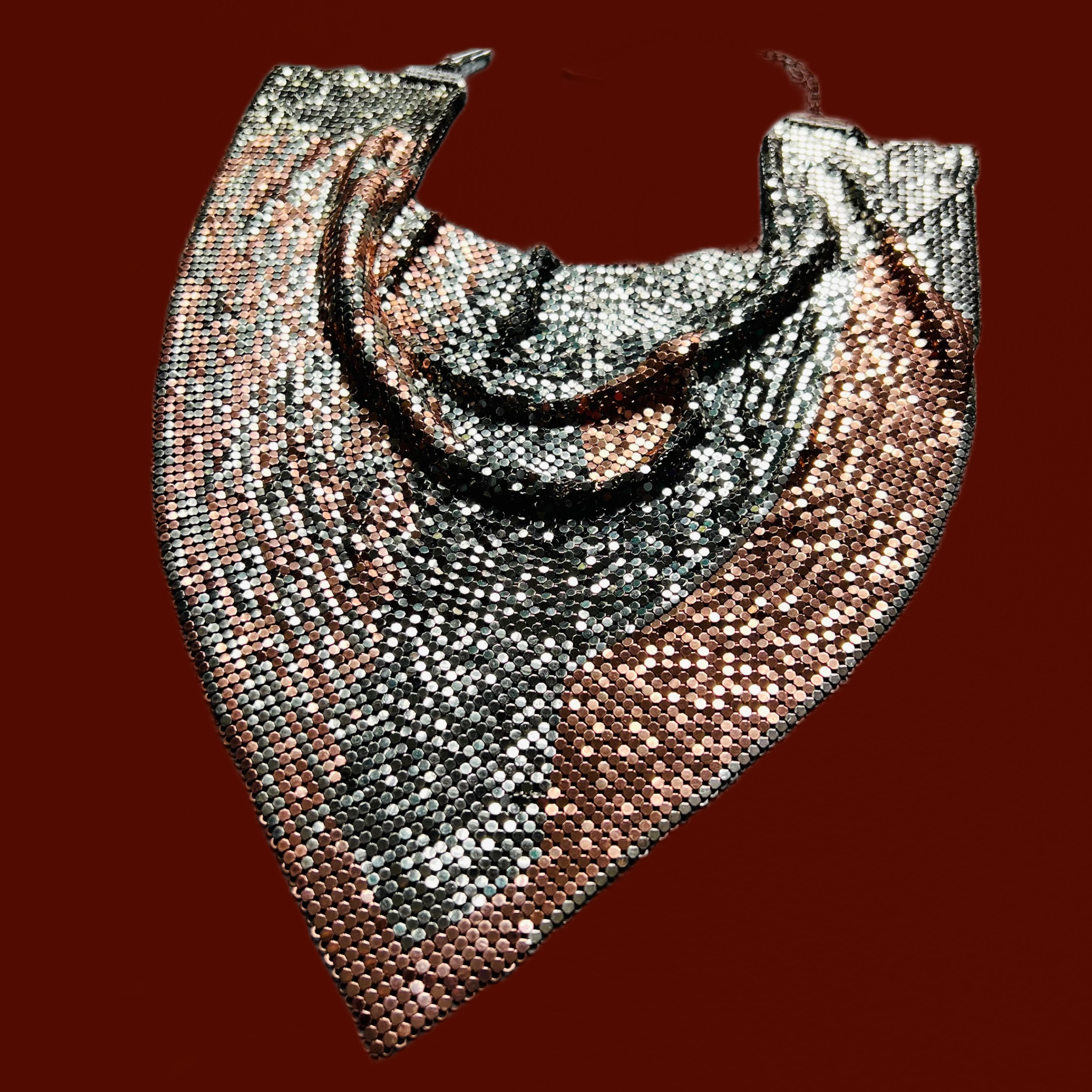 ✨✨✨ Absolutely breathtaking one of a kind vintage Ferrara cowl mesh necklace. Copper and gunmetal colors. Swarovski crystals peppered on the upper part of the necklace. Has extender for various lengths. Collectors piece!