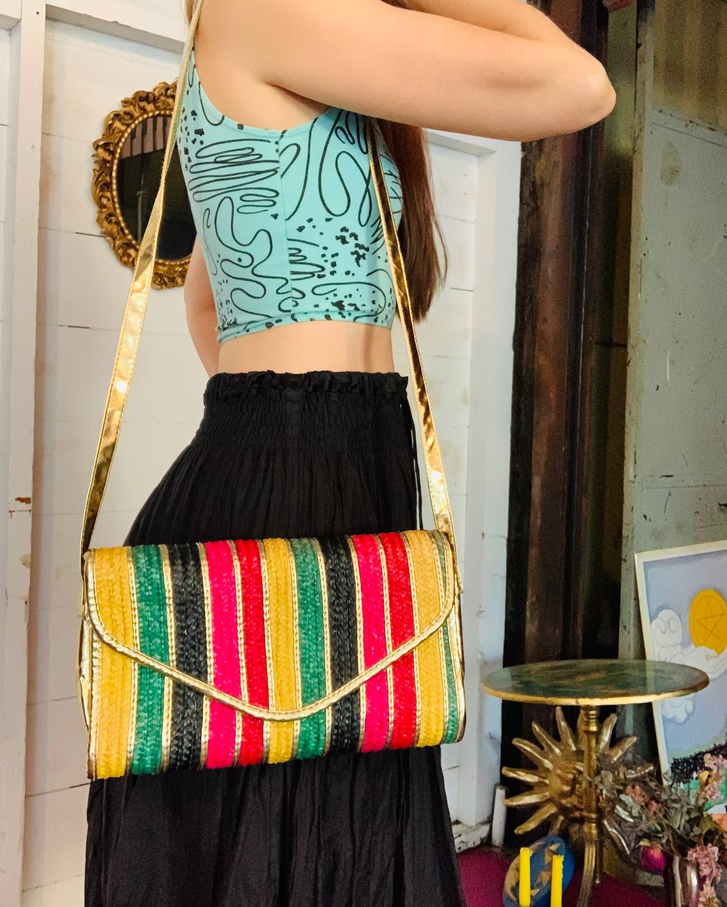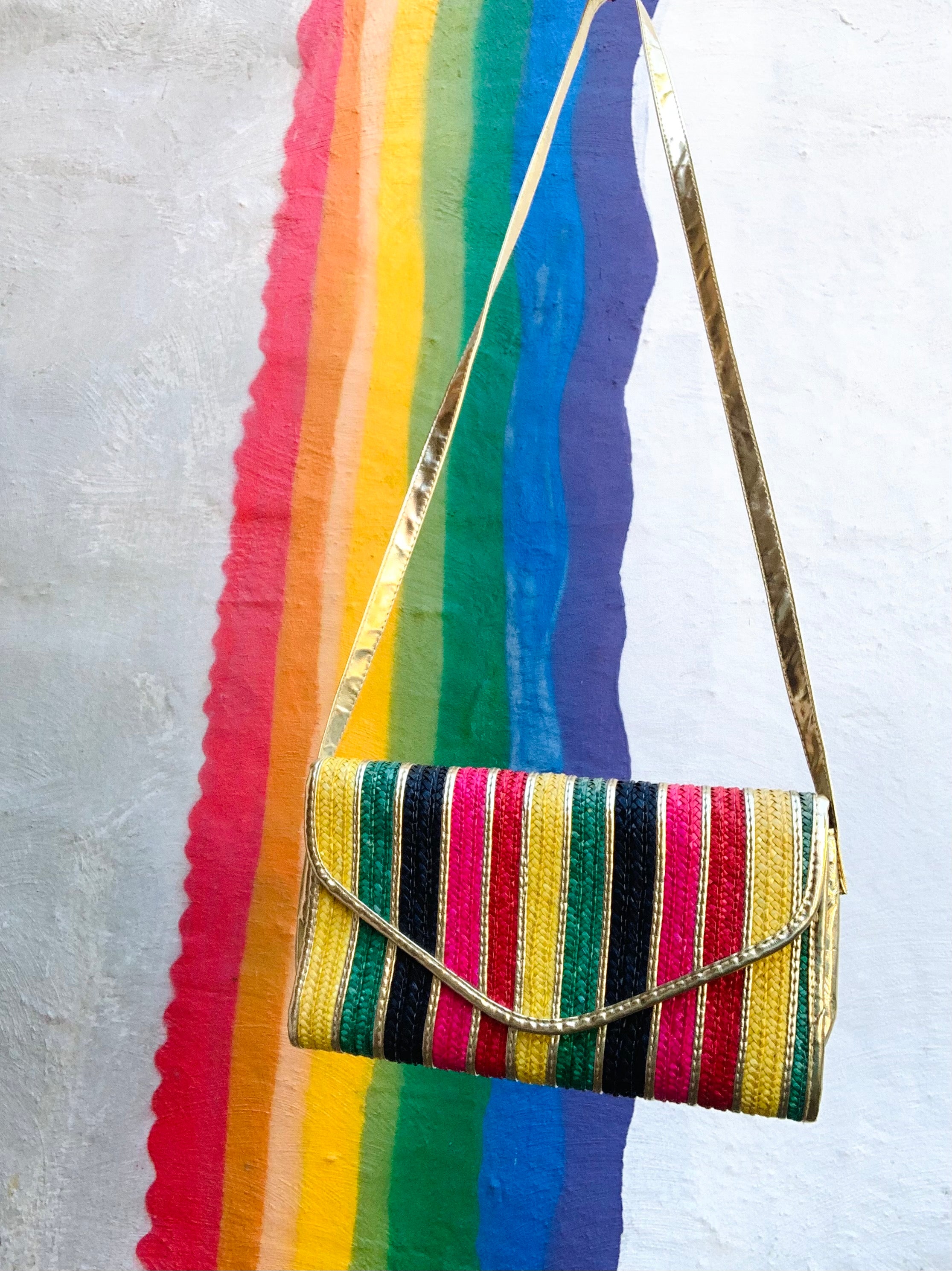 Gorgeous rainbow and gold raffia purse! Lined inside with a zipper pocket. Great condition, very clean inside. Fits a good amount of things for going out for the day. Add some fun to your look.