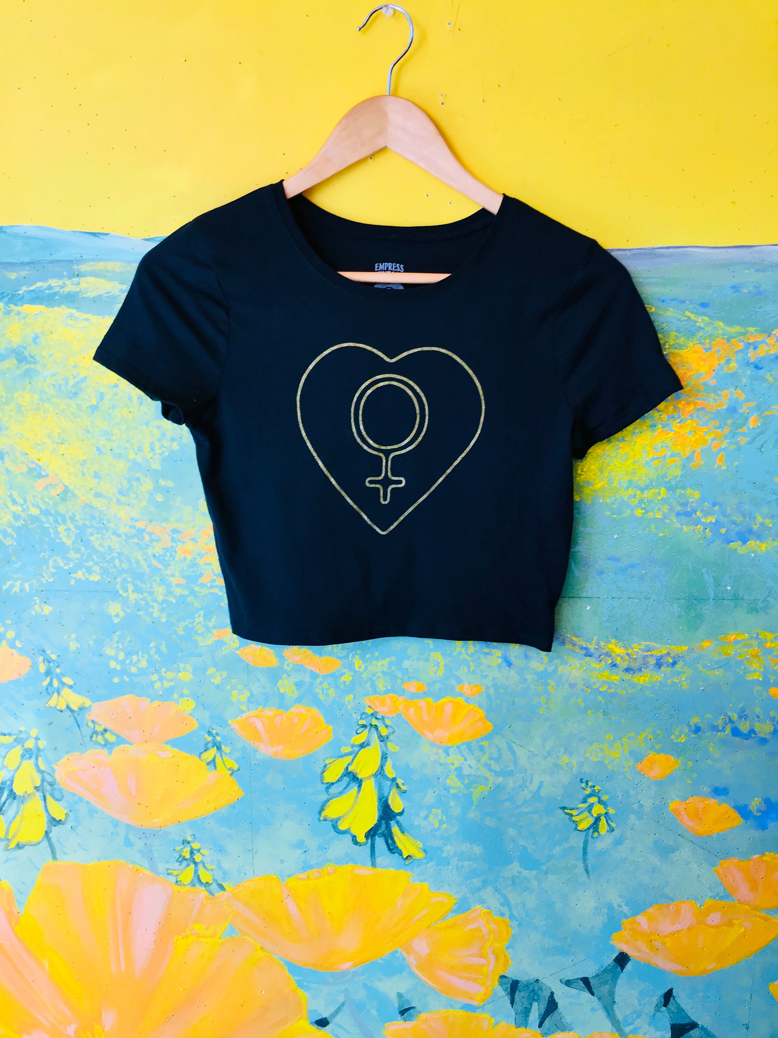 Original Empress Vintage design of this black and gold crop top tee, featuring The Empress divine feminine symbol of Venus and the heart! Hand screen printed locally in Berkeley, CA.