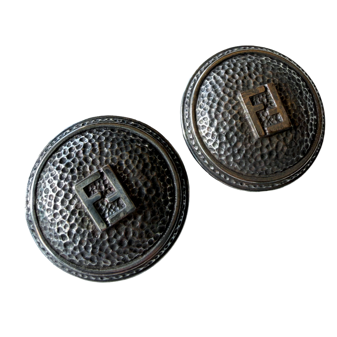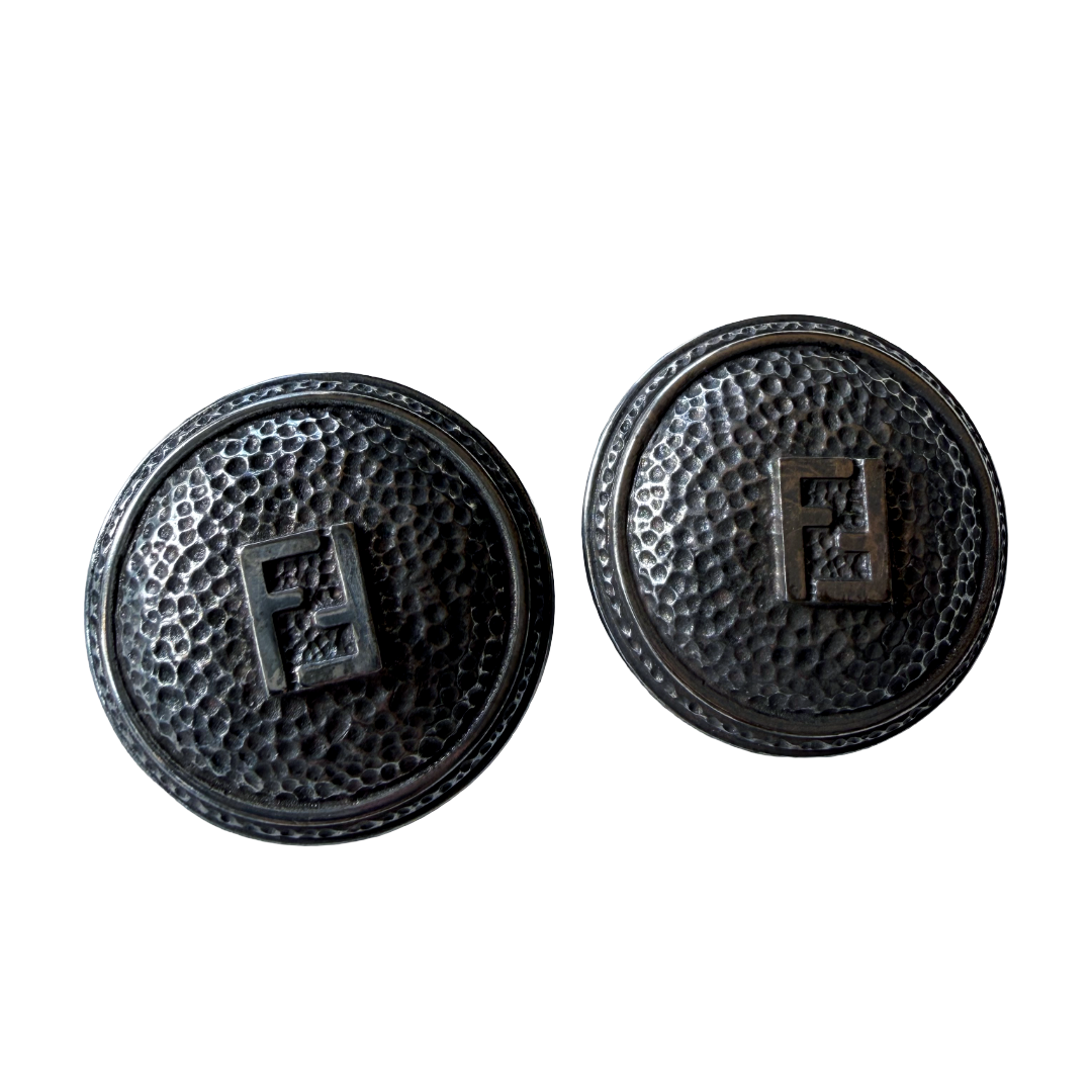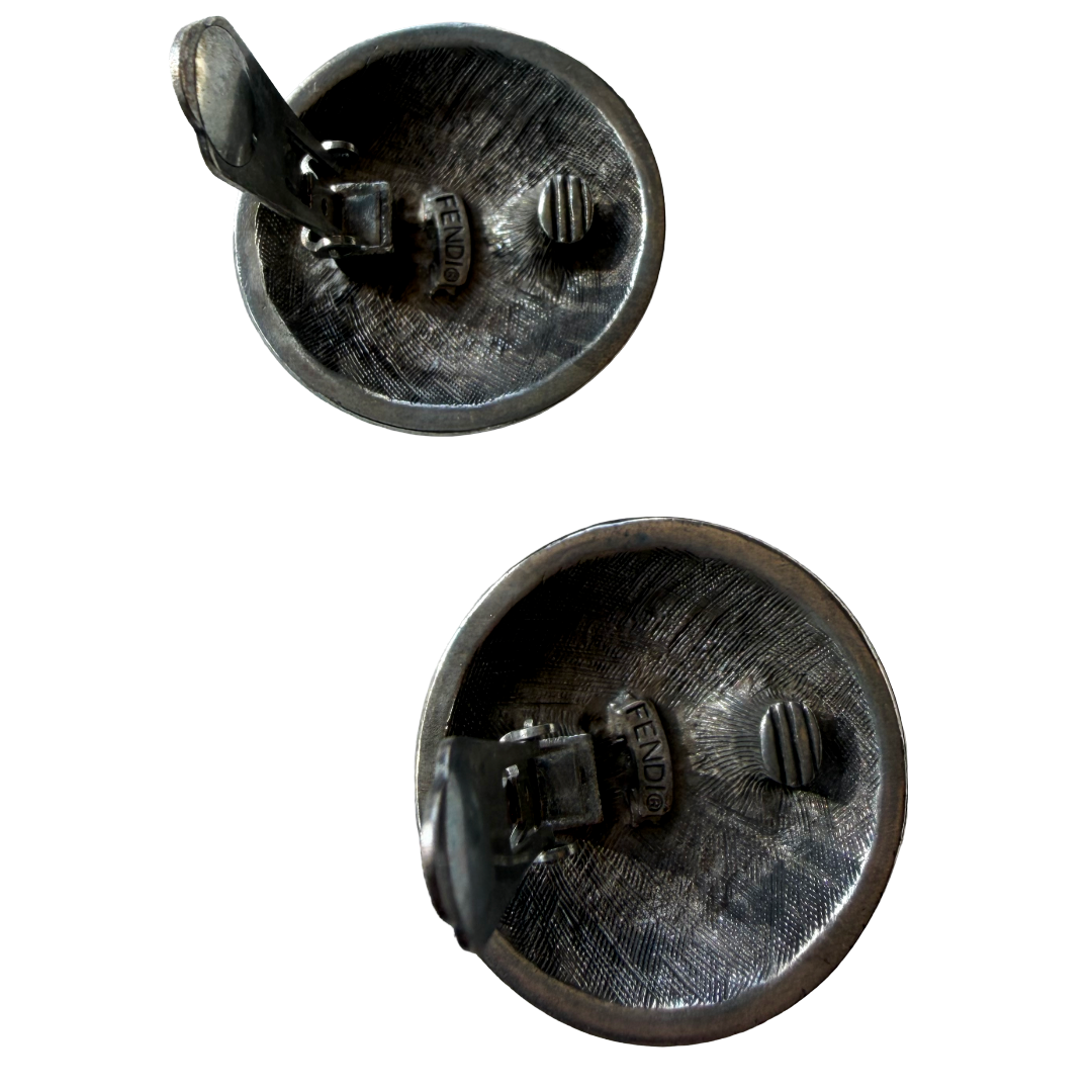 Textured circular vintage Fendi clip on earrings. Large FF logo in middle. Signed twice on the back ~ on clip and on back of earring. Nice tight clips. Comfortable fit. Love this style as it is not as common!