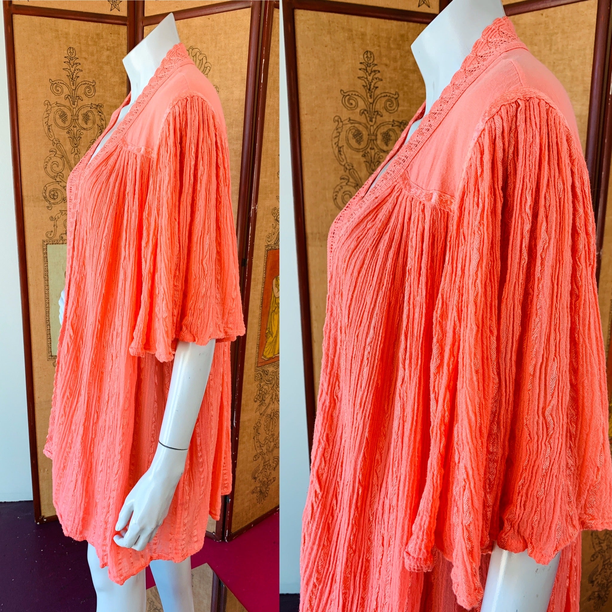 Dreamy cotton gauze duster with the prettiest crochet and ribbon details!  Angel sleeves.  Made in Greece.  Lovely to wear on the beach or on a gorgeous summer day.