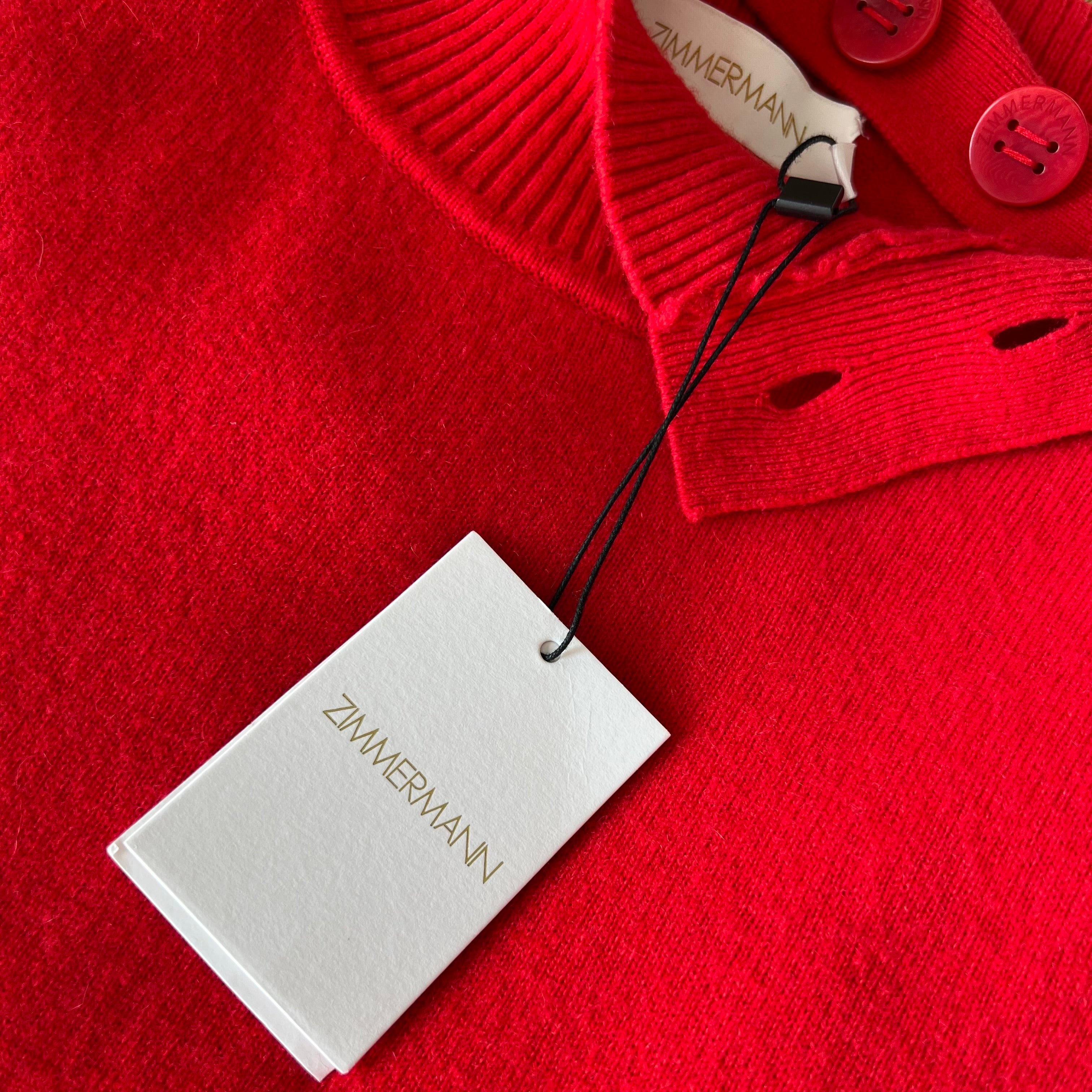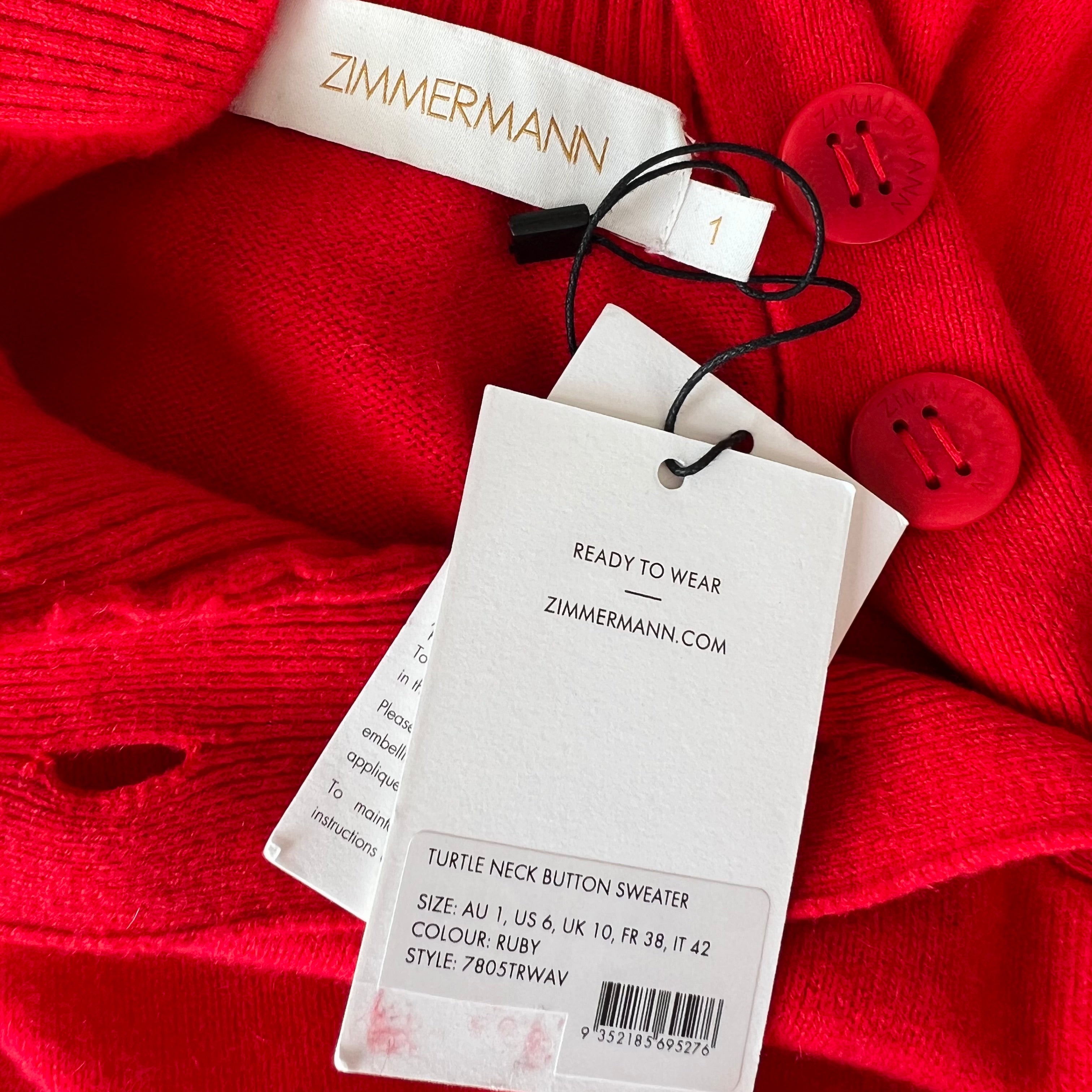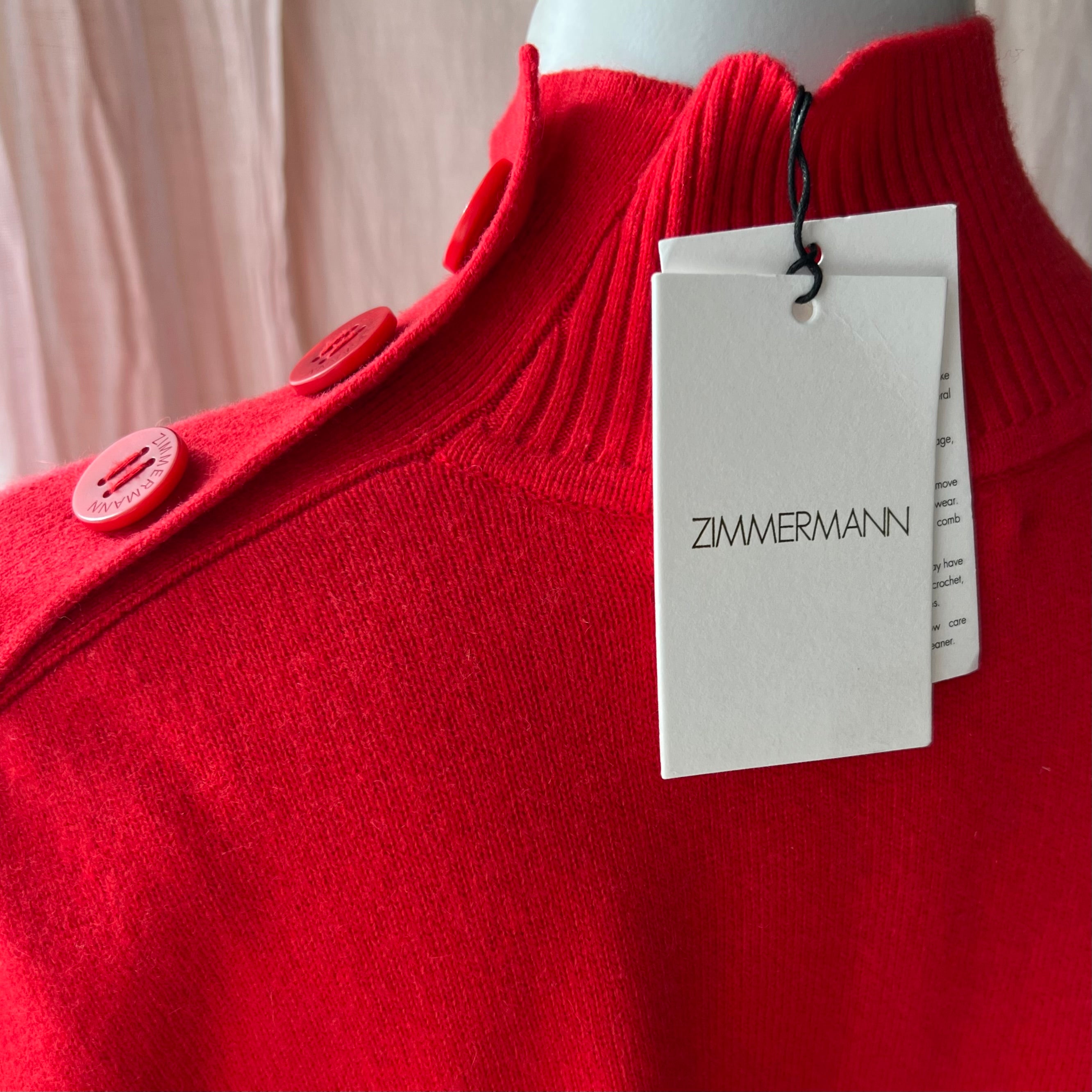 Lovely turtleneck cashmere sweater from the Australian brand Zimmermann. Has branded Zimmermann red buttons. Slits at sides. New with tags. A great cozy addition to your wardrobe at the fraction of the price!