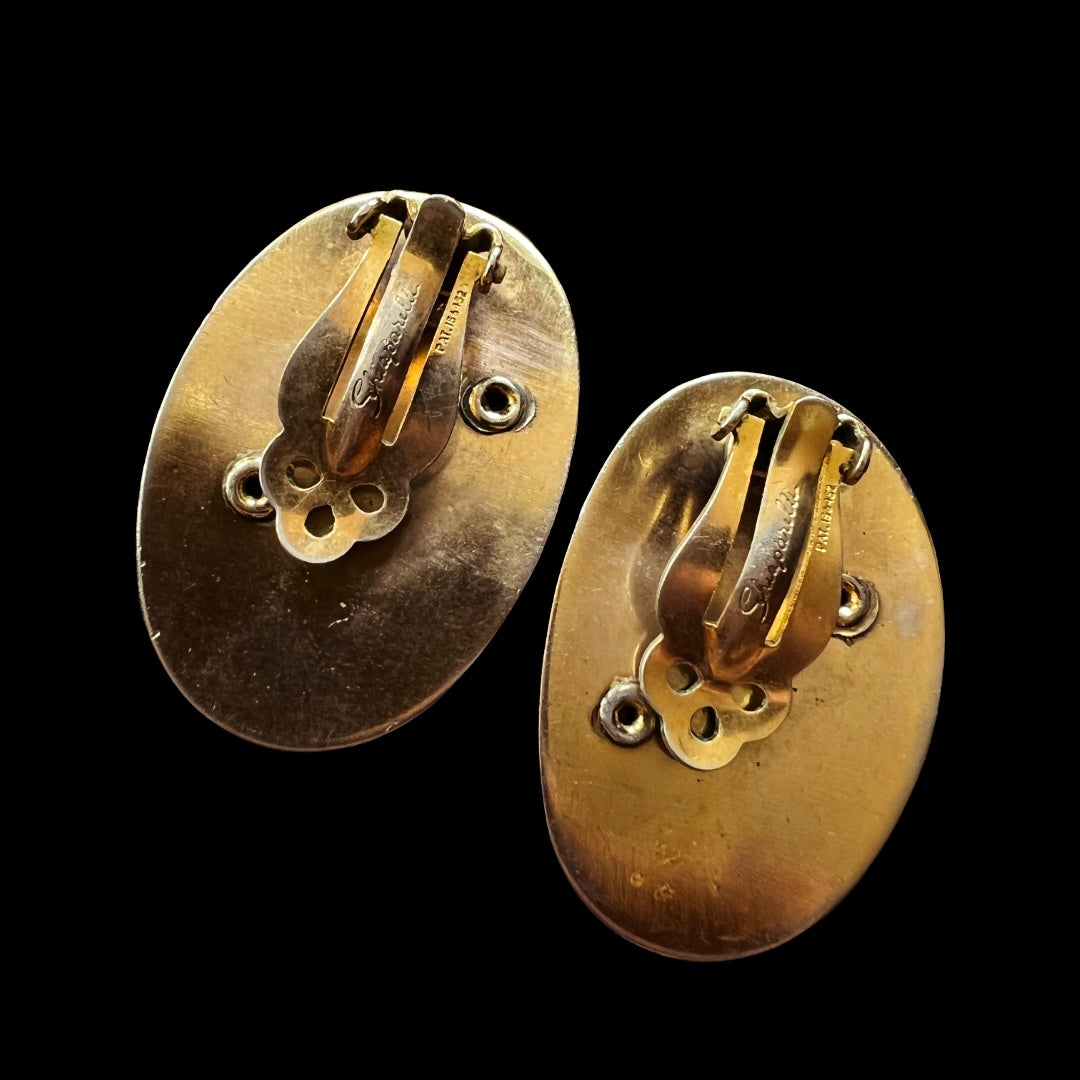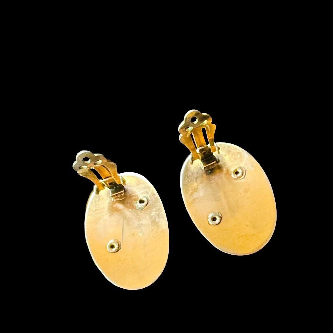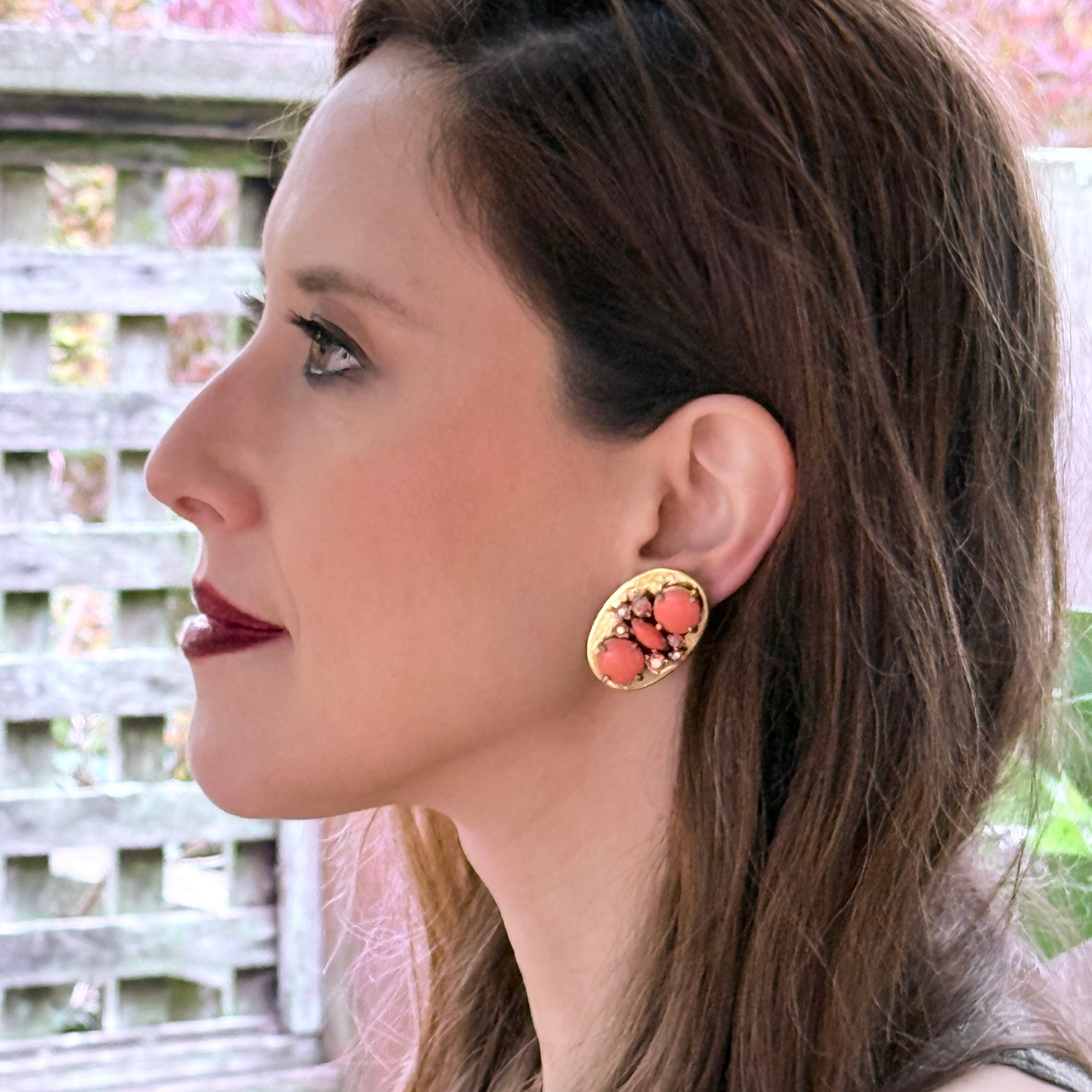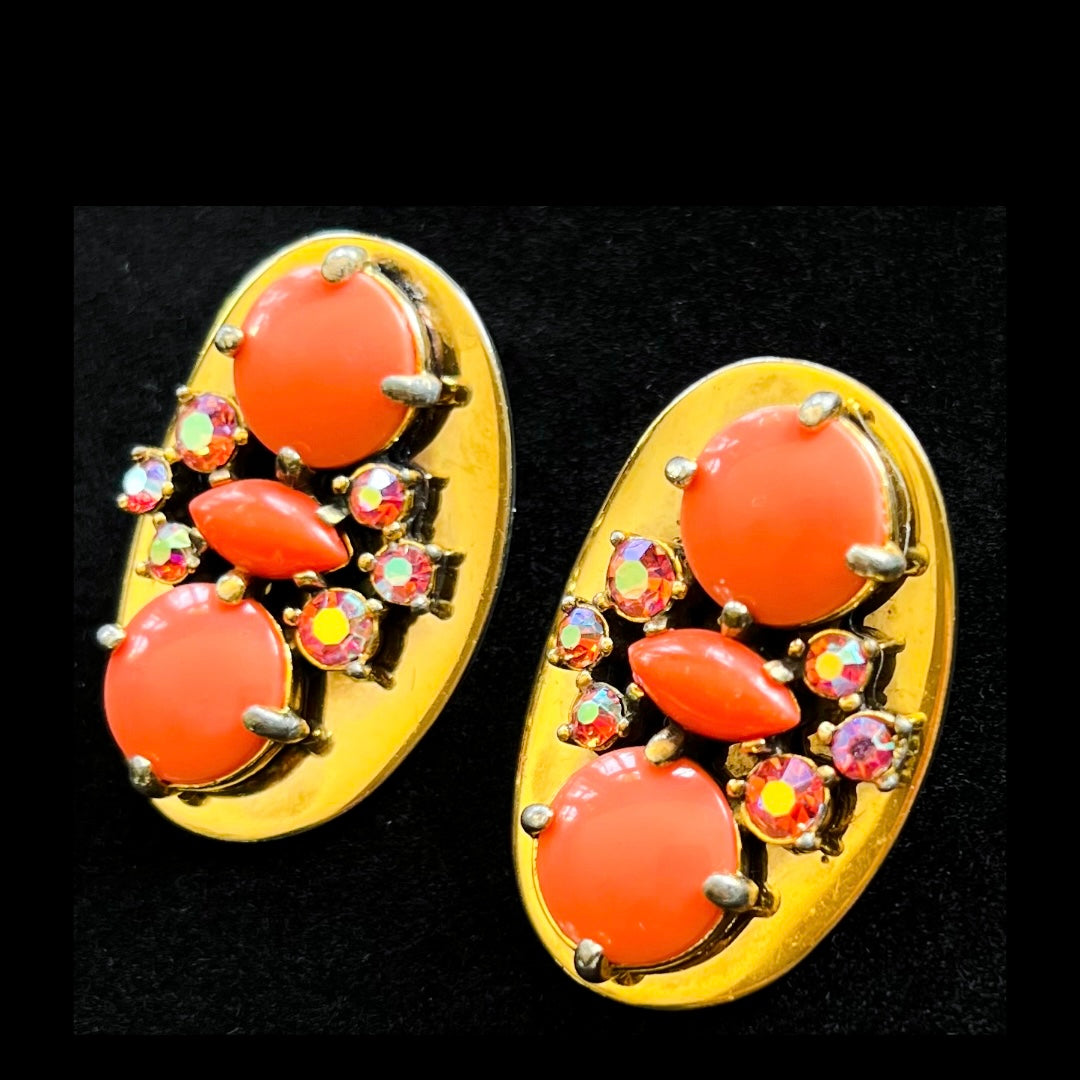 Condition: Very good condition with minor scratching to gold plating and middle coral cabochon, light wear to backs. Very secure clips and comfortable. Overall great condition and will sparkle for another 100 years!