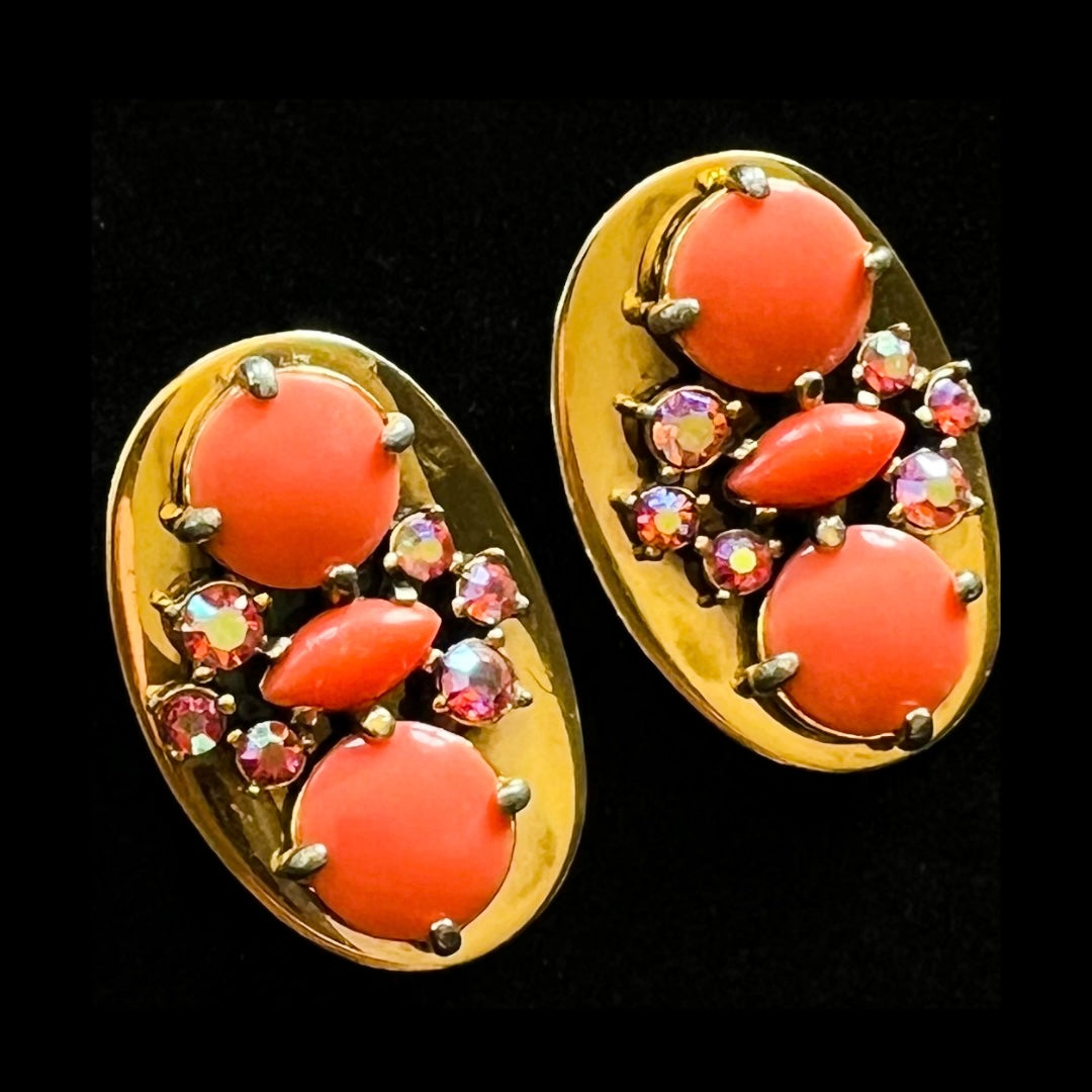 Gorgeous vintage signed Schiaparelli coral cabochon clip on earrings. With sparkling pink aurora borealis stones. Prong set. Gold plated. 50s/60s era. One of the best designers of all time. A must for your vintage designer collection.