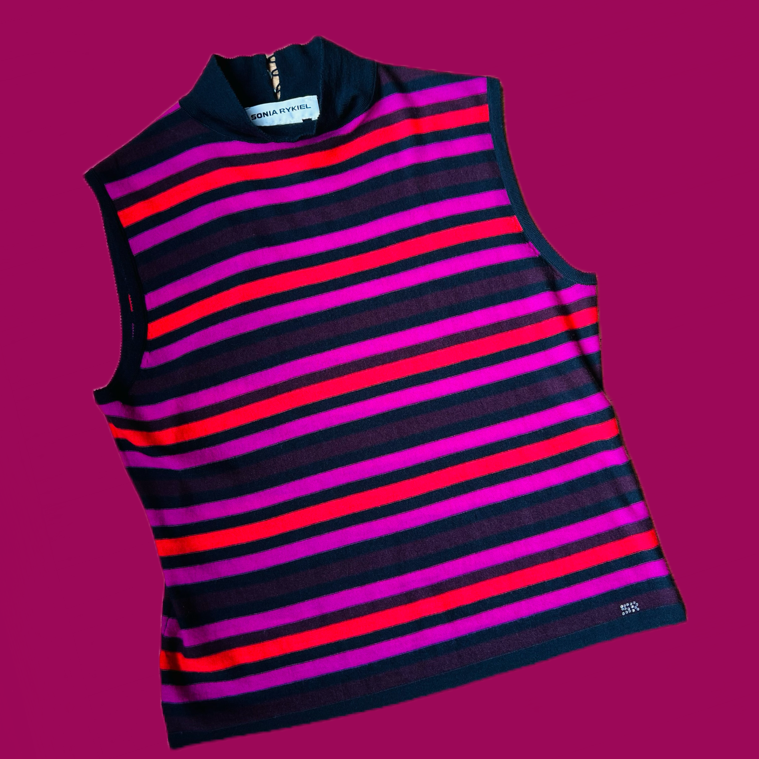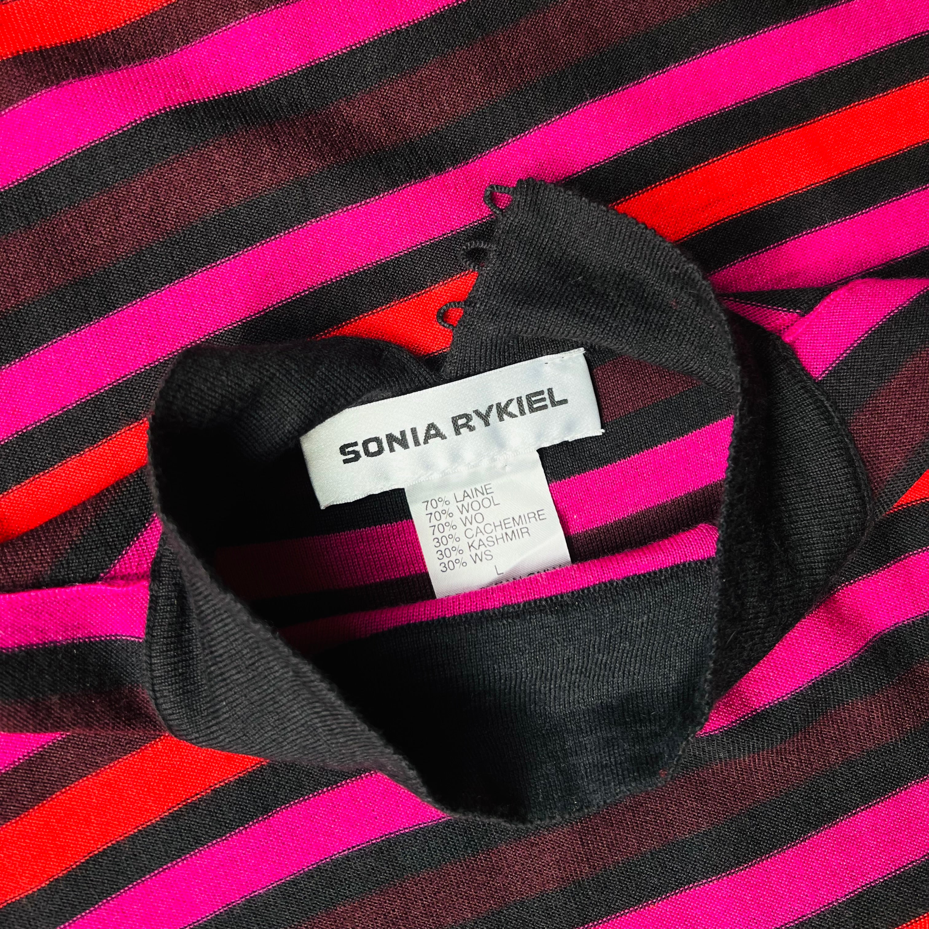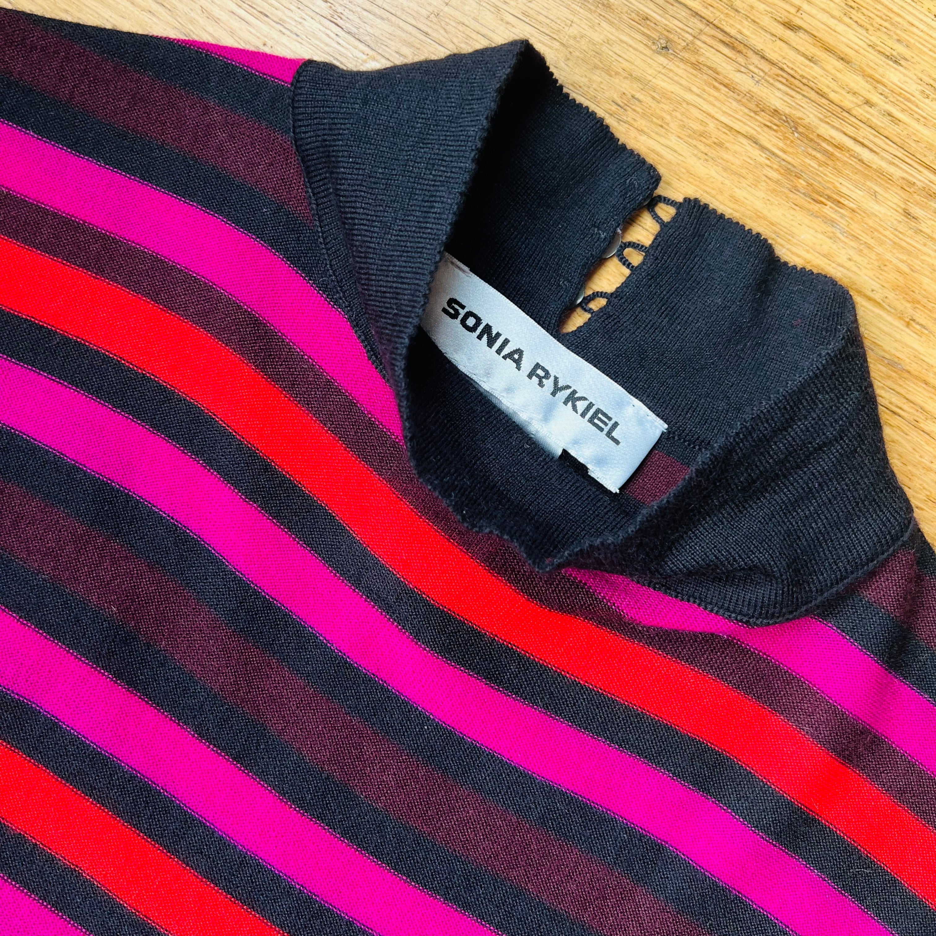 Super soft lightweight Sonia Rykiel designer top. Mock neck. Striped knit. Pulls over head to wear with buttons at back of neck. Jeweled SR at bottom of the garment. The cashmere makes it sooo soft to the touch! Would be hard to tell this is not a current piece from their collection!
