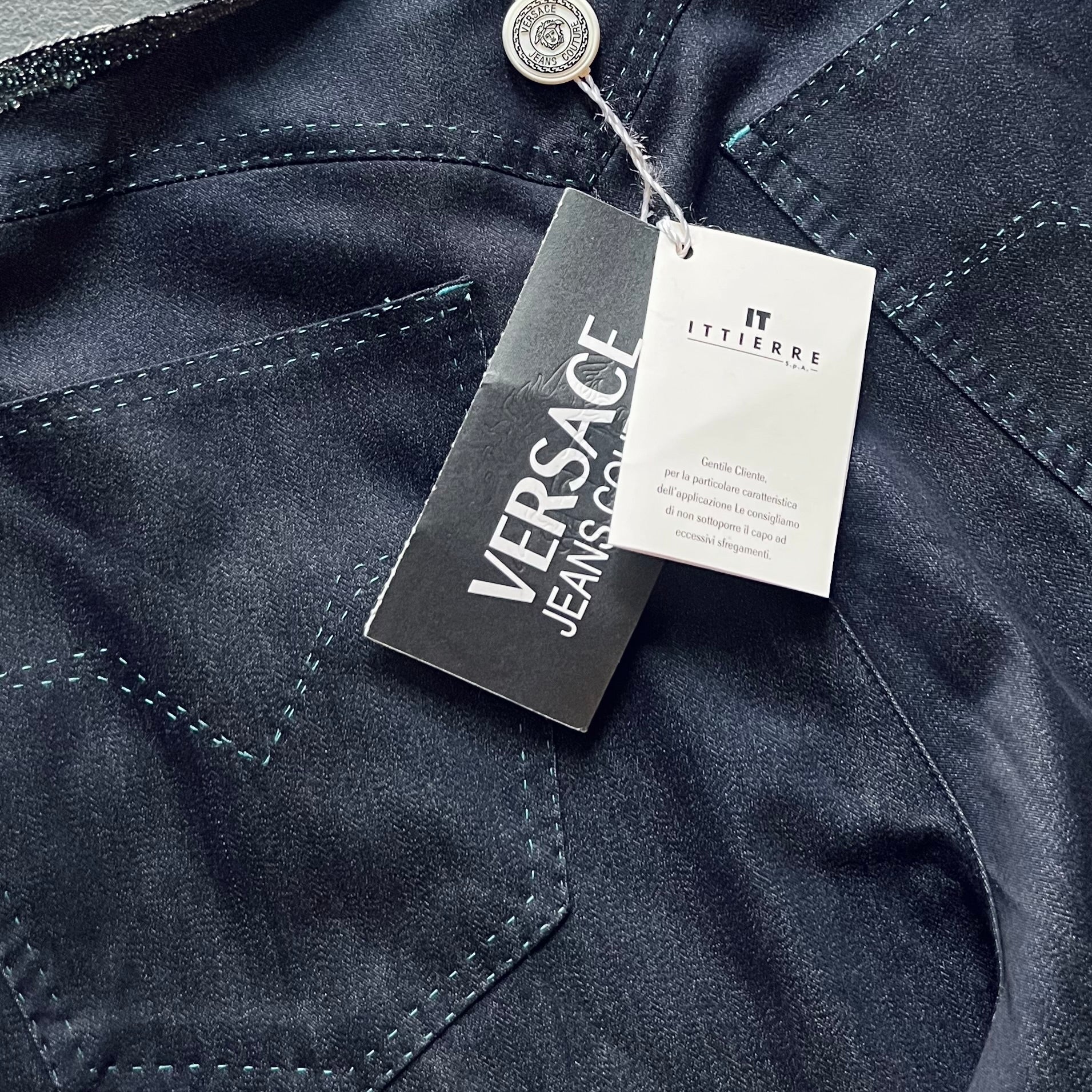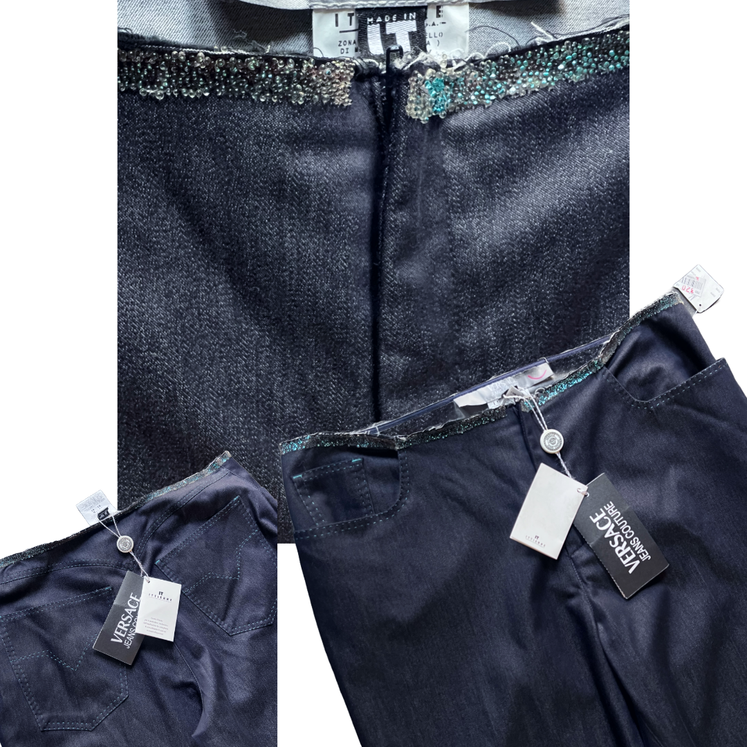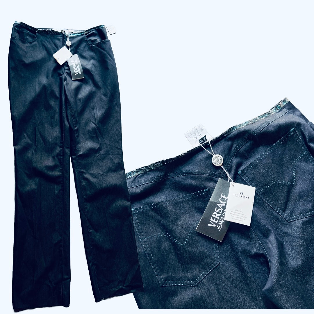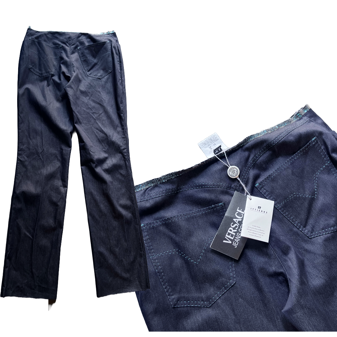 Versace Jeans Couture late 90s/early 2000s dark blue pants. Feels like a polished cotton w some stretch. Cute raw hem waistline with blue glitter detailing. Blue stitching at pockets. Zip fly. Original tags from Versace & Neiman Marcus. So cute!!