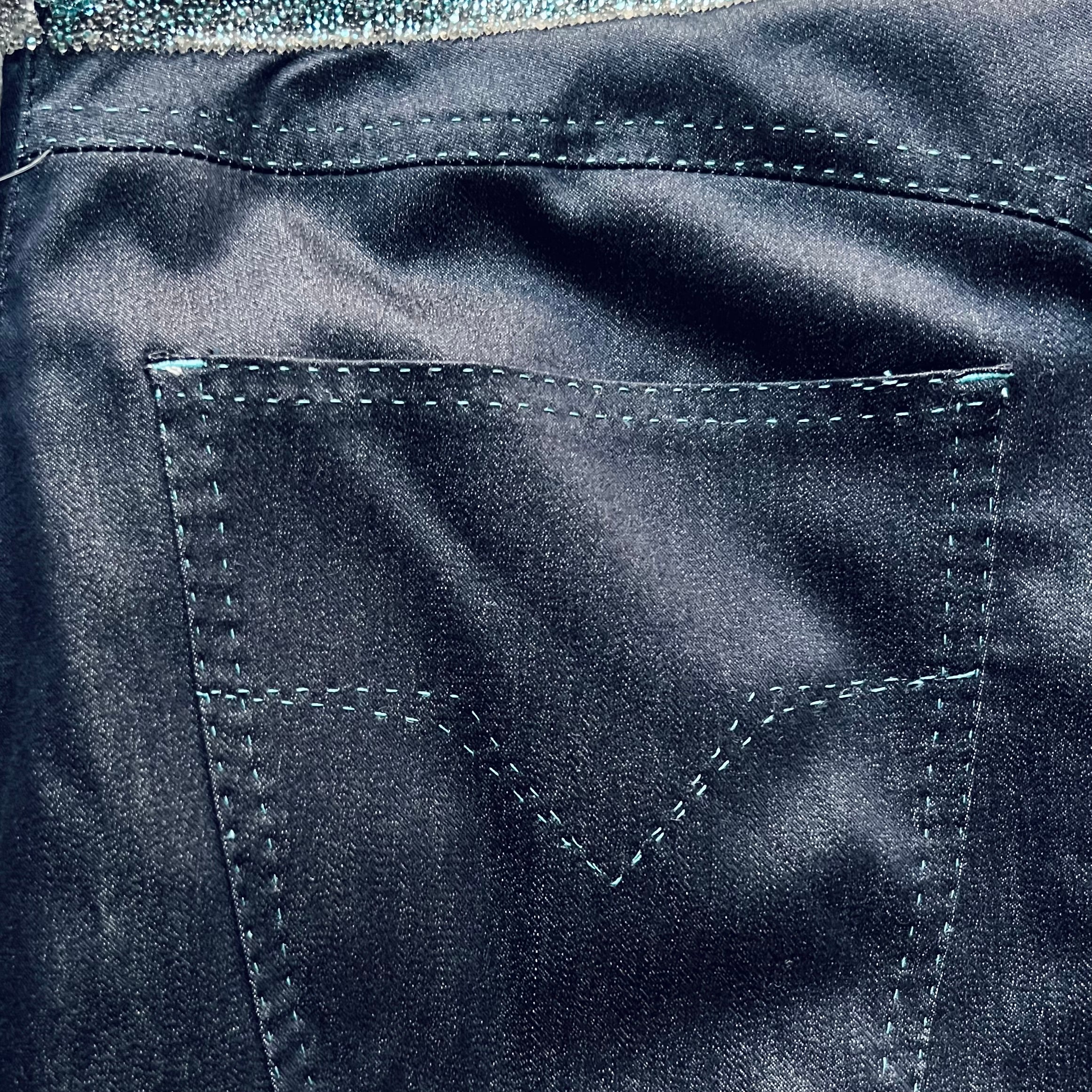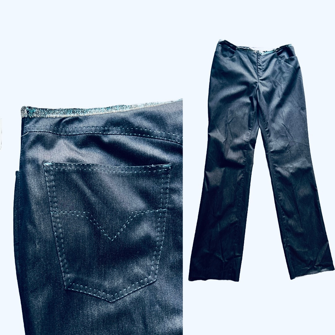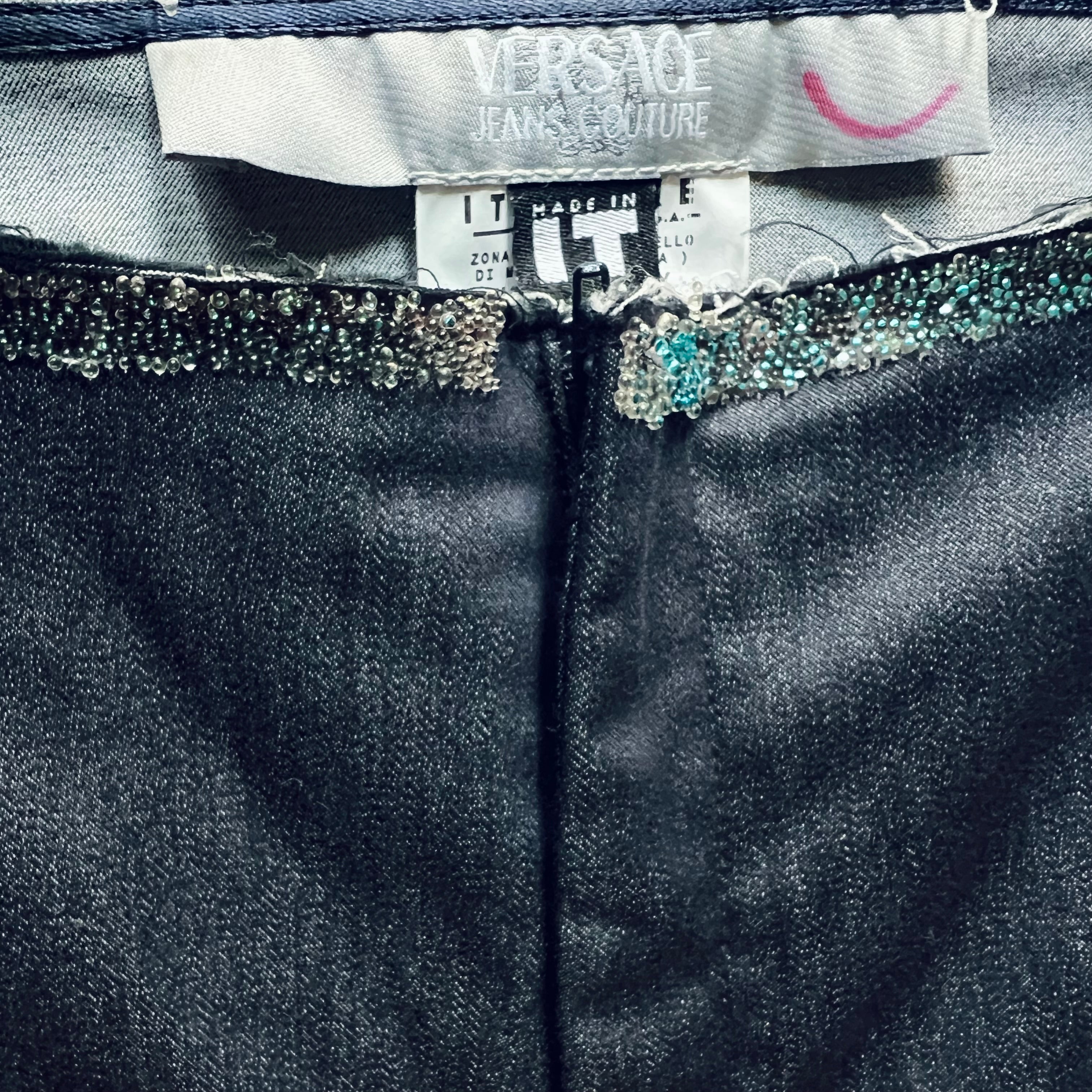 Versace Jeans Couture late 90s/early 2000s dark blue pants. Feels like a polished cotton w some stretch. Cute raw hem waistline with blue glitter detailing. Blue stitching at pockets. Zip fly. Original tags from Versace & Neiman Marcus. So cute!!