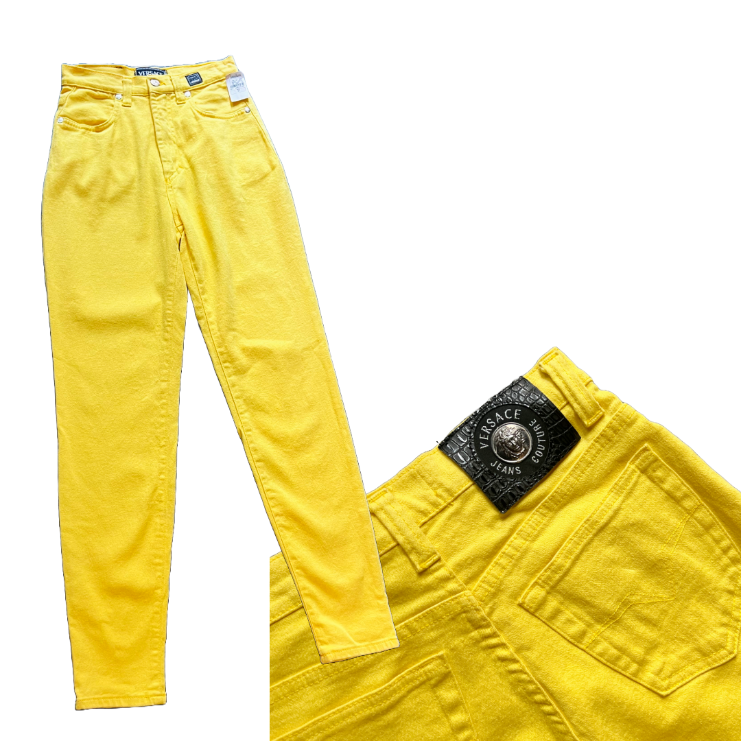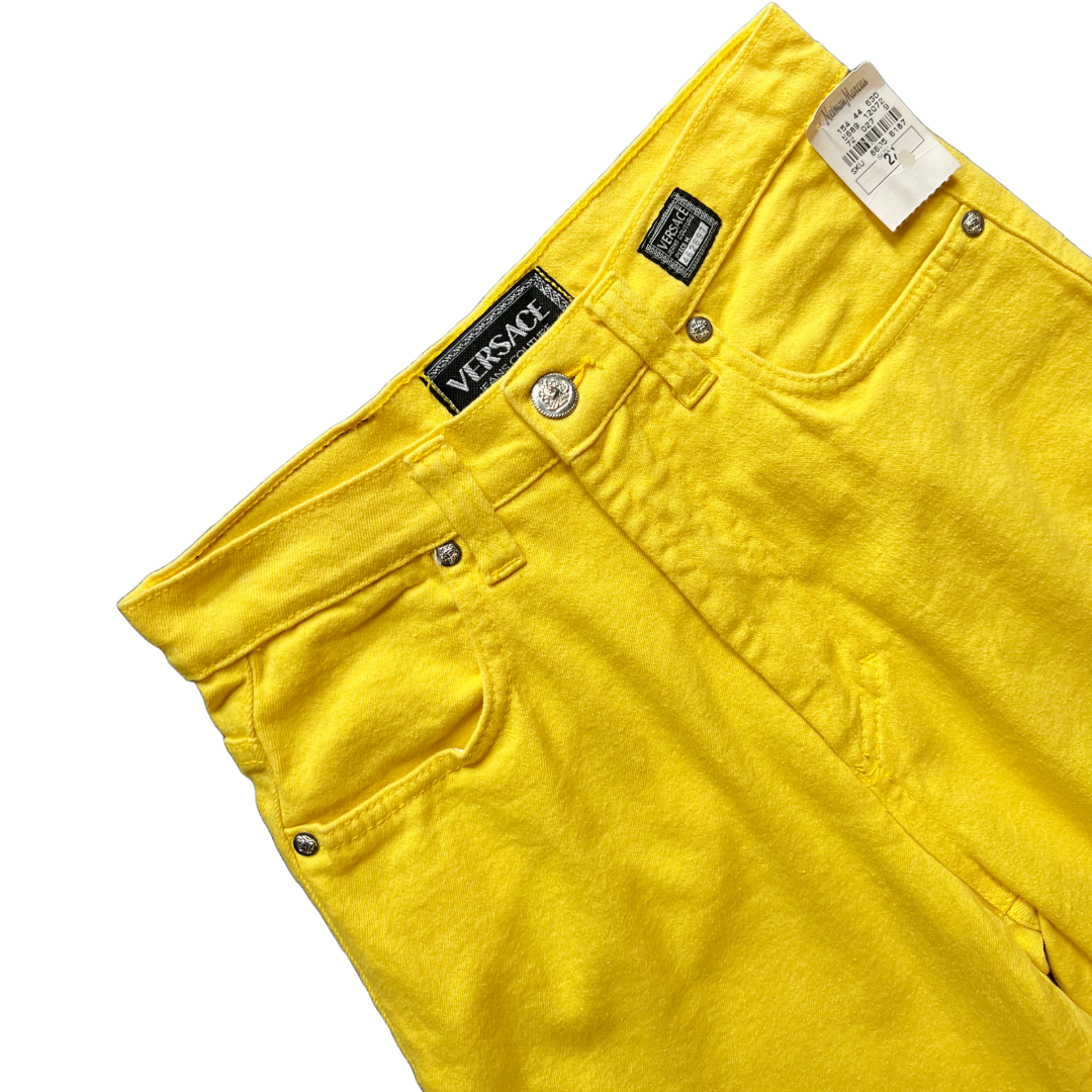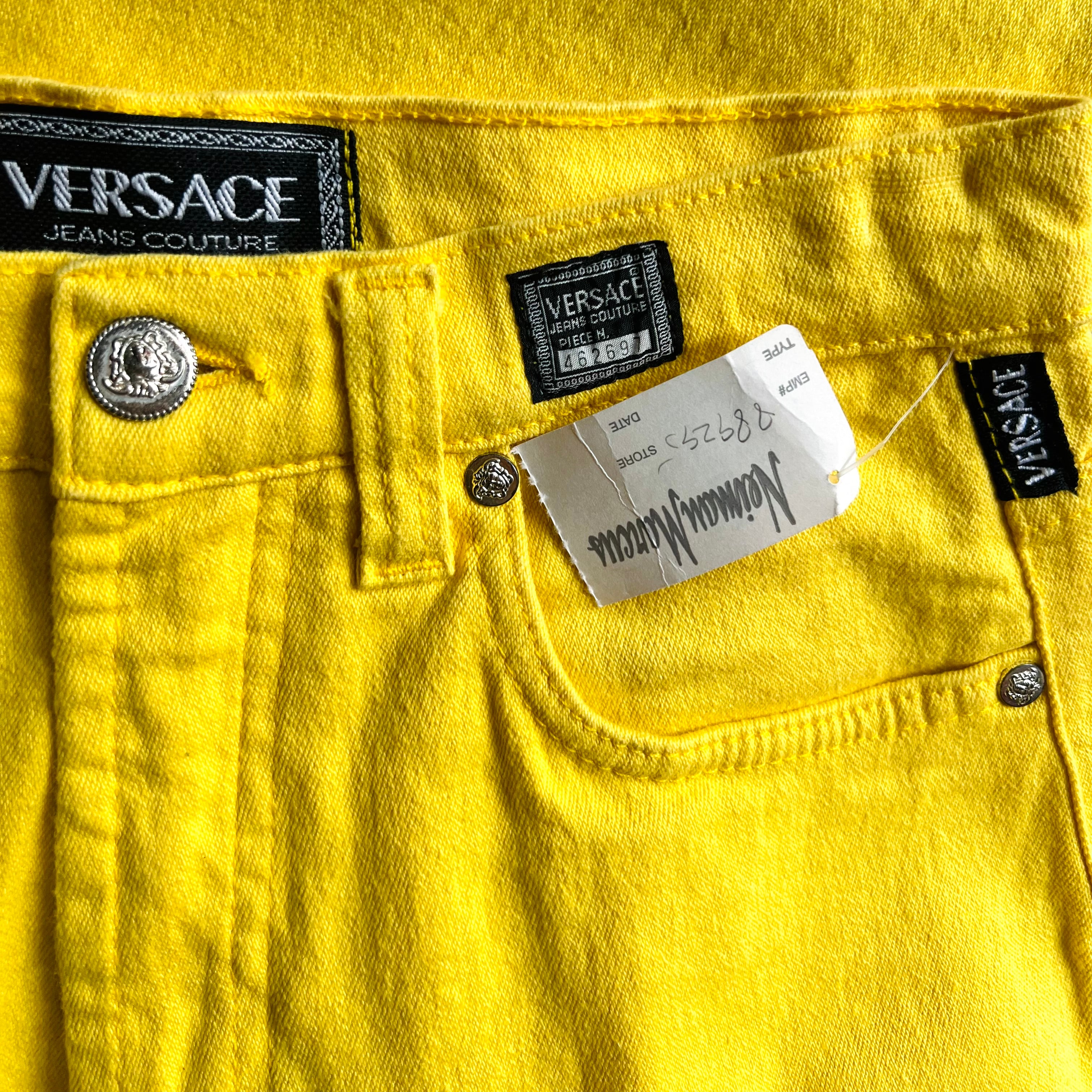 Banana yellow Versace Jeans Couture jeans. Medusa studs and button. Original tag purchased at Neiman Marcus. Medusa back patch. Pockets. Zip fly. Have a bit of stretch.