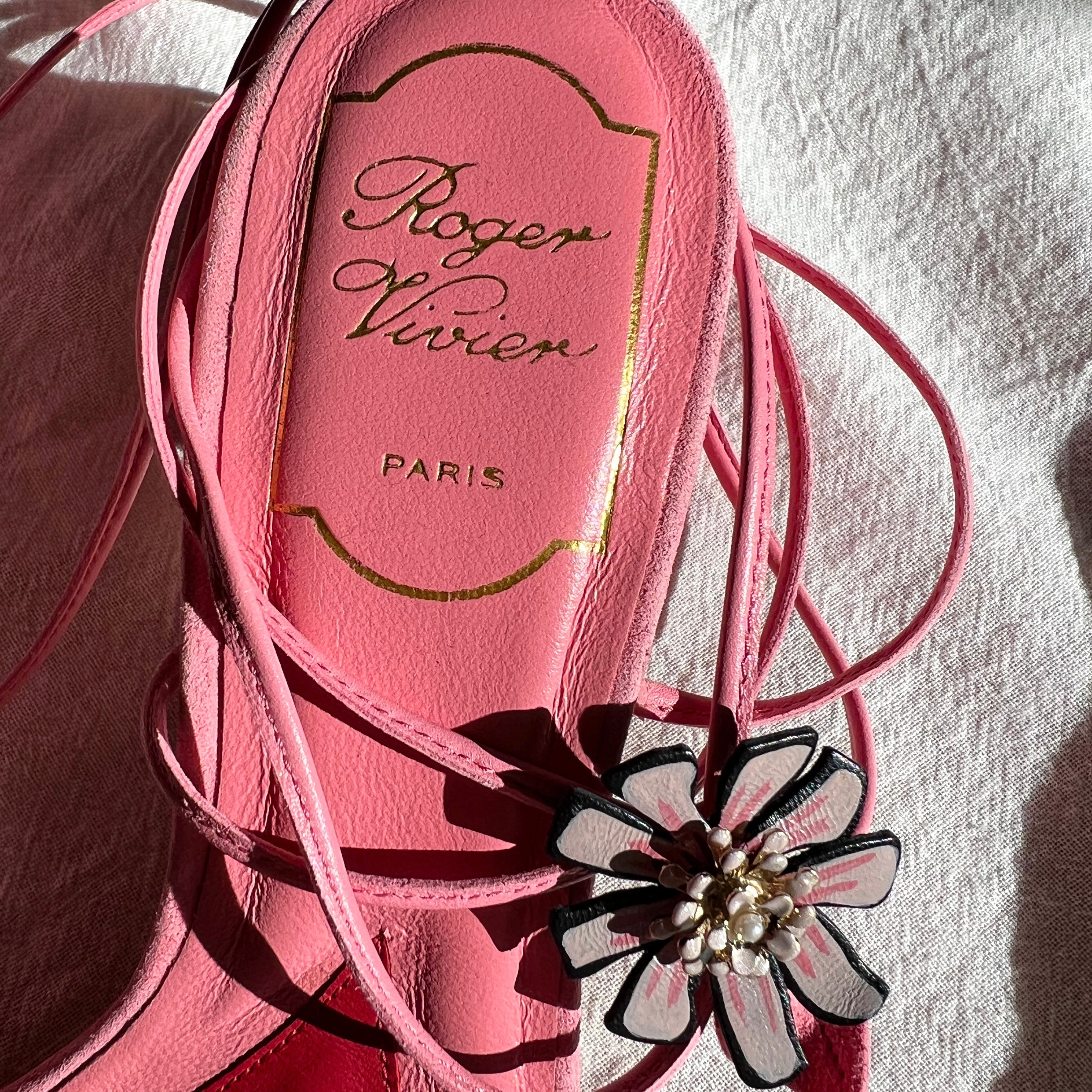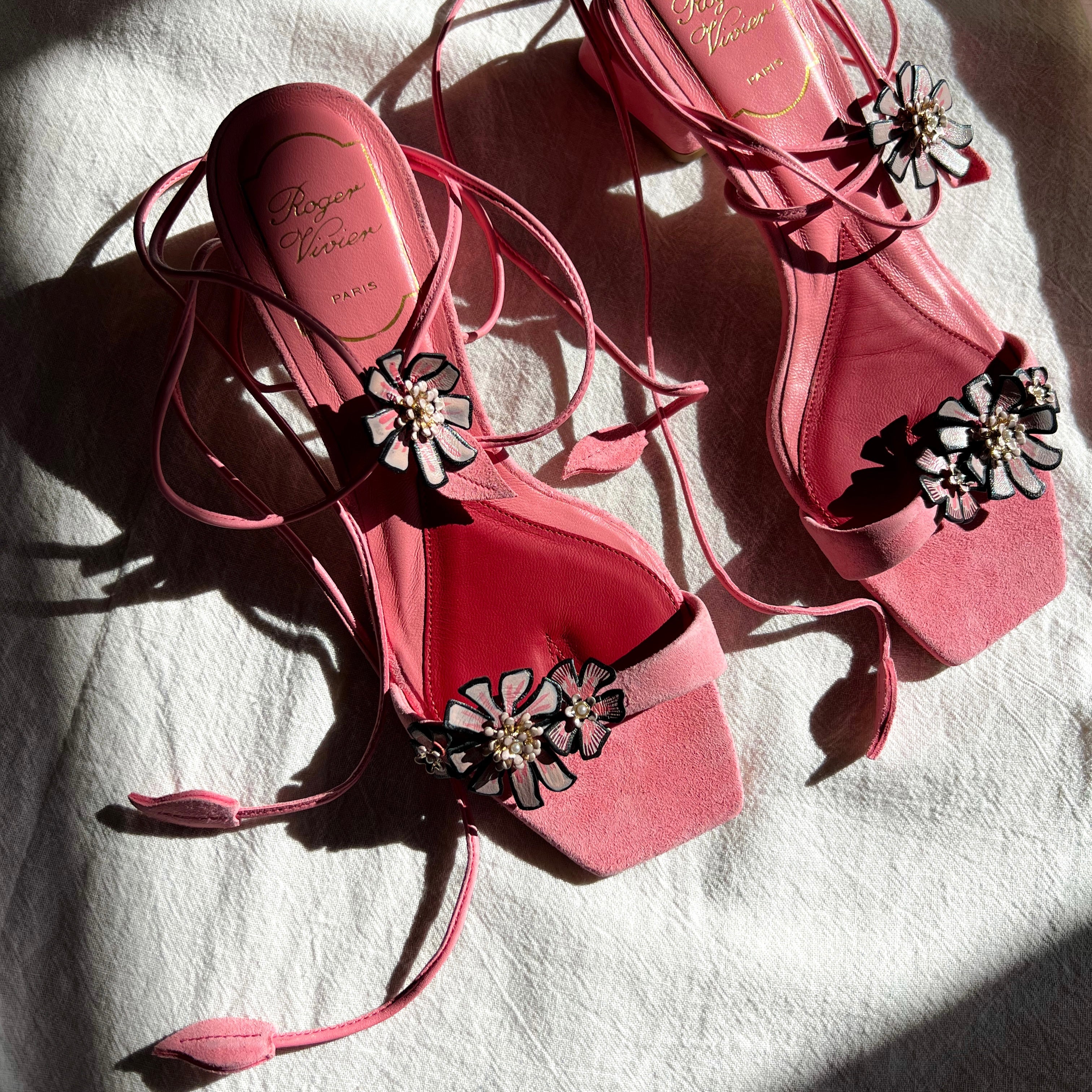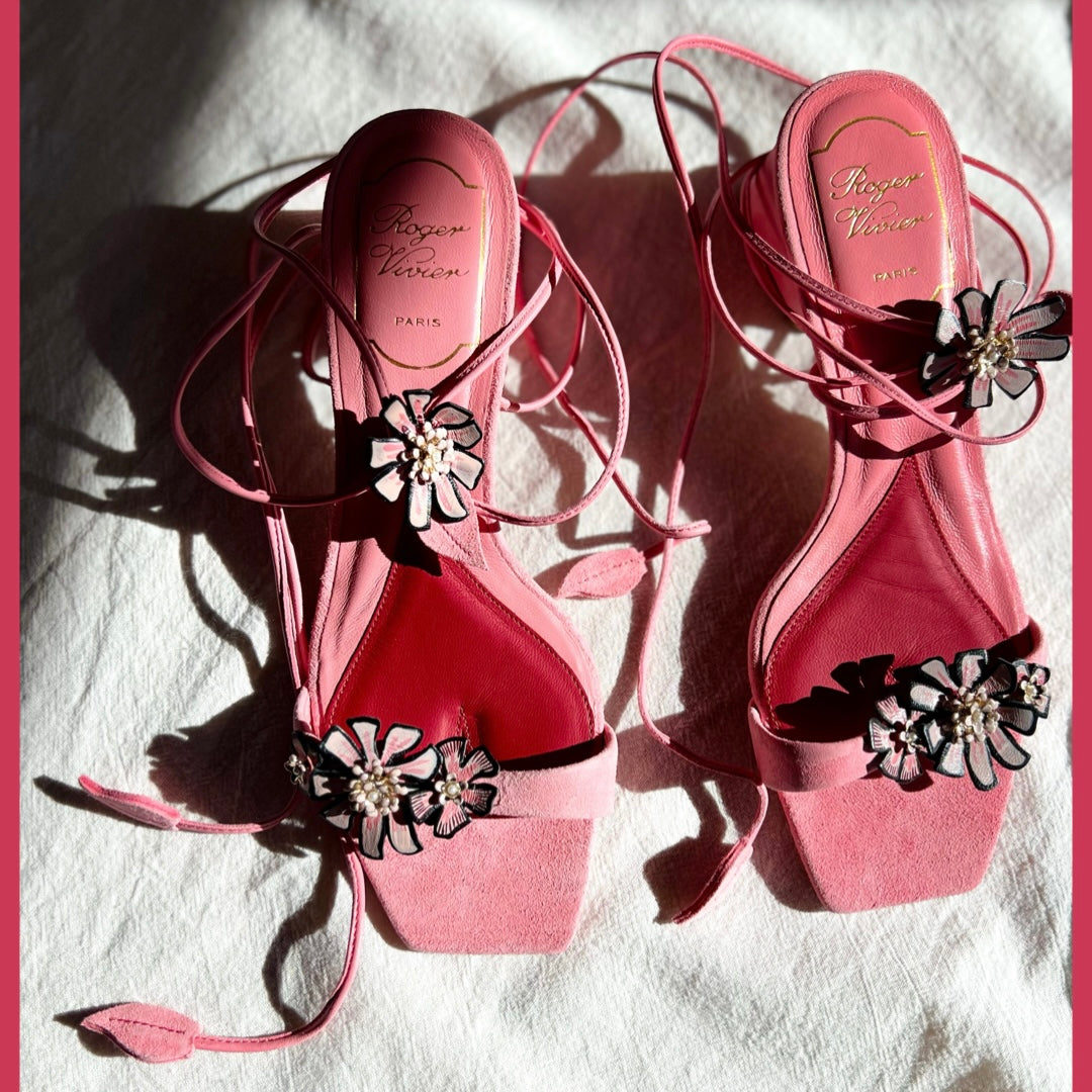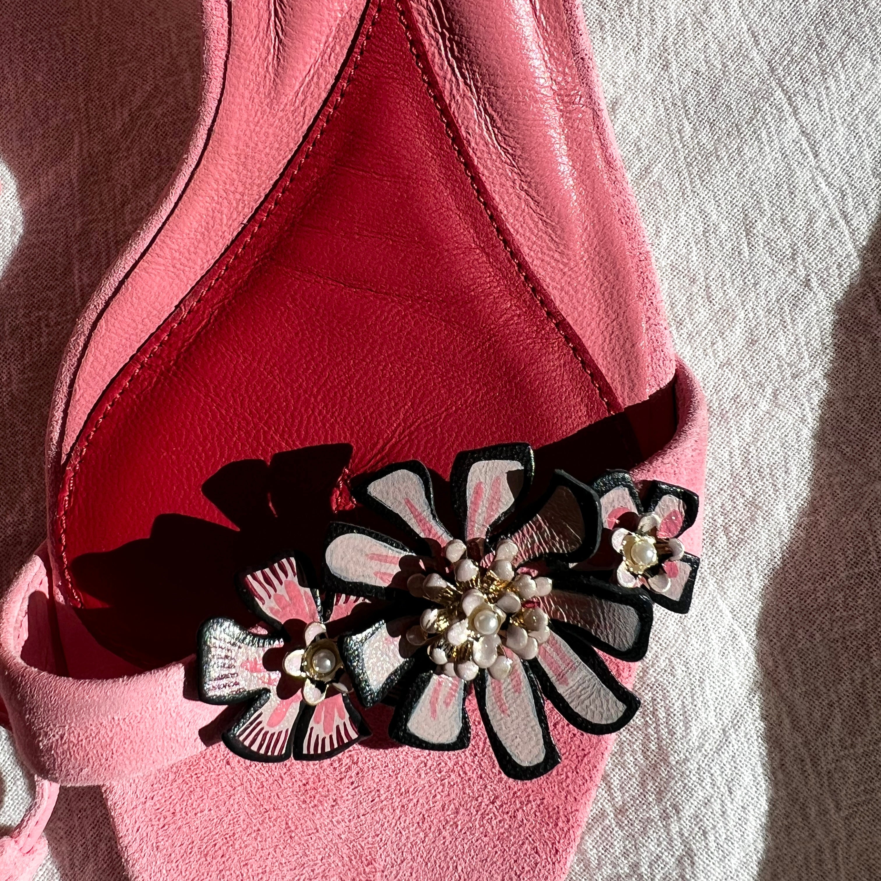 Contemporary shoe handcrafted in Italy features pink suede, hand painted floral appliques, self-tie ankle wrap closure, smooth leather sole and 2 inch block heel. Very wearable and a stunning piece of art! Originally over $1,100. Anytime I am at a fashion art exhibition and I see Roger Vivier shoes I am taken on a fantastical journey throughout time. And to think this label is STILL handcrafting beautiful, whimsical shoes is such a blessing!