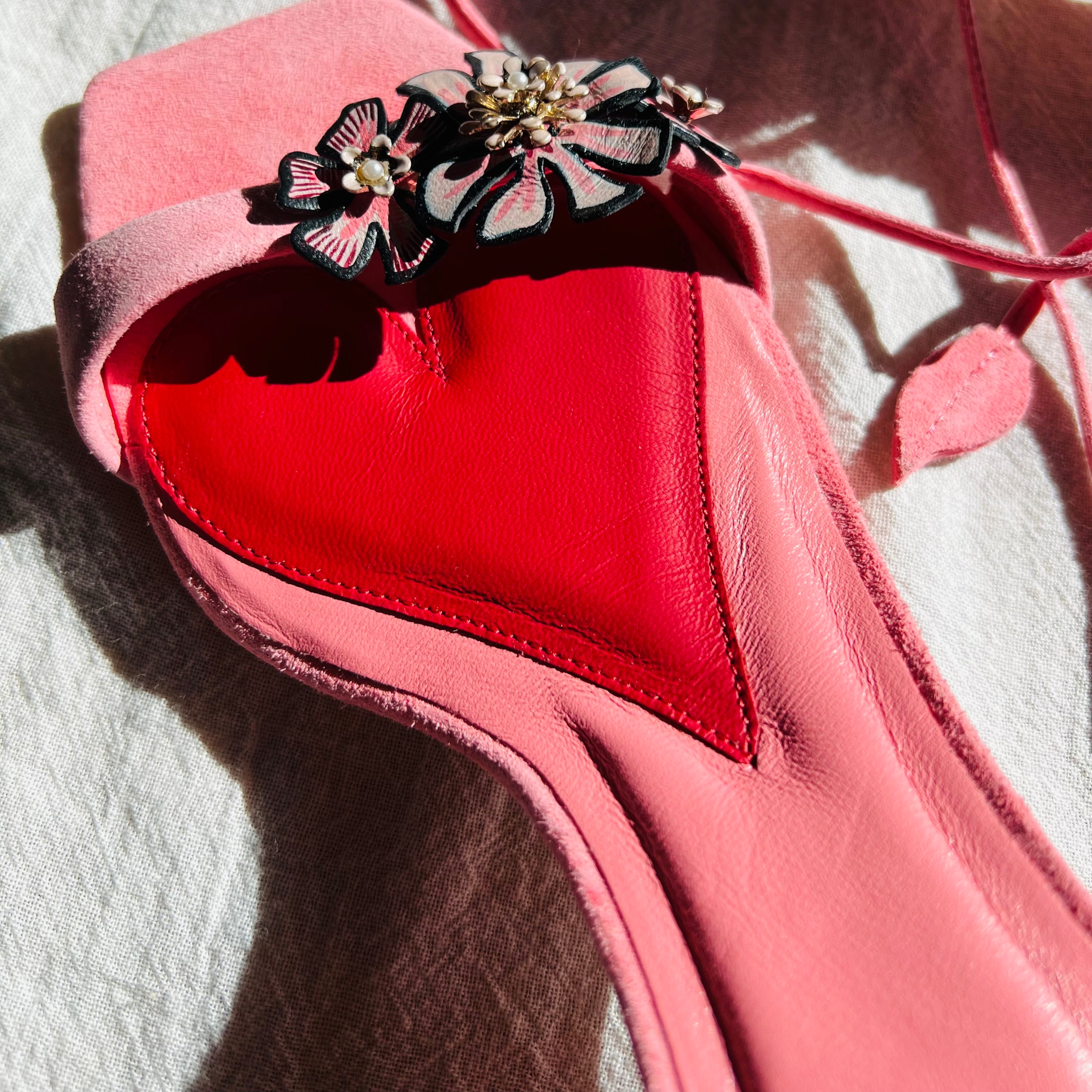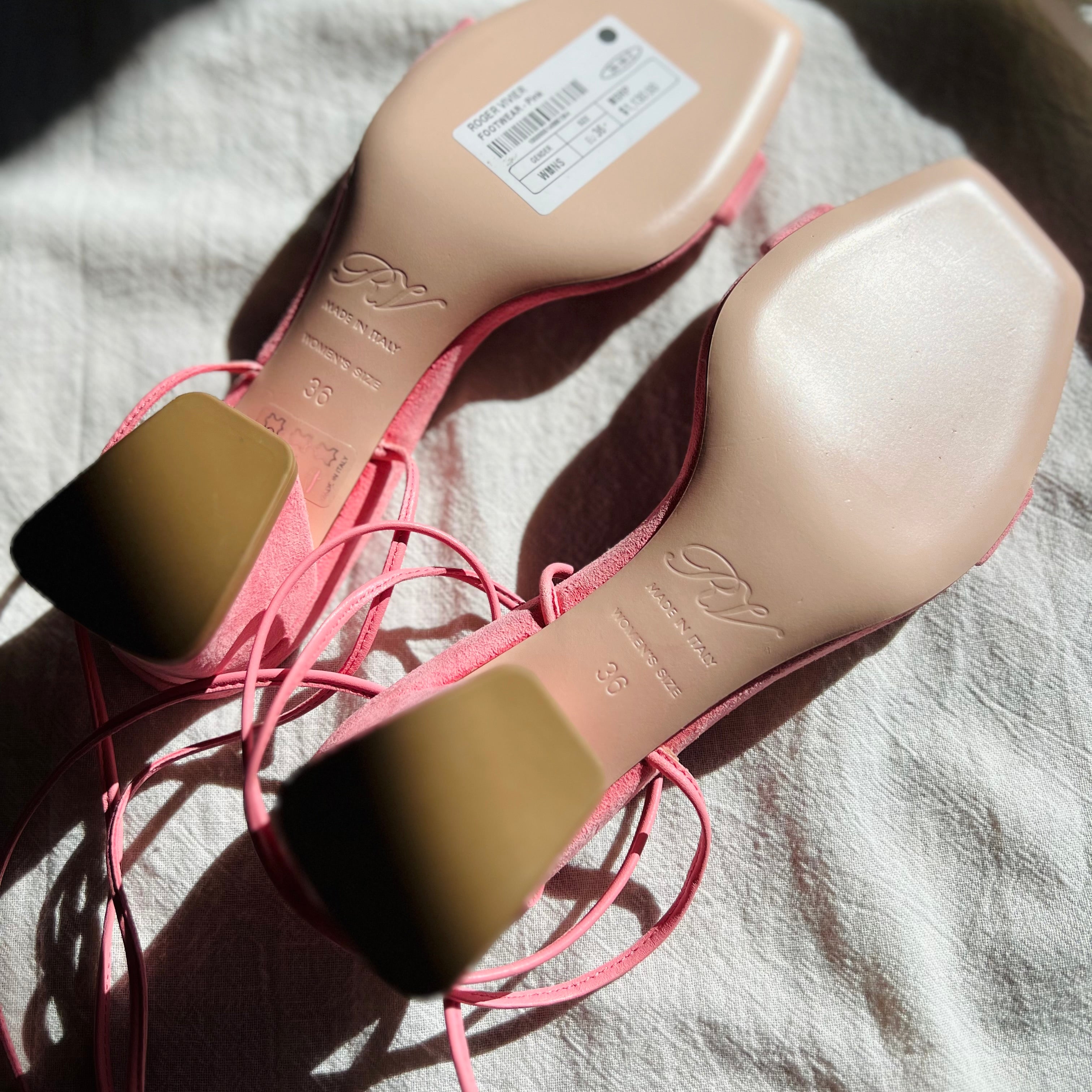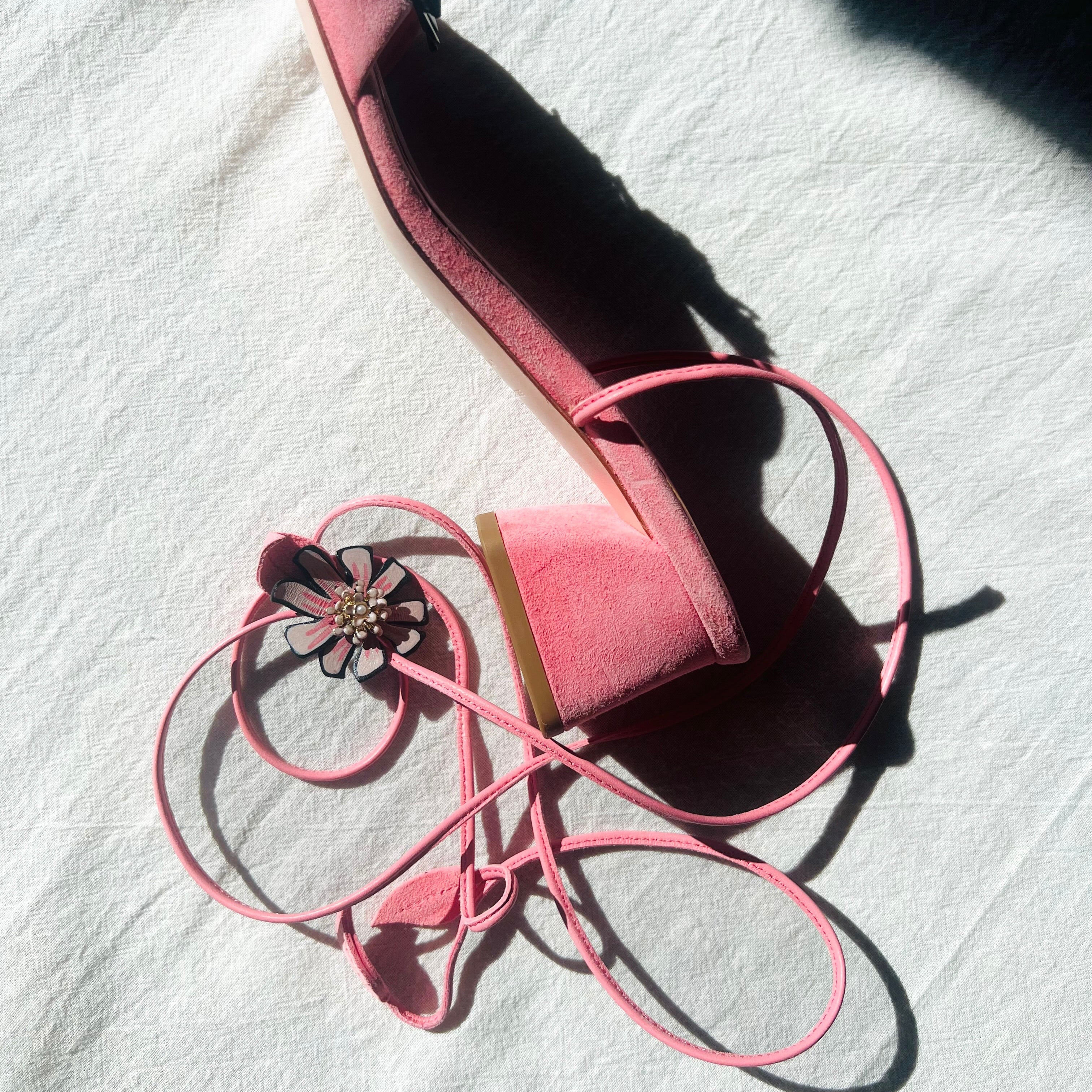 Contemporary shoe handcrafted in Italy features pink suede, hand painted floral appliques, self-tie ankle wrap closure, smooth leather sole and 2 inch block heel. Very wearable and a stunning piece of art! Originally over $1,100. Anytime I am at a fashion art exhibition and I see Roger Vivier shoes I am taken on a fantastical journey throughout time. And to think this label is STILL handcrafting beautiful, whimsical shoes is such a blessing!