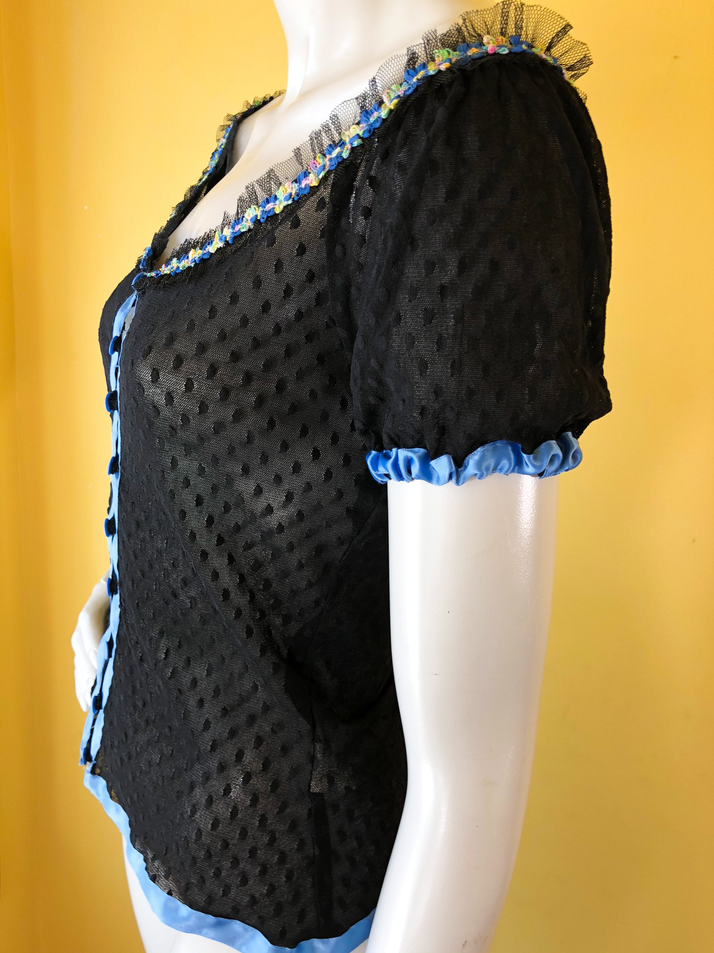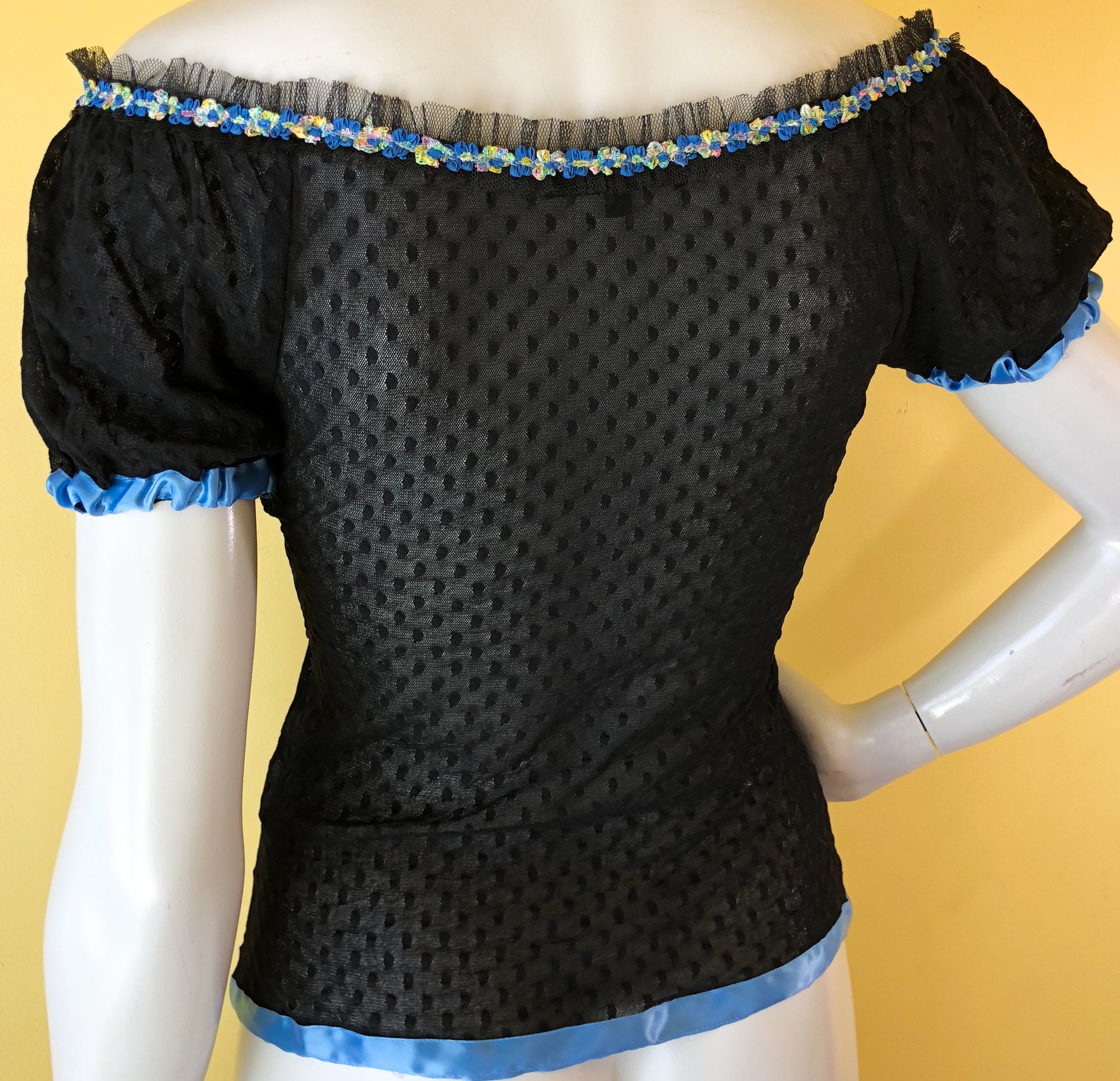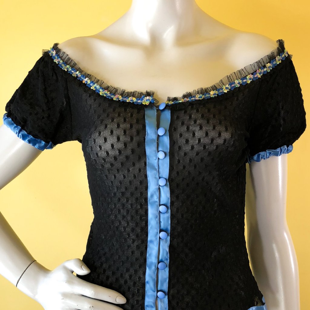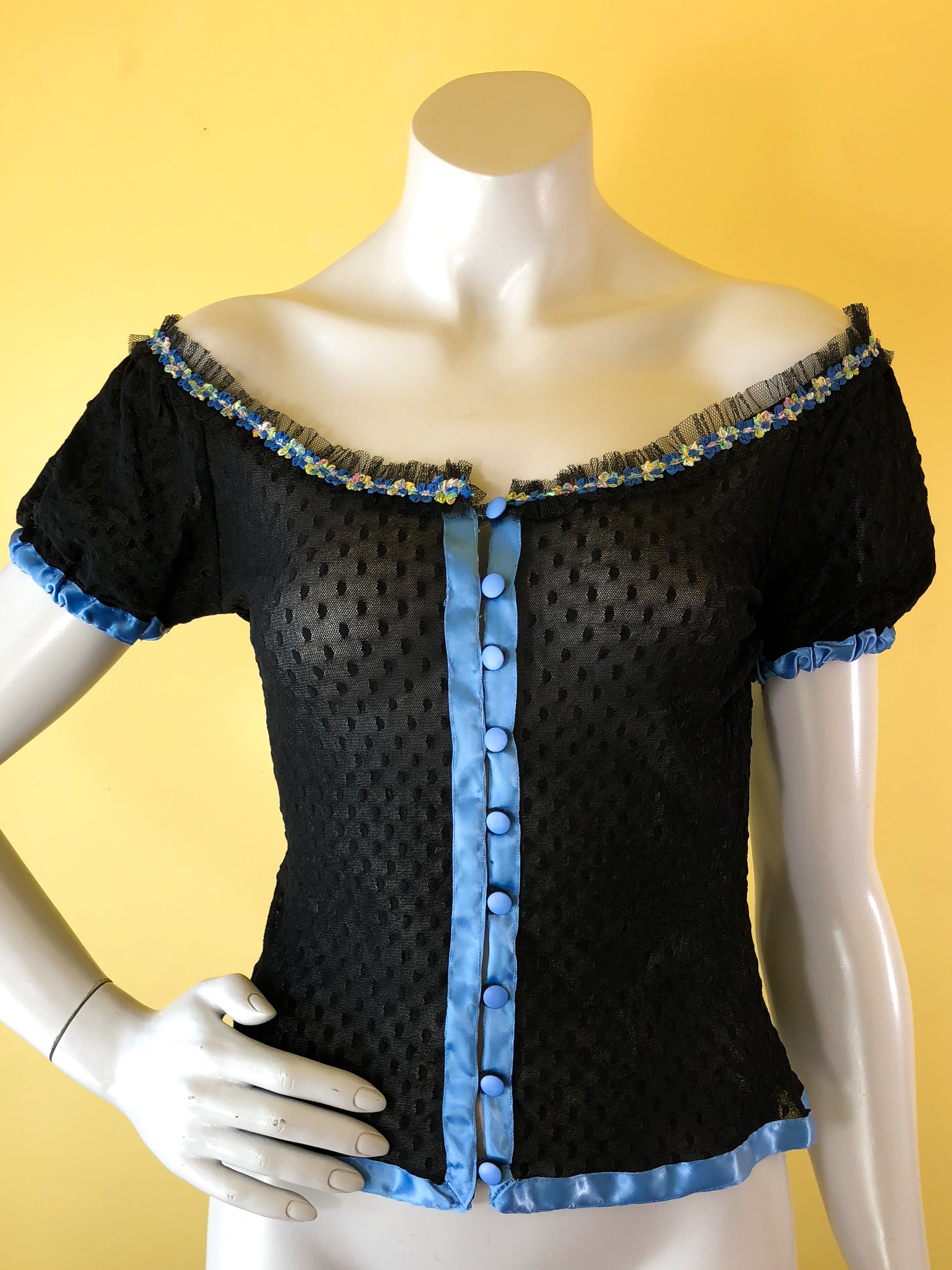 Sexy sheer lace off-the-shoulder 90s Betsey Johnson blouse with satin and floral details. Dreamy scoop neck. Slightly puffed short sleeves. Black dotted lace, with blue satin trim on button placket and bottom hem, with covered buttons.