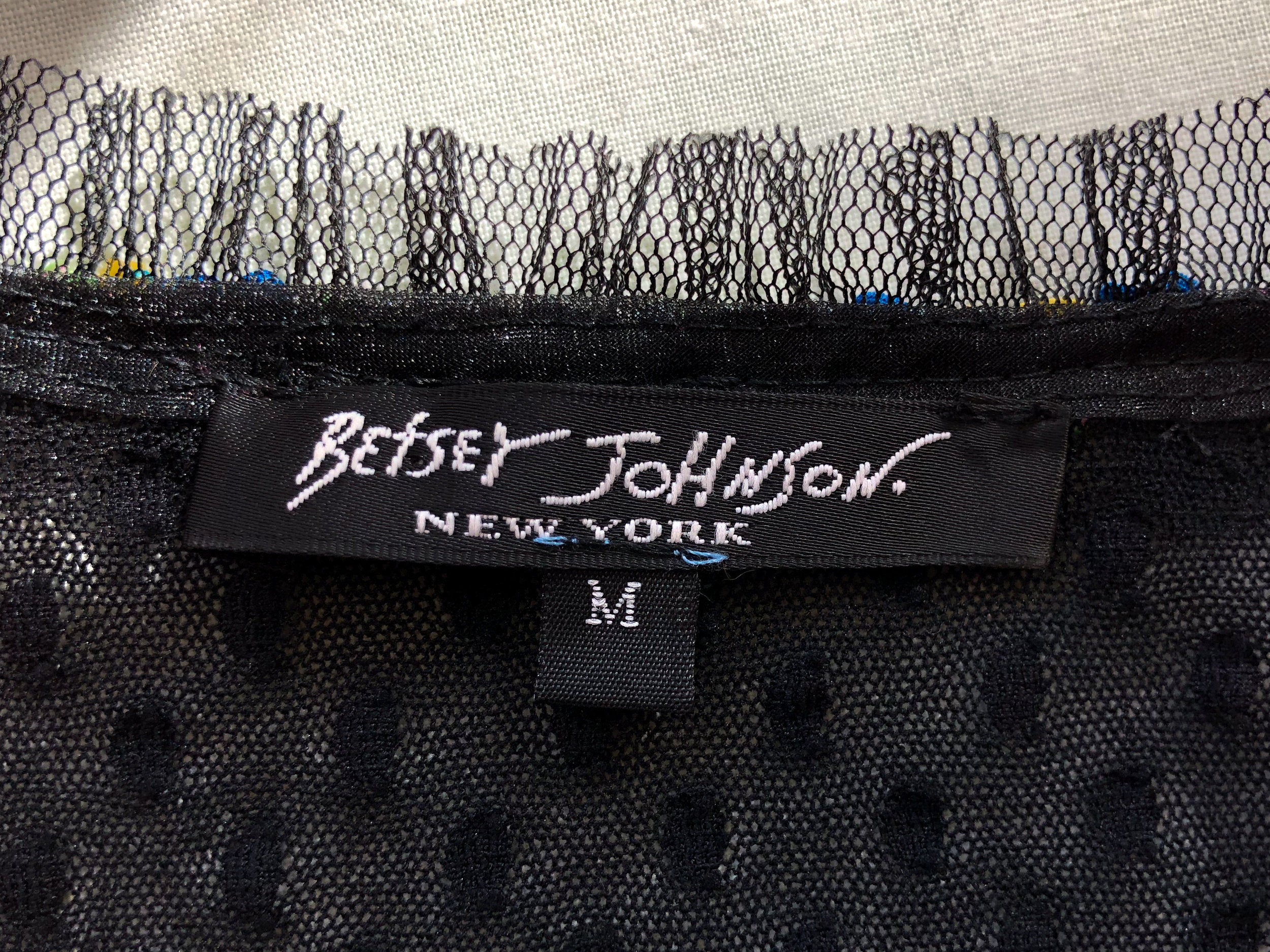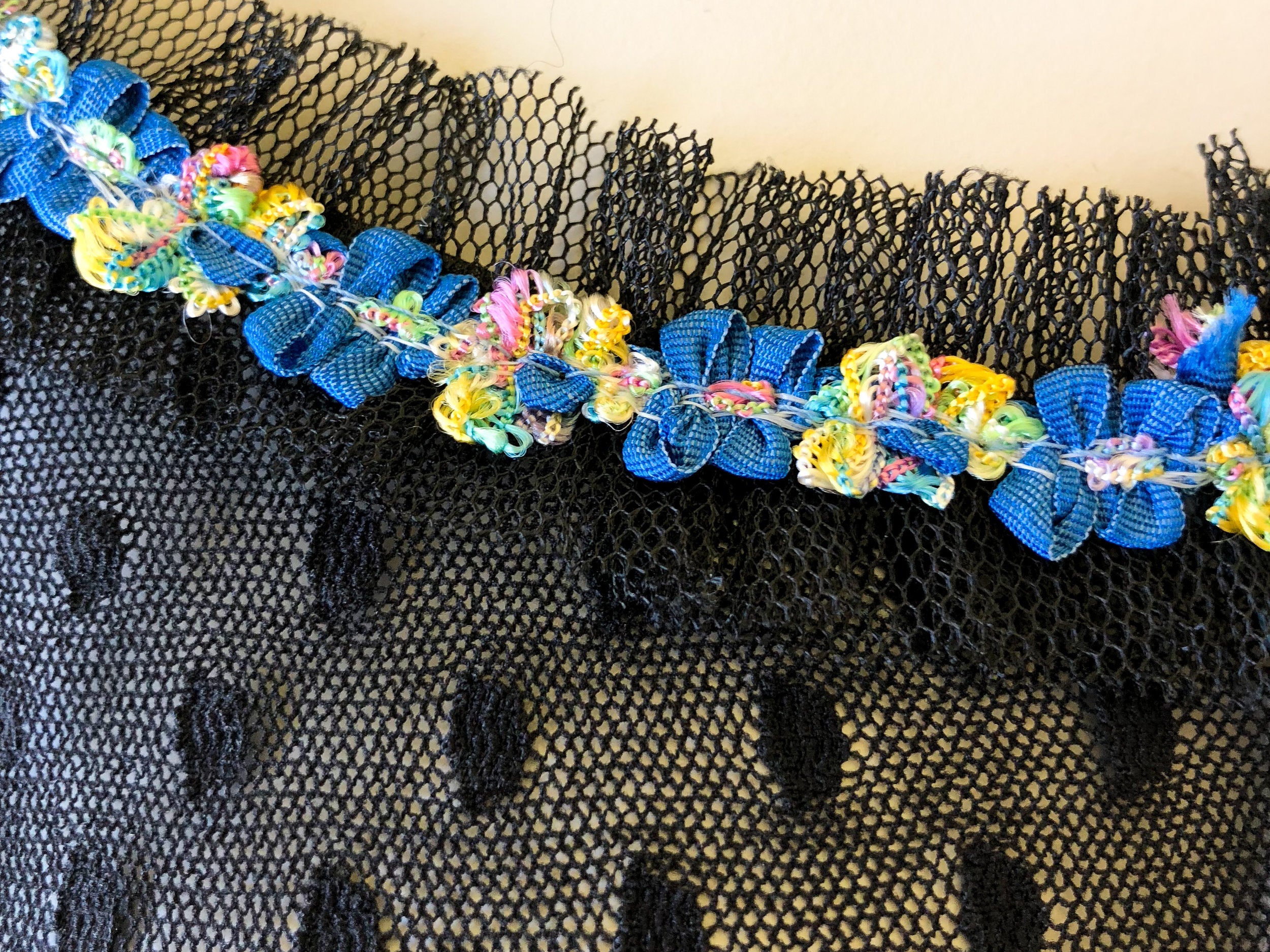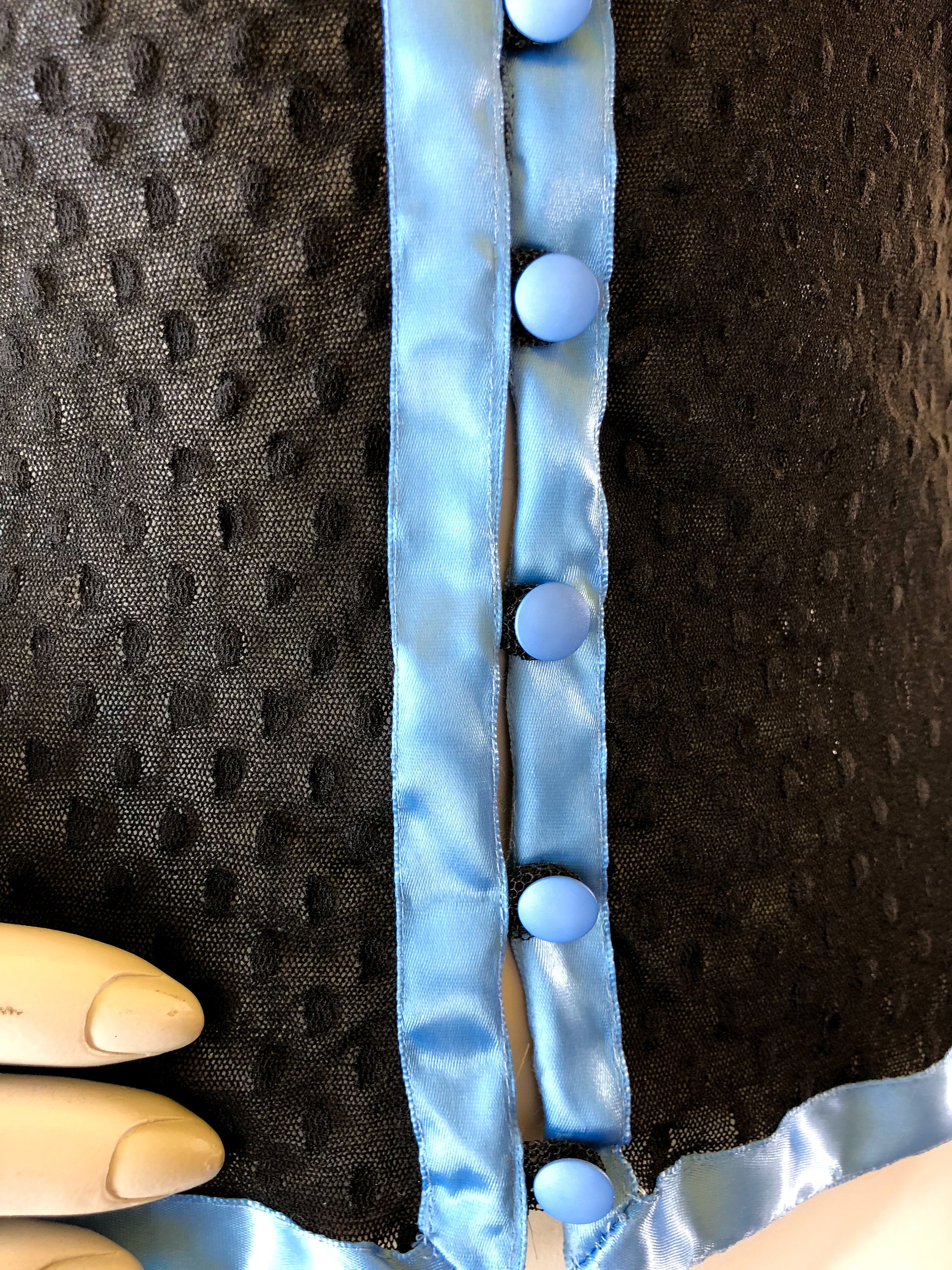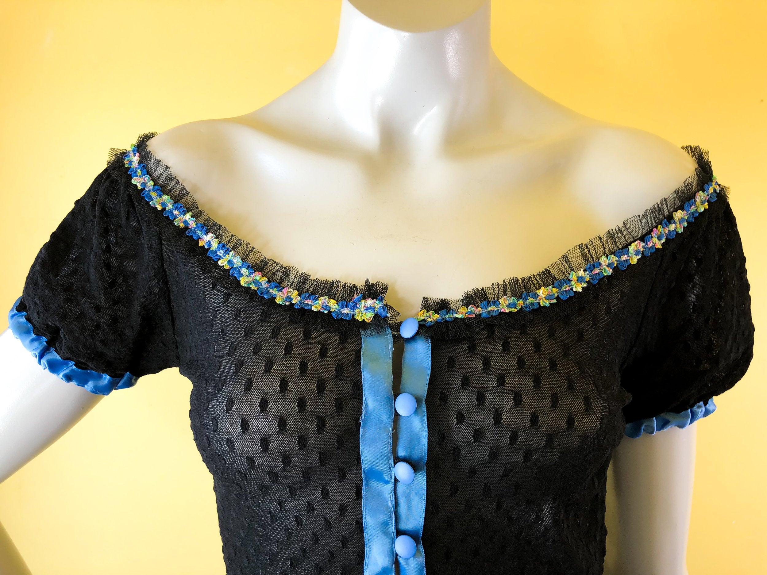 Sexy sheer lace off-the-shoulder 90s Betsey Johnson blouse with satin and floral details. Dreamy scoop neck. Slightly puffed short sleeves. Black dotted lace, with blue satin trim on button placket and bottom hem, with covered buttons.