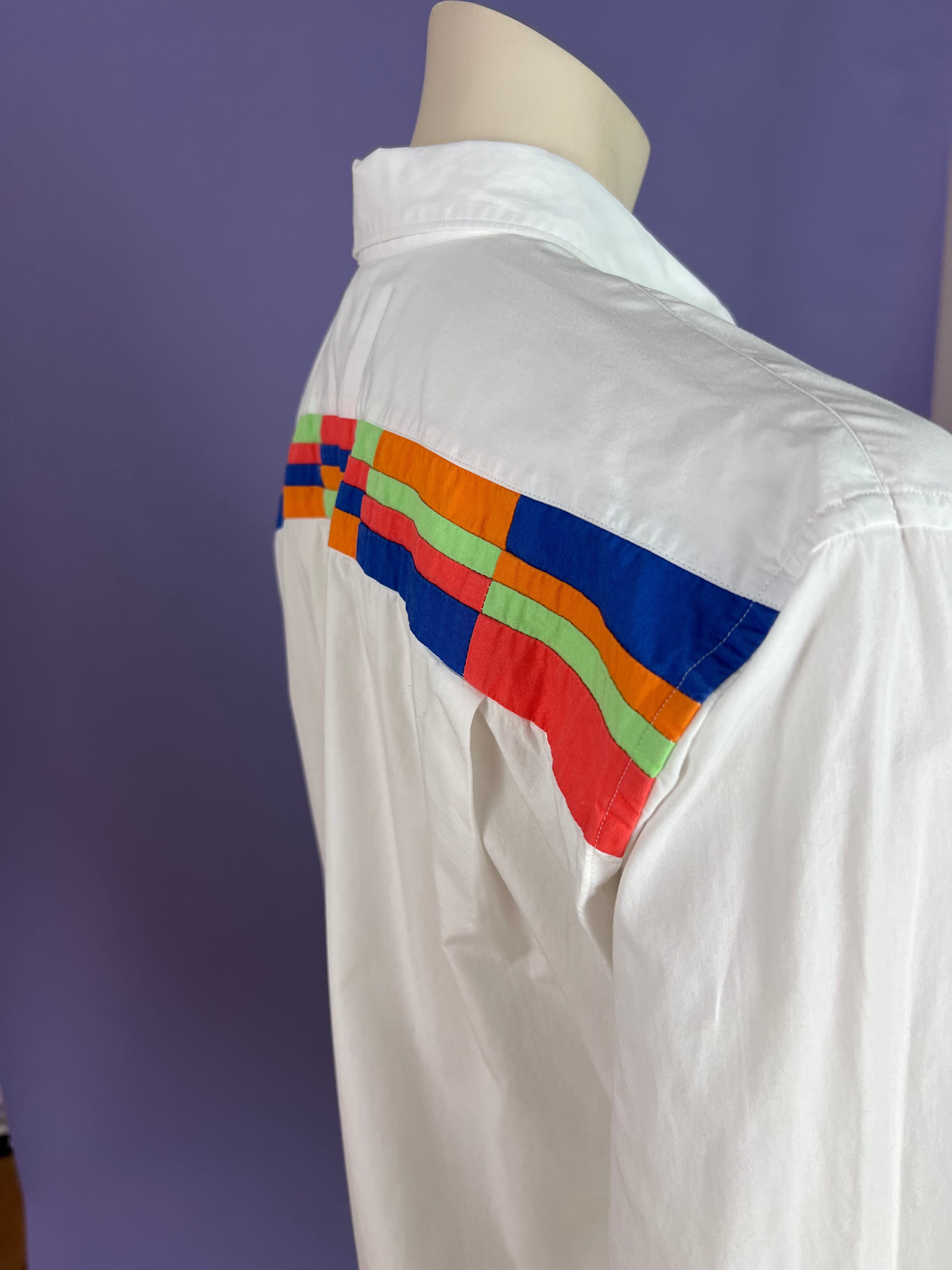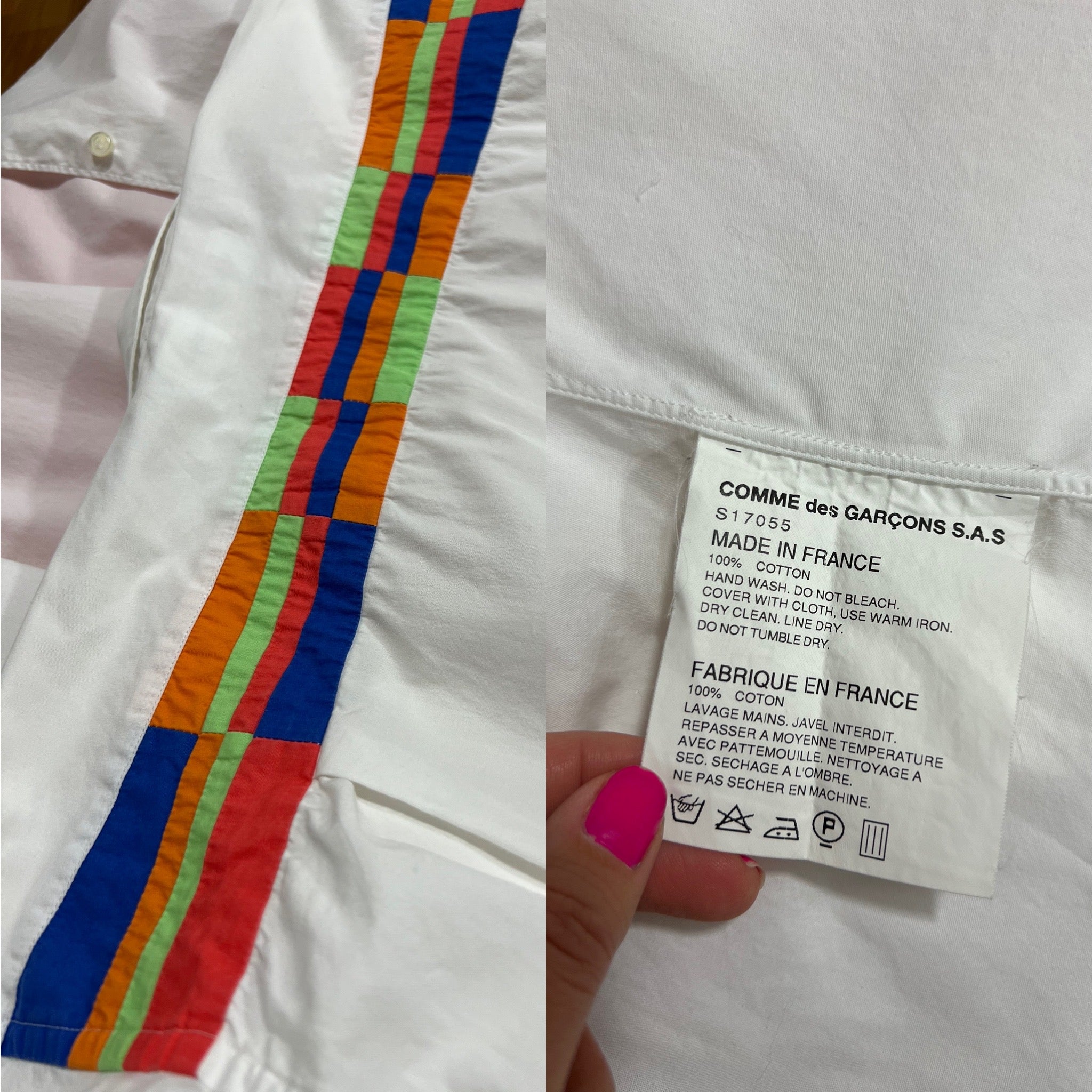Rare Comme piece!  Crisp white long sleeve button up shirt.  Pocket at front.  Colorful paneled back detailing.  Technically a men's piece but definitely unisex!  Clean and ready to wear!