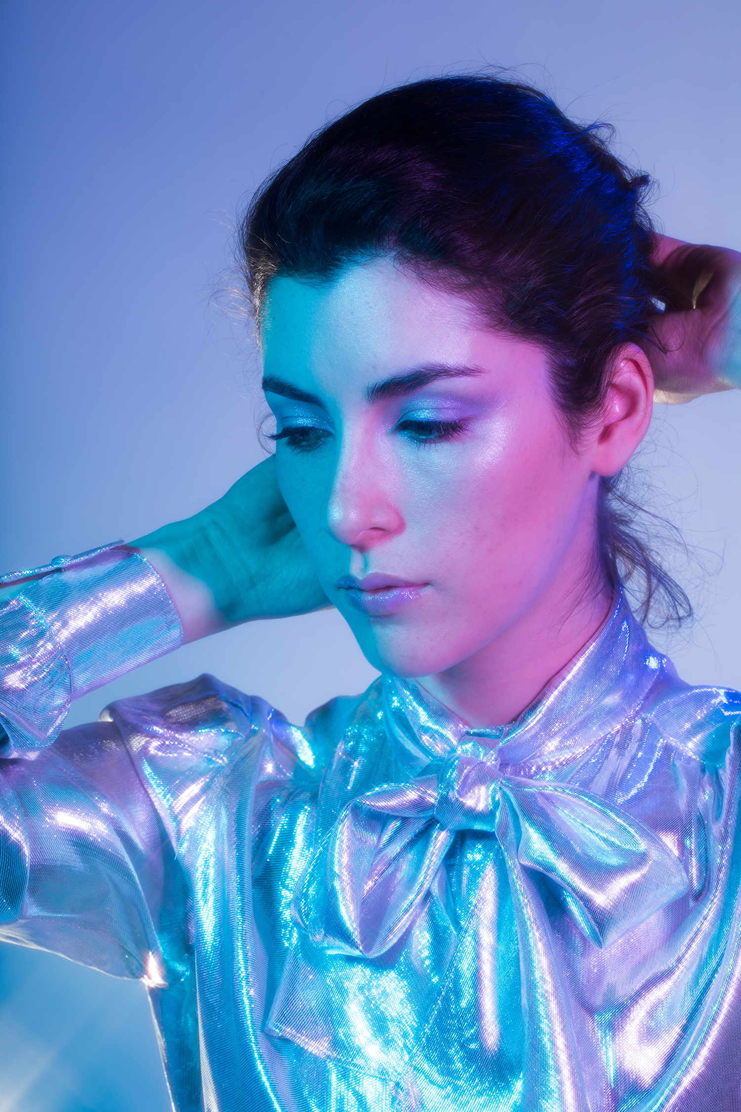 Luxurious 80s slinky St. John silver metallic disco blouse. Buttons up front, collar turns to a tie at neck. So pretty! Reflects the light that surrounds it. Stun the crowd!
