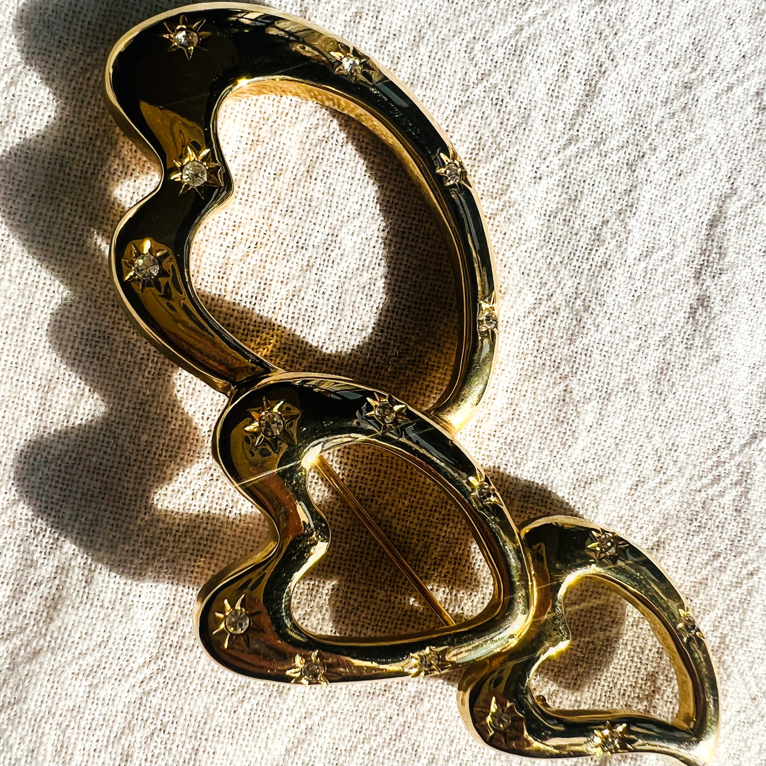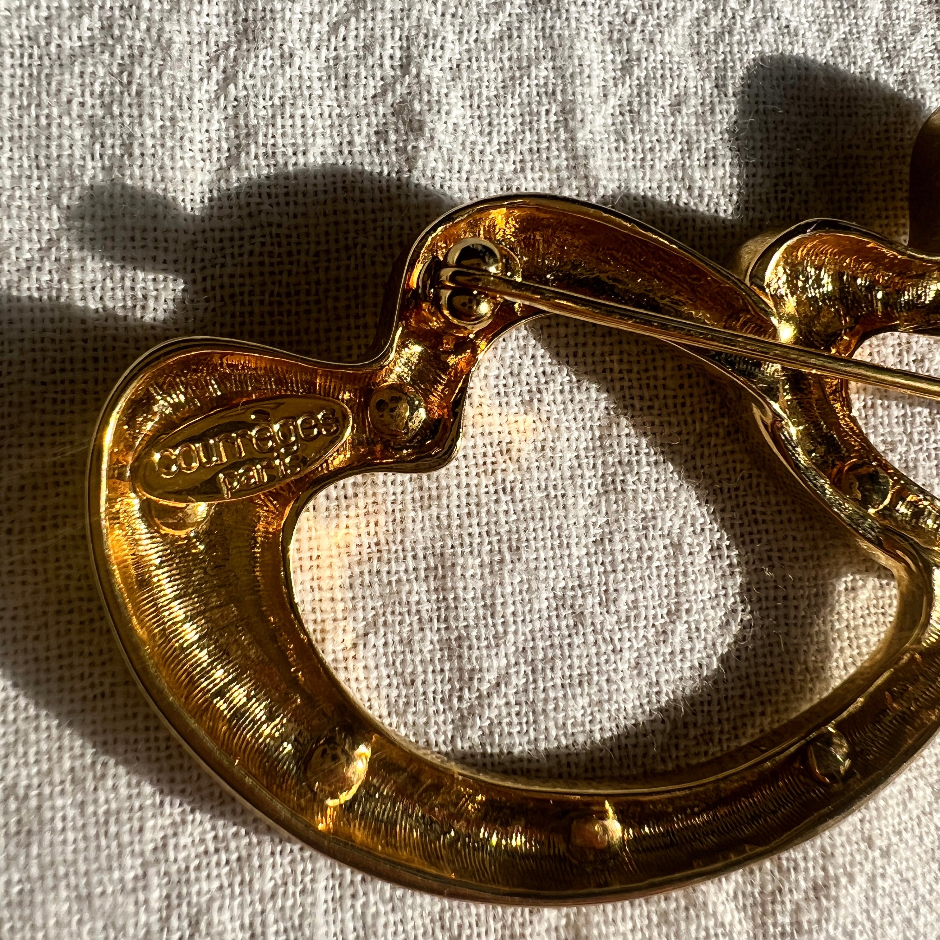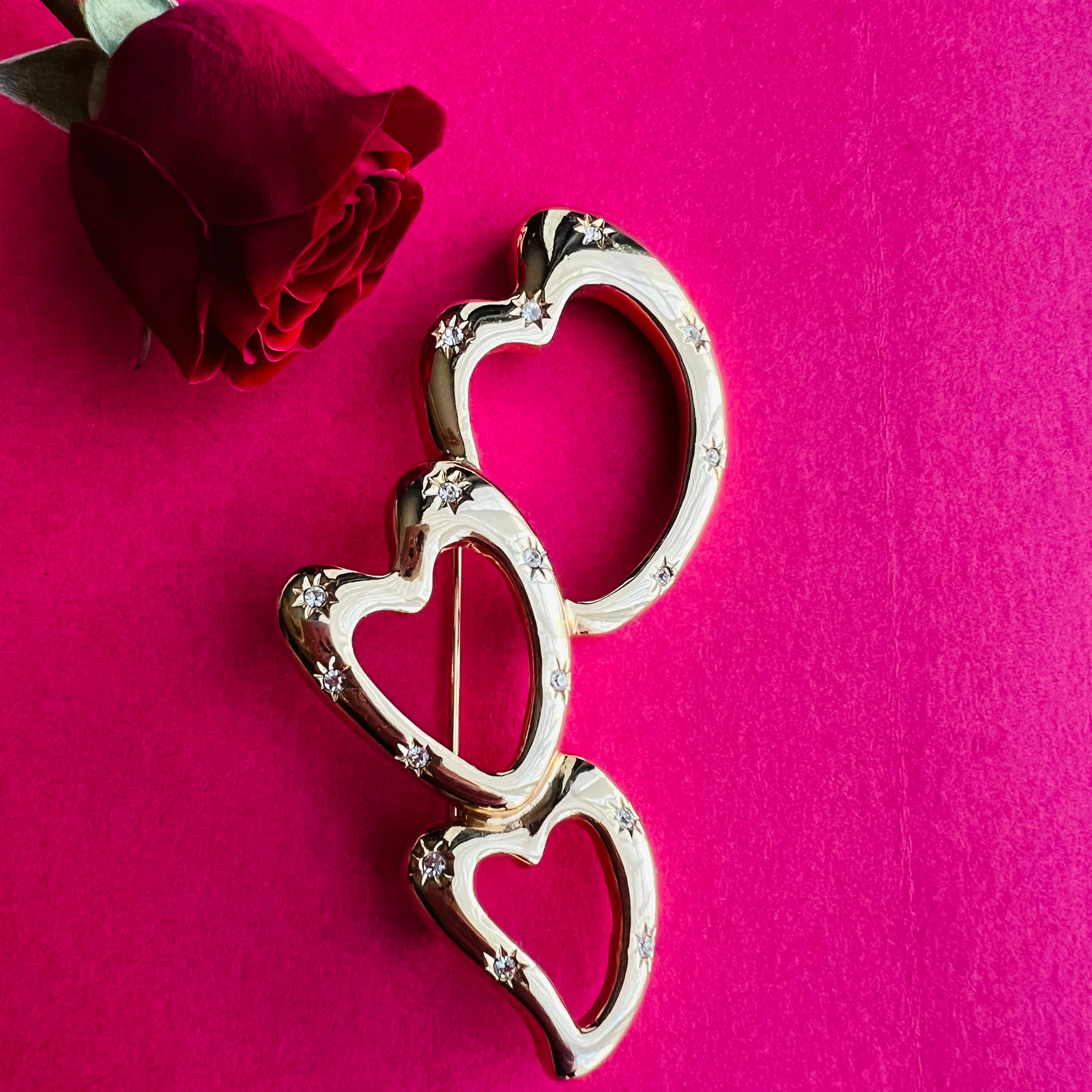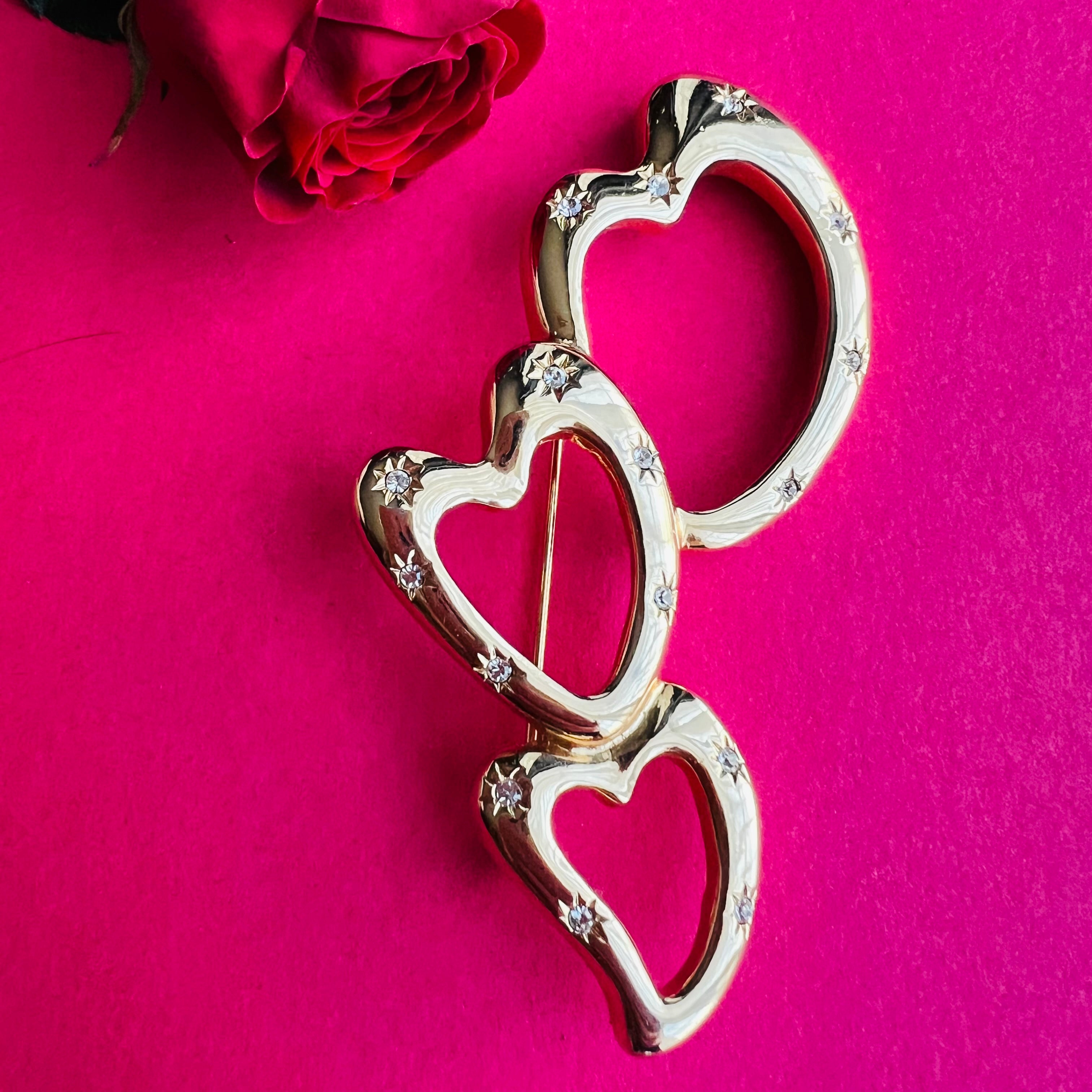Courrèges Paris vintage gold plated triple heart brooch with inlaid crystals. There is star like etching around each crystal. Signed on back. Love the design of this piece.