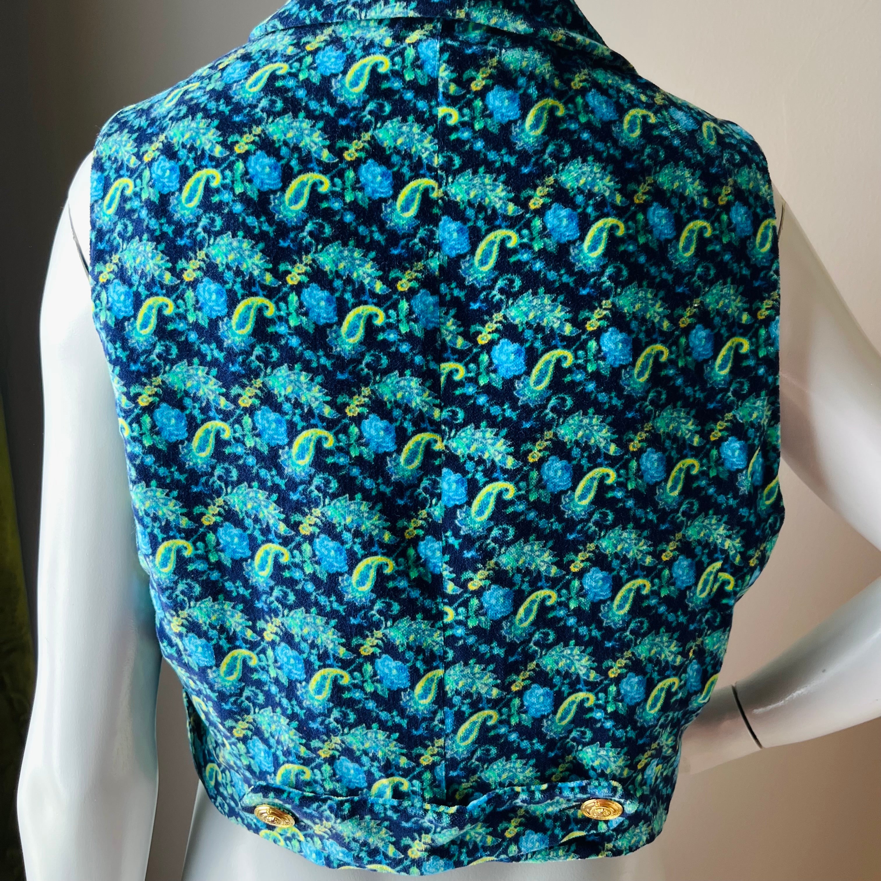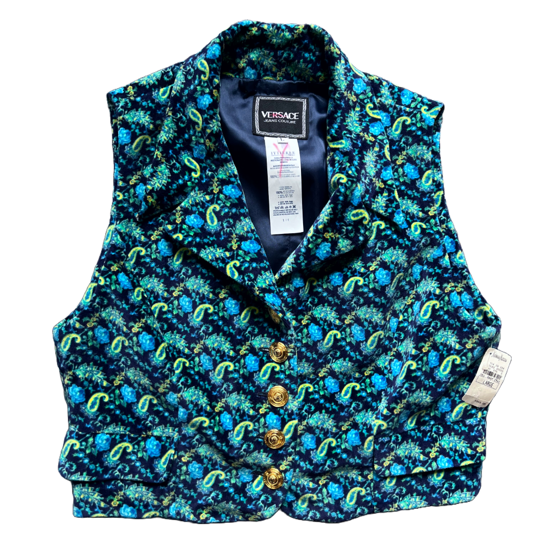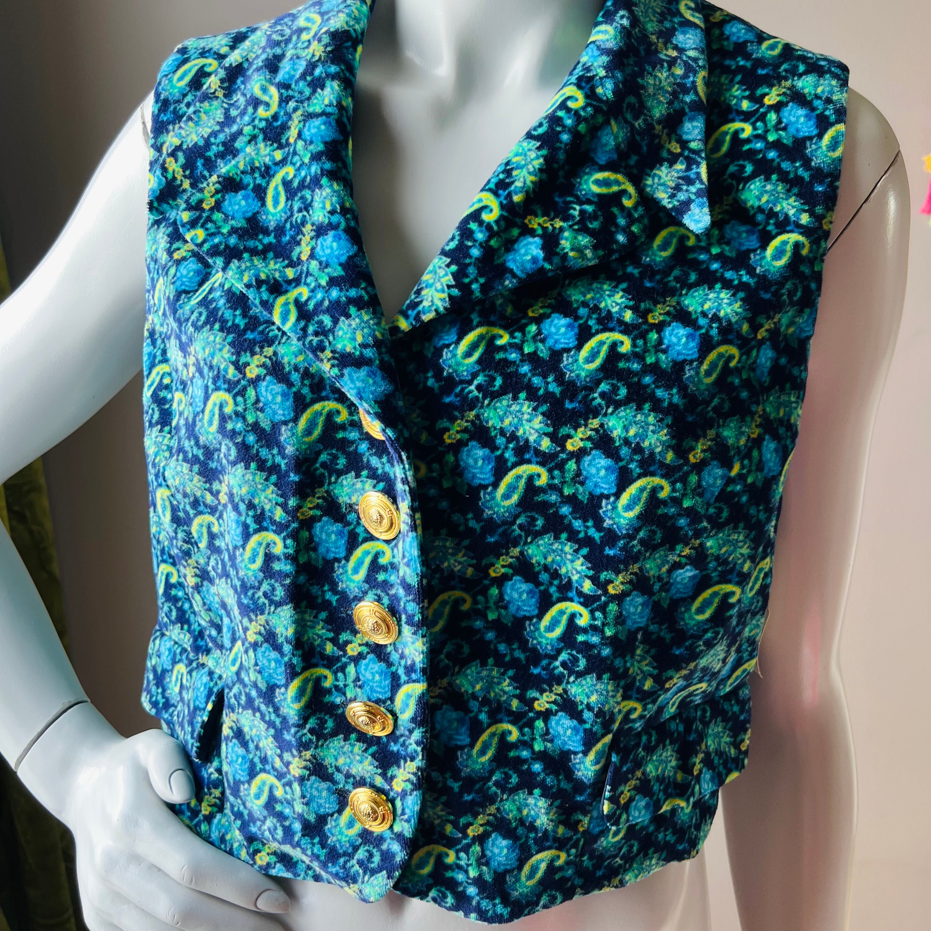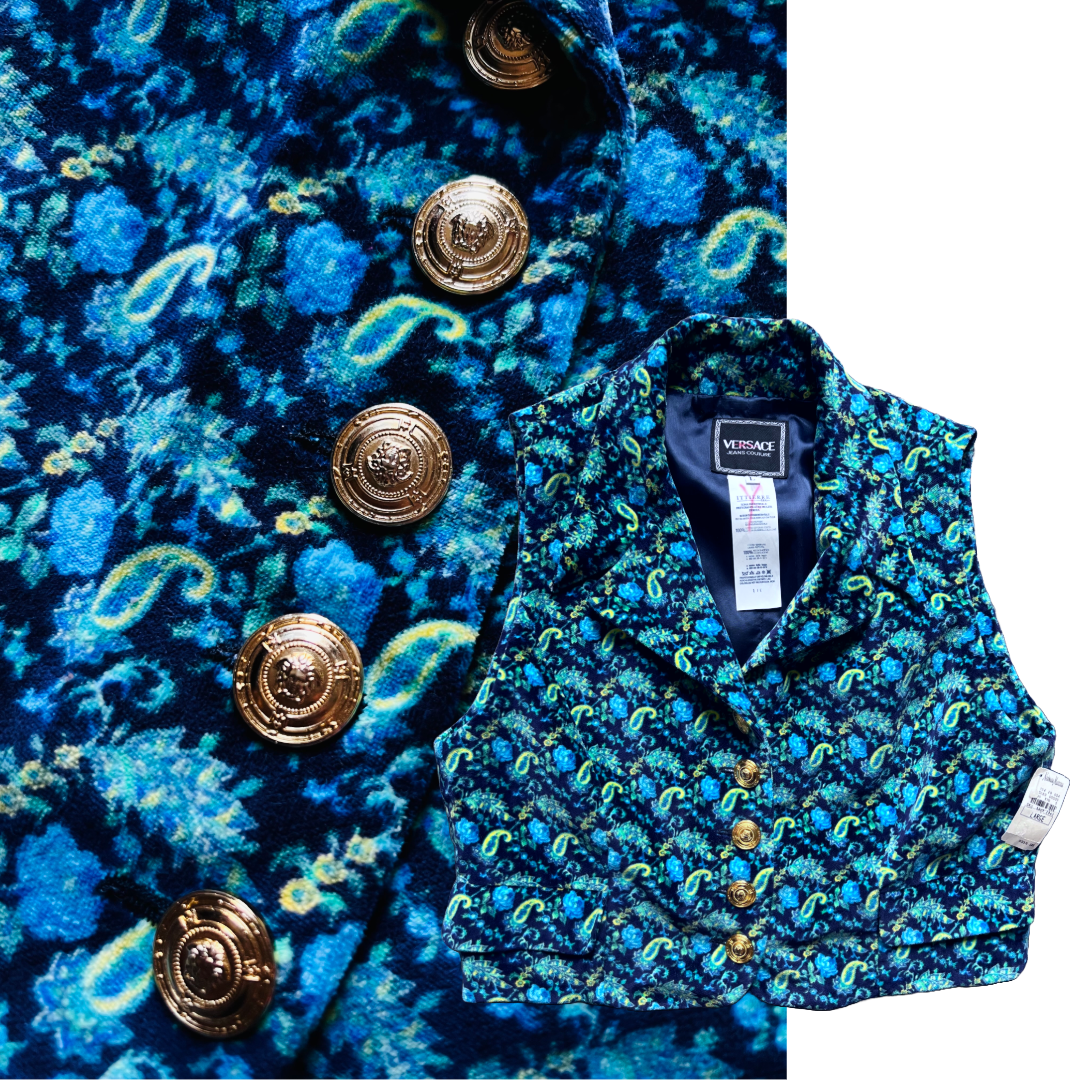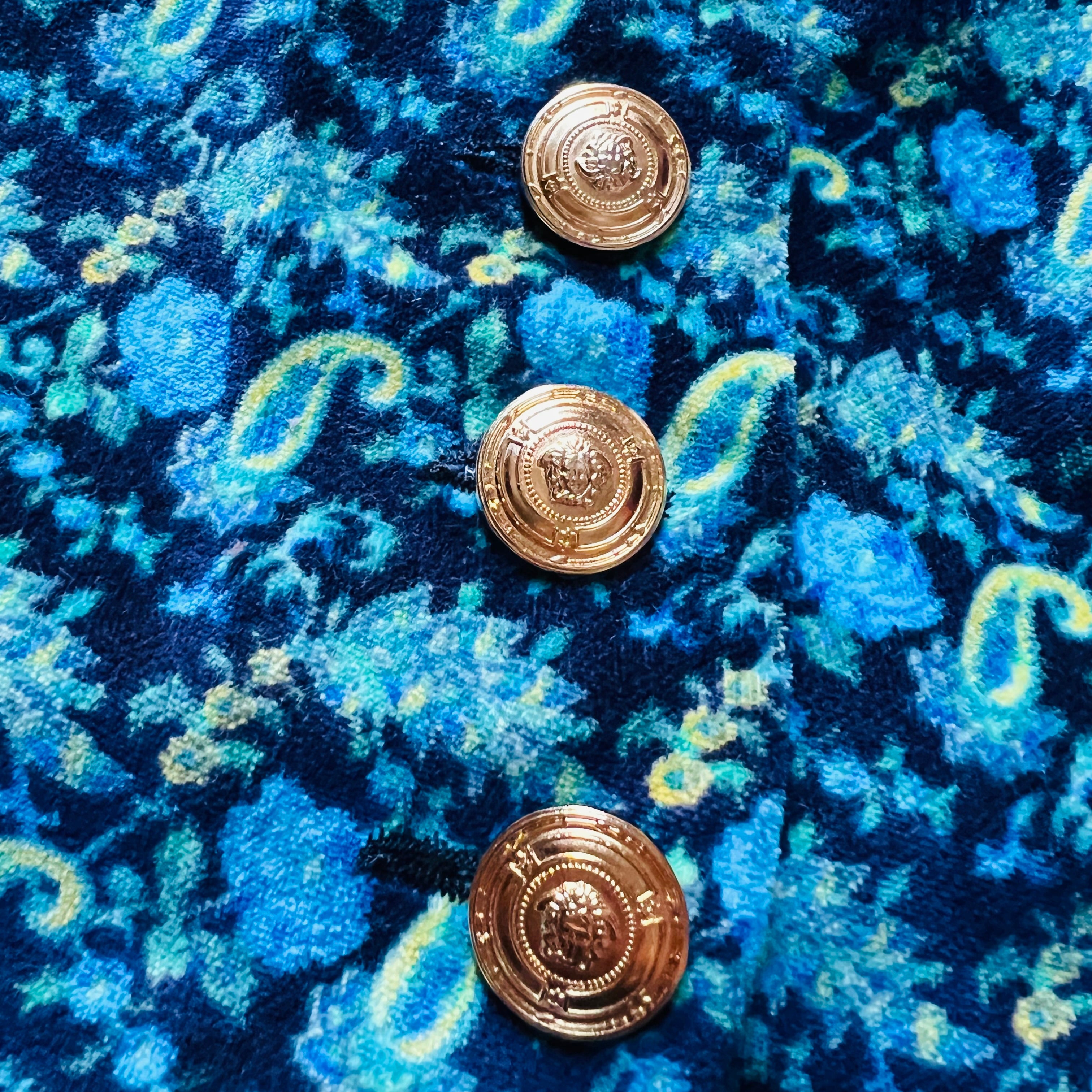 Stunning soft velvet paisley 90s Versace Jeans Couture vest. Gorgeous gold medusa buttons. Lined. Never worn, new with tags. Original price $315. Hologram on tag intact. Pockets are still sewn mostly shut. Lovely collar. Back detail with gold Medusa buttons.