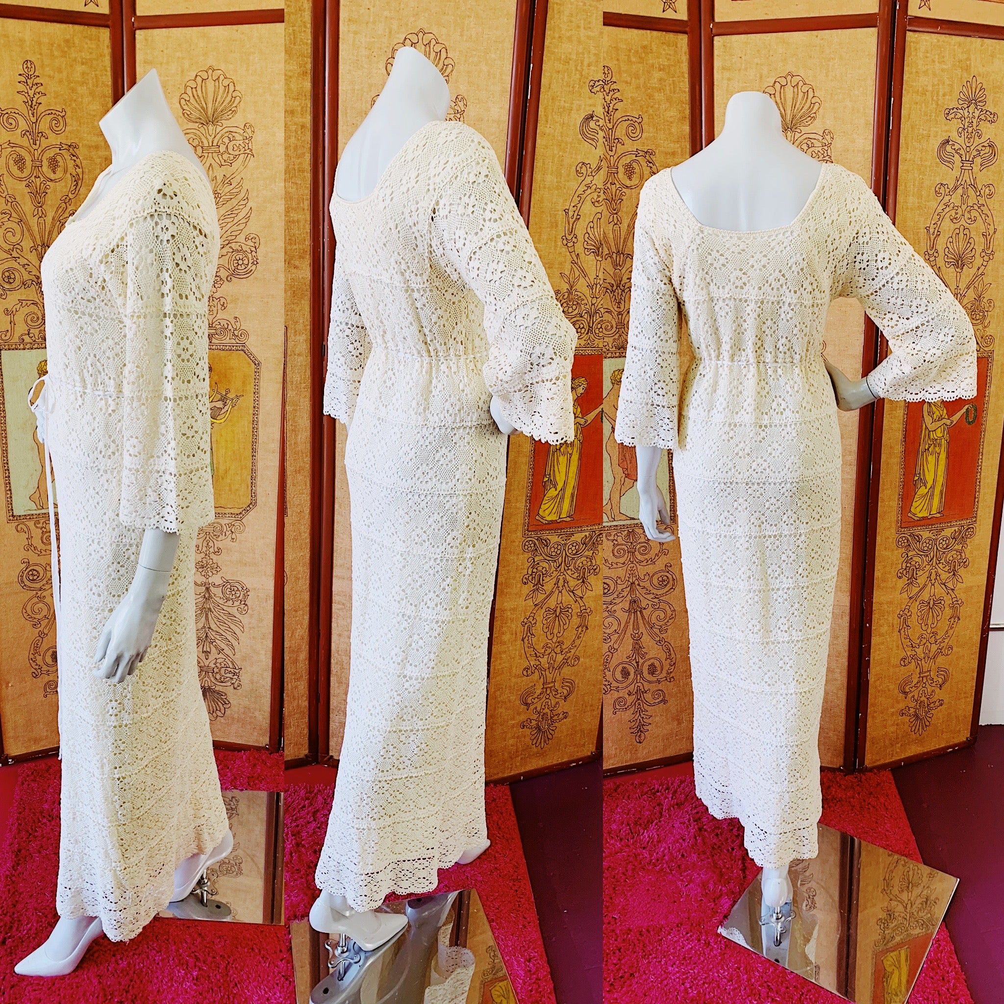 The perfect dress for a magical wedding, or even to just be fabulous everyday. Full crochet, bell sleeves, pulls over head, ribbon at waist to cinch. A rare piece that has been preserved and is still very wearable today!