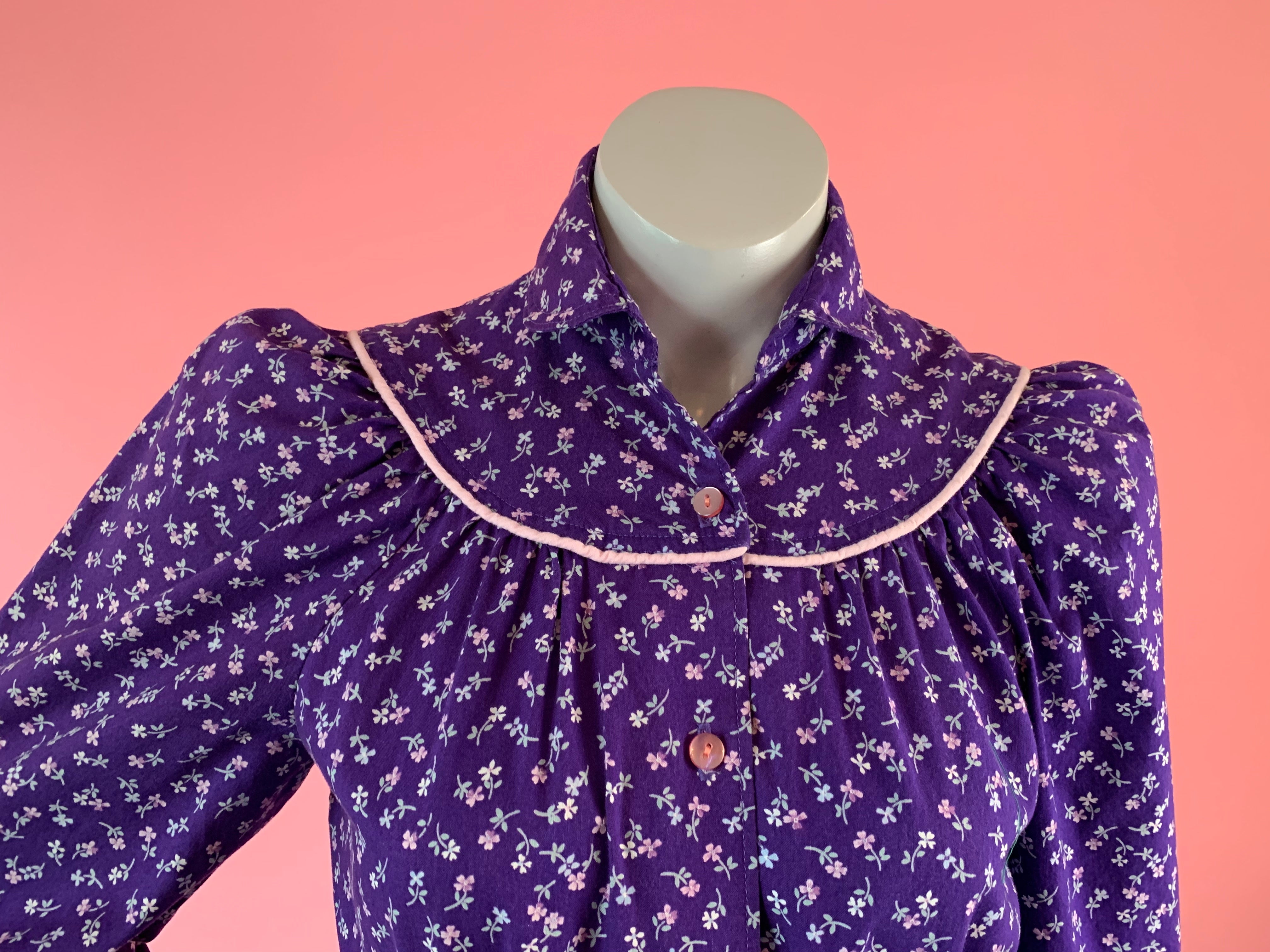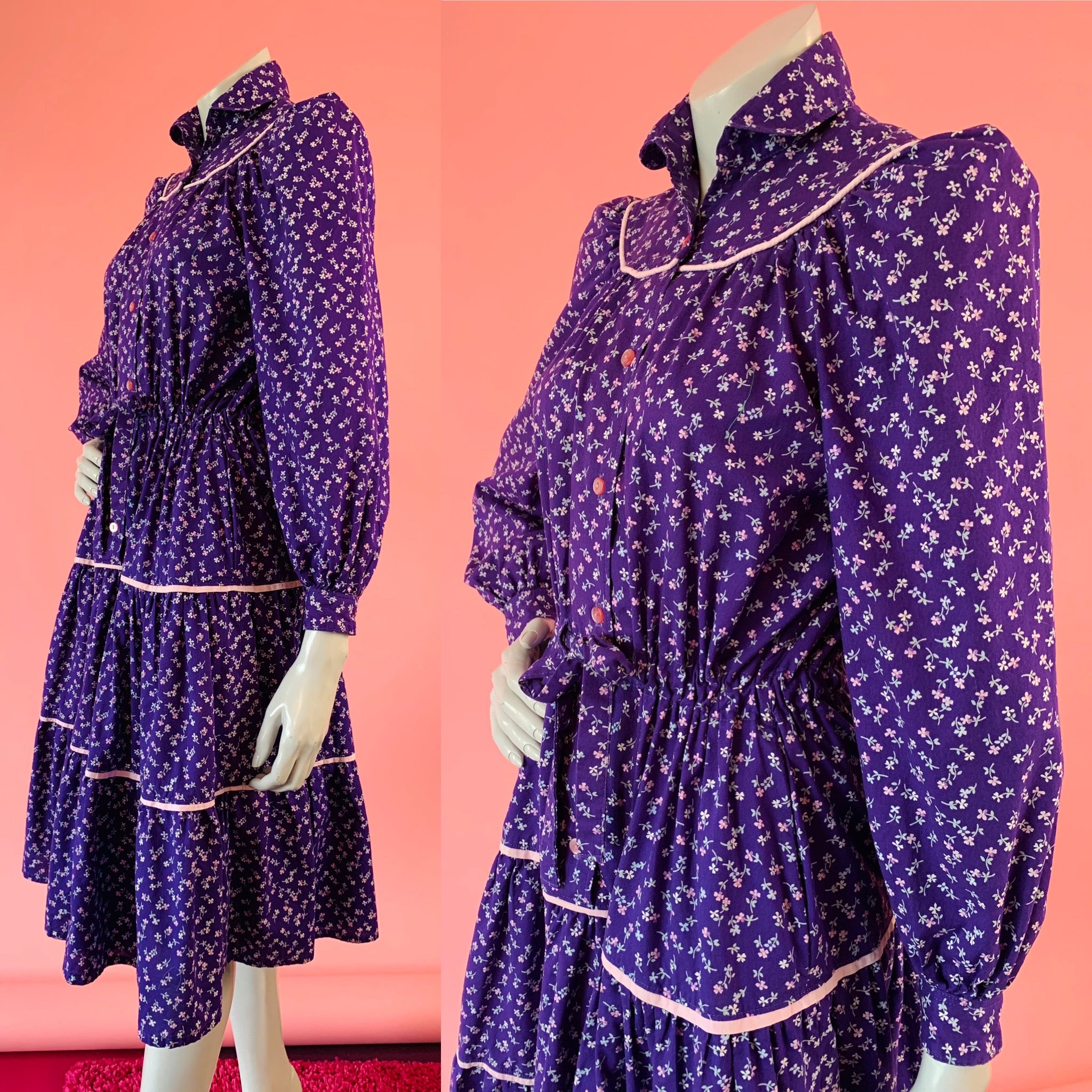 Purple floral prairie dress with pink piping. Buttons up front. Has pockets!! Puff sleeves that button at wrists. Best thing about this dress is you can cinch the waist to fit exactly as you'd like. It is built in to the garment and ties at front. Classic piece.