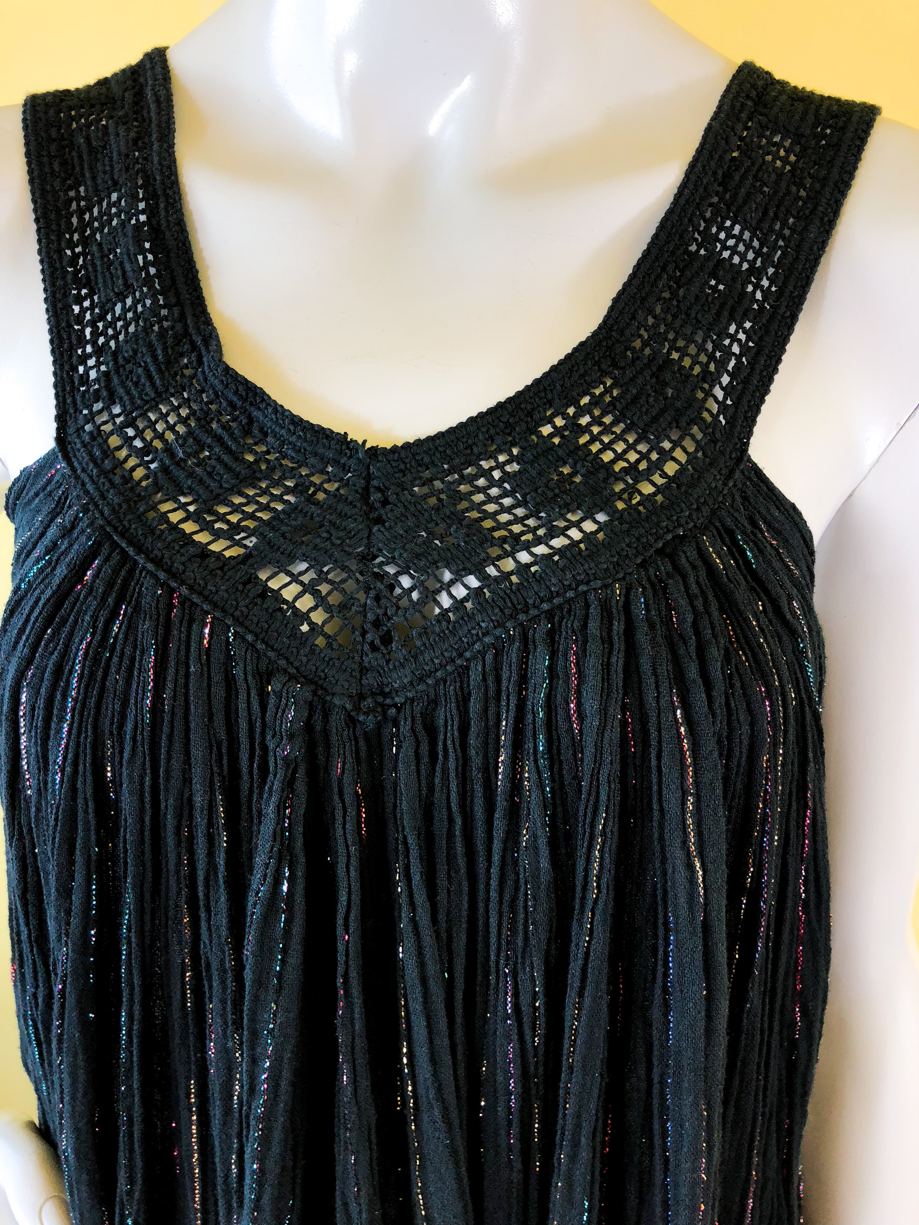 Black 1970s lightweight cotton gauze sleeveless dress! Evocative of witchy icon, Stevie Nicks! Features rainbow metallic threads and a crochet neckline. Wear with a belt to accentuate the waist or without for a breezy, free look.