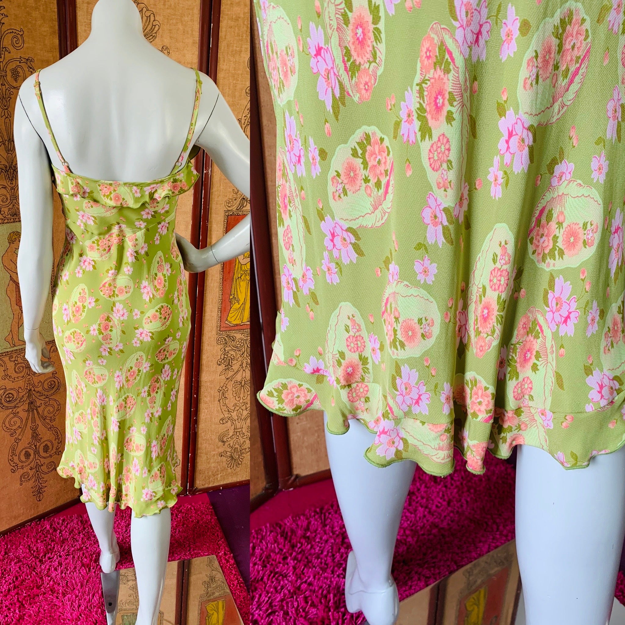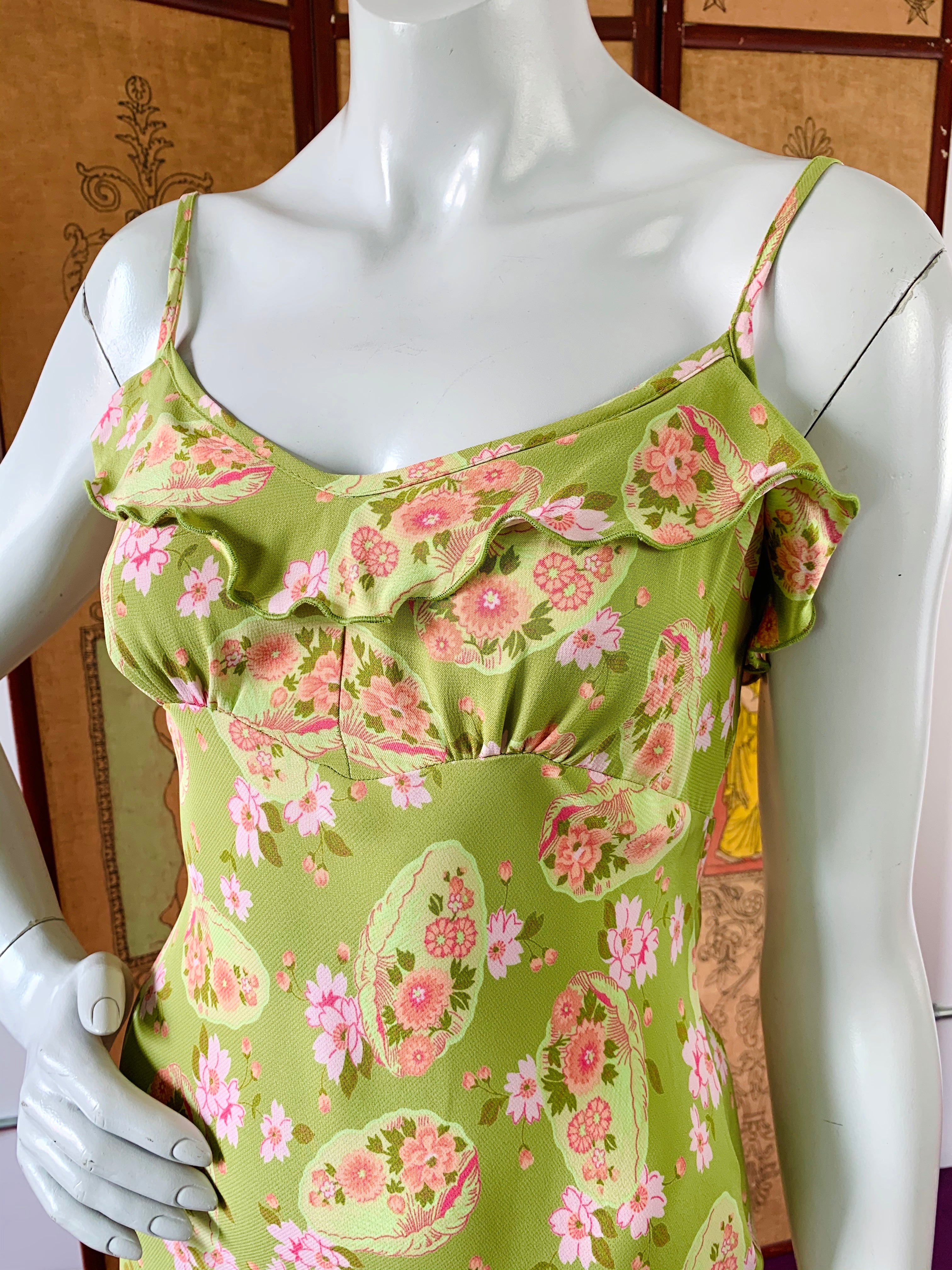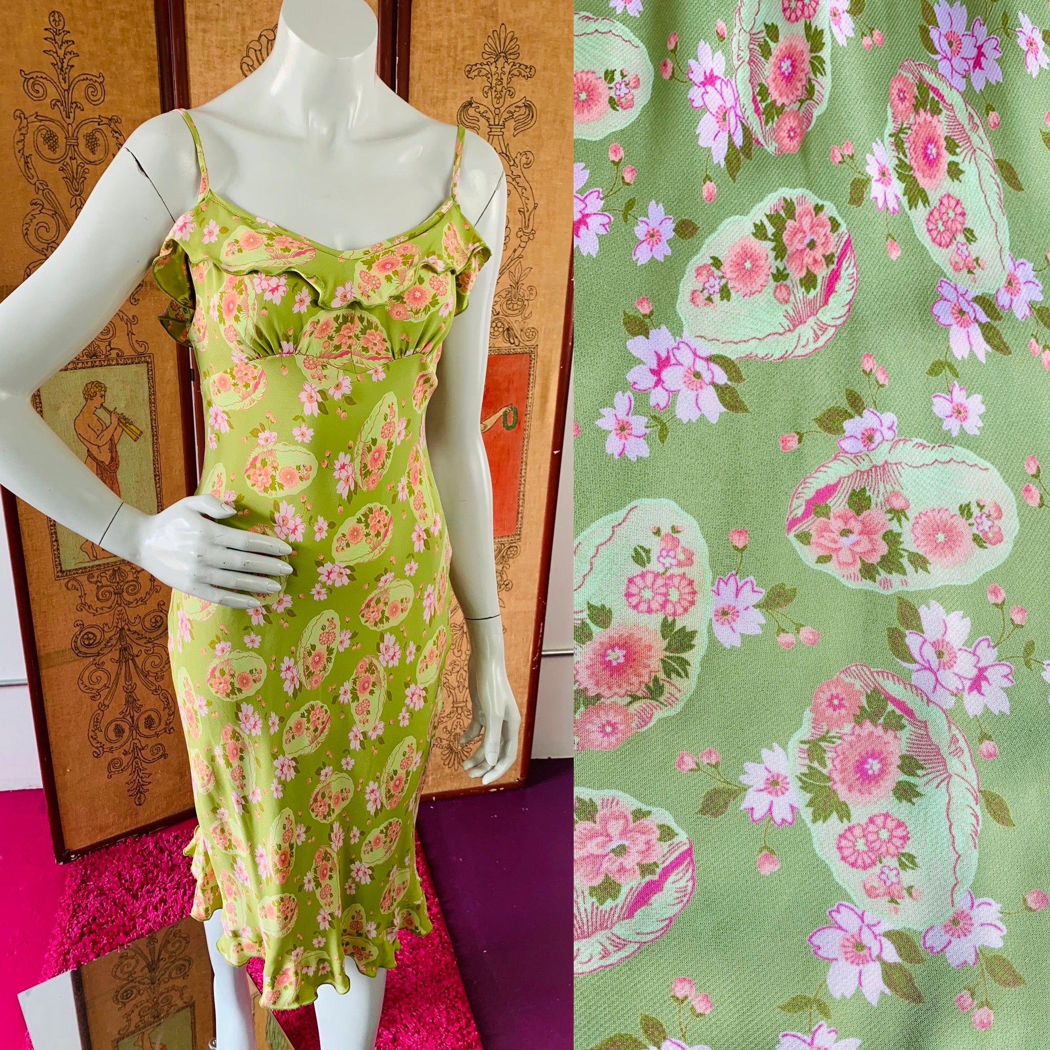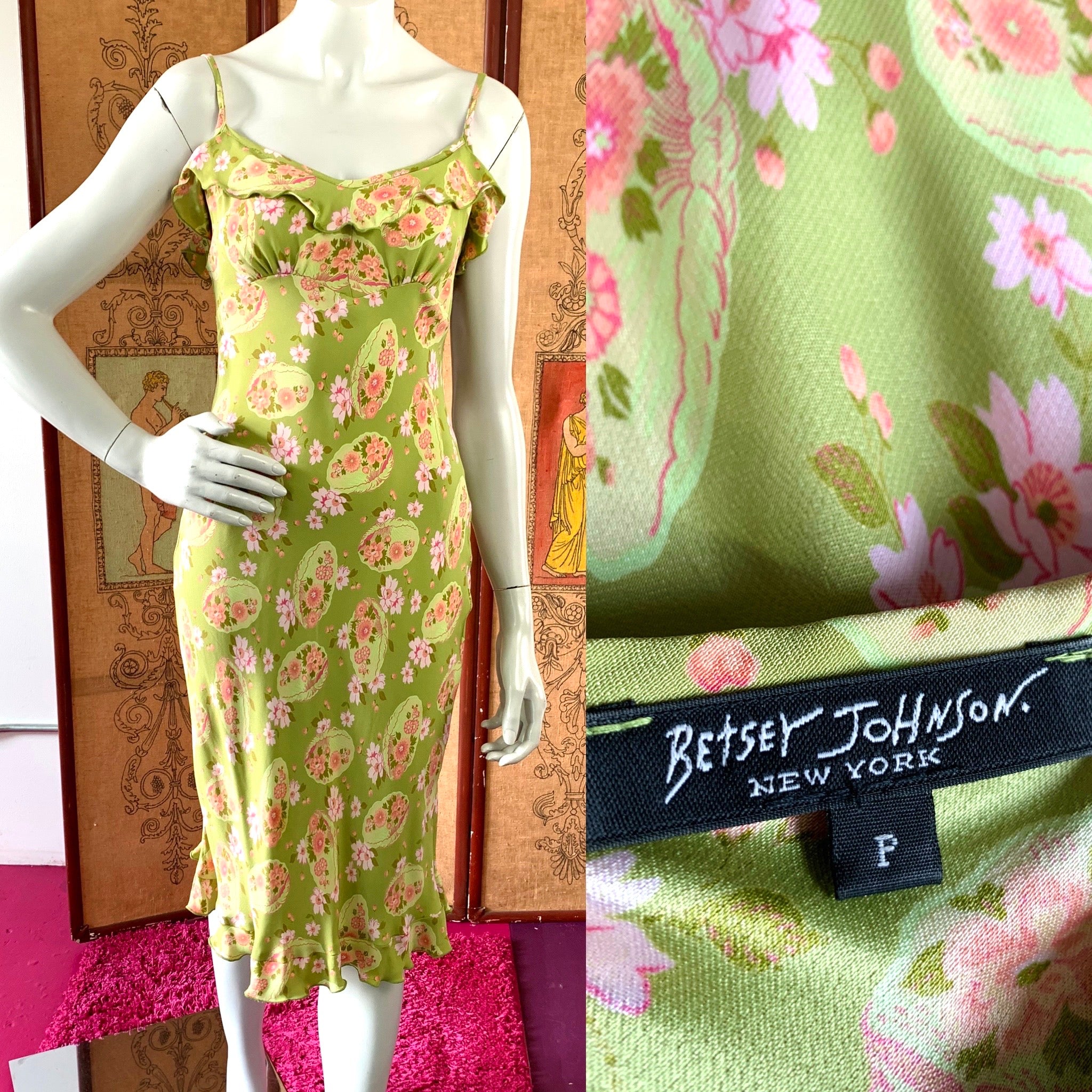 The prettiest empire waist Betsy Johnson dress. Sage green with pink flowers. Ruffle at neckline and hem. Pulls over head to wear. 90s Betsey is the best!