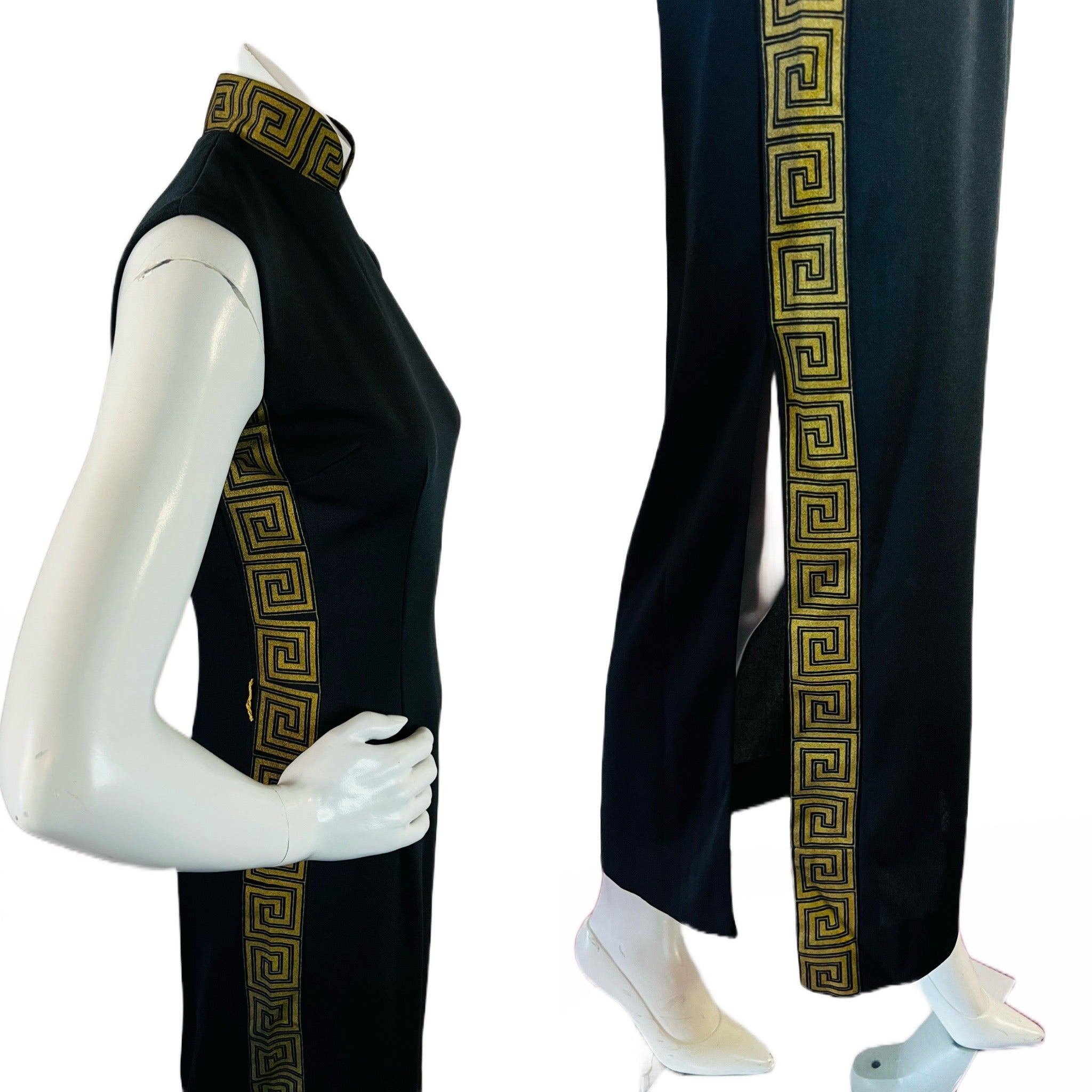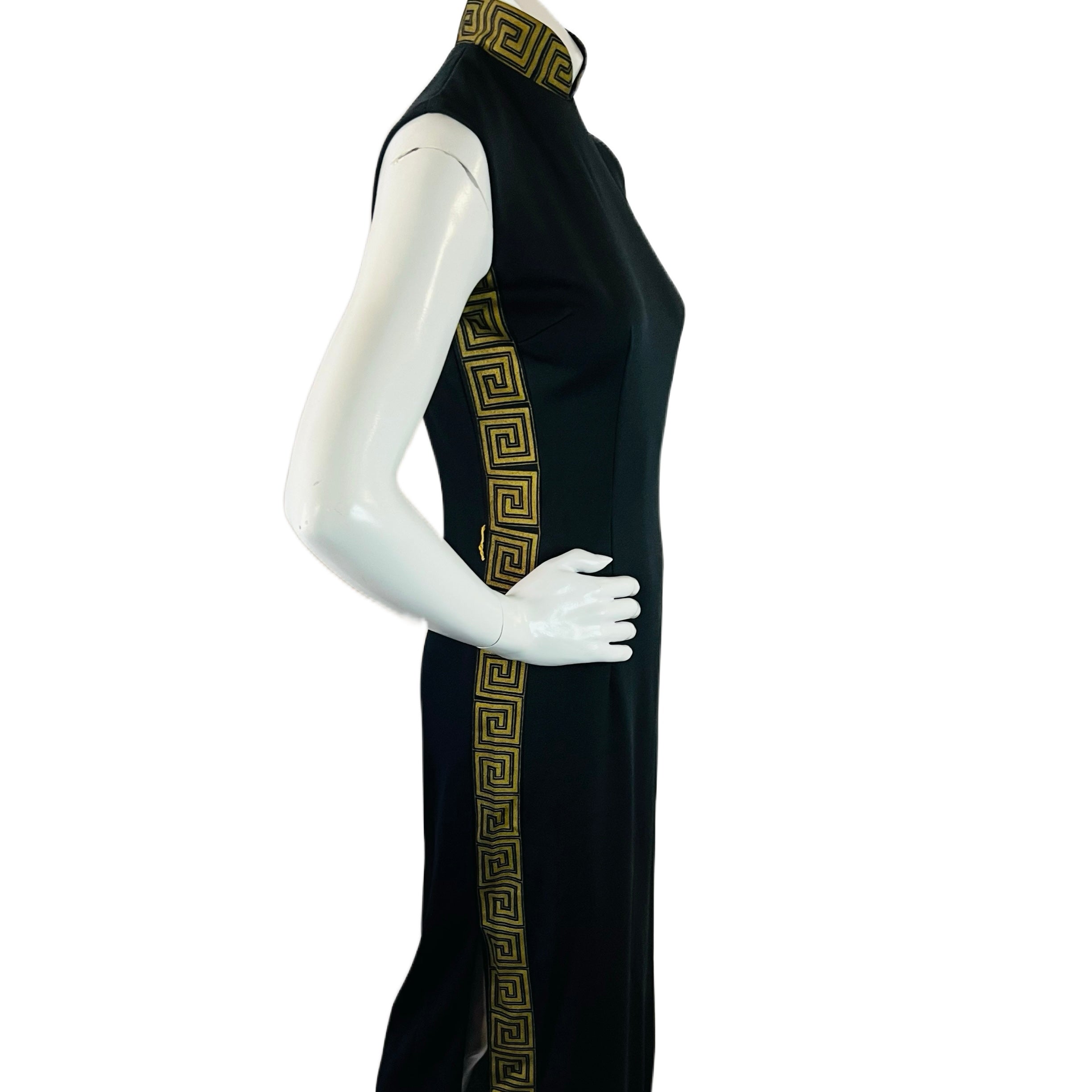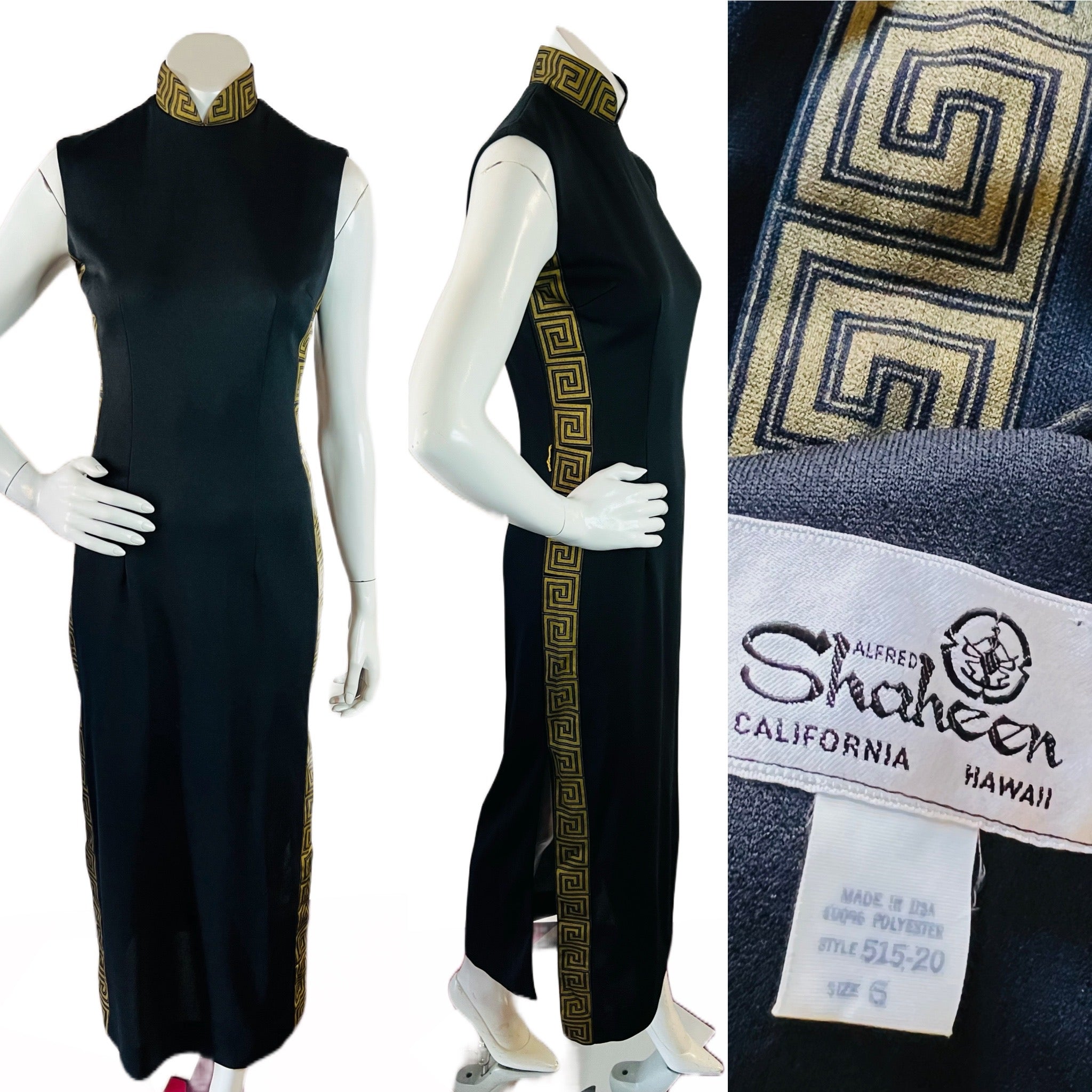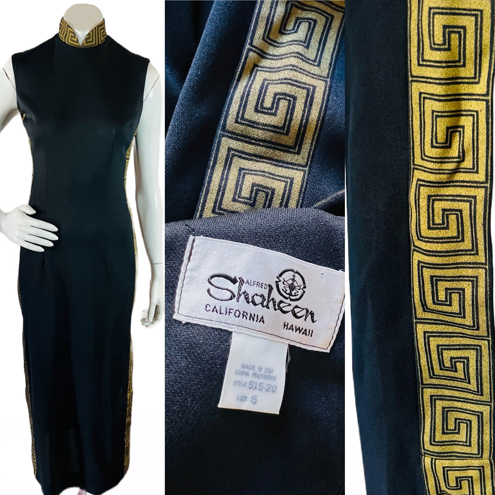 ⭐️Stun the crowd in this immaculate black & gold hostess gown by Alfred Shaheen. Slits at sides to show off your legs. High collar with hook and eyes at the back. Zips up back. Loops at sides for a belt (would love to see this with layered chain belts a la Chanel or Versace). This pieces seems like it has never been worn. Give her the moment she deserves!