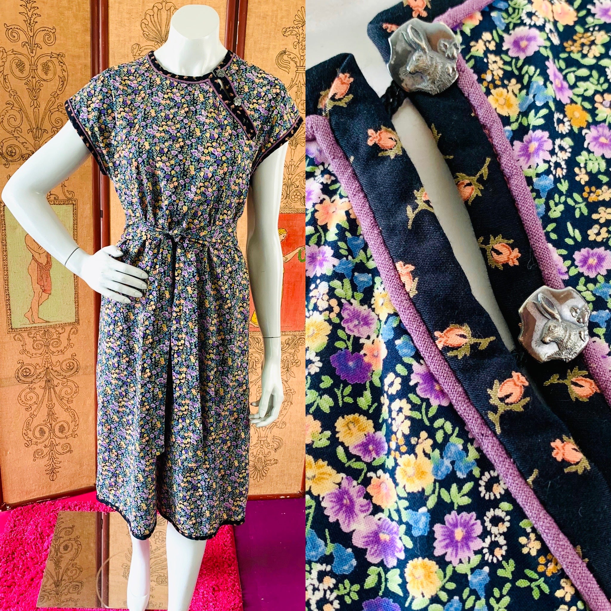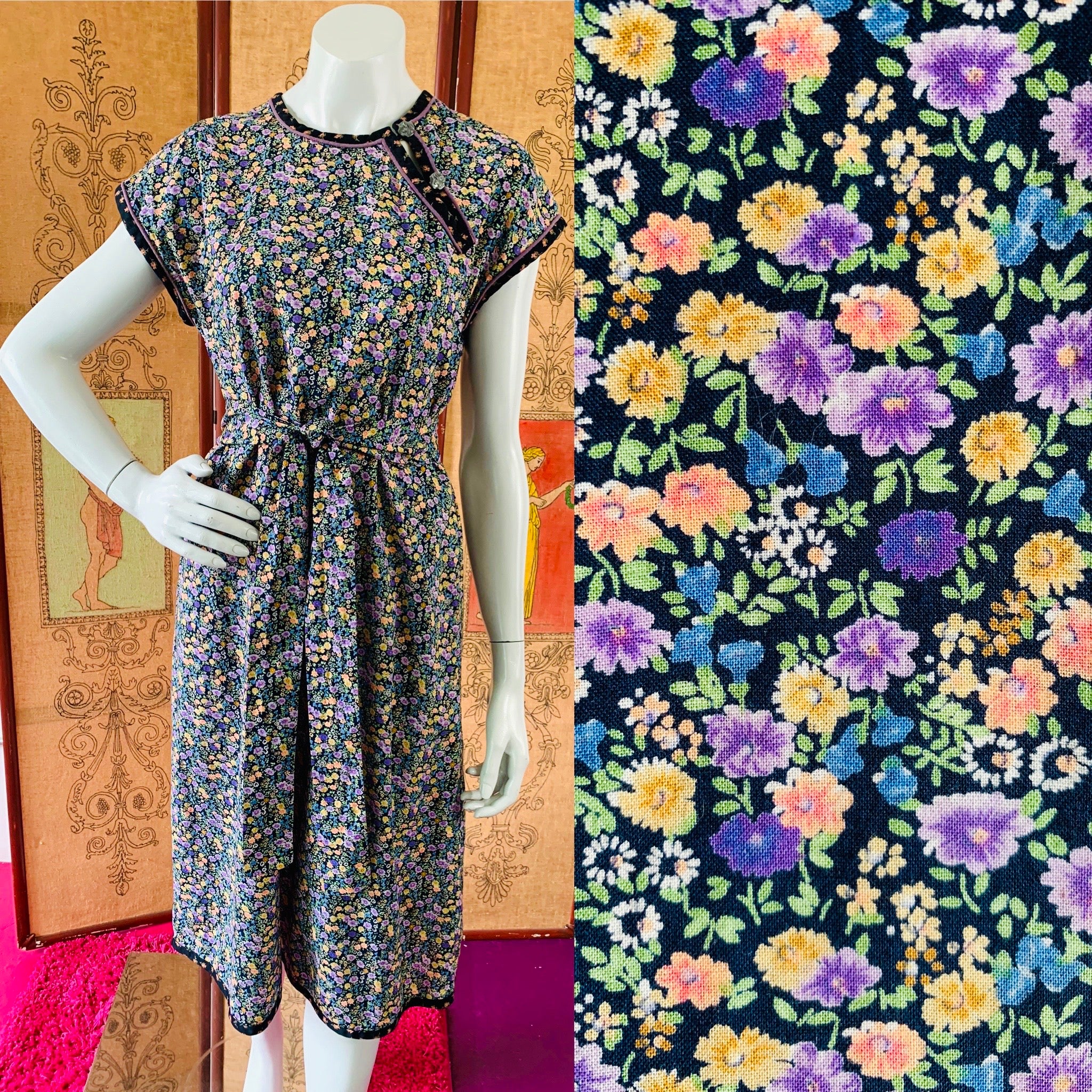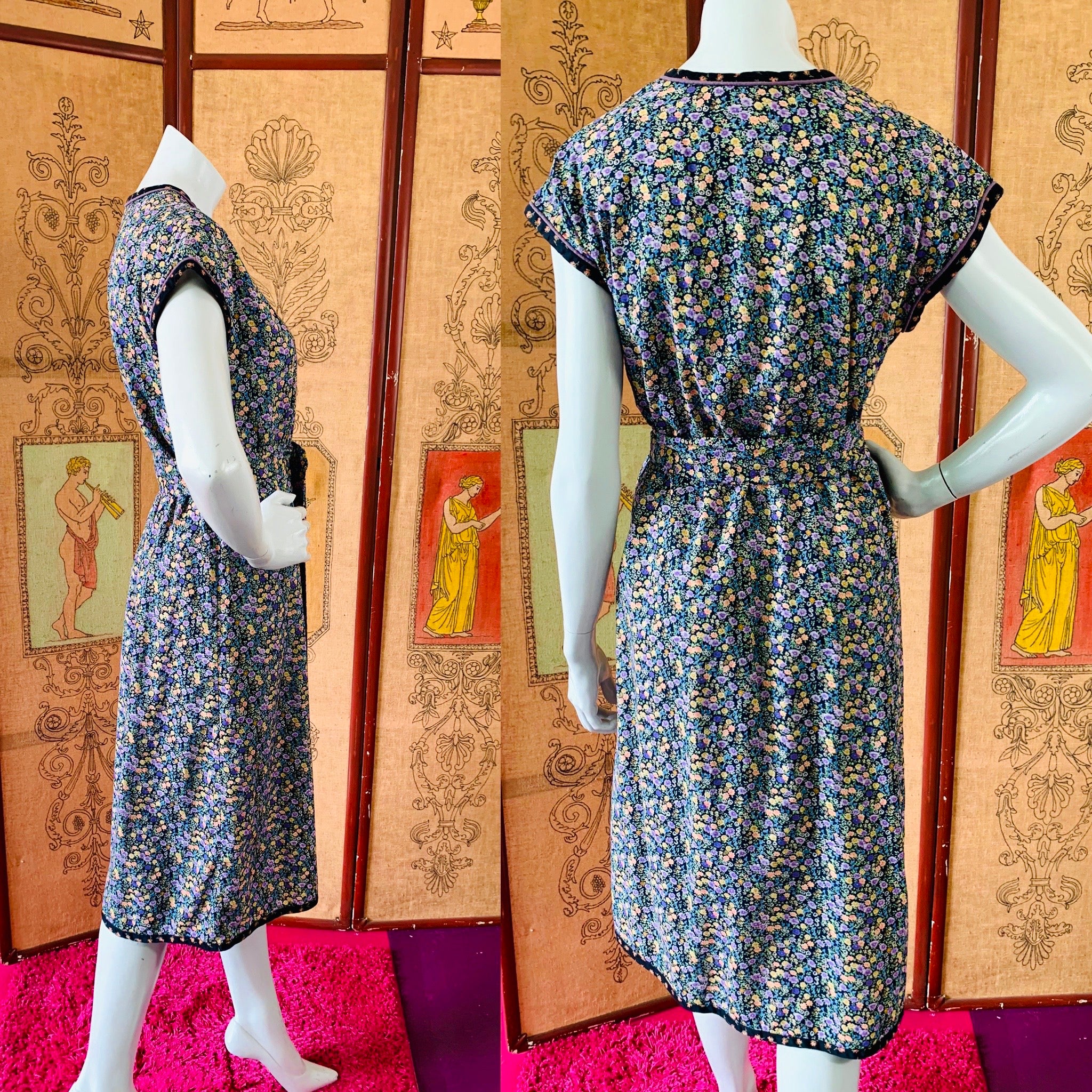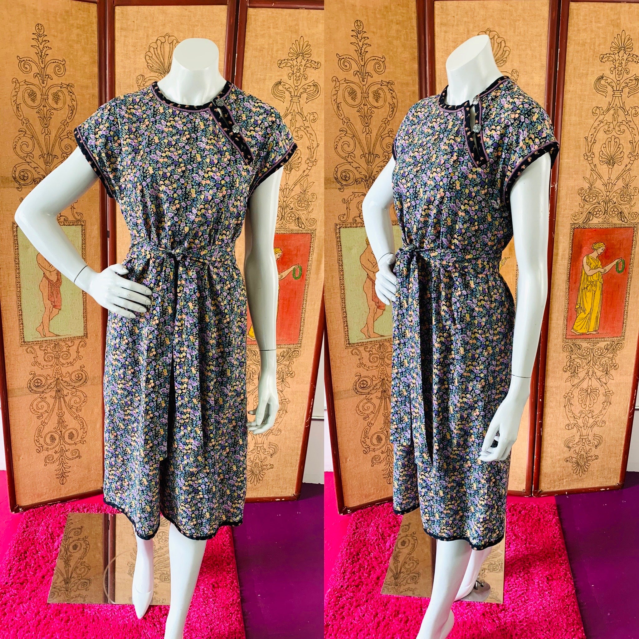 Bust: 18" // Waist: 19" (can be cinched with tie) // Length: 42" // Hips: 21" // Marked a size medium on label. Best fit small or medium. Please check measurements for your best fit. Condition: Very good, repairs at under arms, not noticeable when wearing. Price reflects condition.