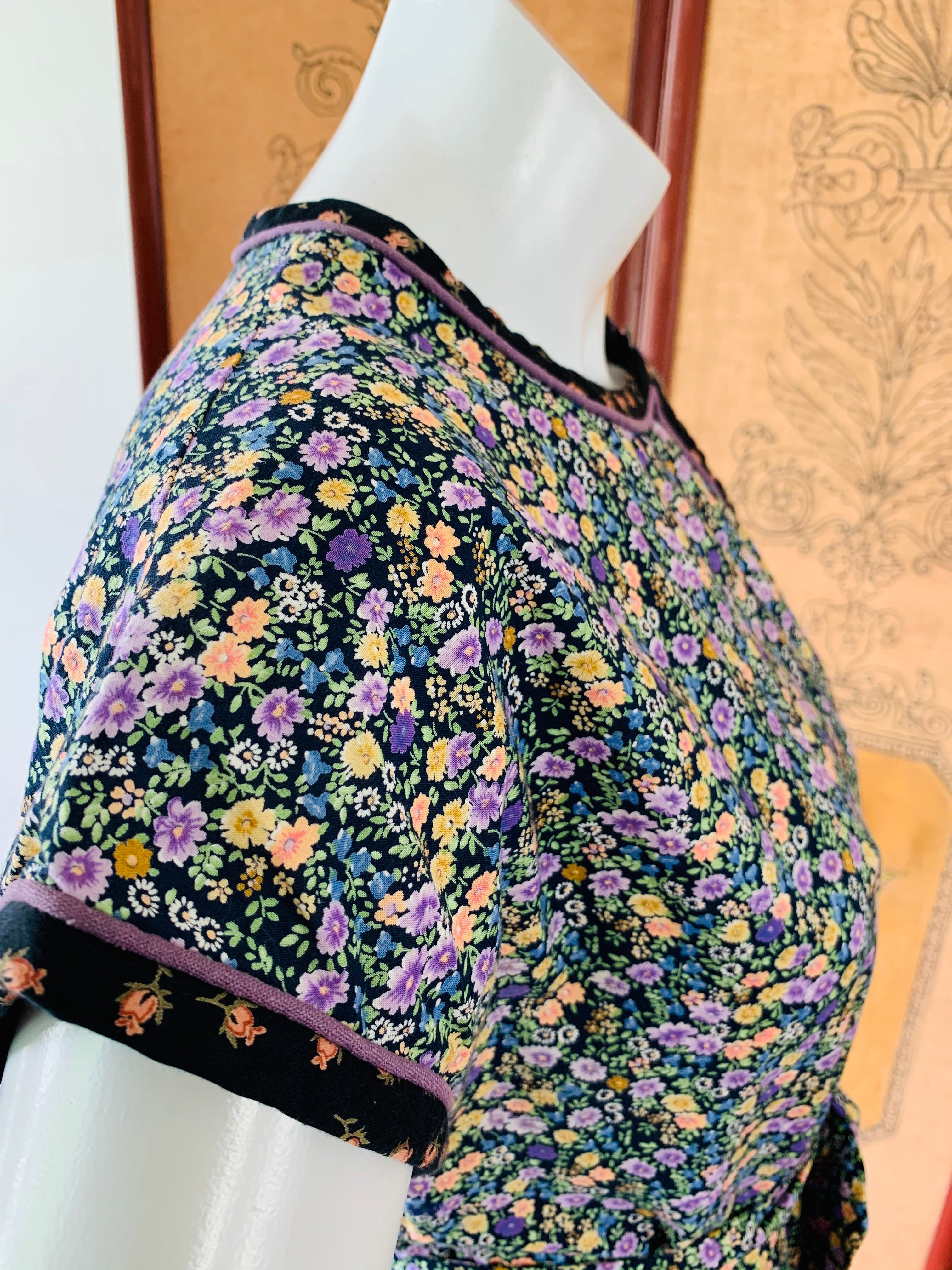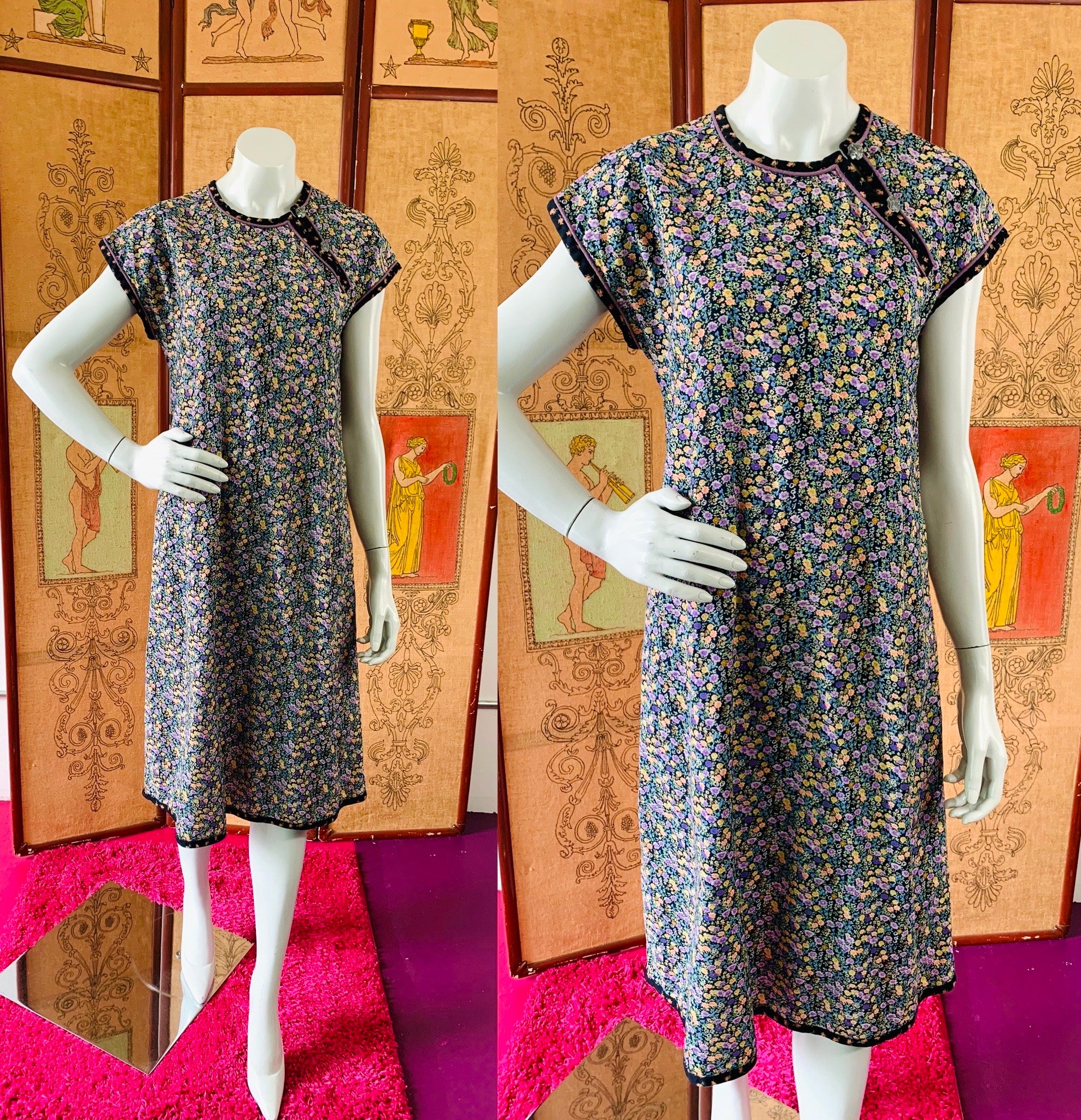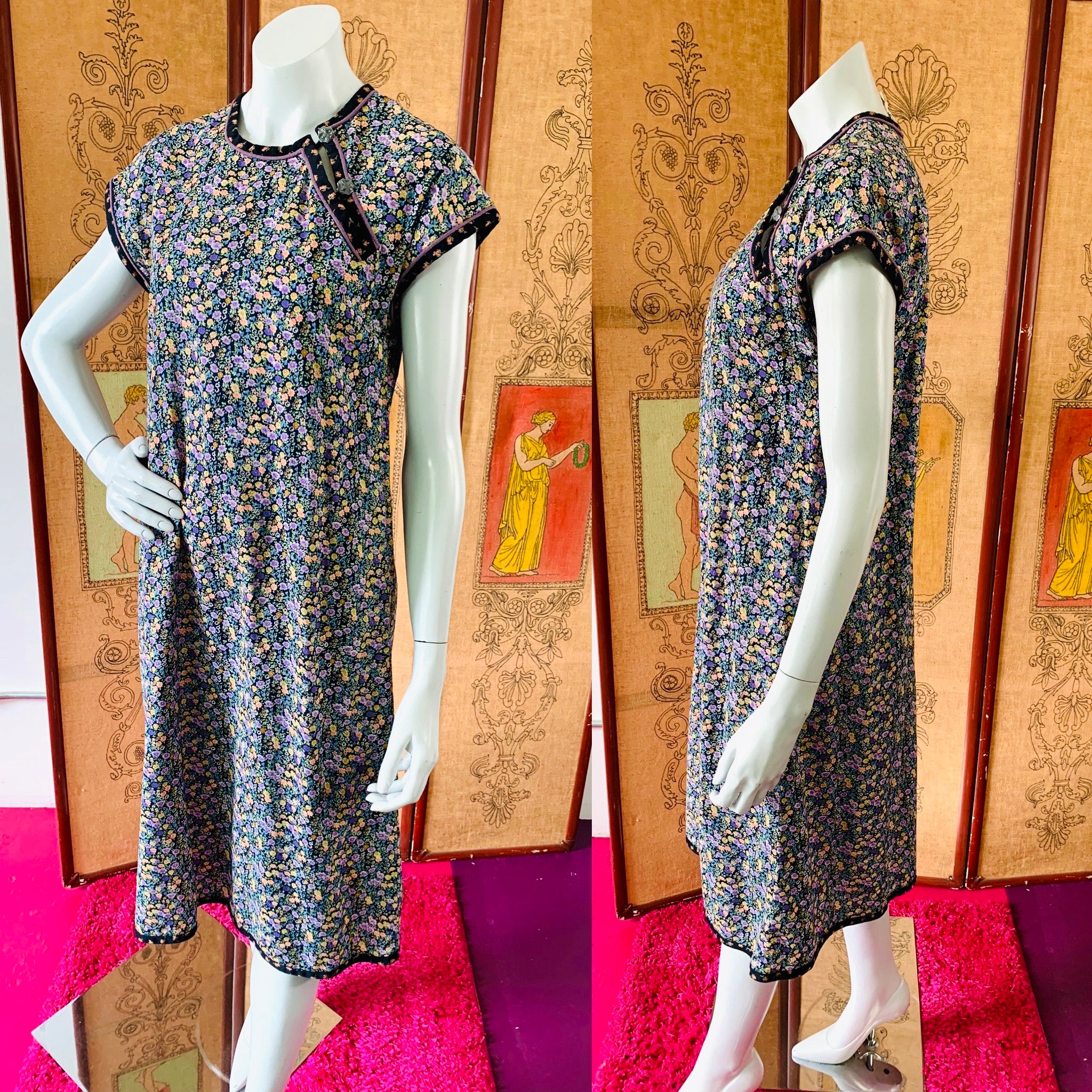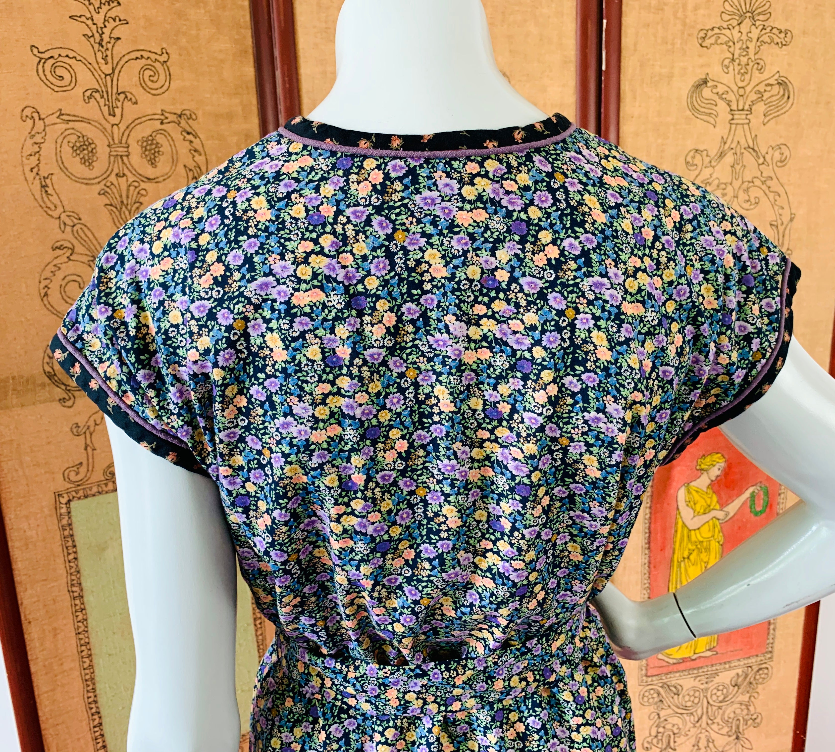 Bust: 18" // Waist: 19" (can be cinched with tie) // Length: 42" // Hips: 21" // Marked a size medium on label. Best fit small or medium. Please check measurements for your best fit. Condition: Very good, repairs at under arms, not noticeable when wearing. Price reflects condition.