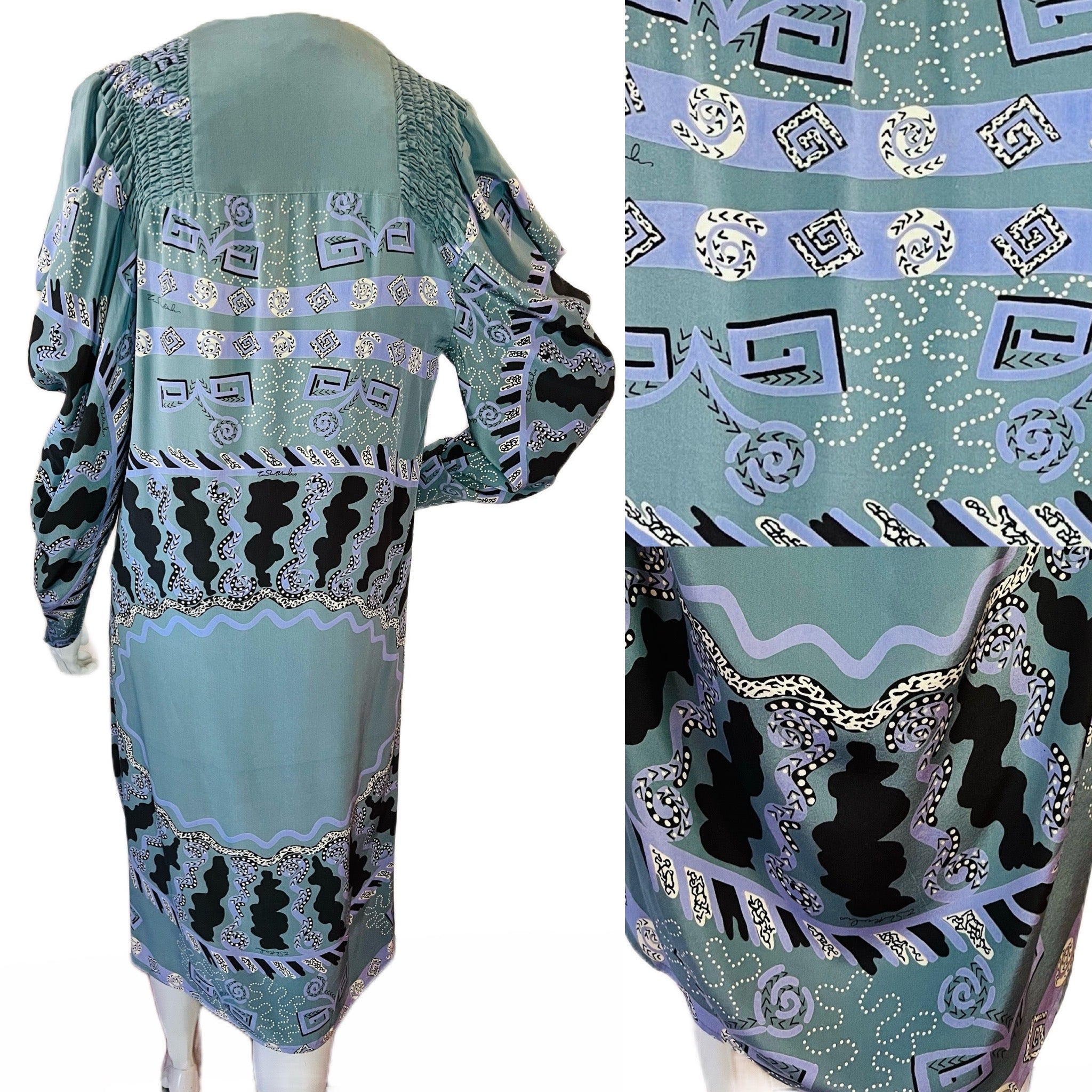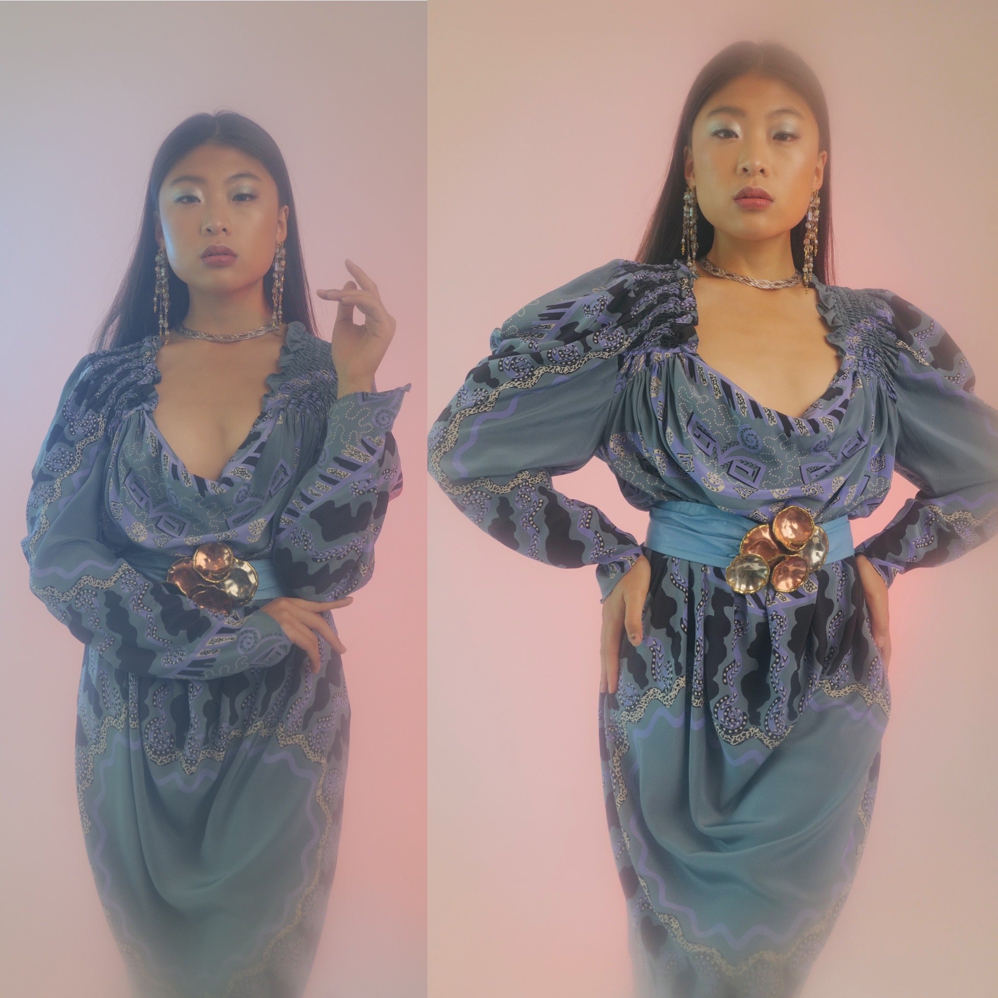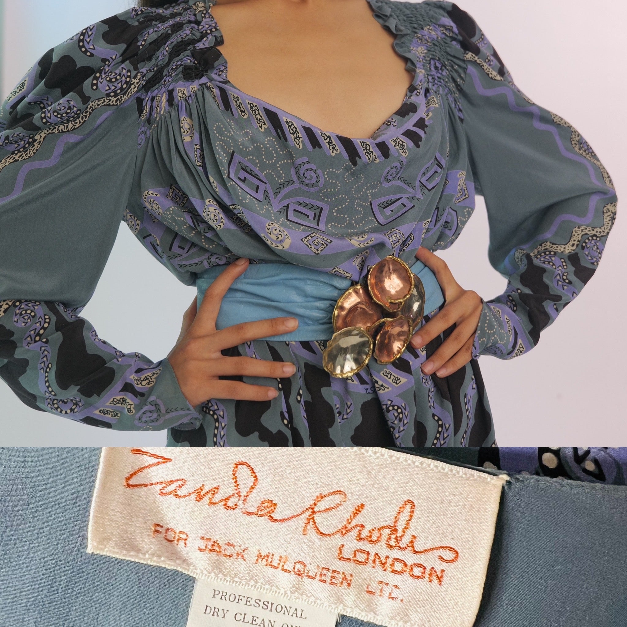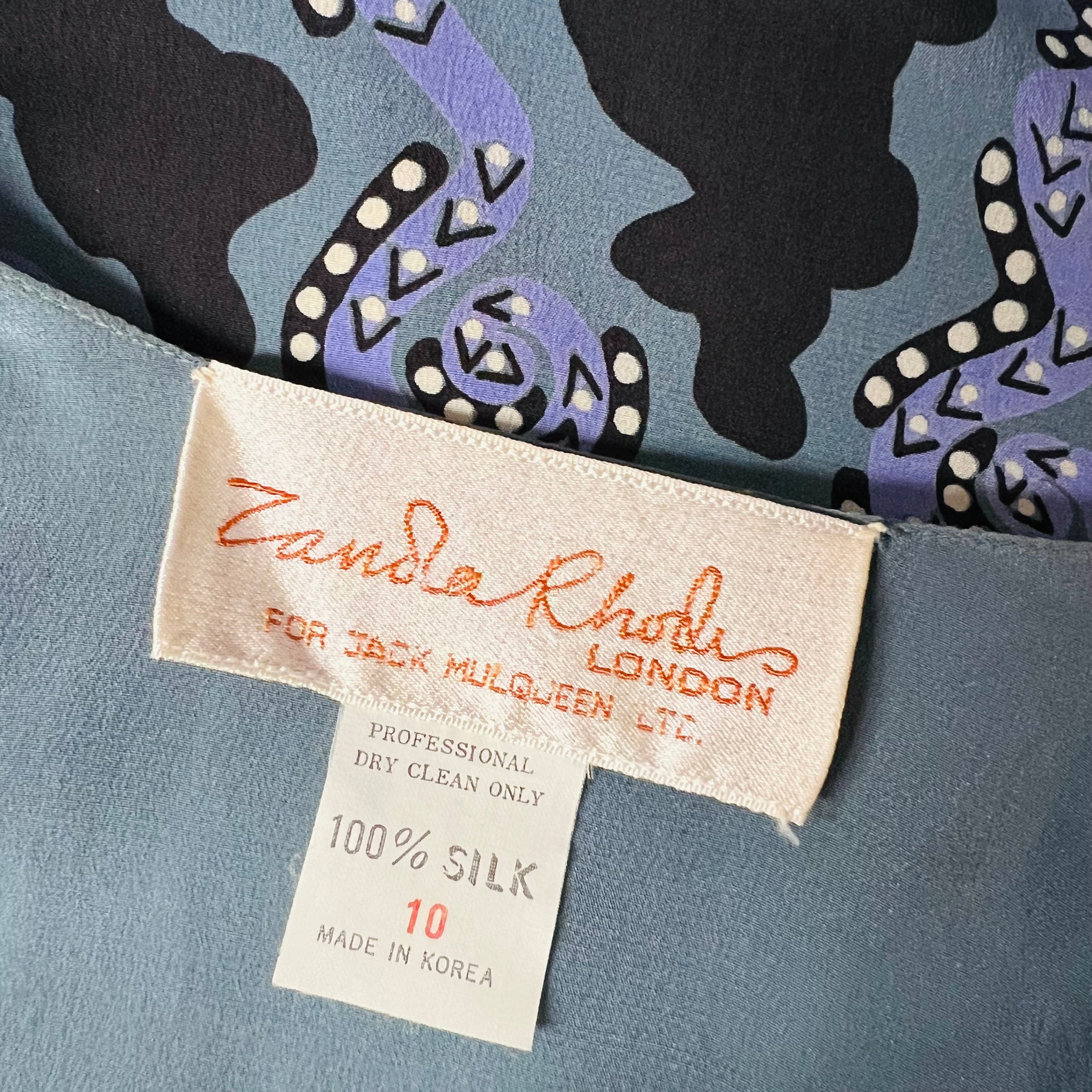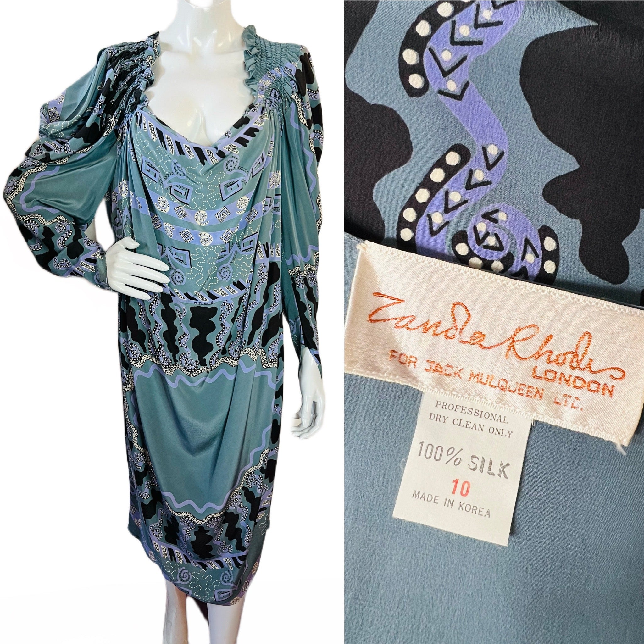 🌀 Iconic Zandra Rhodes blue silk dress. Gorgeous signed squiggle print. Smocking at neckline. Open slits at sides of shoulders. Has small weights to hold the front and shoulders down. Wear with a belt to cinch in at the waist or wear flowy style. Dreamiest piece.