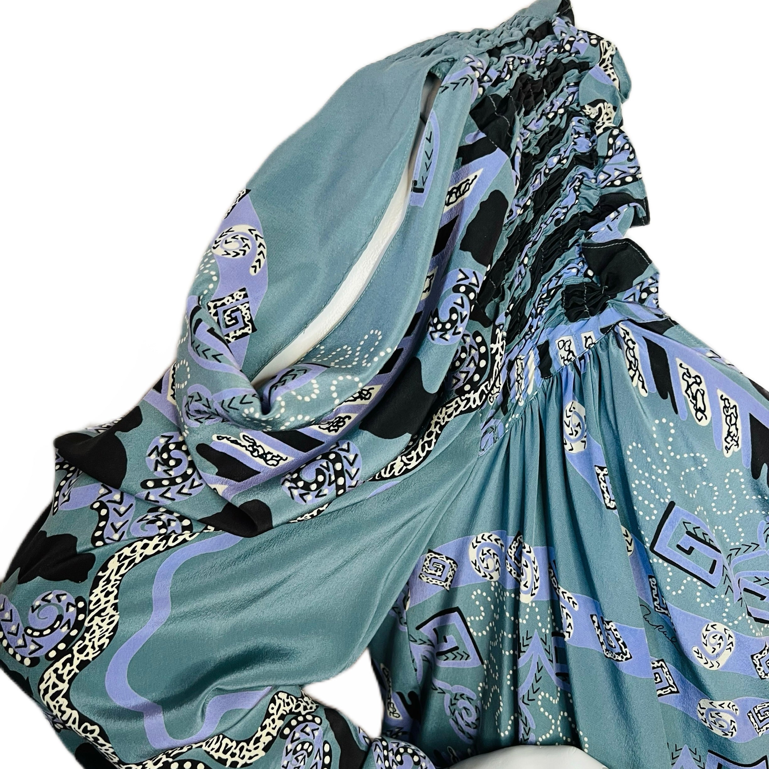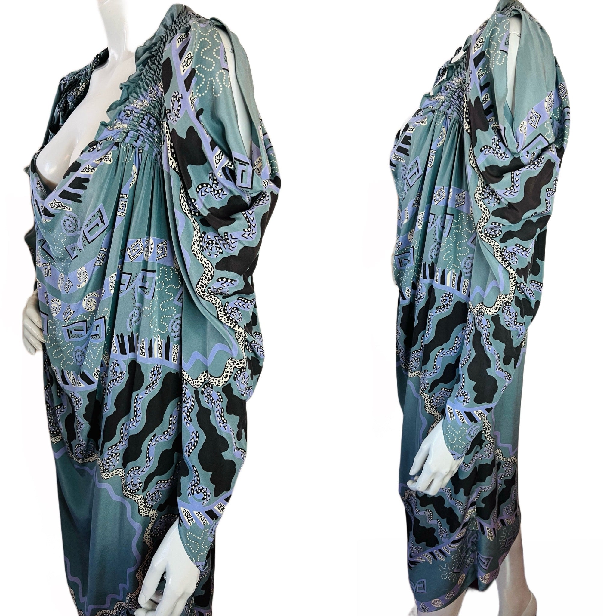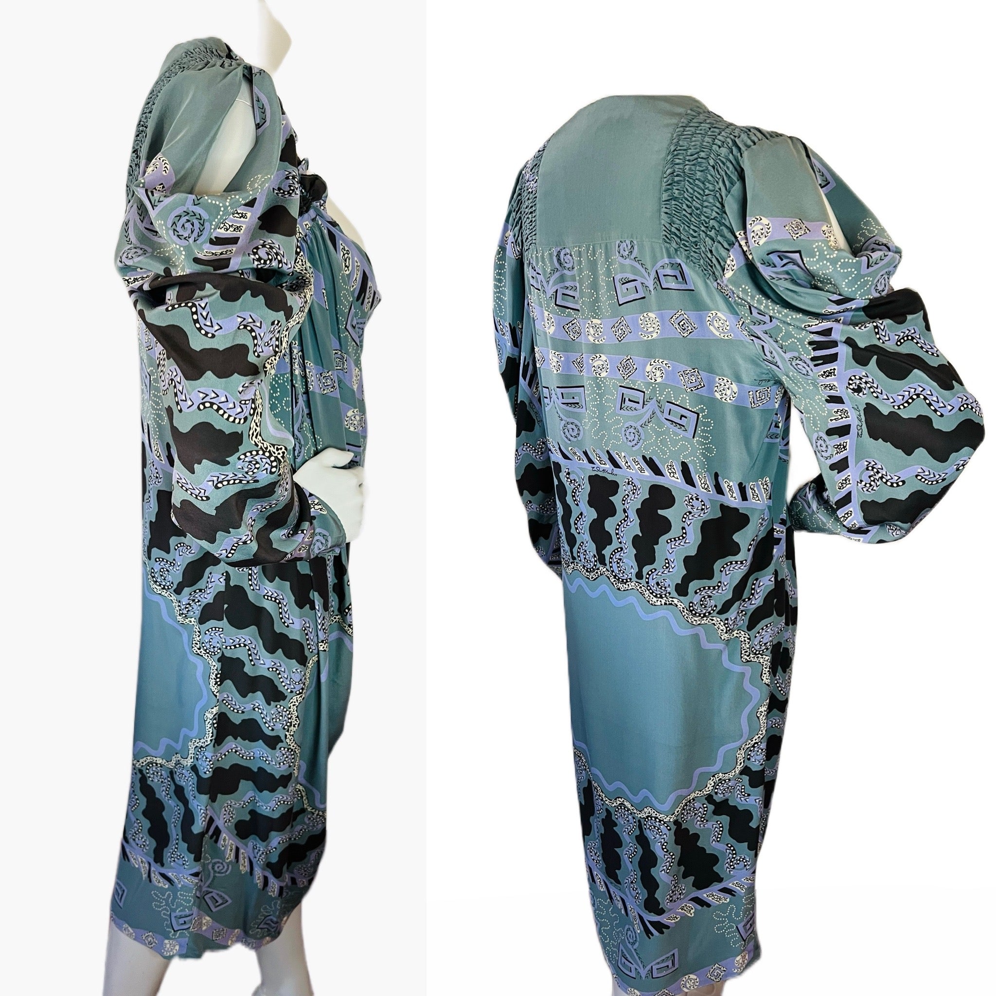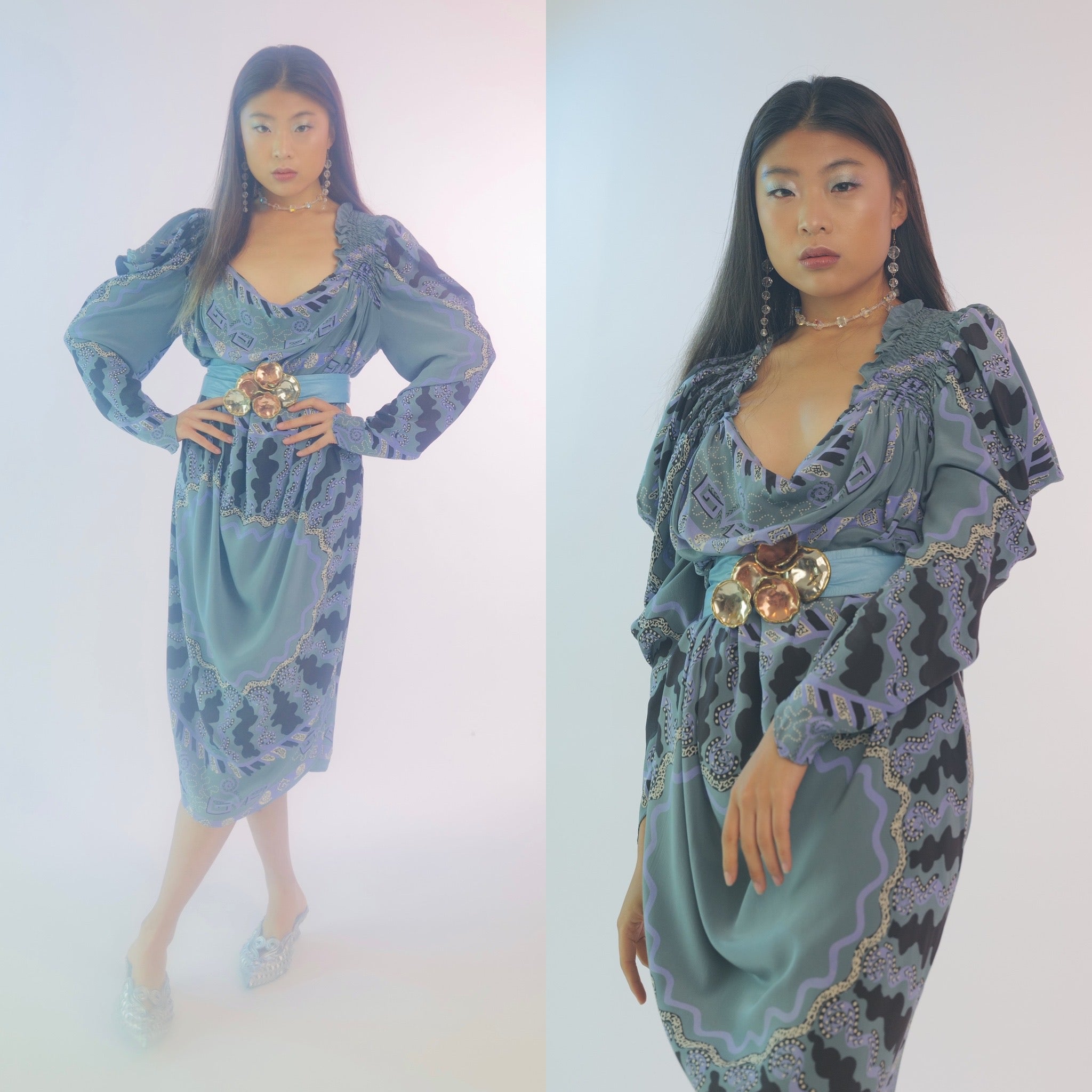 🌀 Iconic Zandra Rhodes blue silk dress. Gorgeous signed squiggle print. Smocking at neckline. Open slits at sides of shoulders. Has small weights to hold the front and shoulders down. Wear with a belt to cinch in at the waist or wear flowy style. Dreamiest piece.