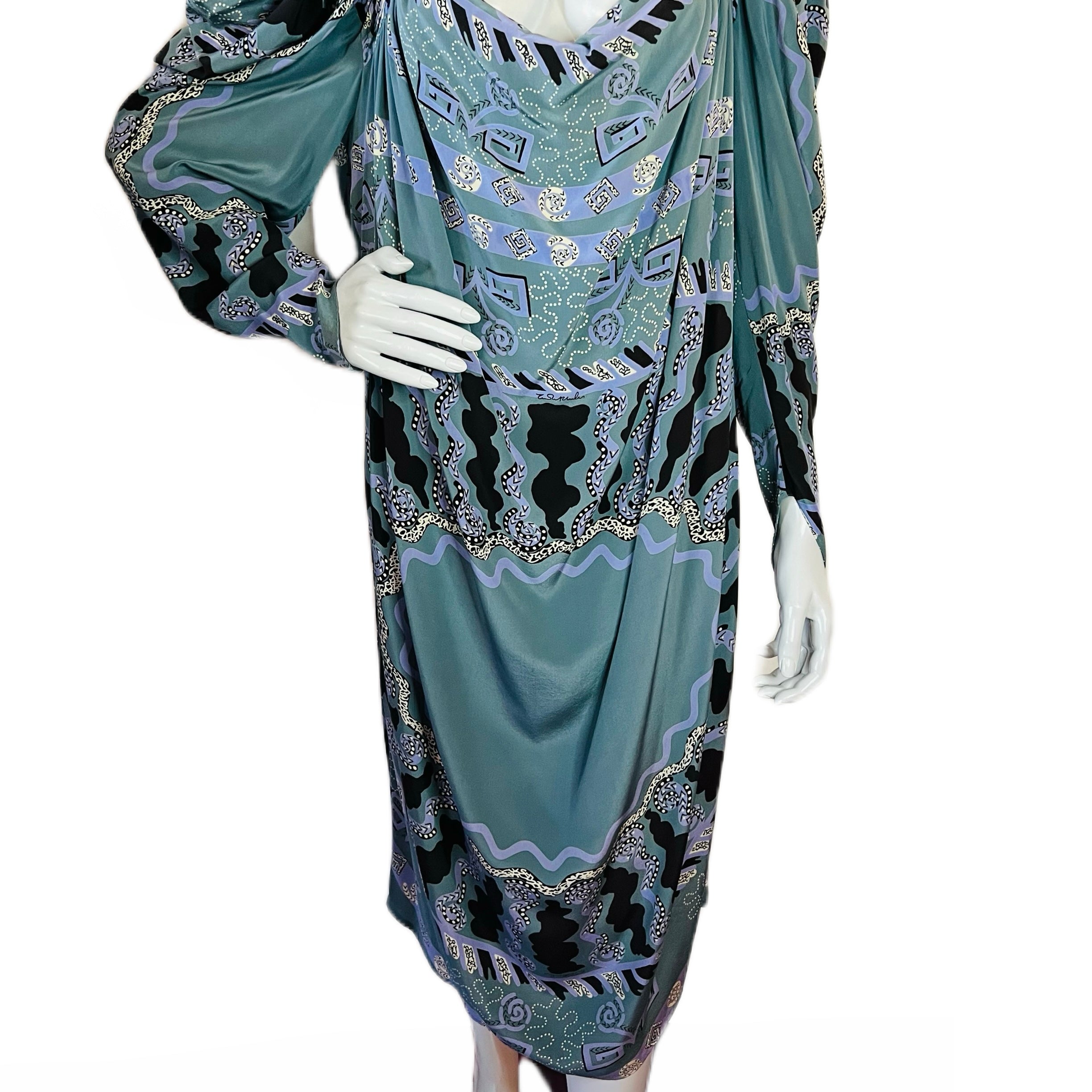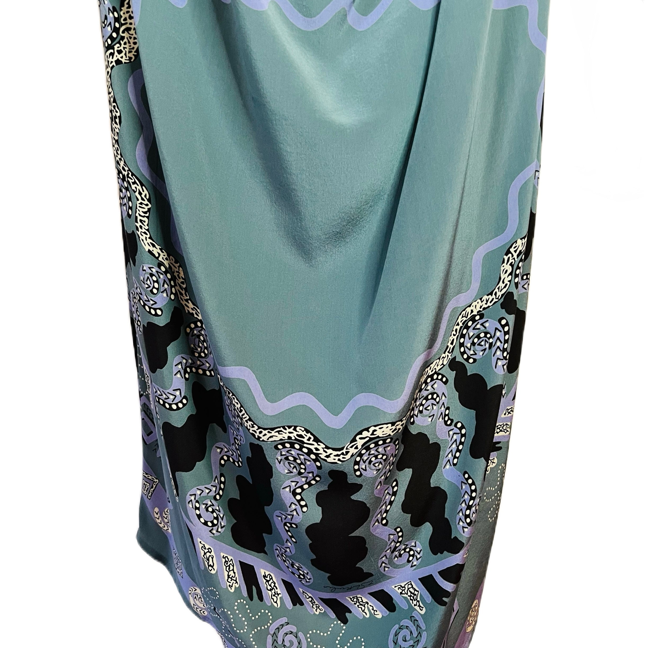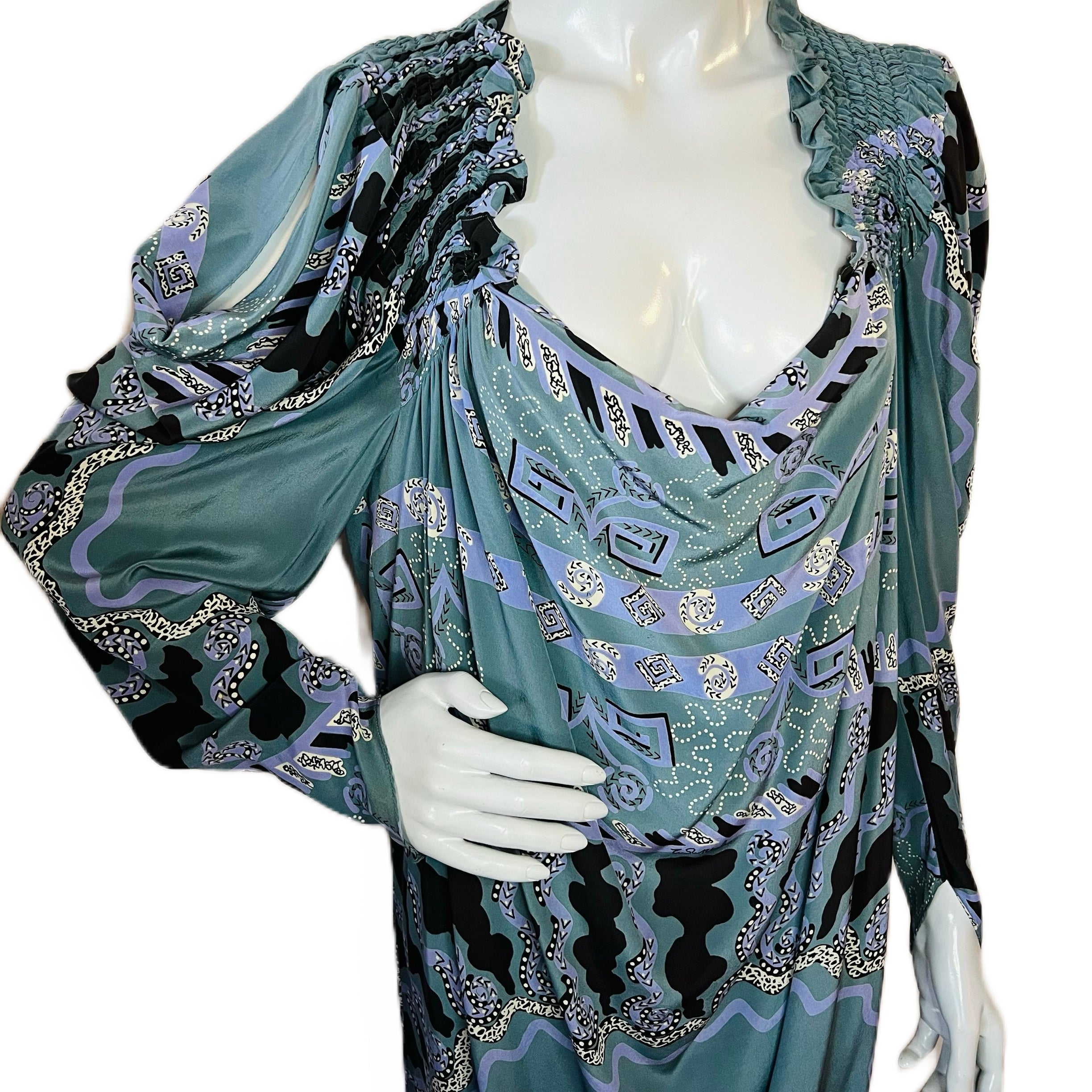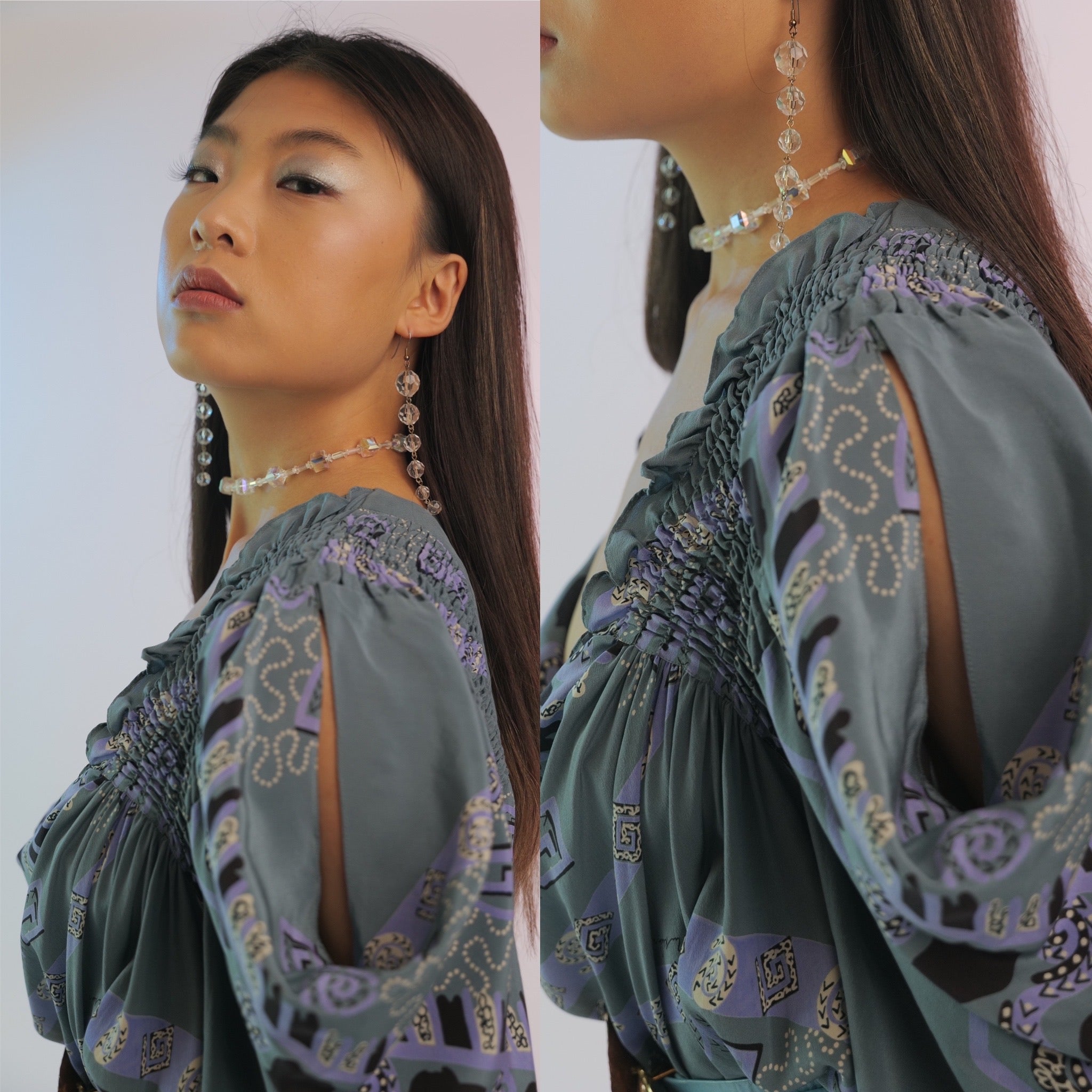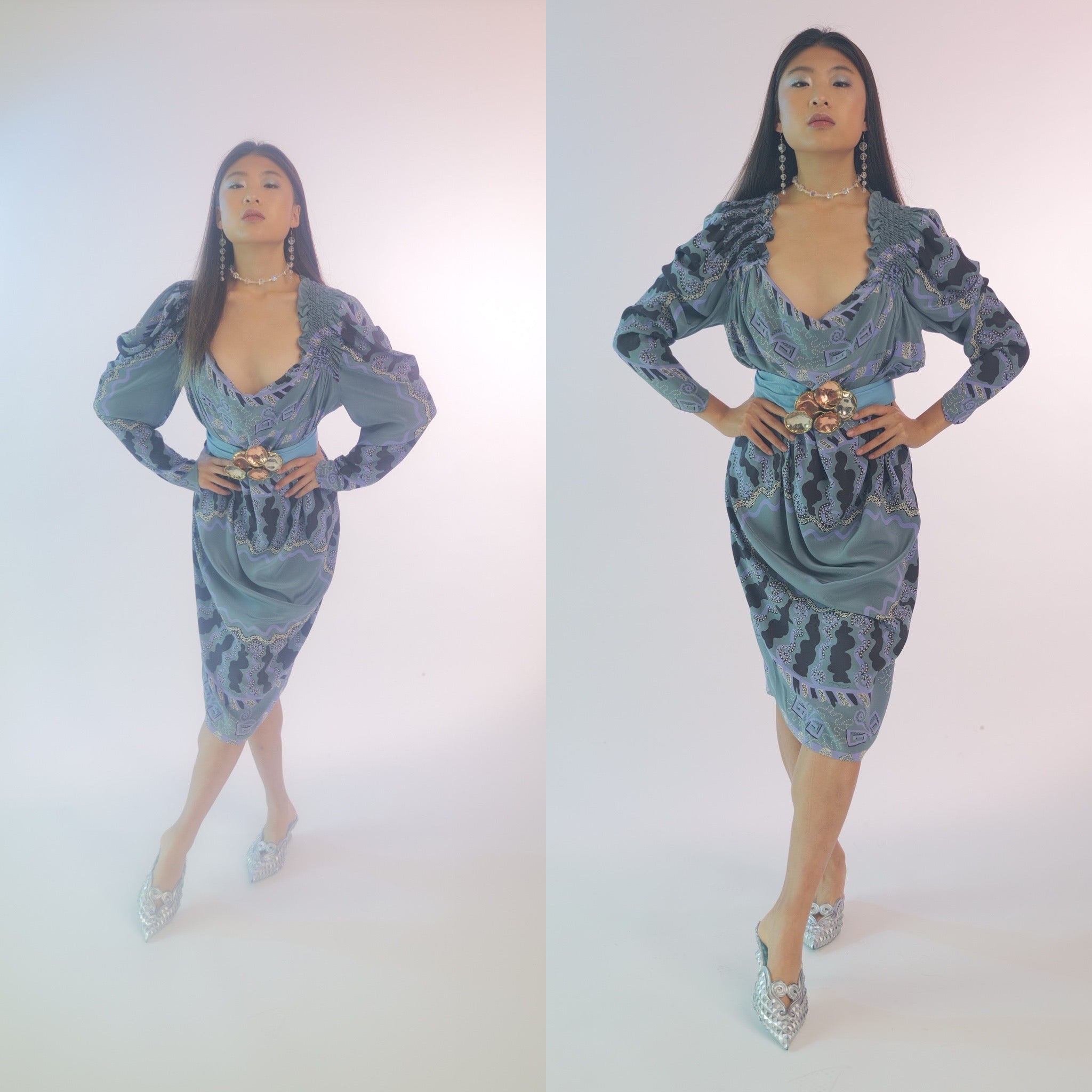 🌀 Iconic Zandra Rhodes blue silk dress. Gorgeous signed squiggle print. Smocking at neckline. Open slits at sides of shoulders. Has small weights to hold the front and shoulders down. Wear with a belt to cinch in at the waist or wear flowy style. Dreamiest piece.