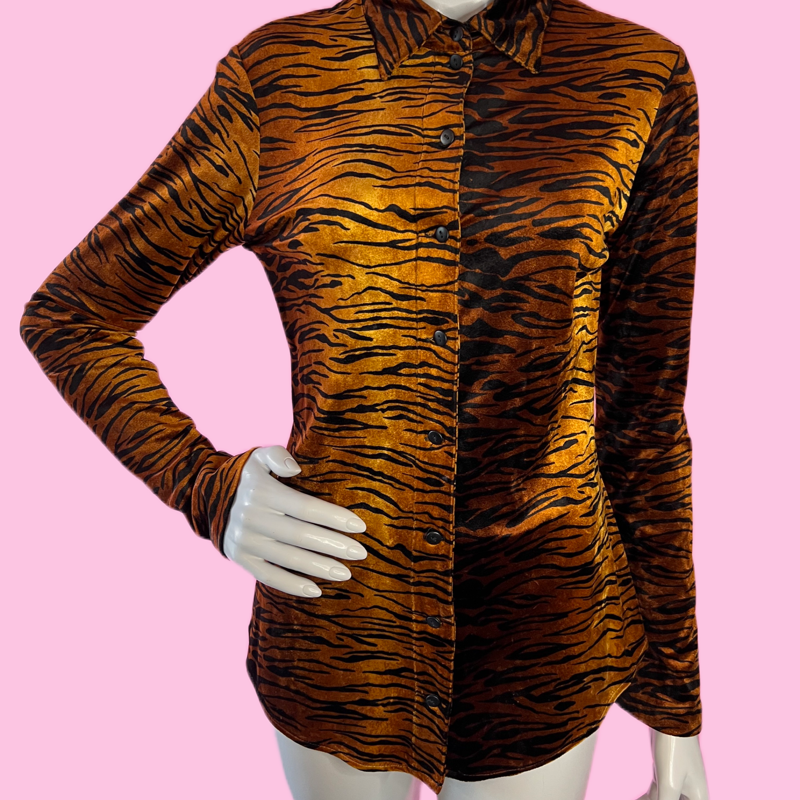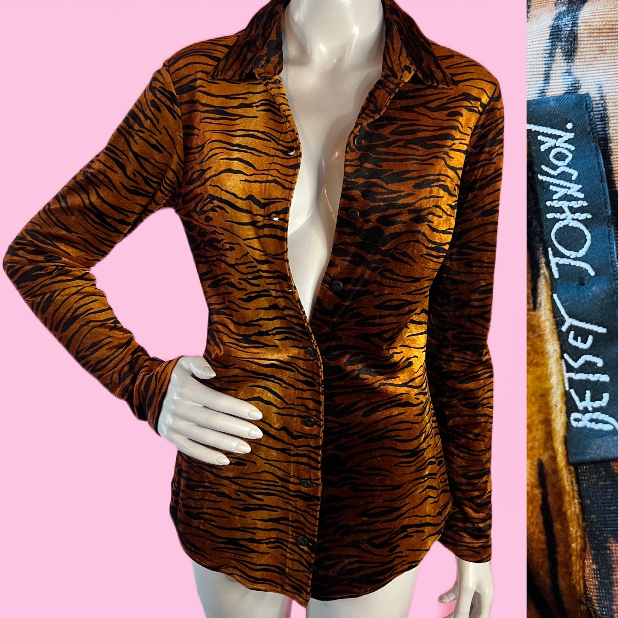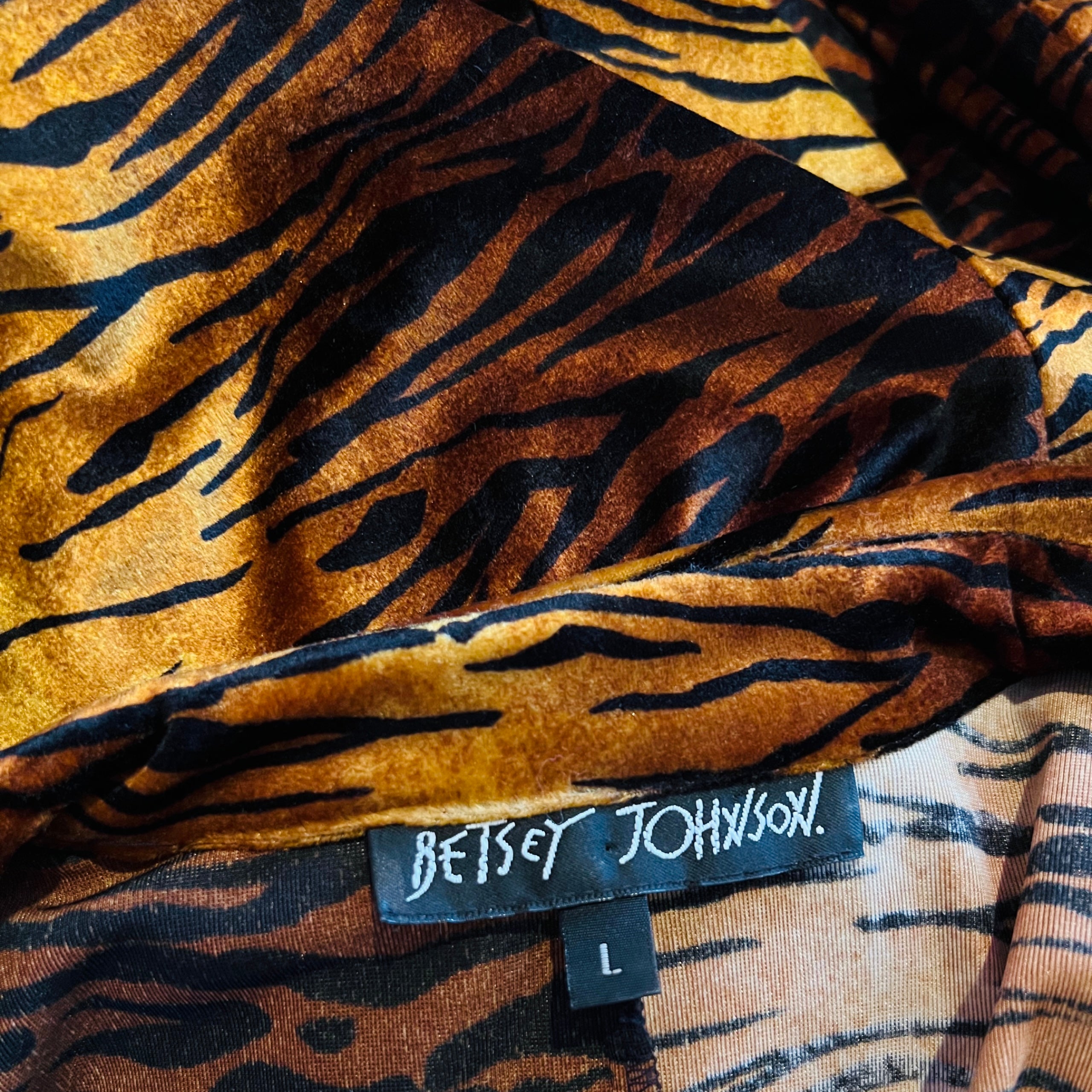 🐅Raawwwrrrr! This 90s Betsey Johnson velvet tiger print tunic is sure to turn heads! Cute collar and two tone detailing. Gorgeous velvet fabric. Designed to come in at the waist. Button her up or button her down ~ this piece adds some vigor to your wardrobe.