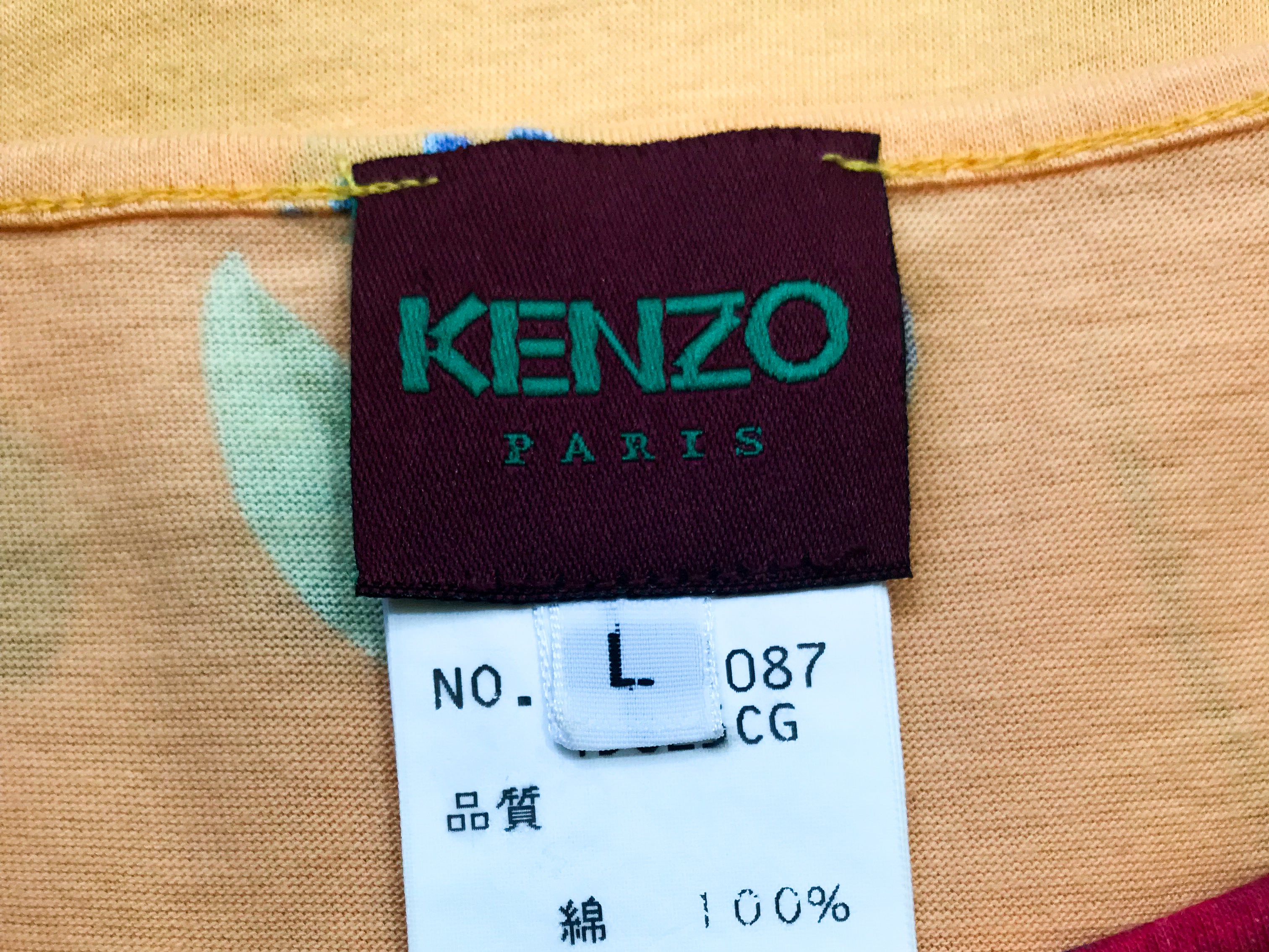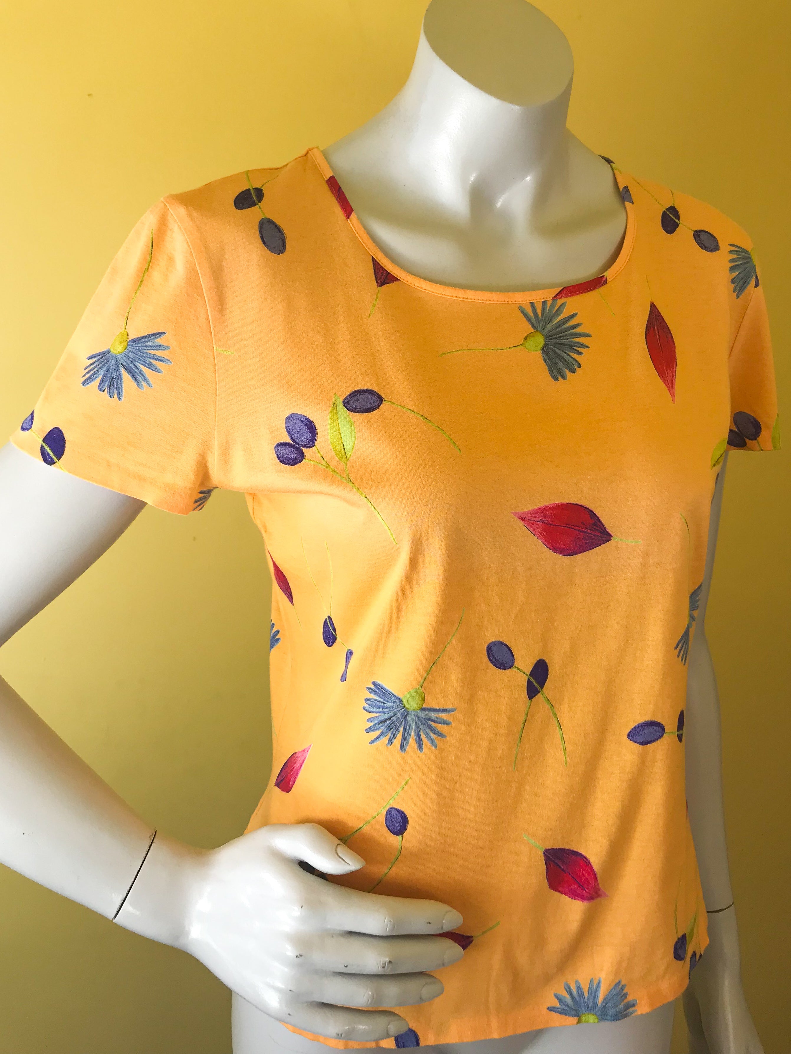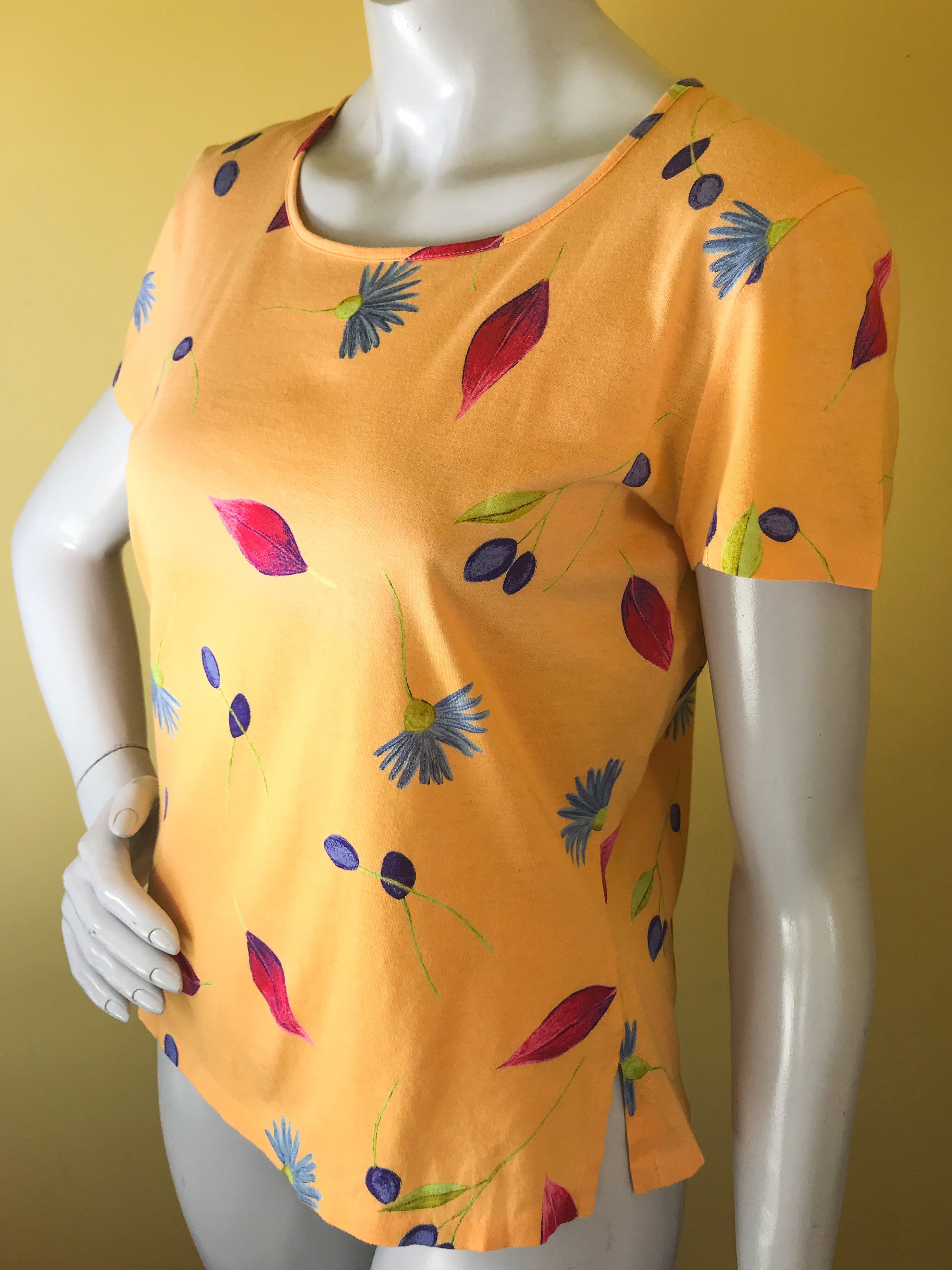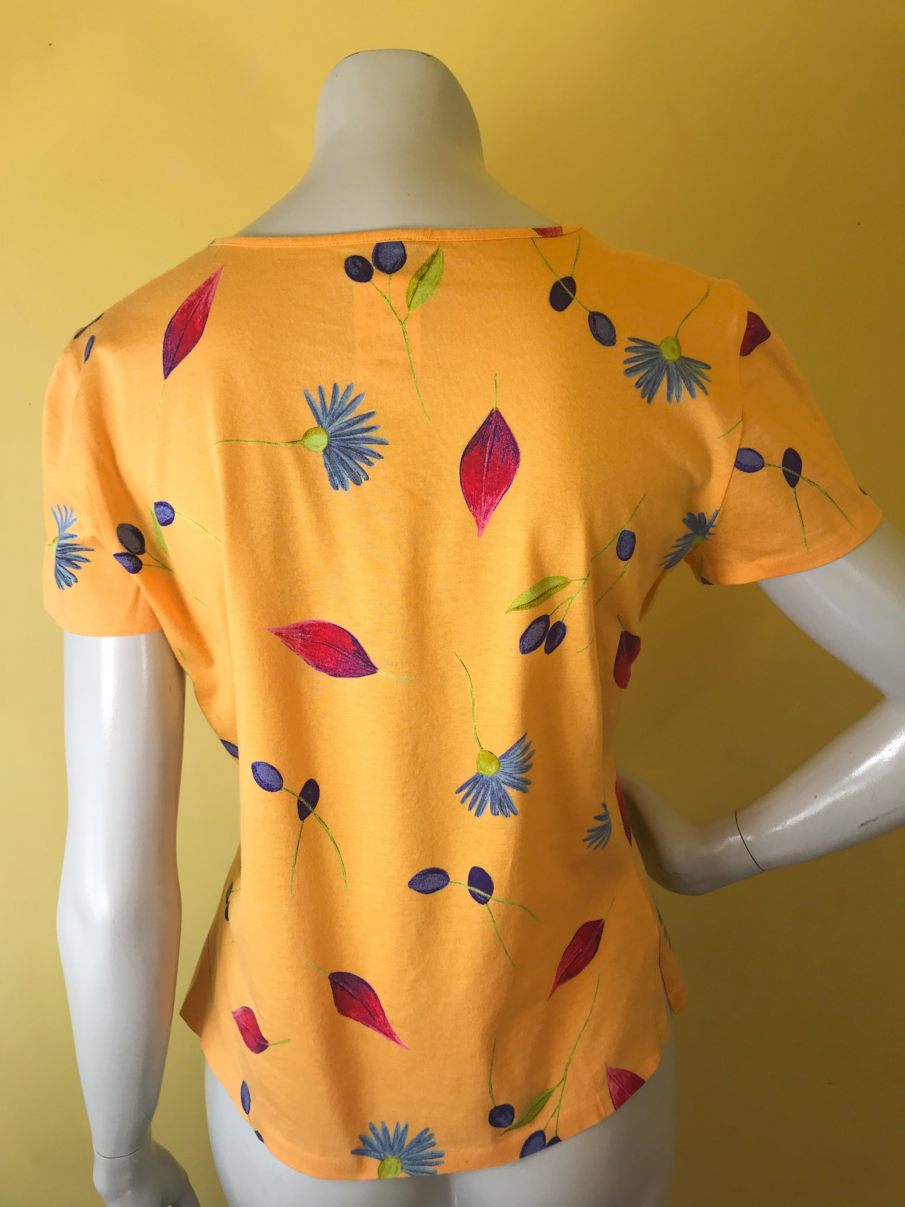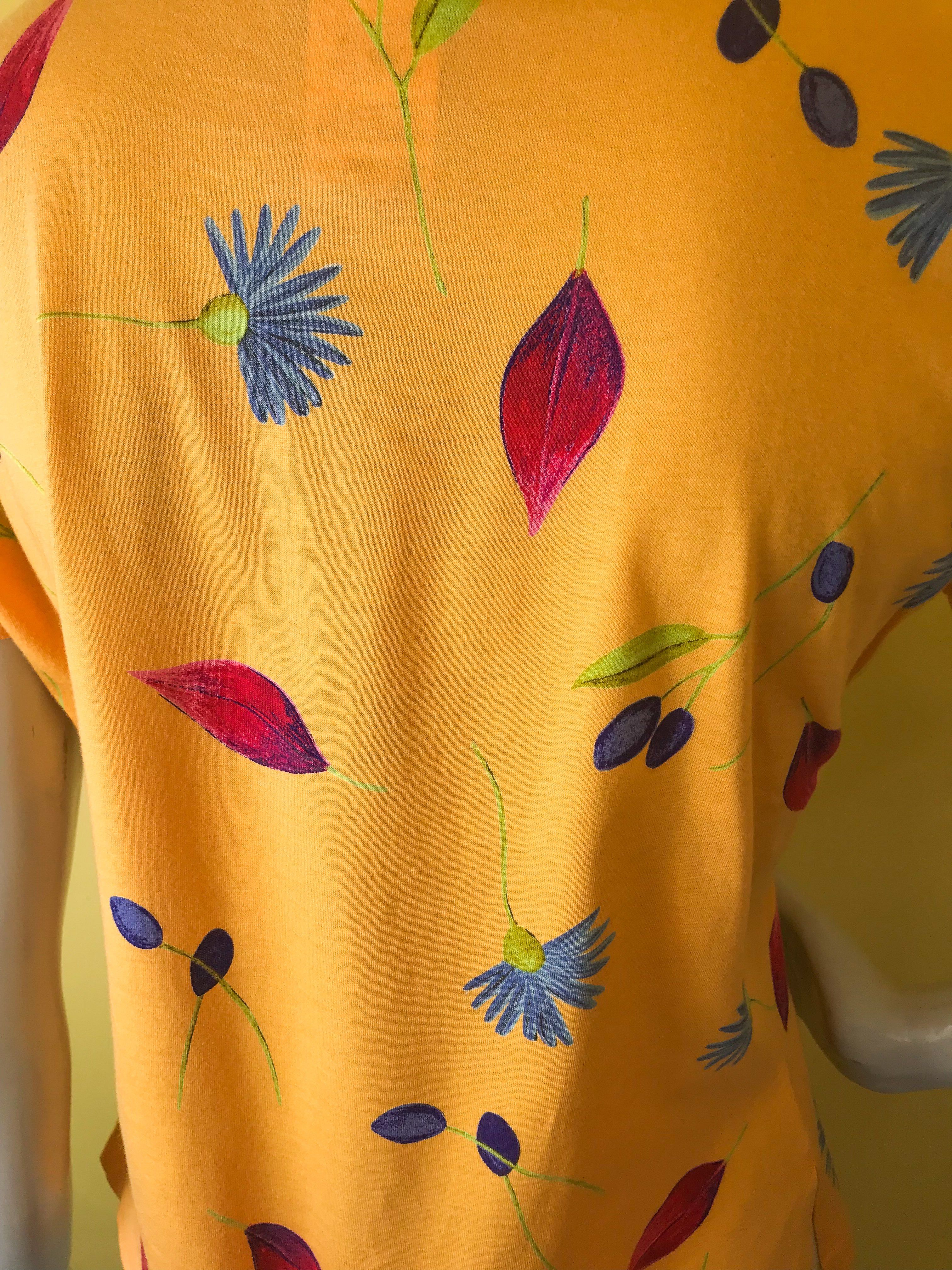Sunshine yellow designer t-shirt by Kenzo with multicolored abstract scattered foliage print. Round collar, short sleeves. Casual and chic!