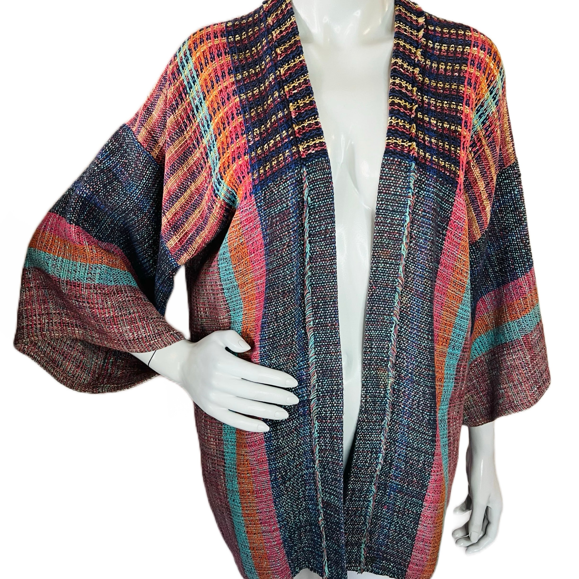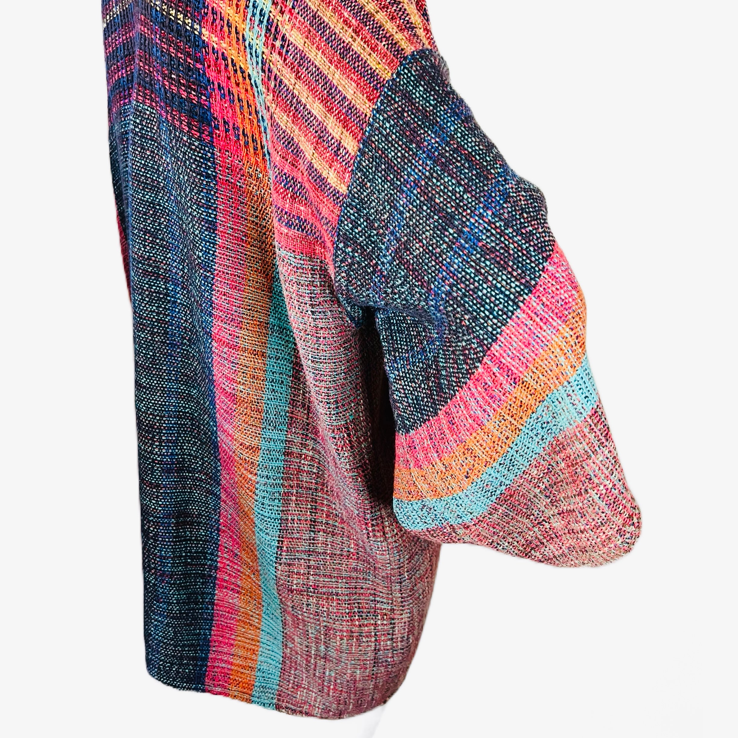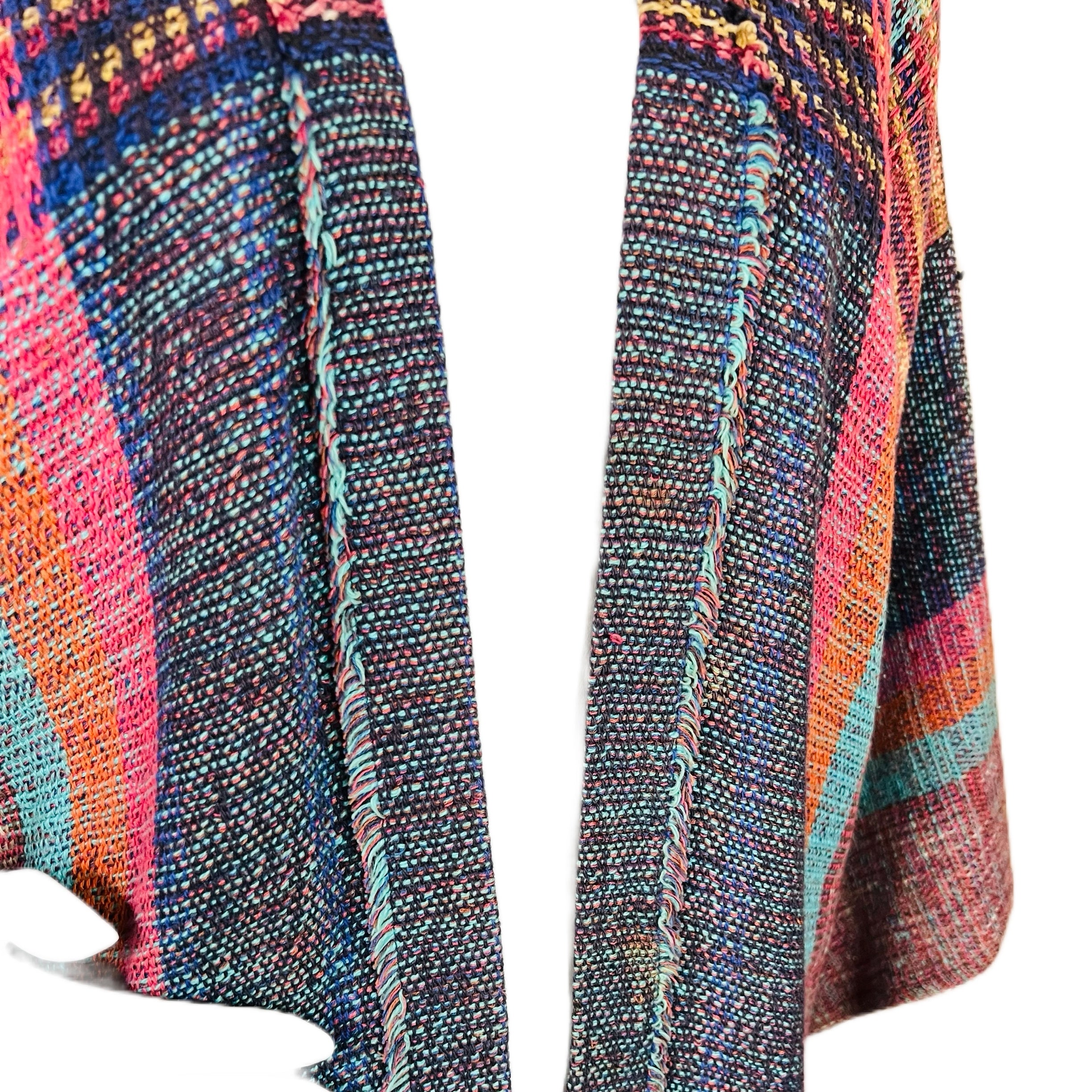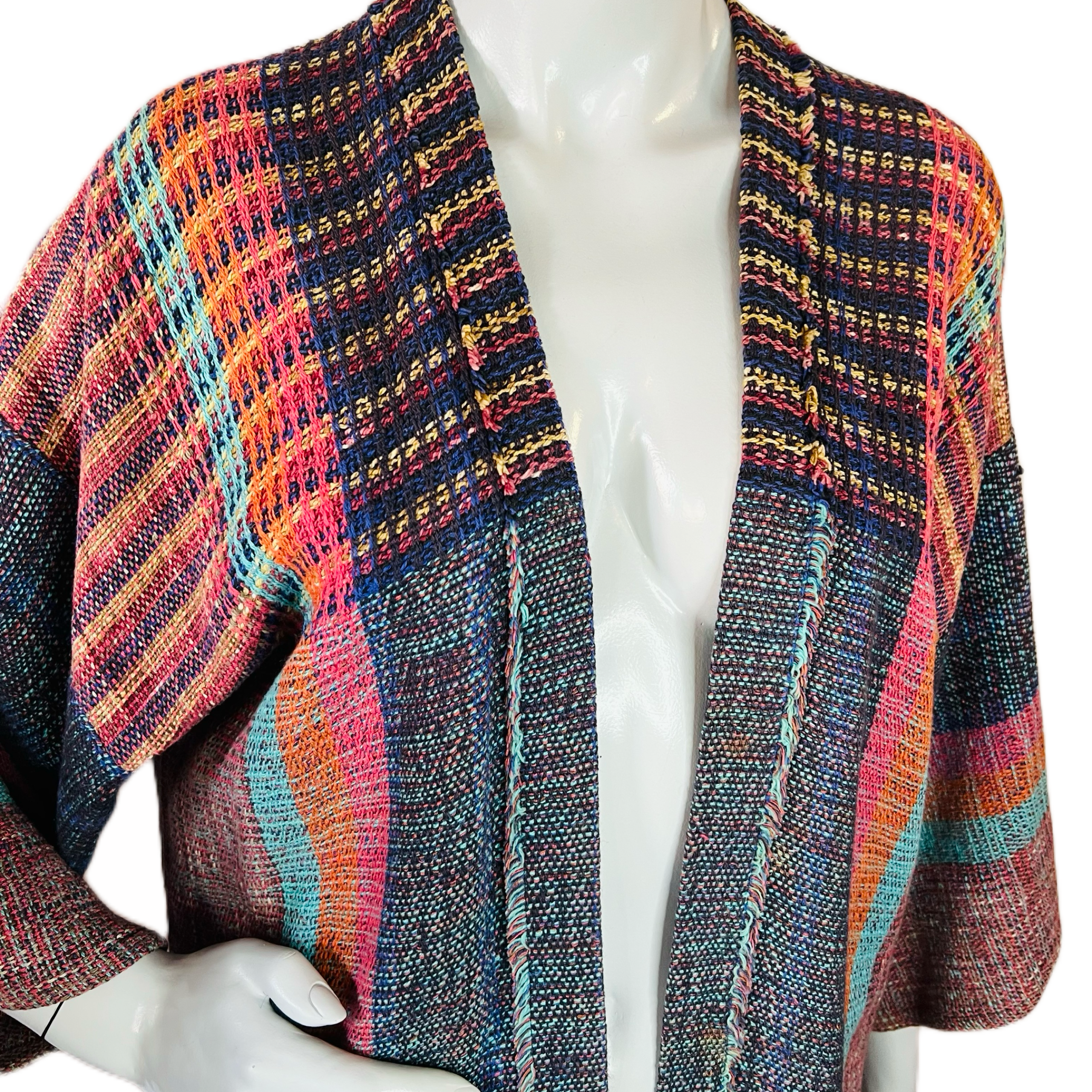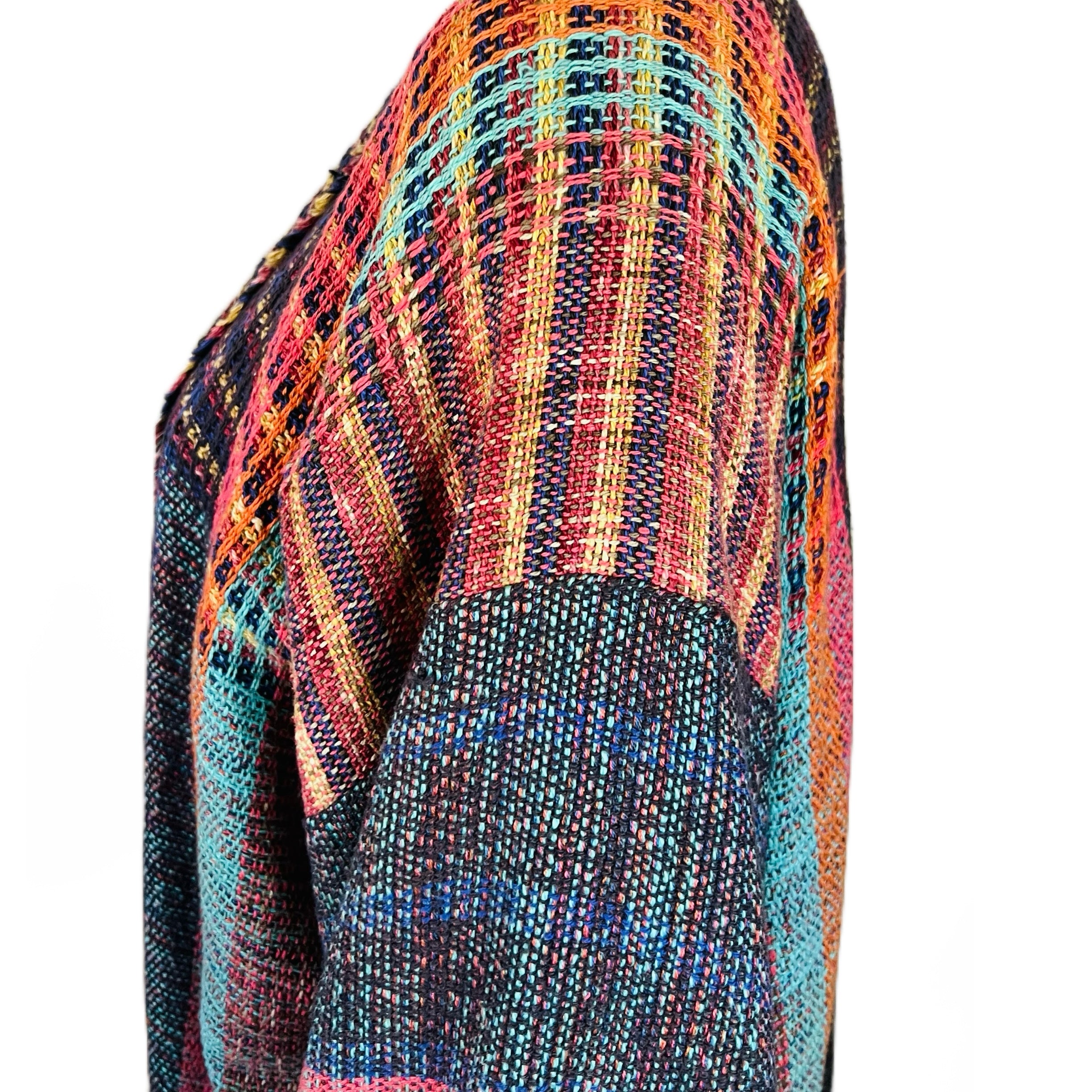 🌈 Absolute stunner of a jacket. Handwoven beauty. Nice wide sleeve. Open front, no closures. Fringe detailing along the neckline. Rainbow colors. Perfect piece to add some magic to your day.Â