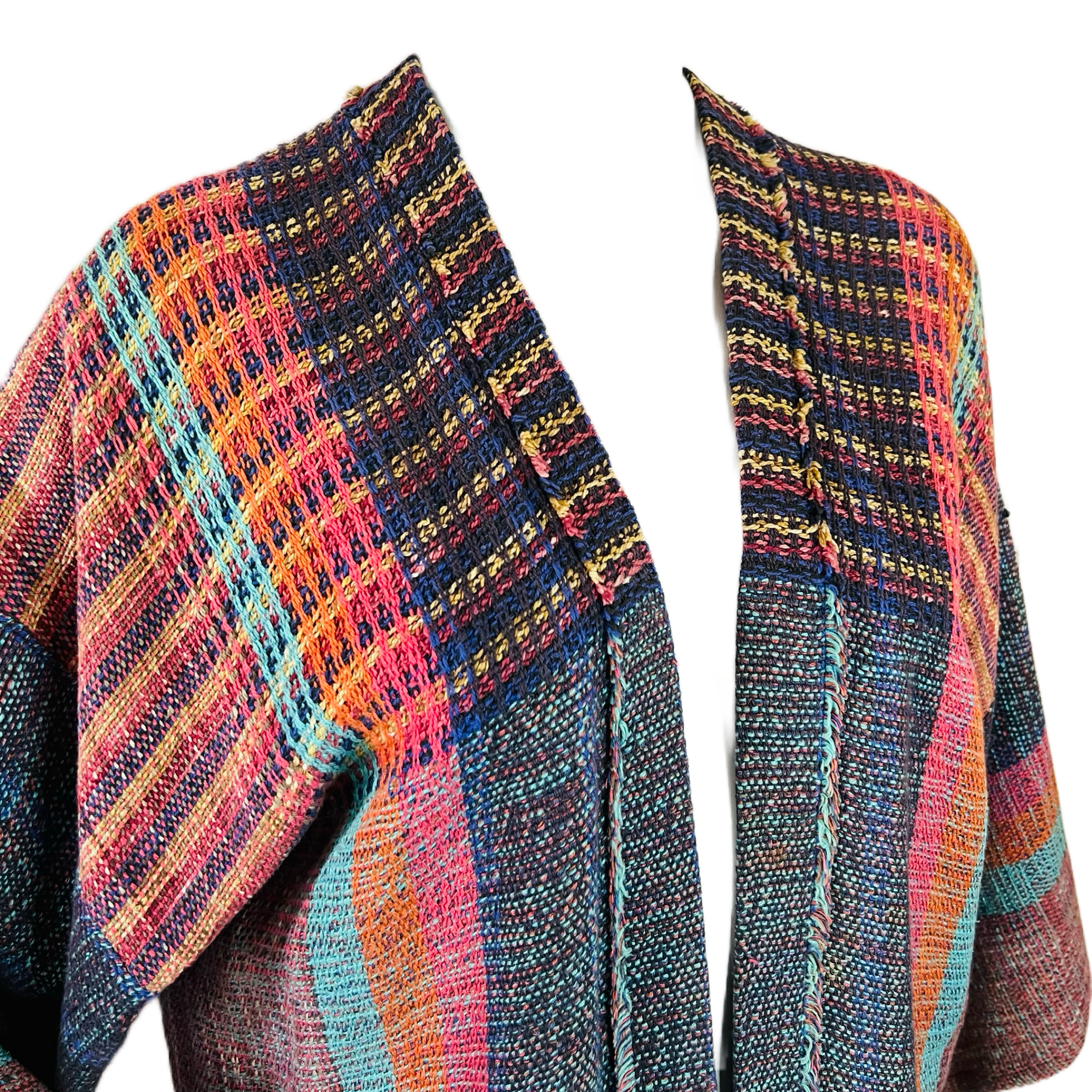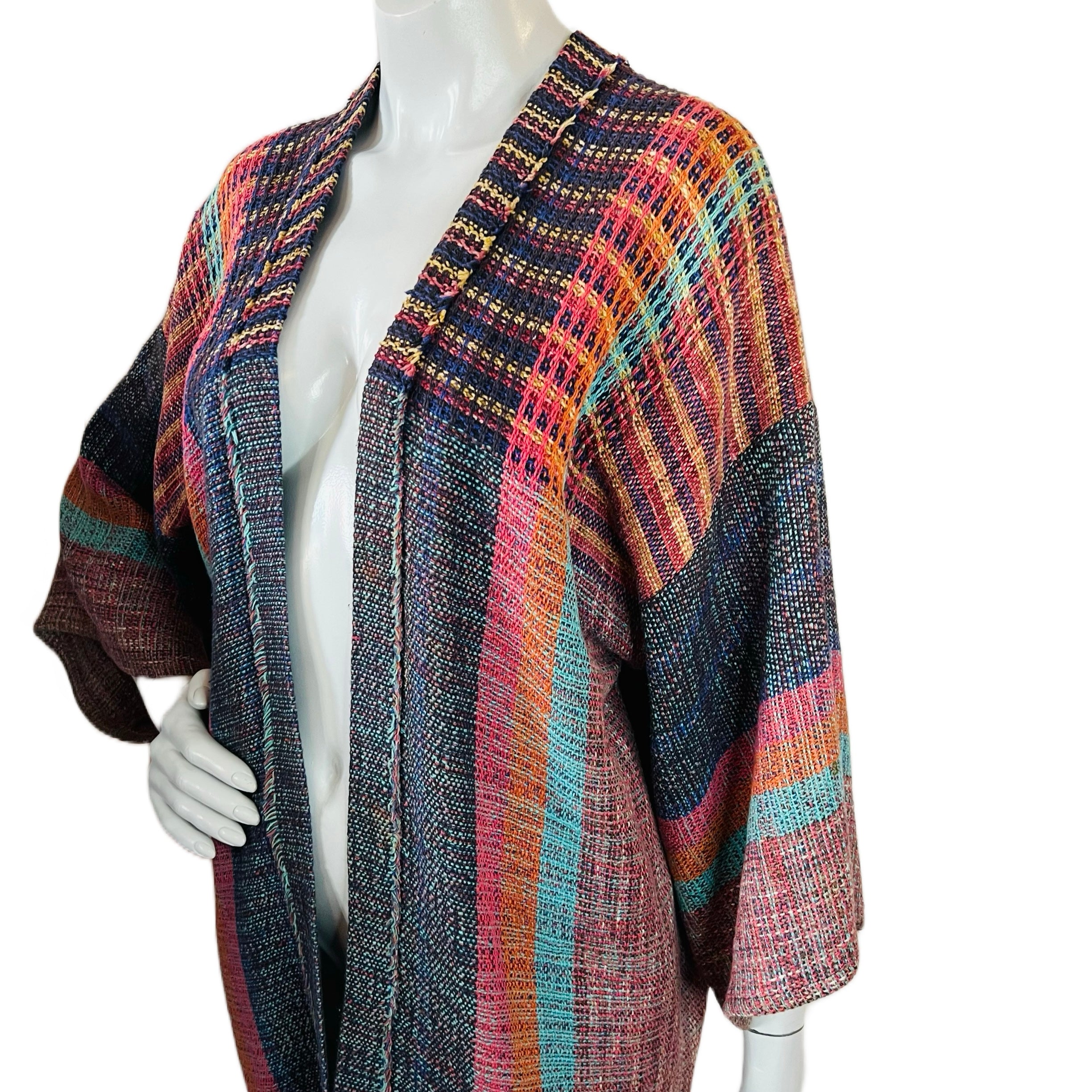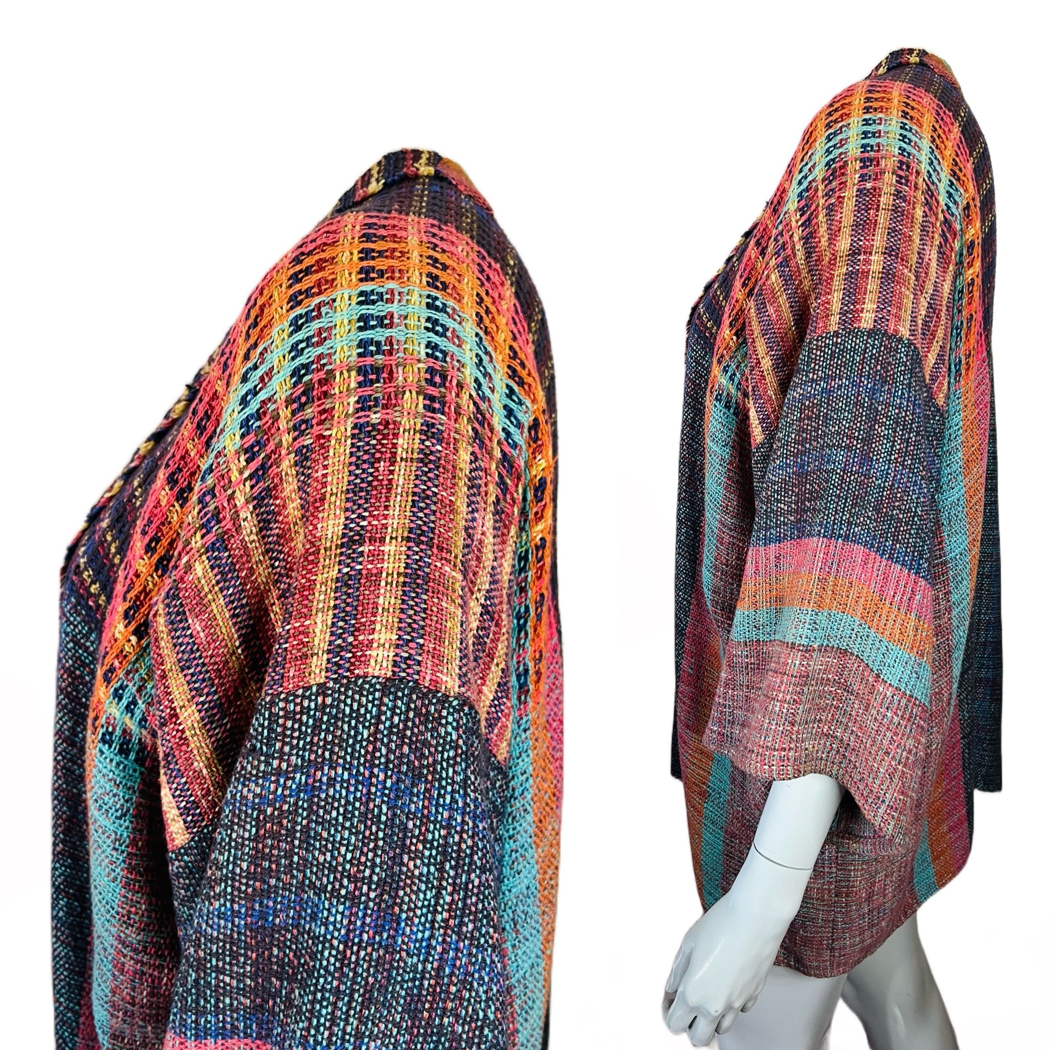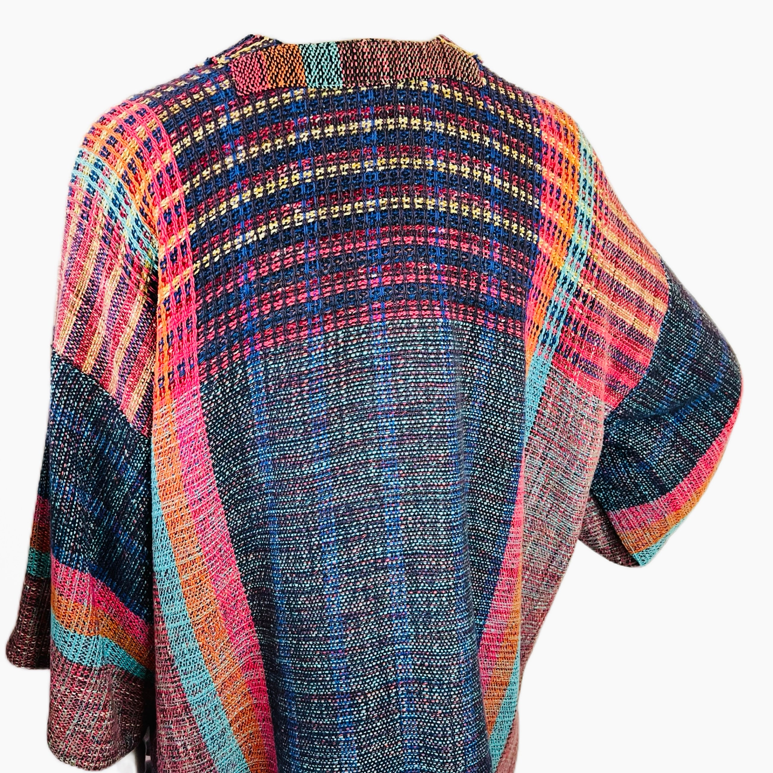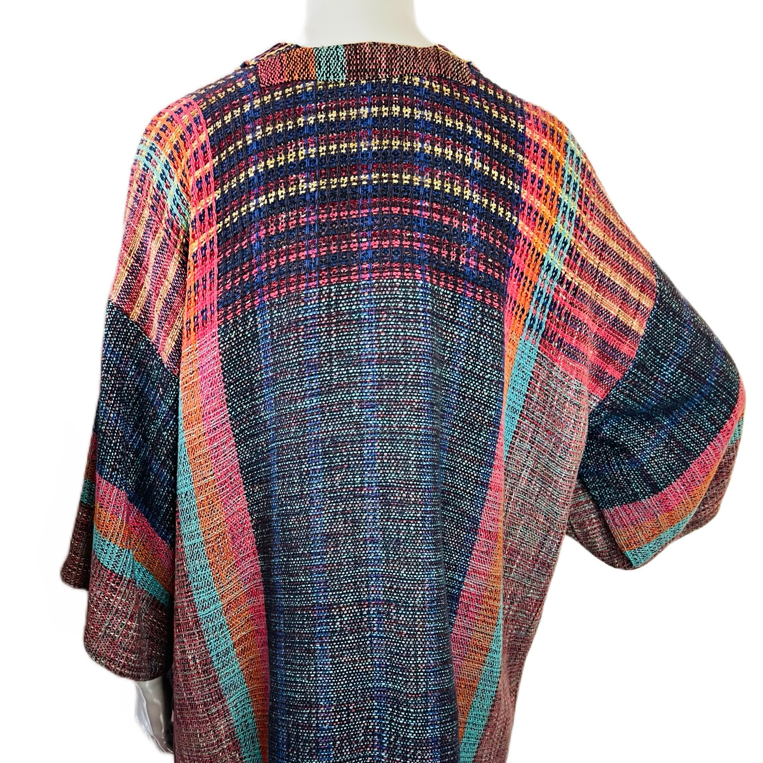 🌈 Absolute stunner of a jacket. Handwoven beauty. Nice wide sleeve. Open front, no closures. Fringe detailing along the neckline. Rainbow colors. Perfect piece to add some magic to your day.Â