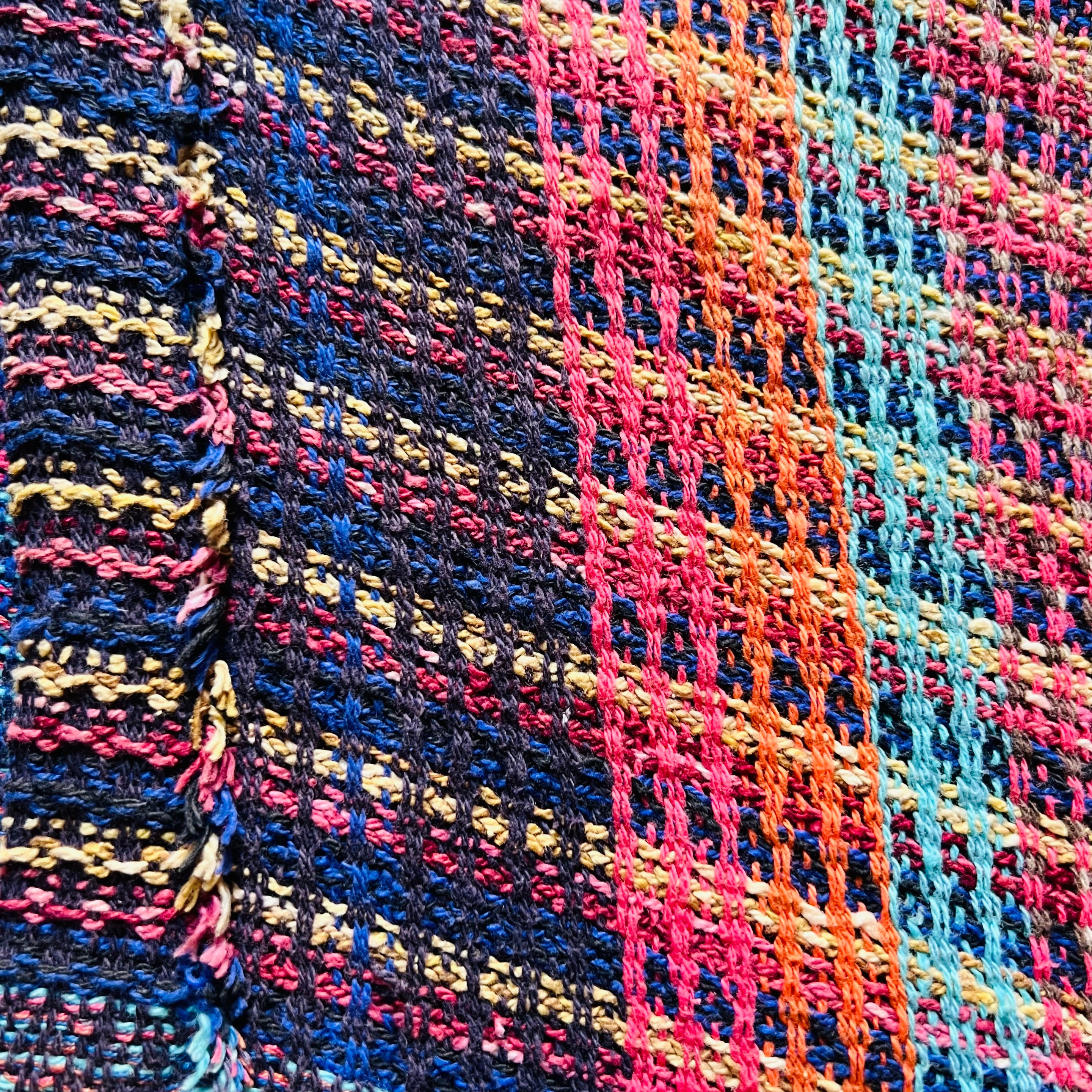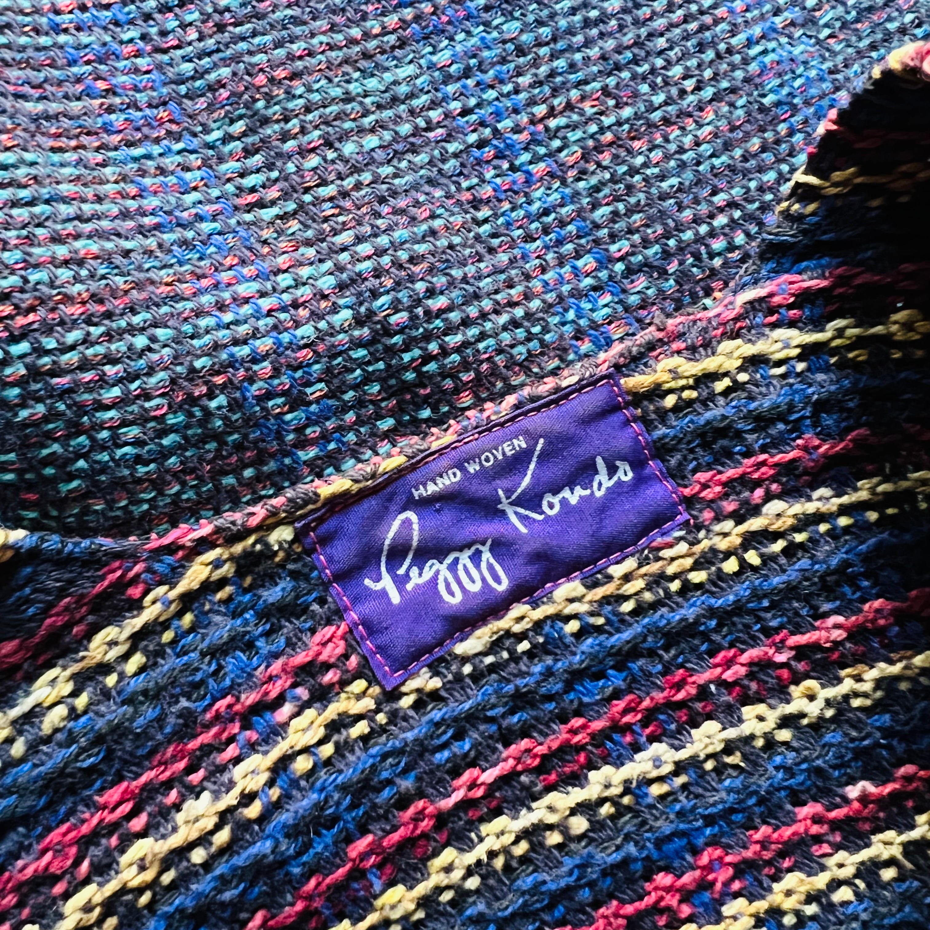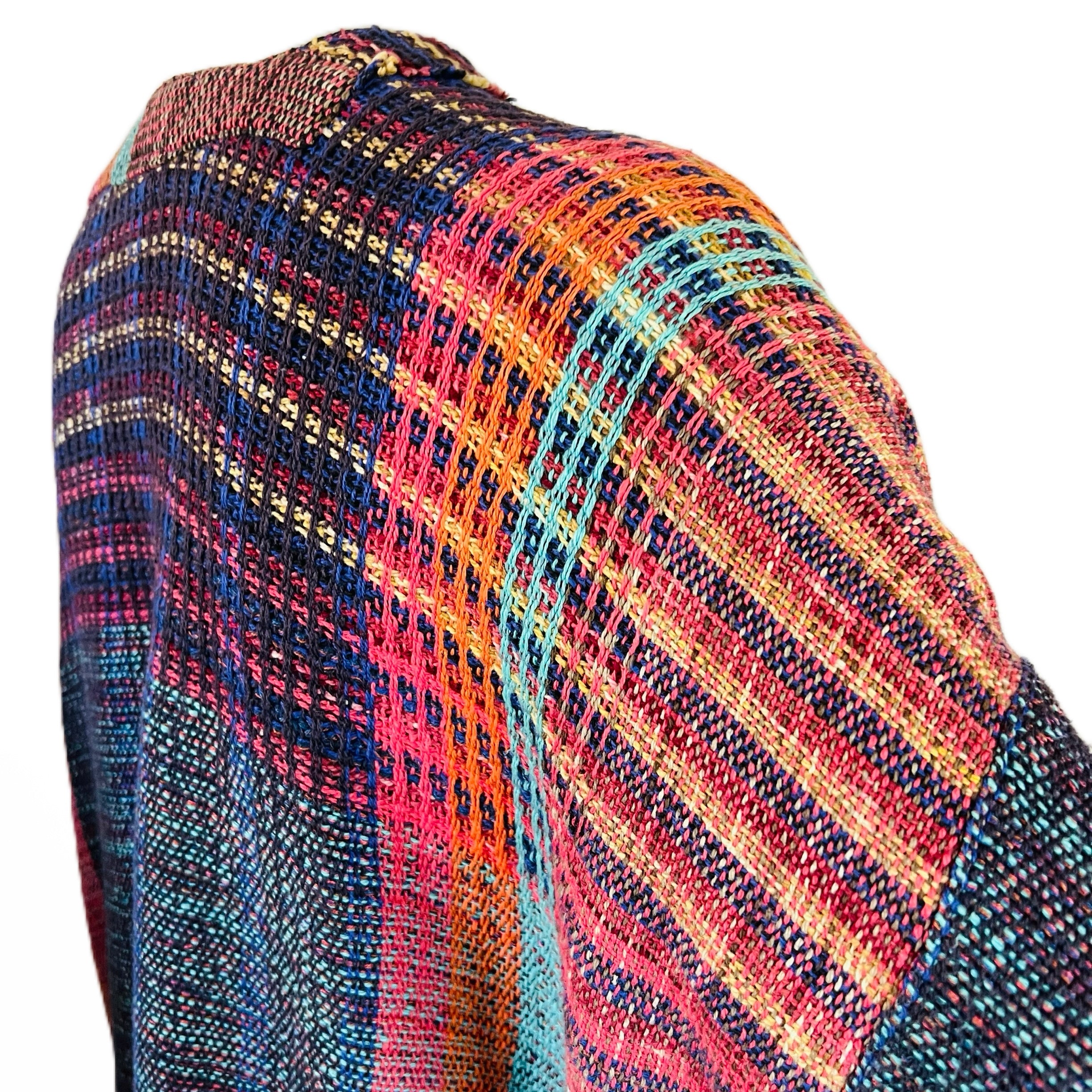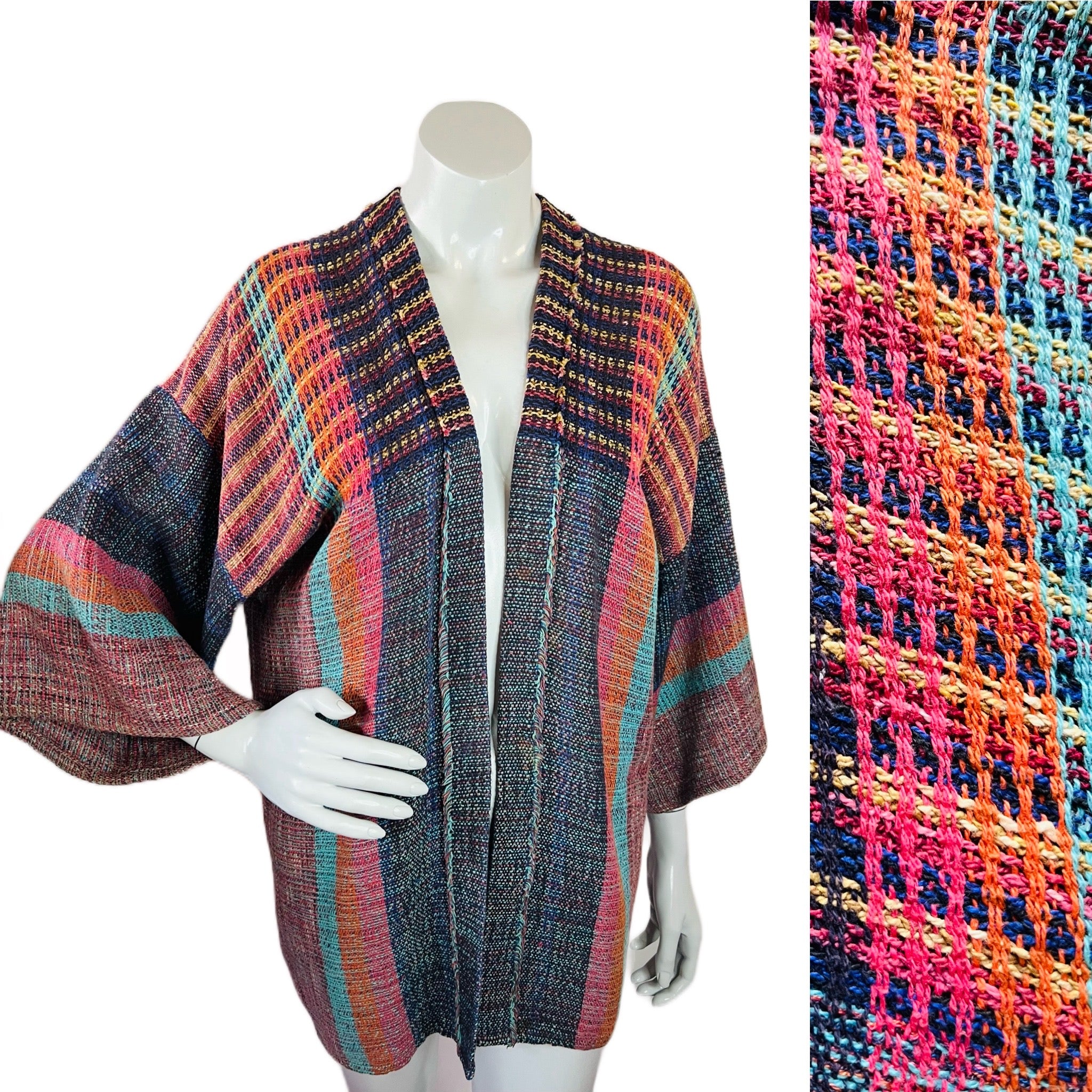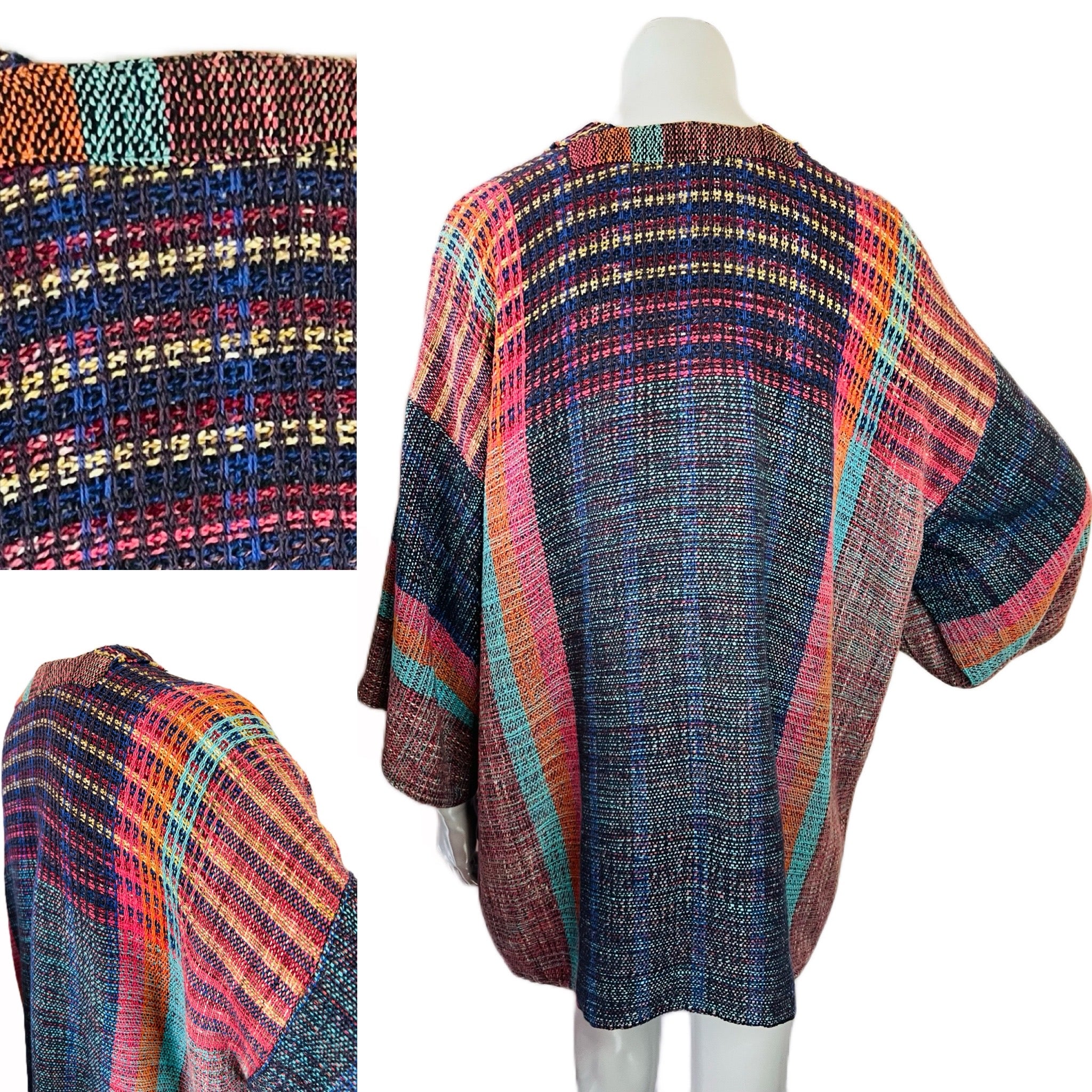 🌈 Absolute stunner of a jacket. Handwoven beauty. Nice wide sleeve. Open front, no closures. Fringe detailing along the neckline. Rainbow colors. Perfect piece to add some magic to your day.Â