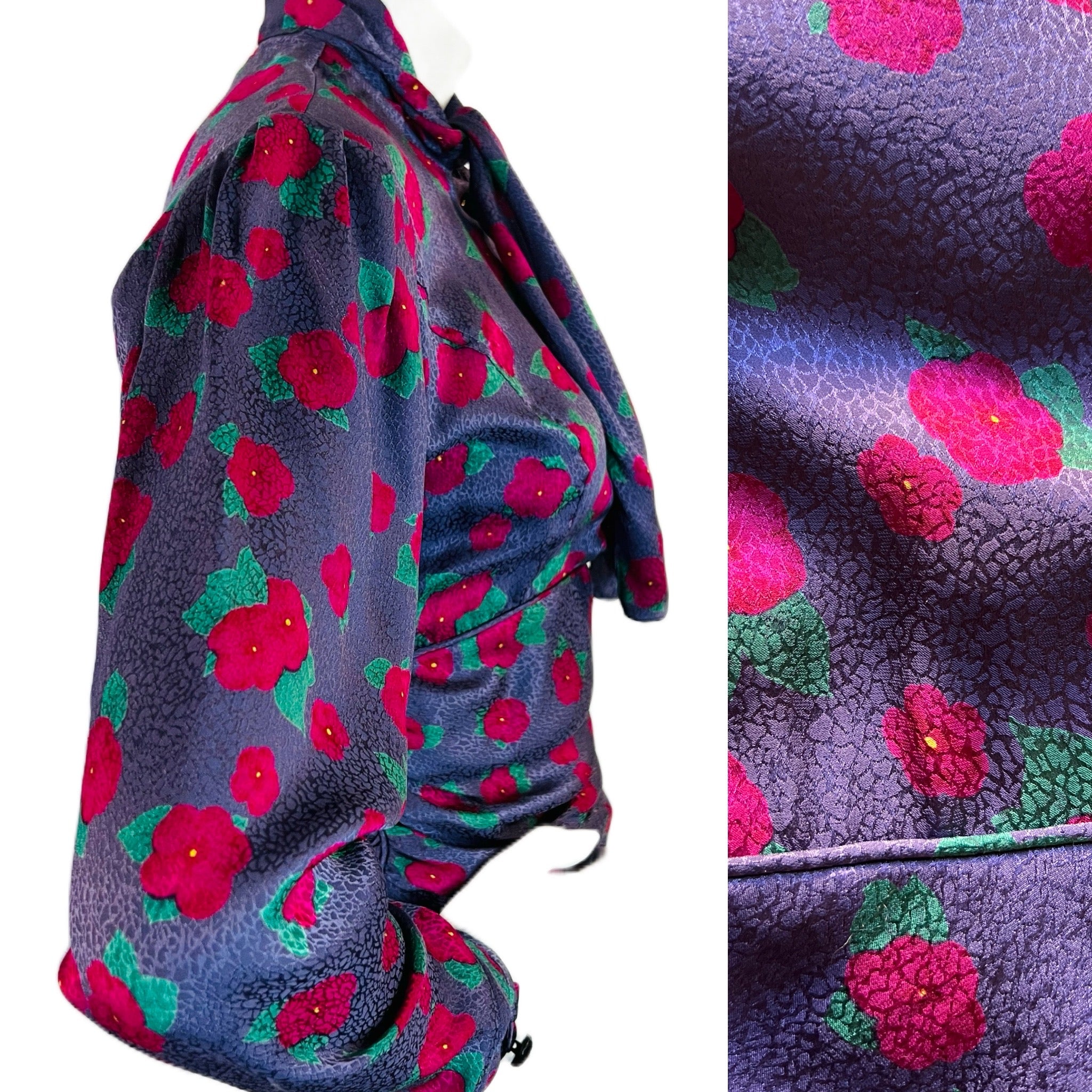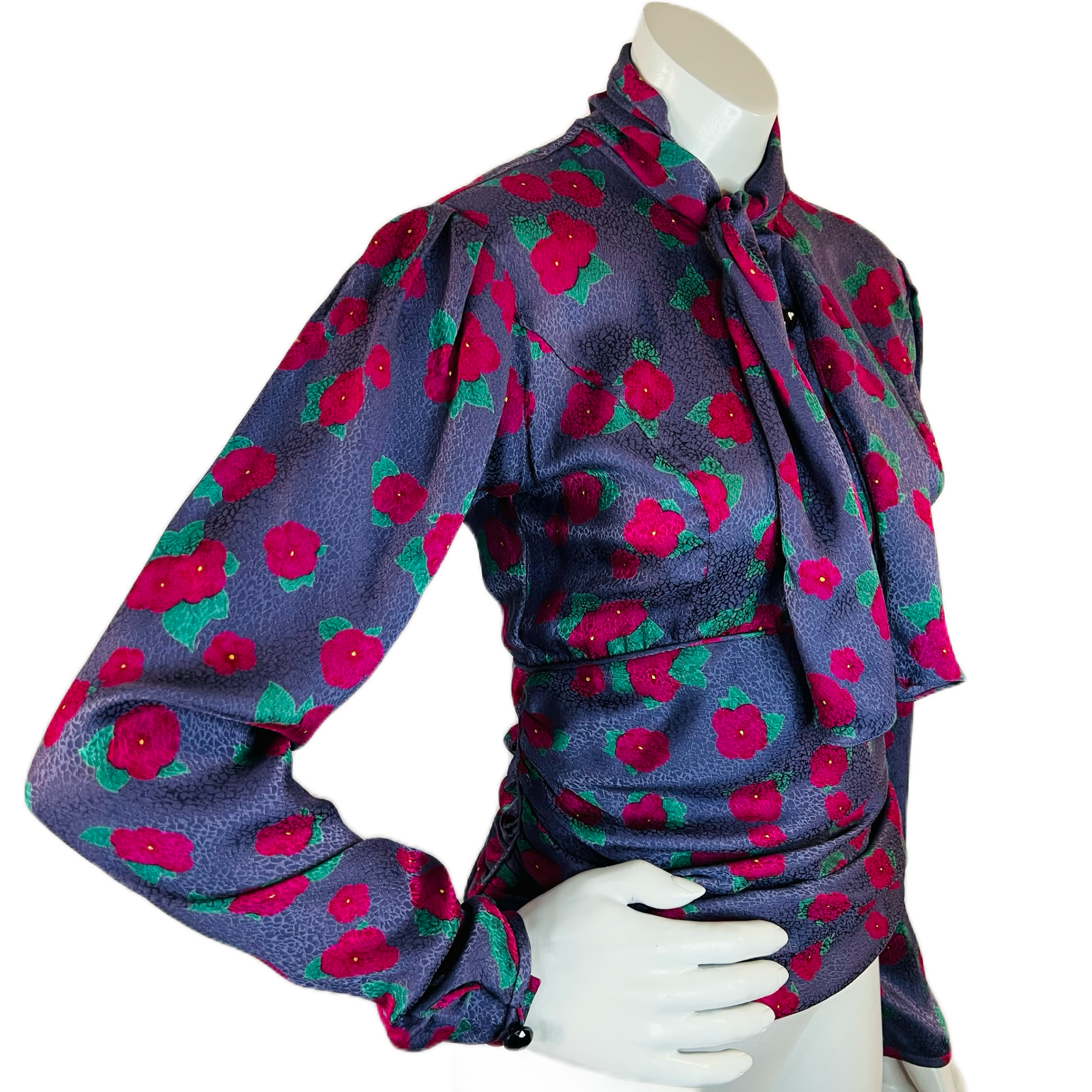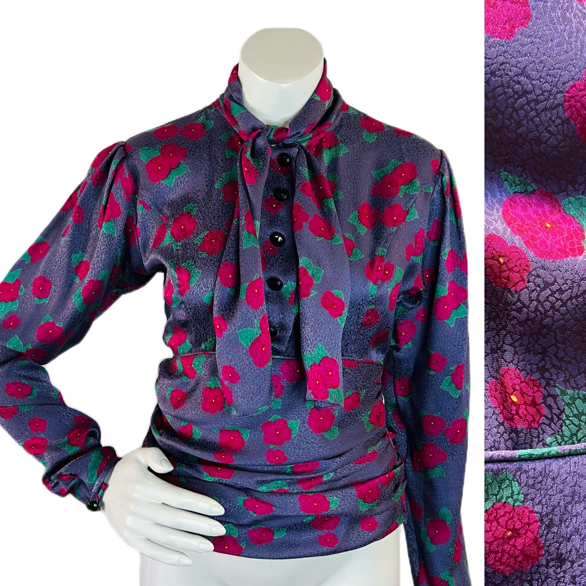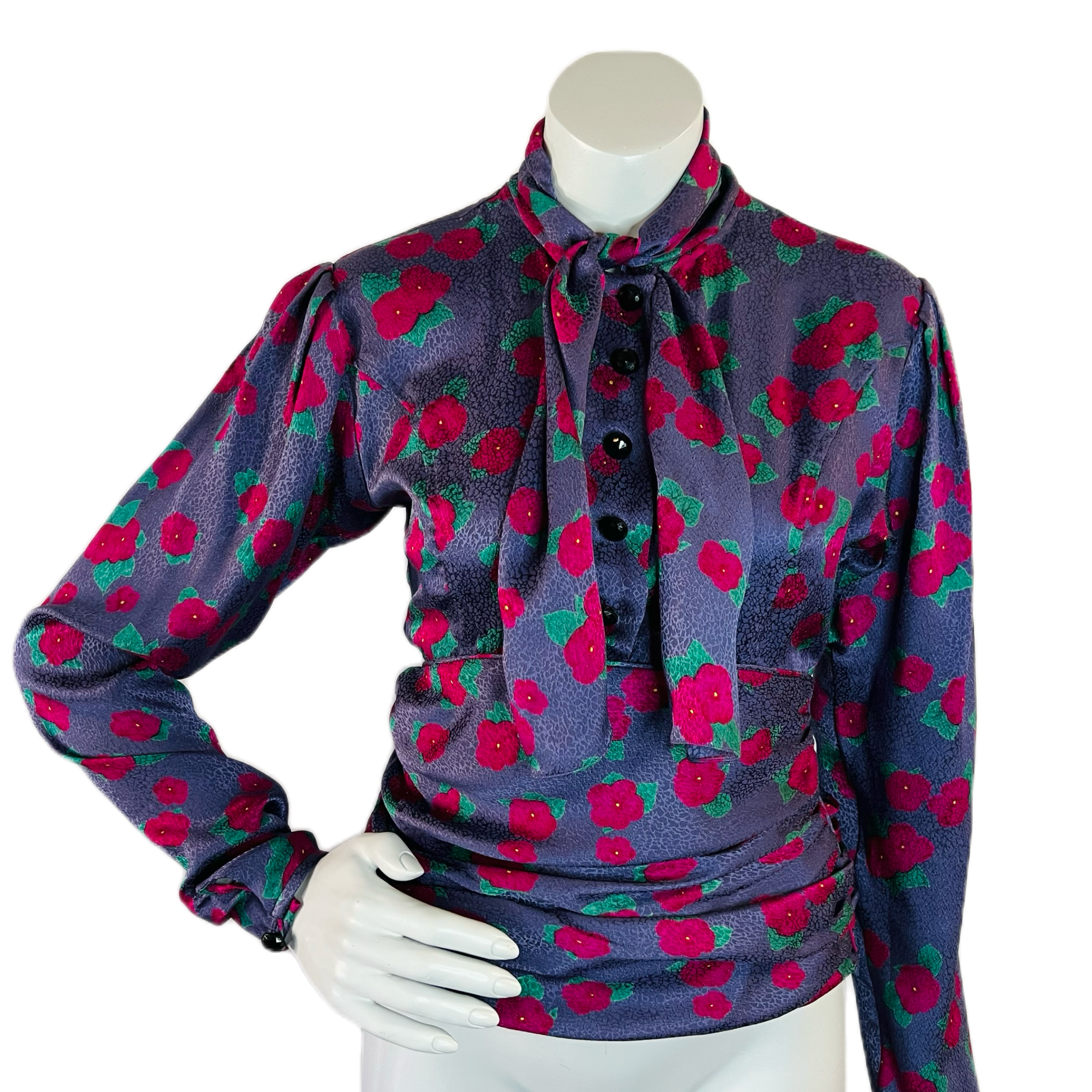 🌸 Purple Ungaro silk blouse with embossed pattern and raspberry and green flowers. Puff sleeve. Buttons at wrist. 5 buttons up front. Pull over head to wear. Pussy bow/scarf style at neck. Ruched at waist for the most flattering fit. Hidden zipper at side. So chic!