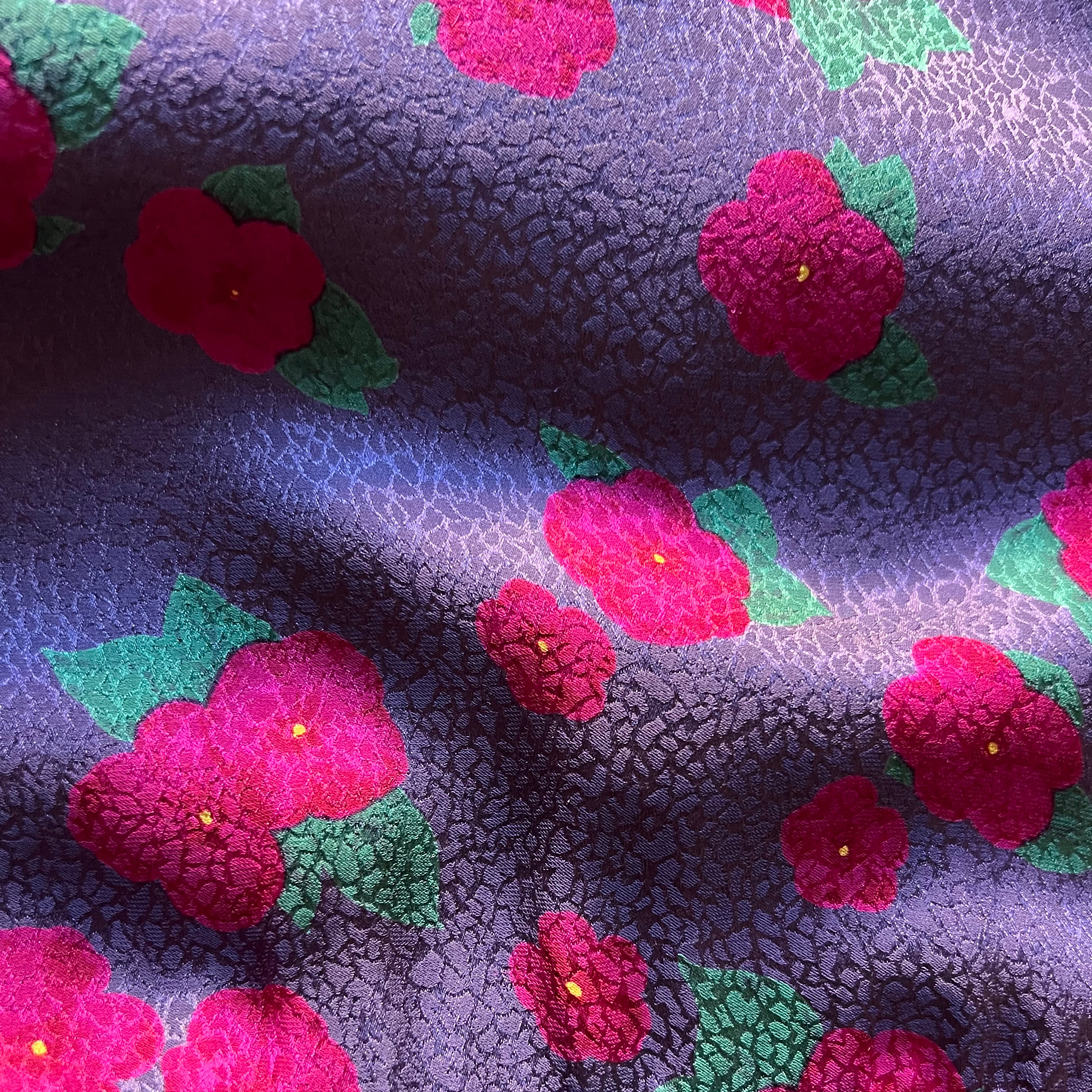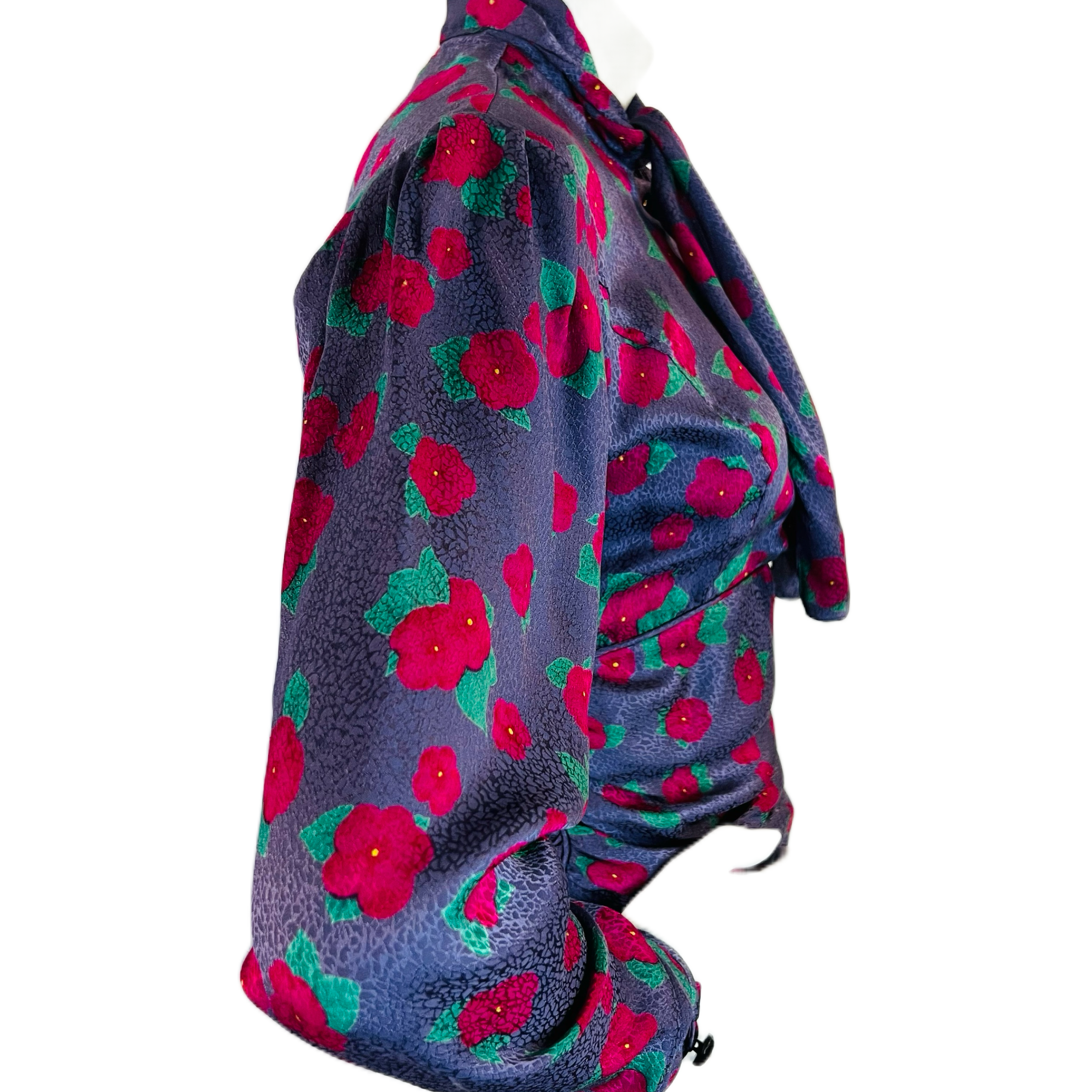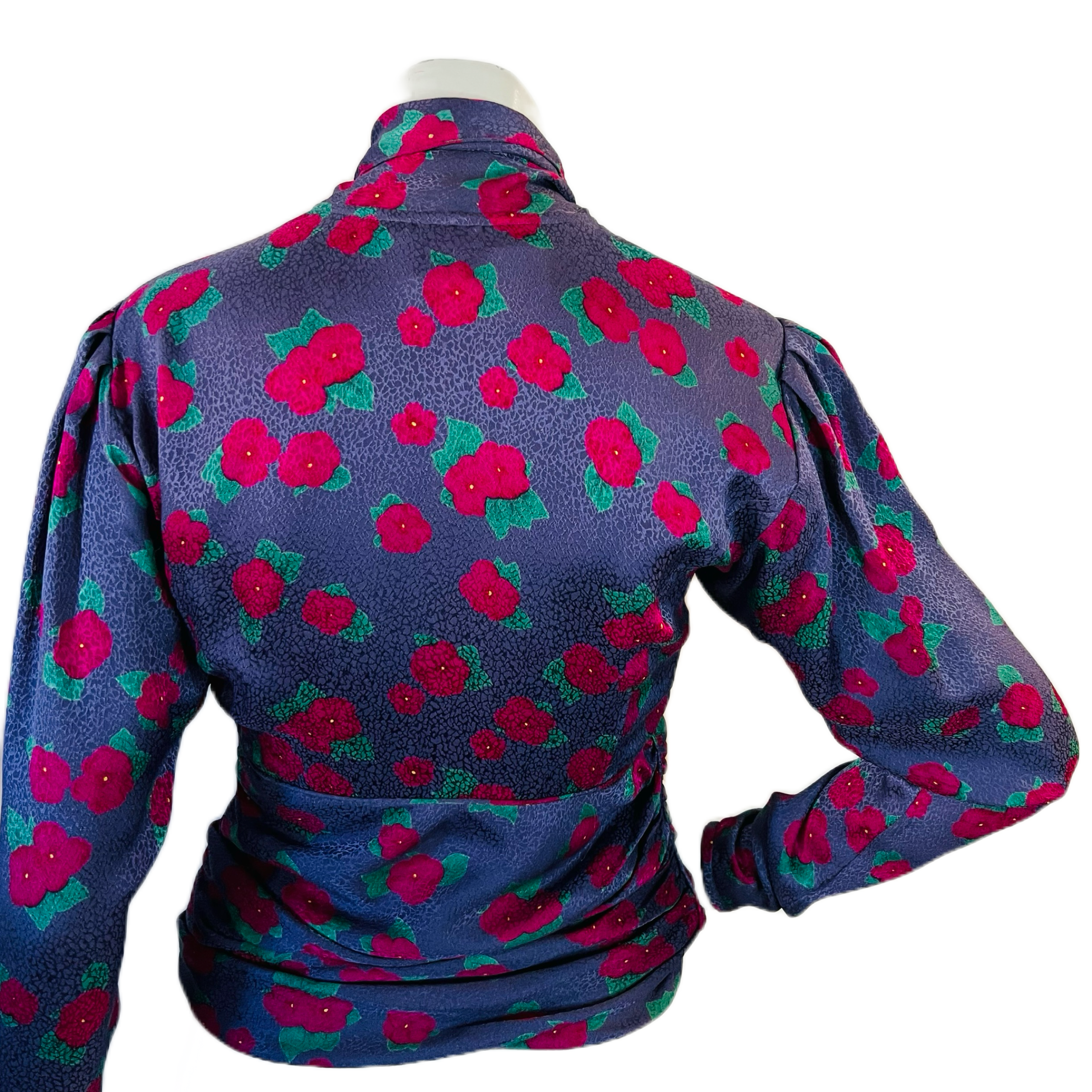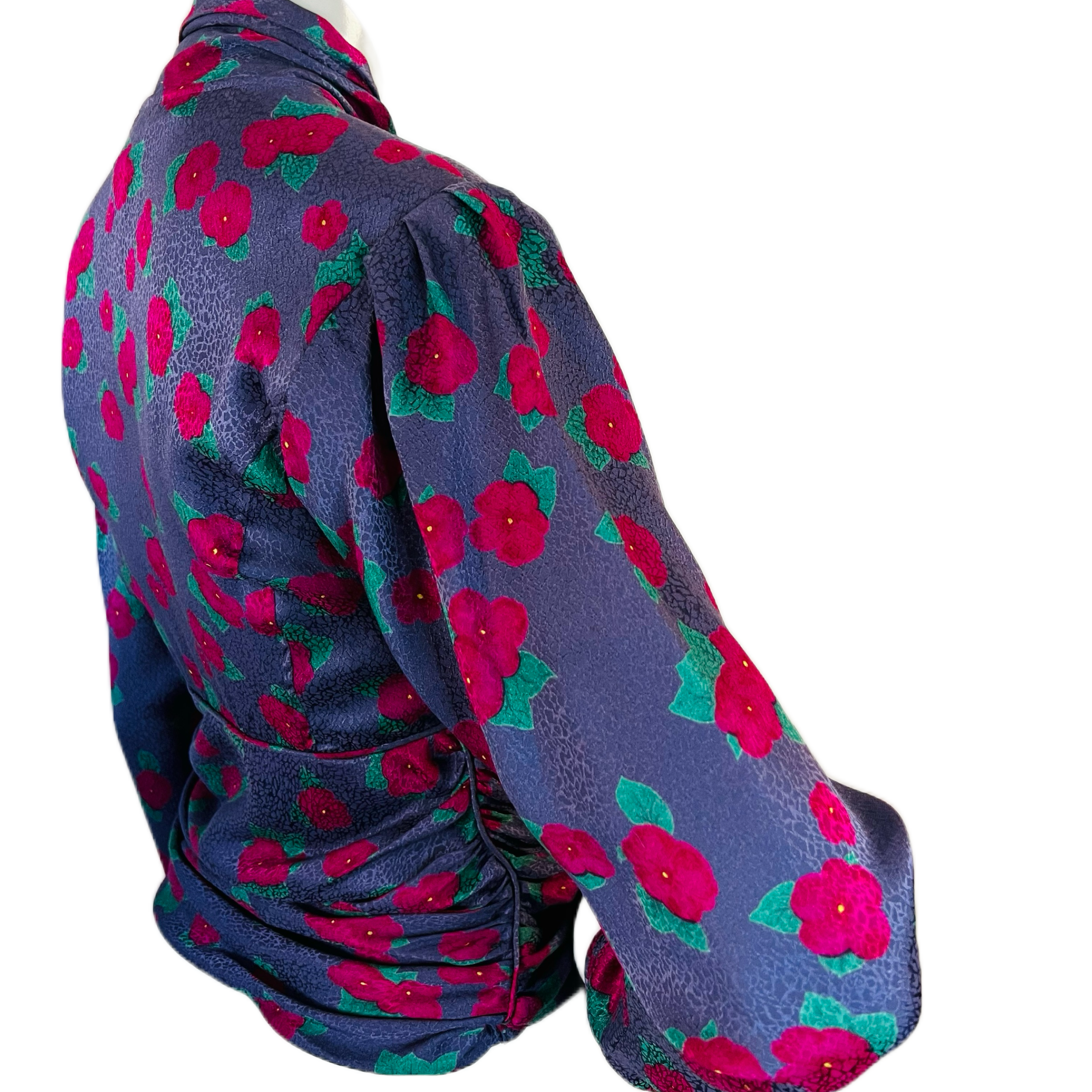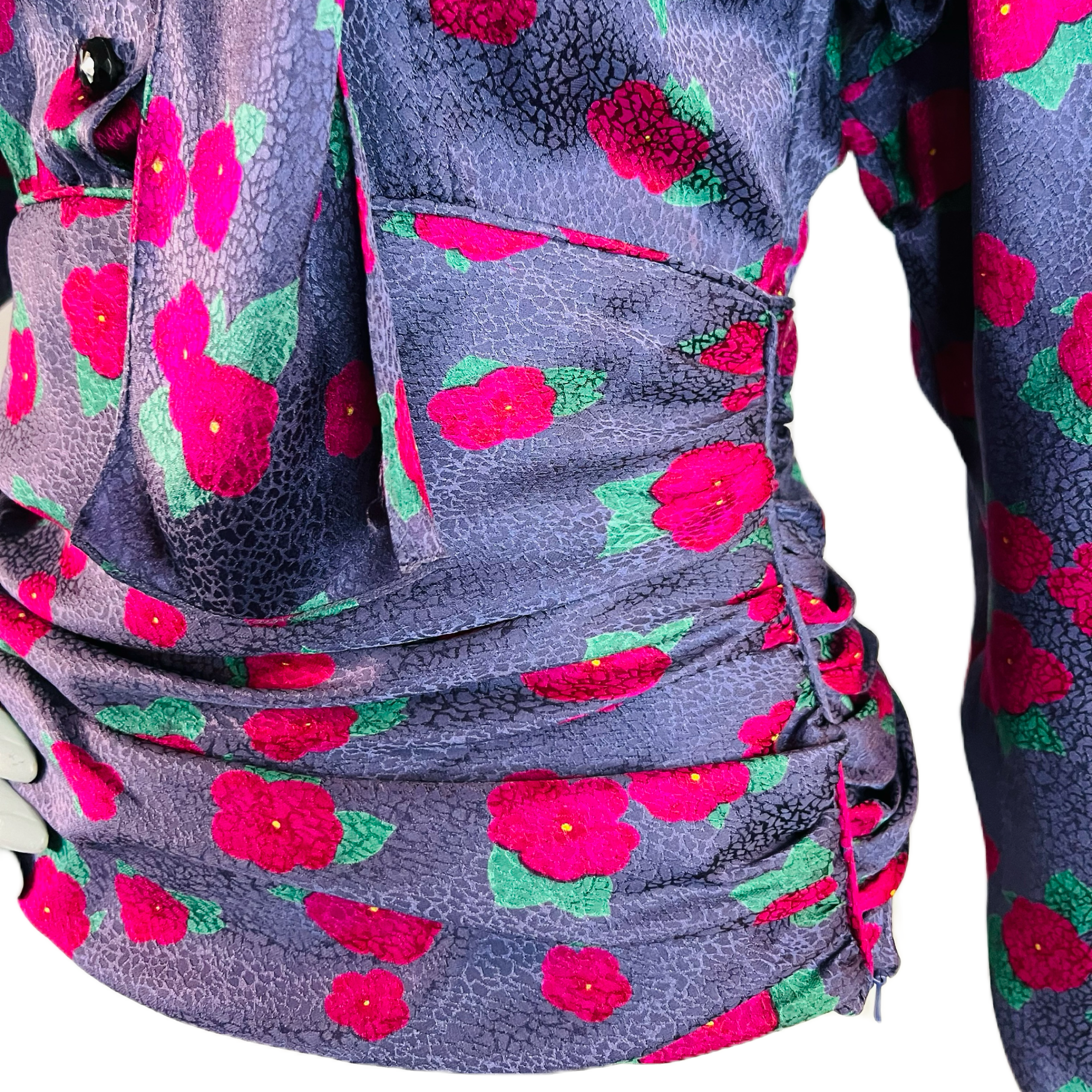 🌸 Purple Ungaro silk blouse with embossed pattern and raspberry and green flowers. Puff sleeve. Buttons at wrist. 5 buttons up front. Pull over head to wear. Pussy bow/scarf style at neck. Ruched at waist for the most flattering fit. Hidden zipper at side. So chic!