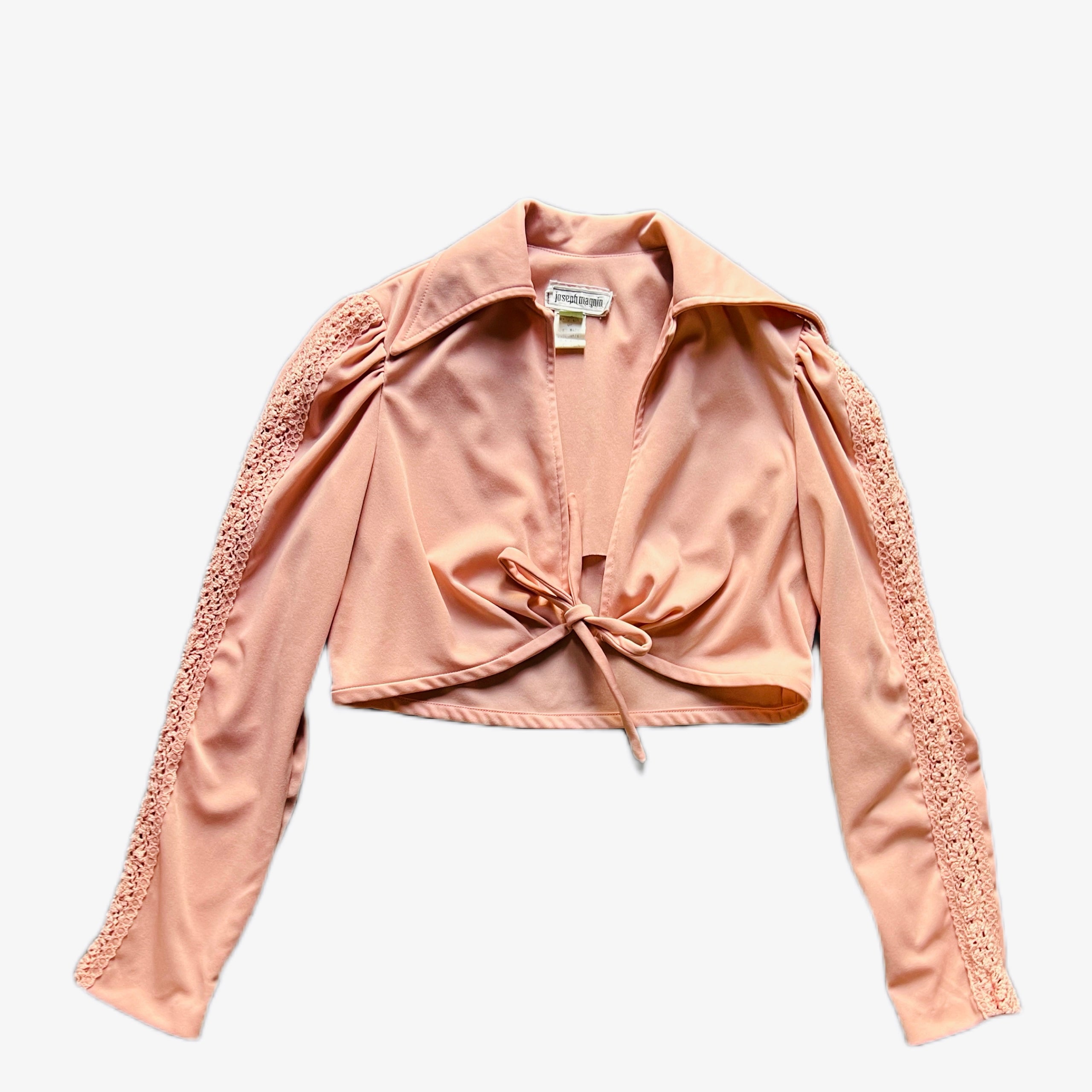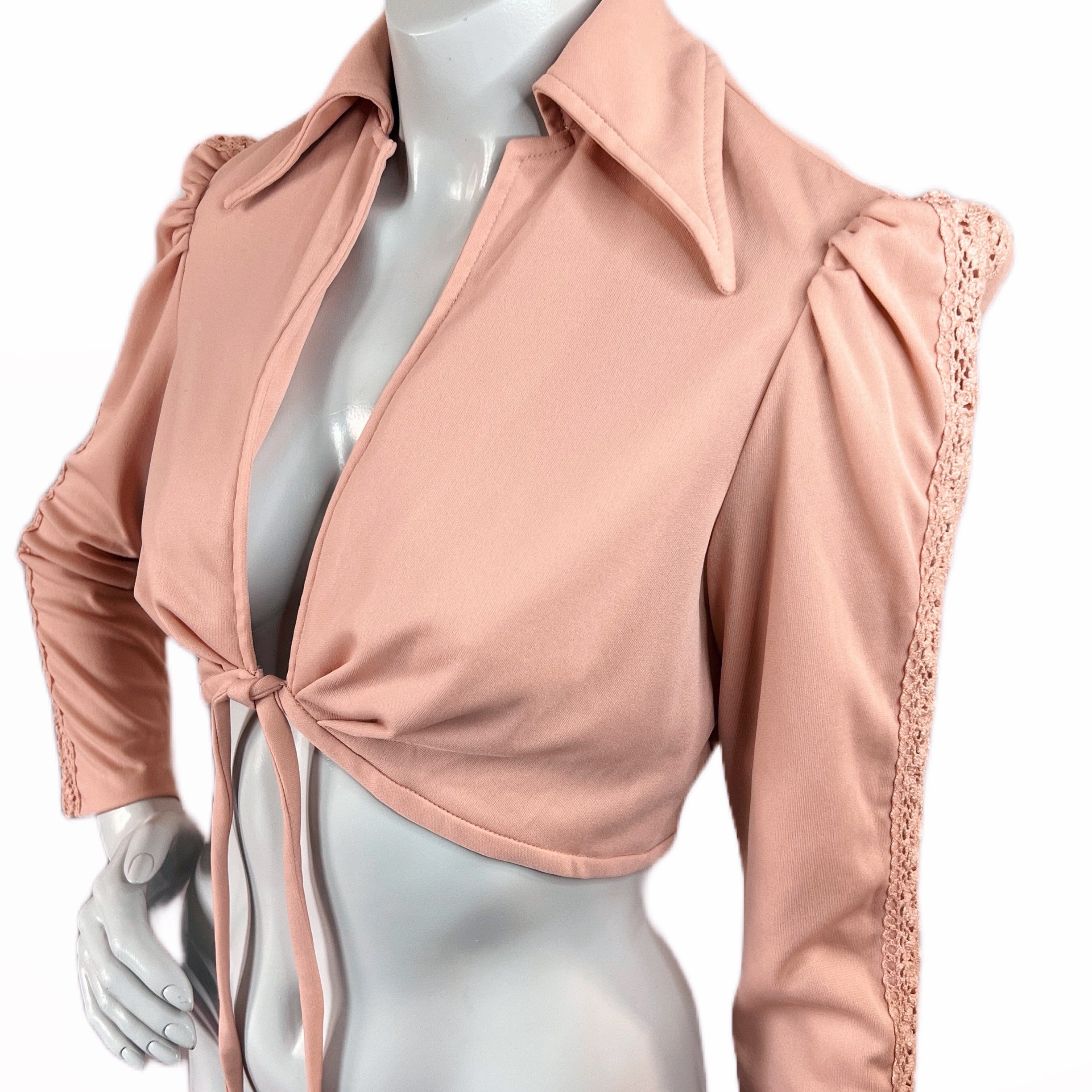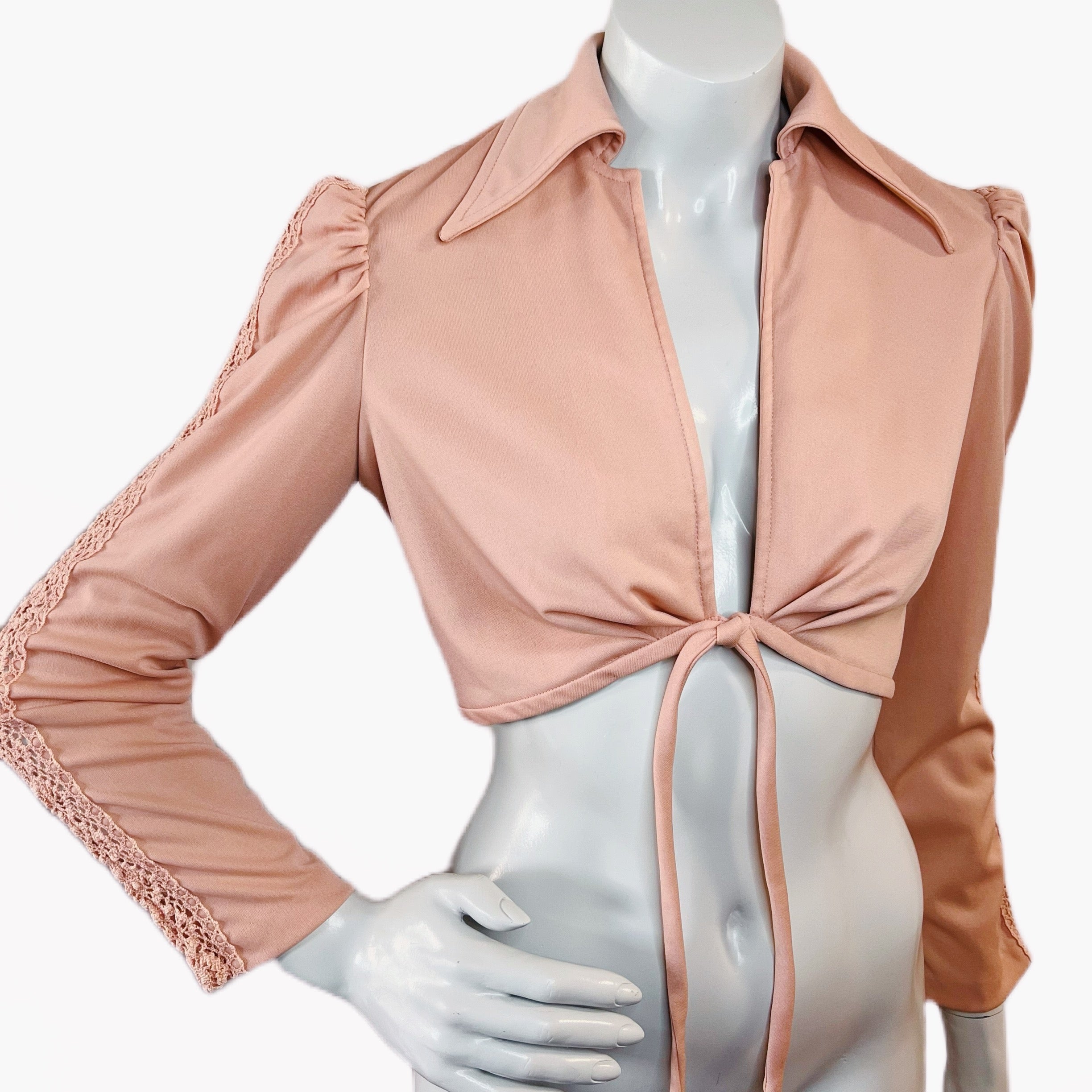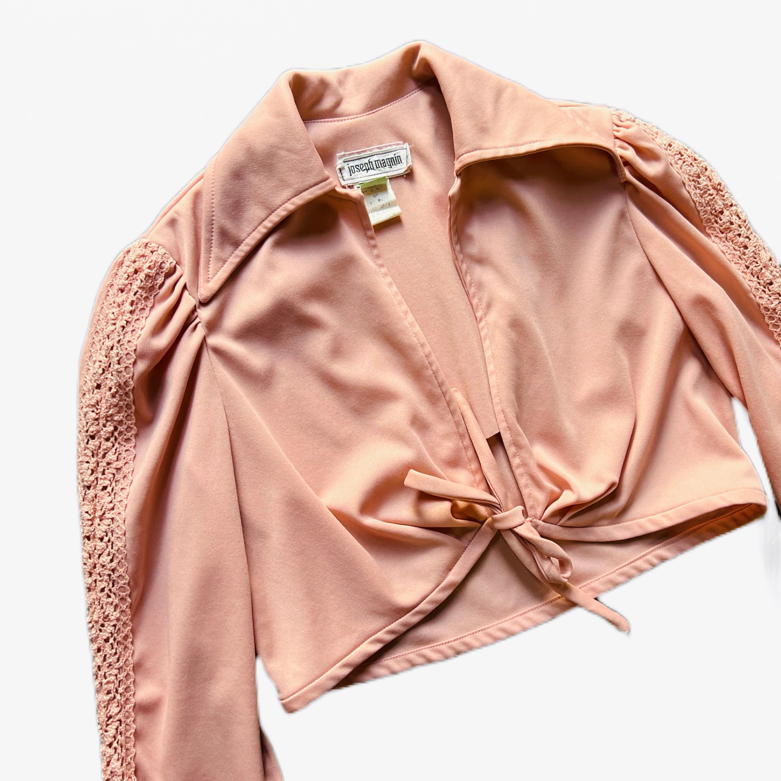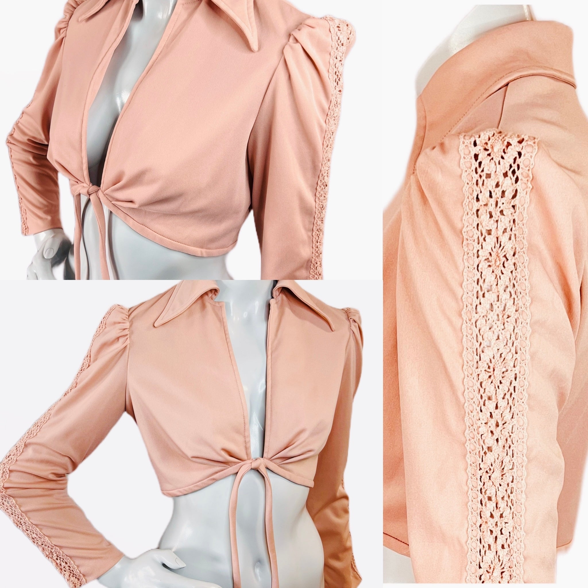 💝Peachy pink 1970s puff sleeve Joseph Magnin tie up crop top with sheer crochet detailing on sleeves. Dagger collar. Classic 70s vibes!