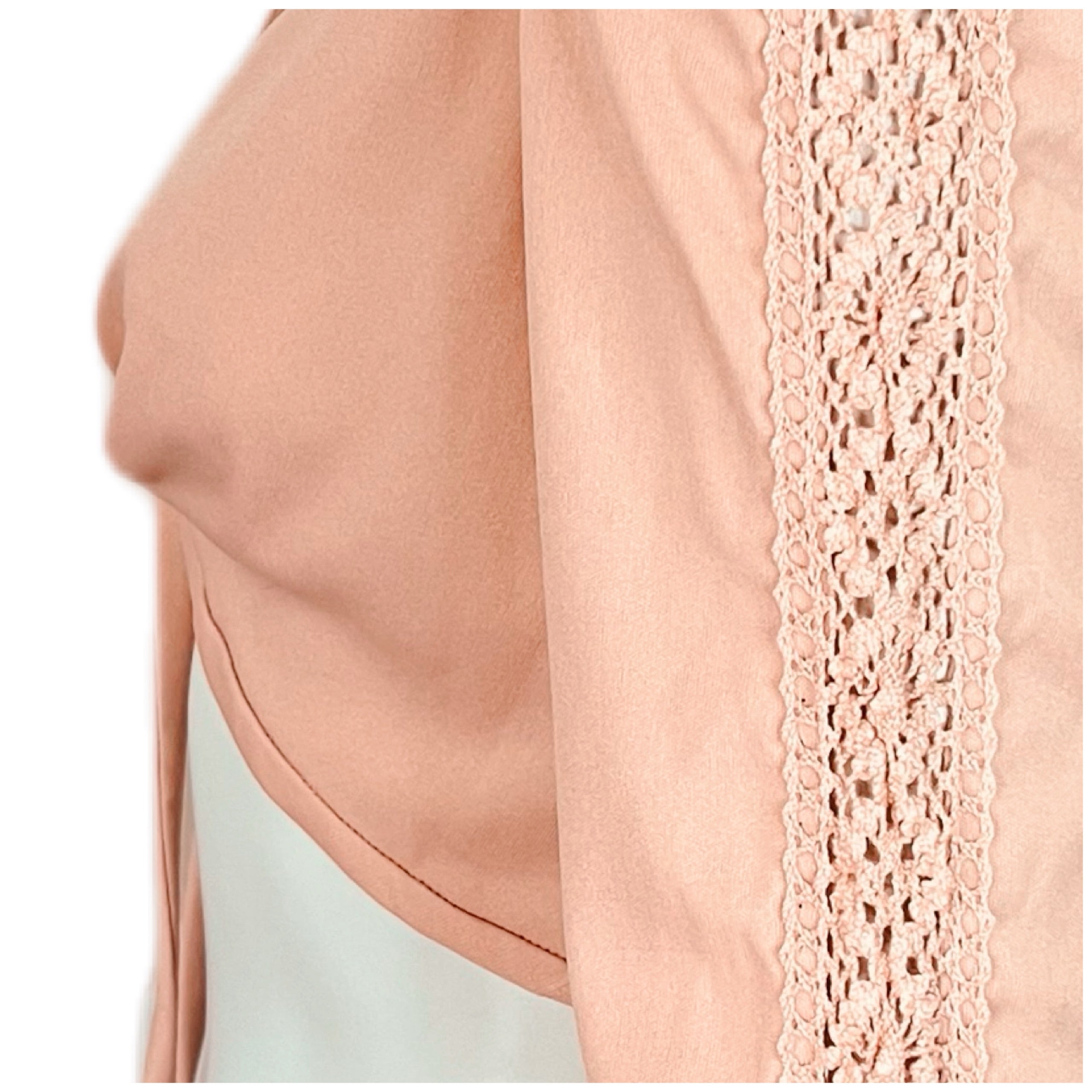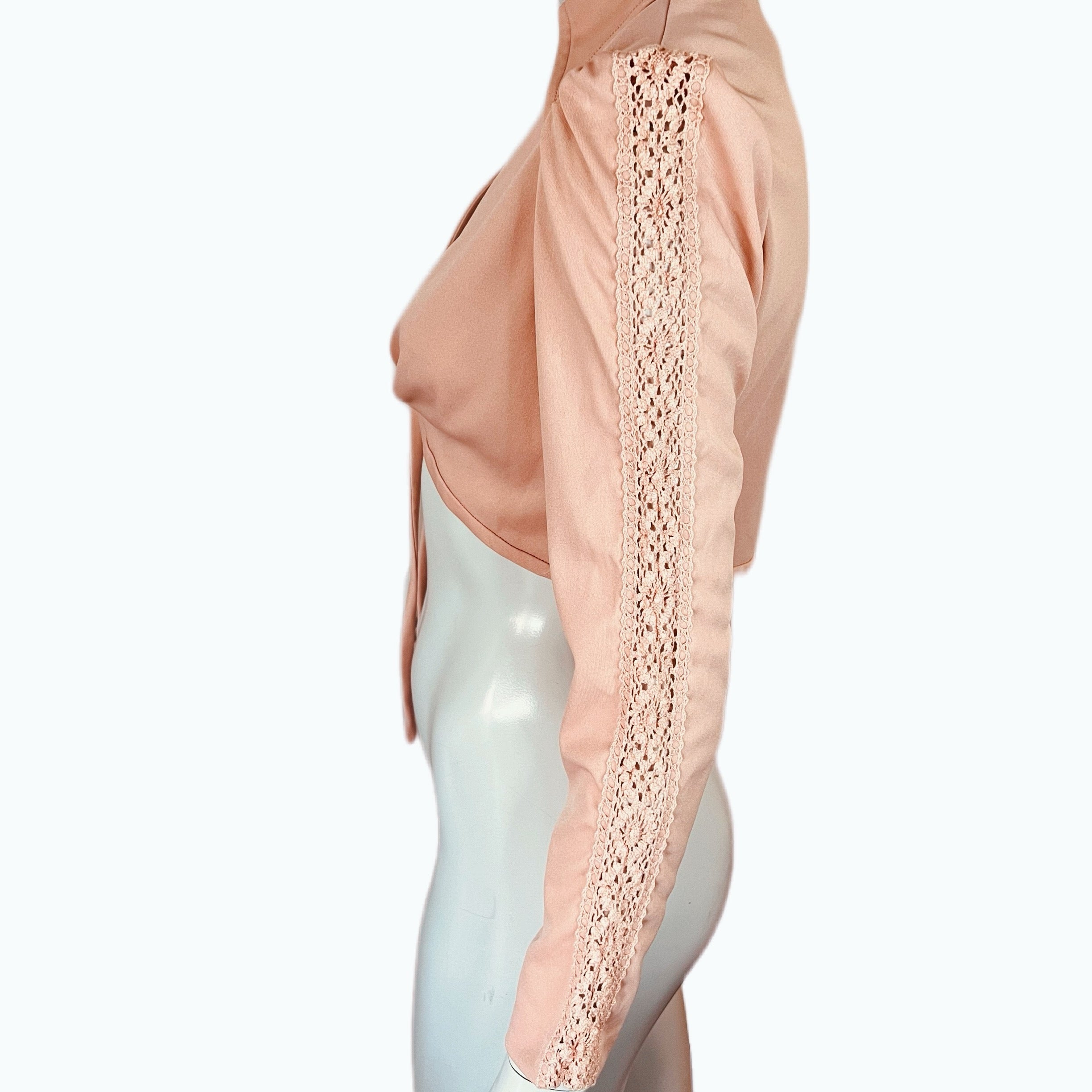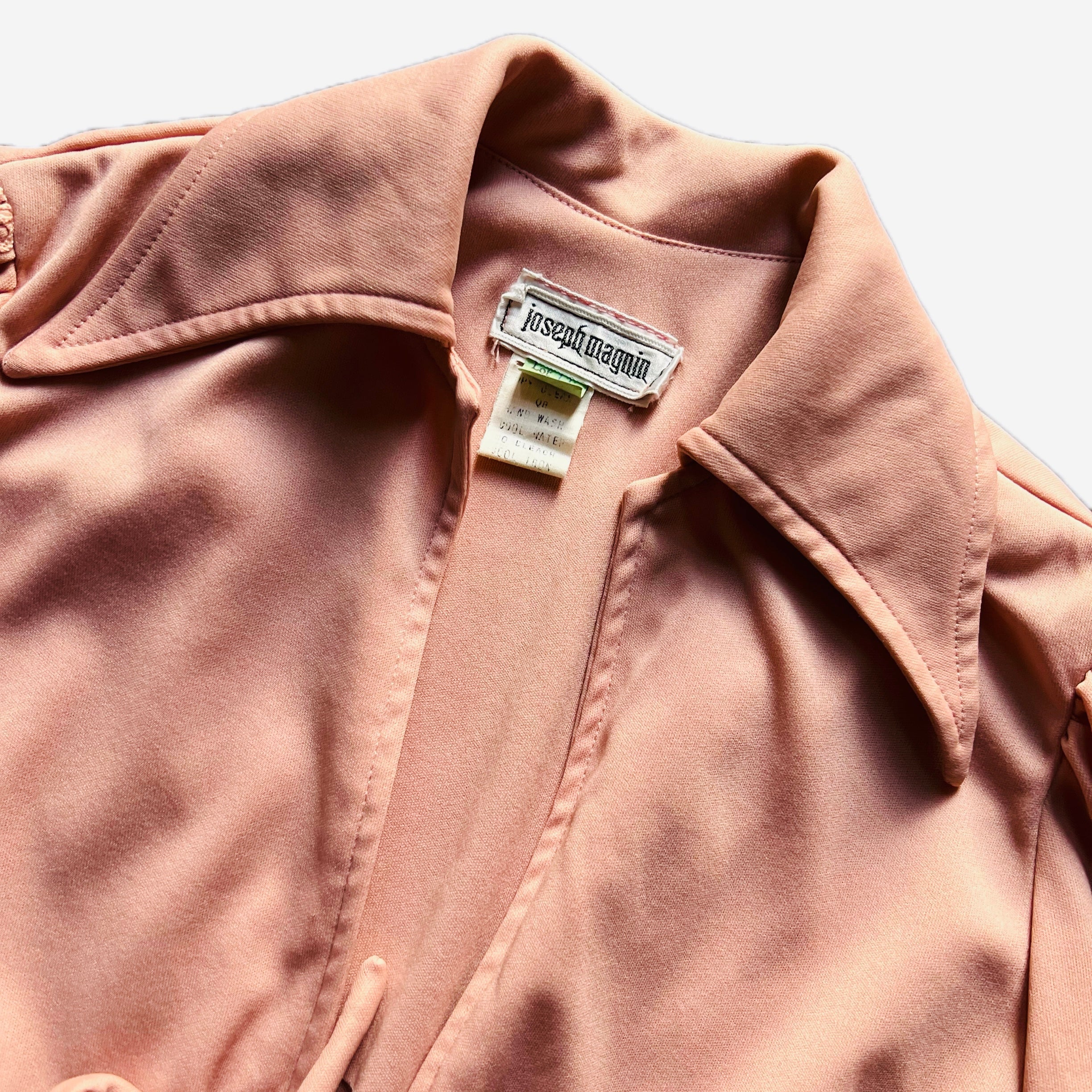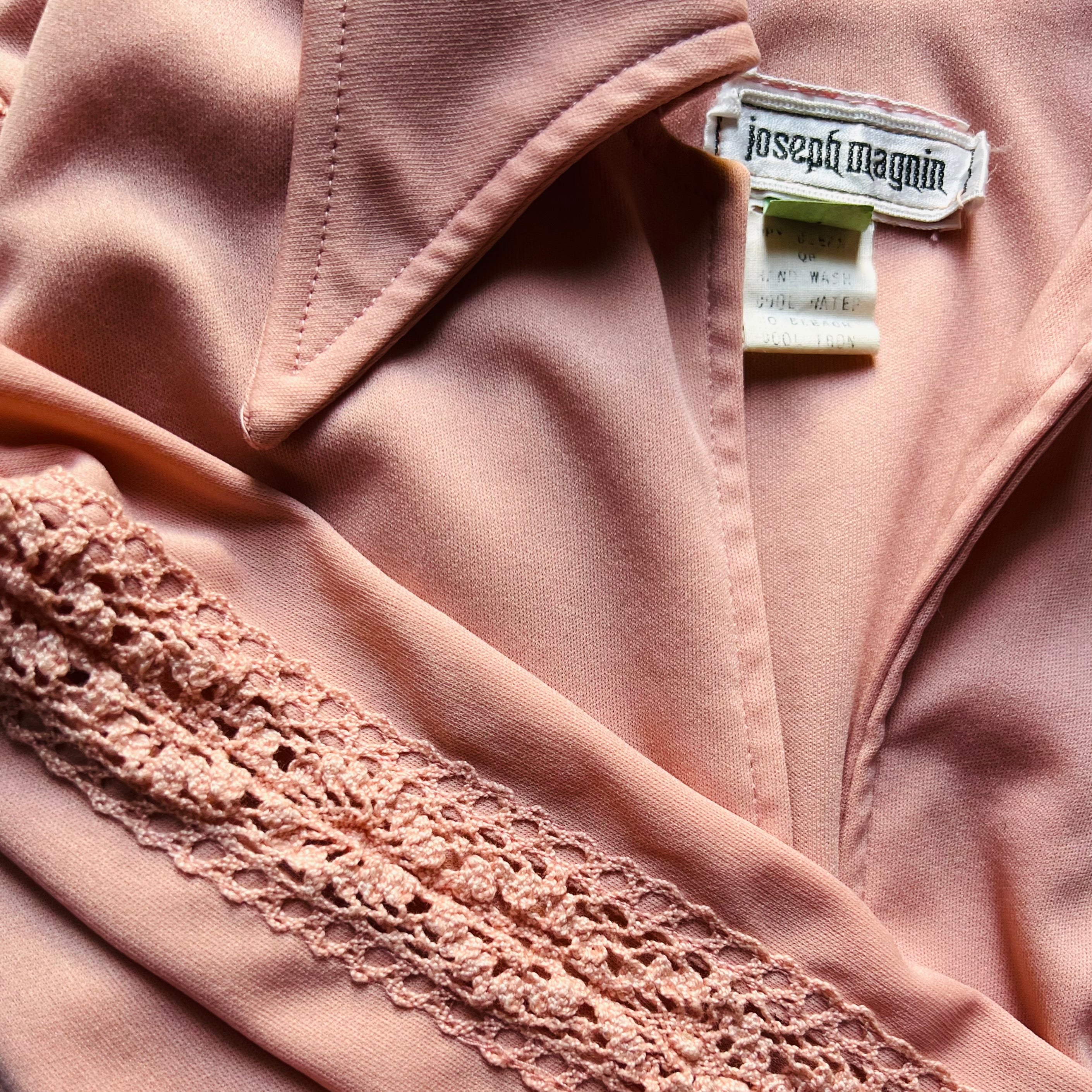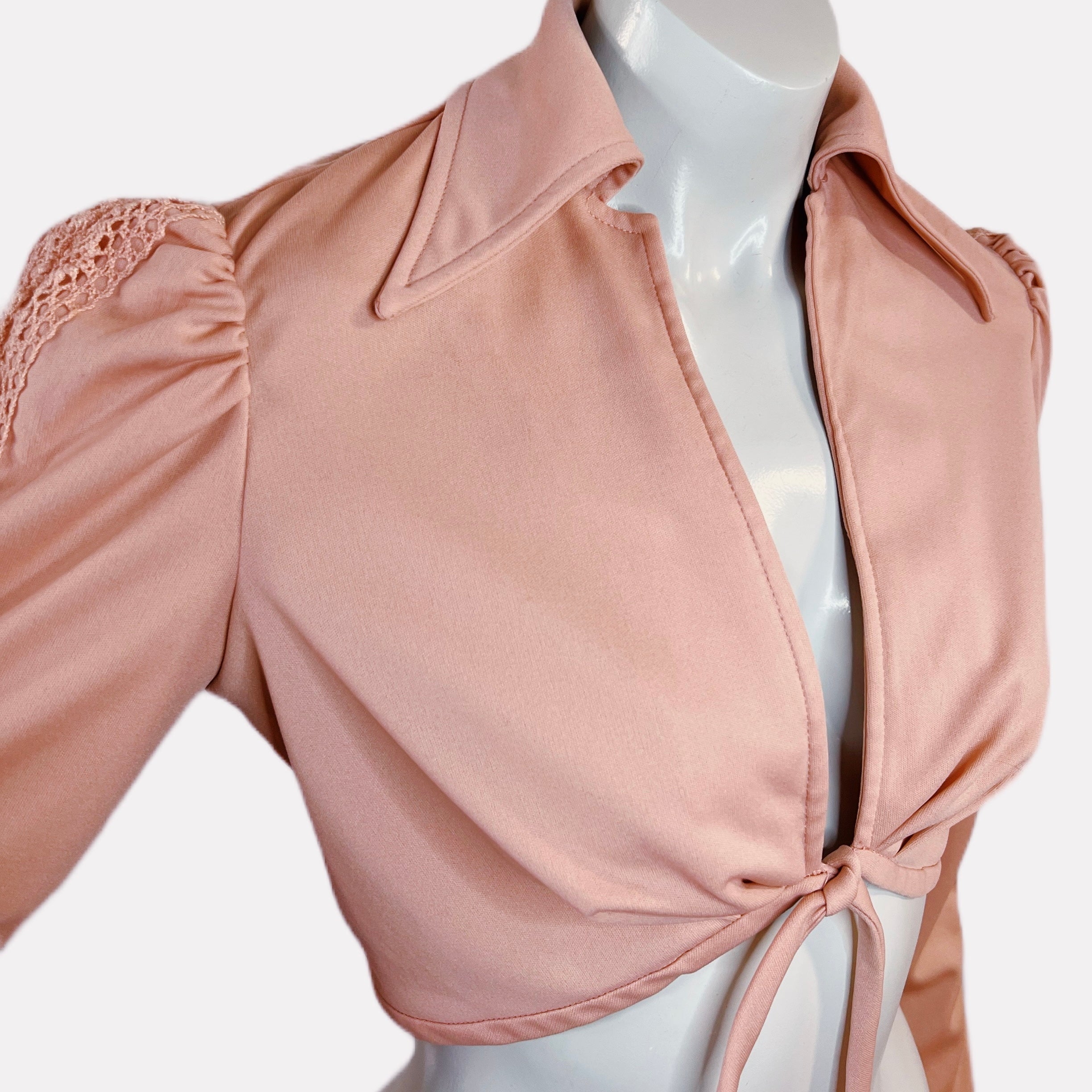 💝Peachy pink 1970s puff sleeve Joseph Magnin tie up crop top with sheer crochet detailing on sleeves. Dagger collar. Classic 70s vibes!