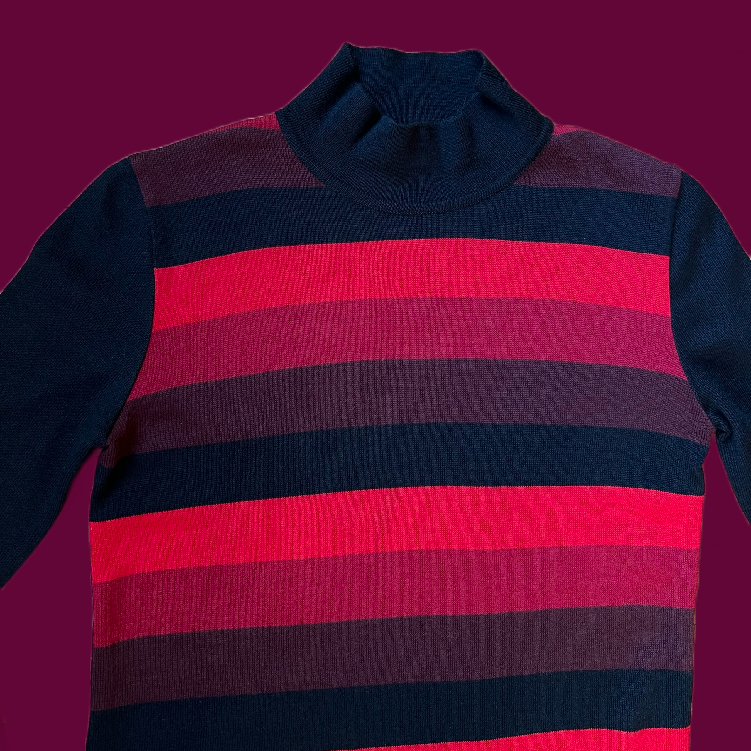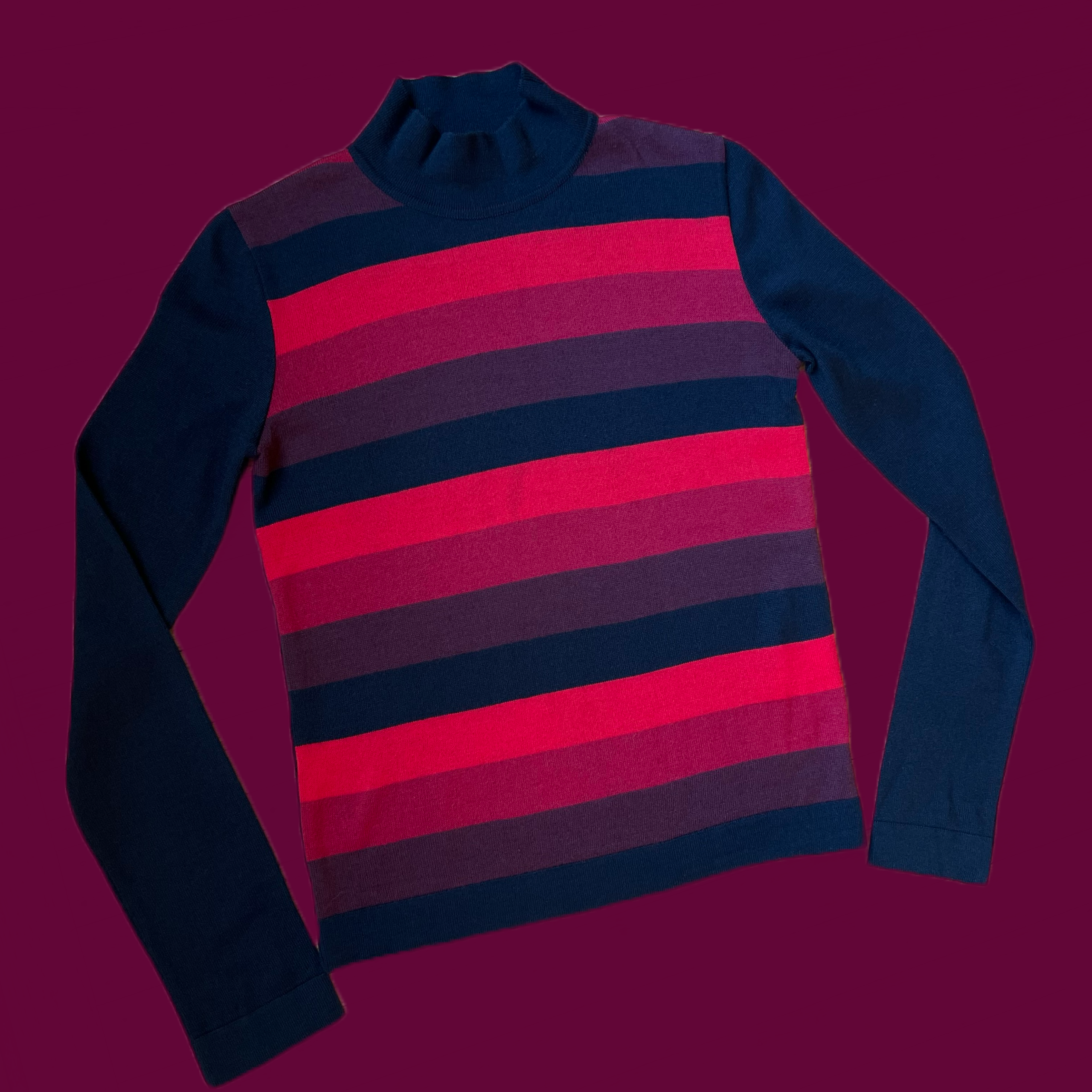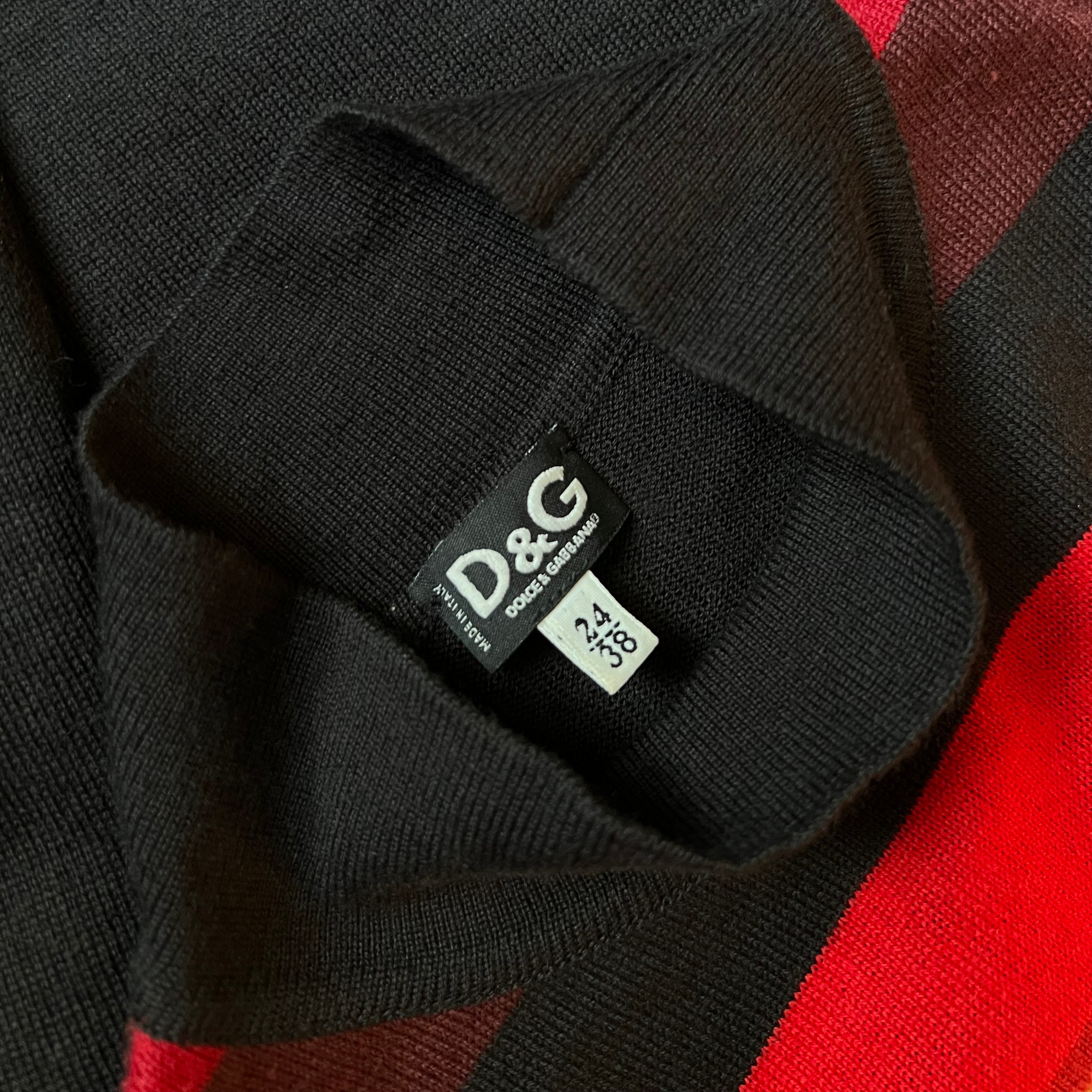 Gorgeous ombre striped knit top from the 80s-2000s D&G line from Dolce & Gabbana. Has mock neck. Love the shades of red in the stripes. Black at sleeves, back and neck. Pull over head to wear. Nice thin fabric that still keeps you warm. A classic everyday staple to style in so many ways!