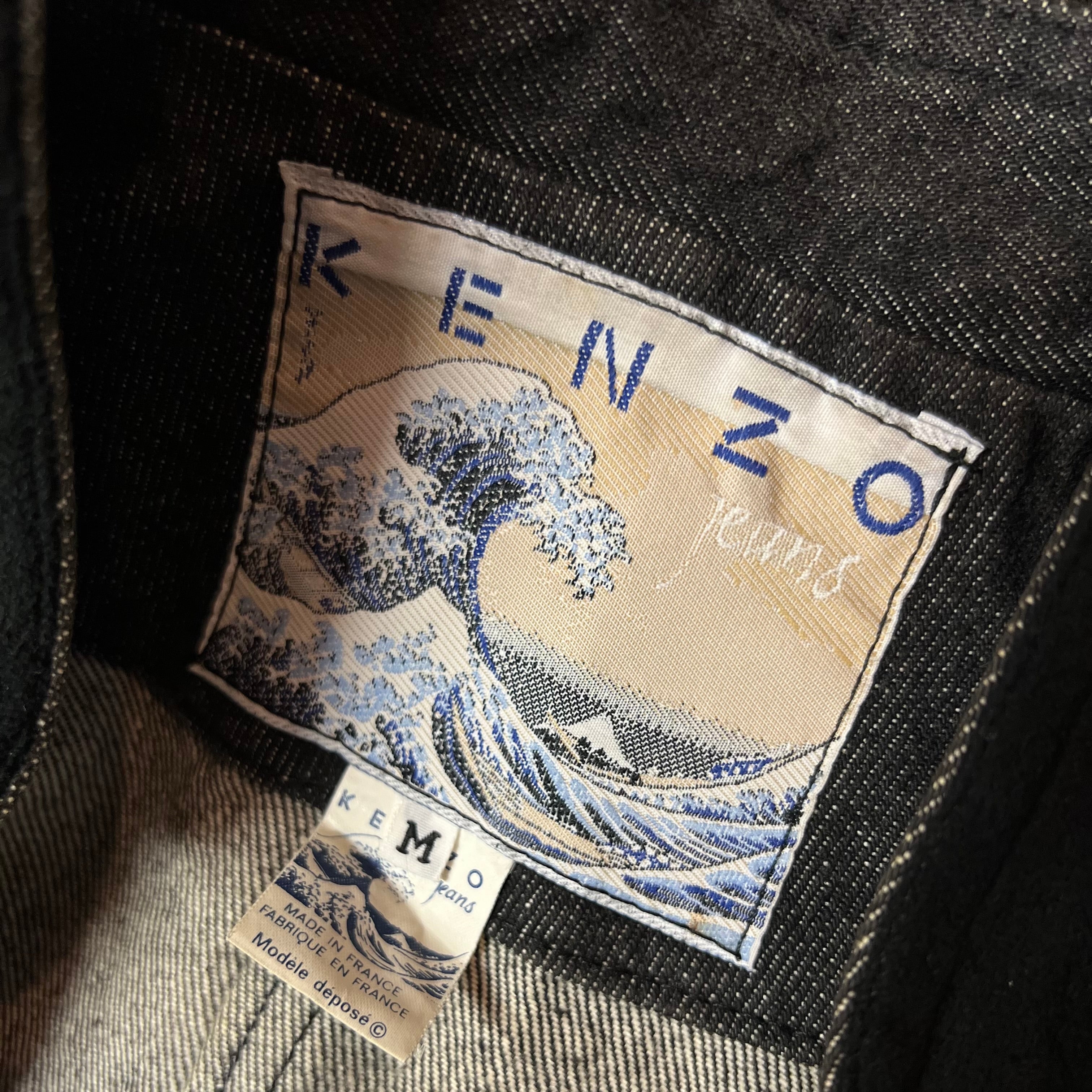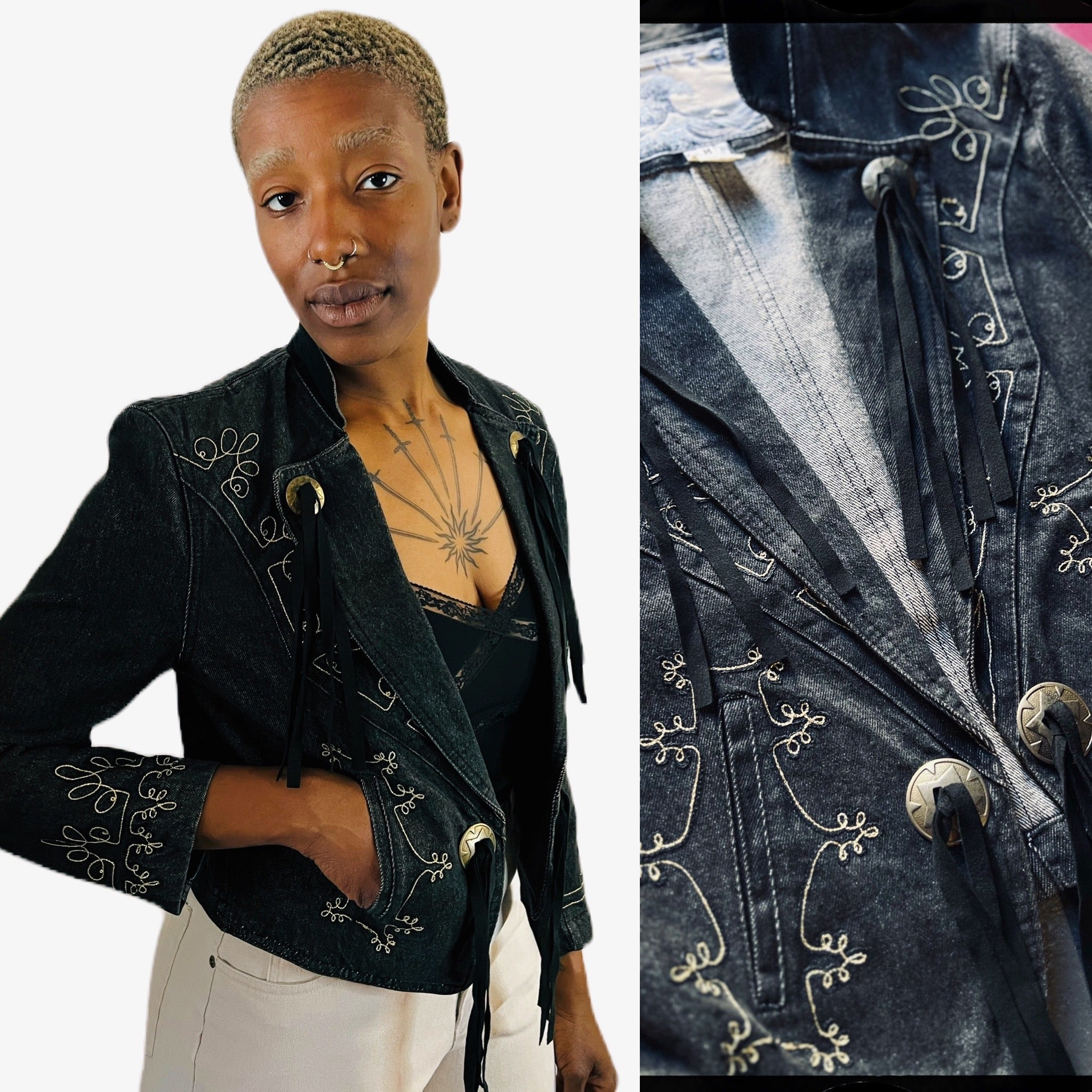 Kenzo Jeans royal Western vibes denim jacket with pockets! Gold embroidery details. Conchos with fringe at collar and waist. No closure. Faded black denim. Mandarin style collar. Great structure. Comfortable and just an easy jacket to throw on and wear to instantly elevate your outfit.