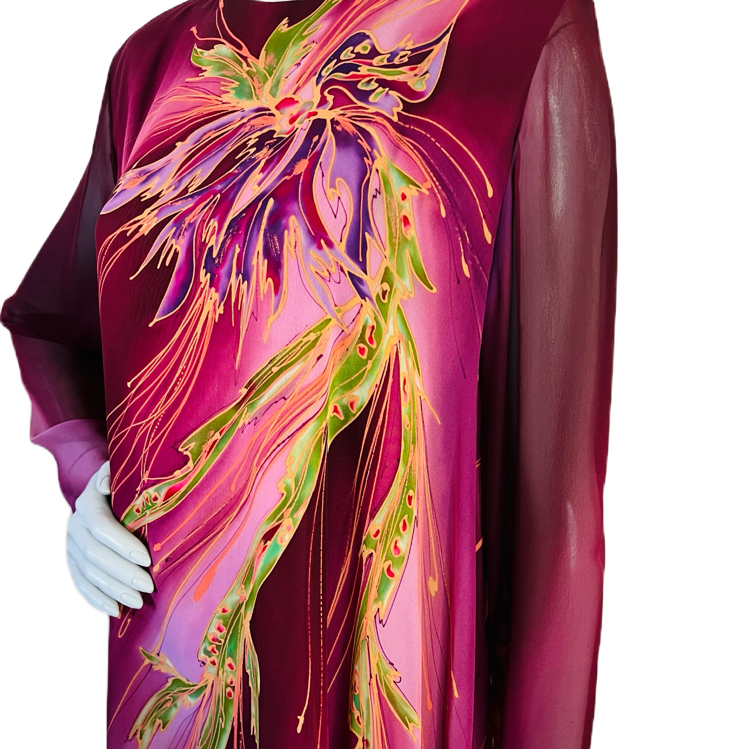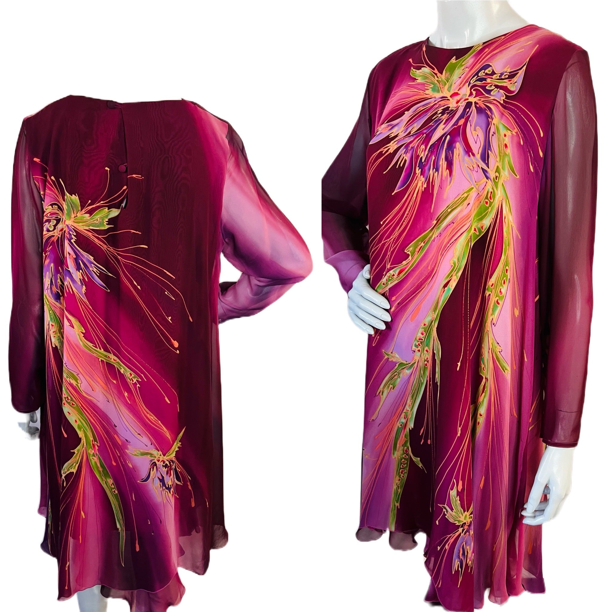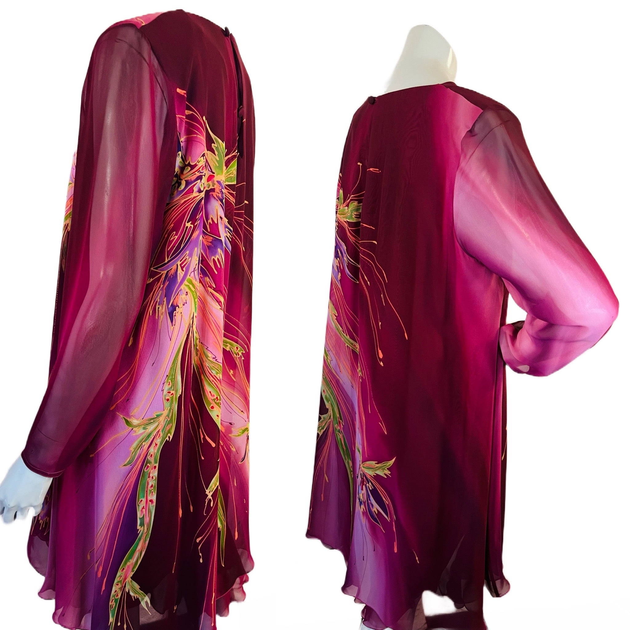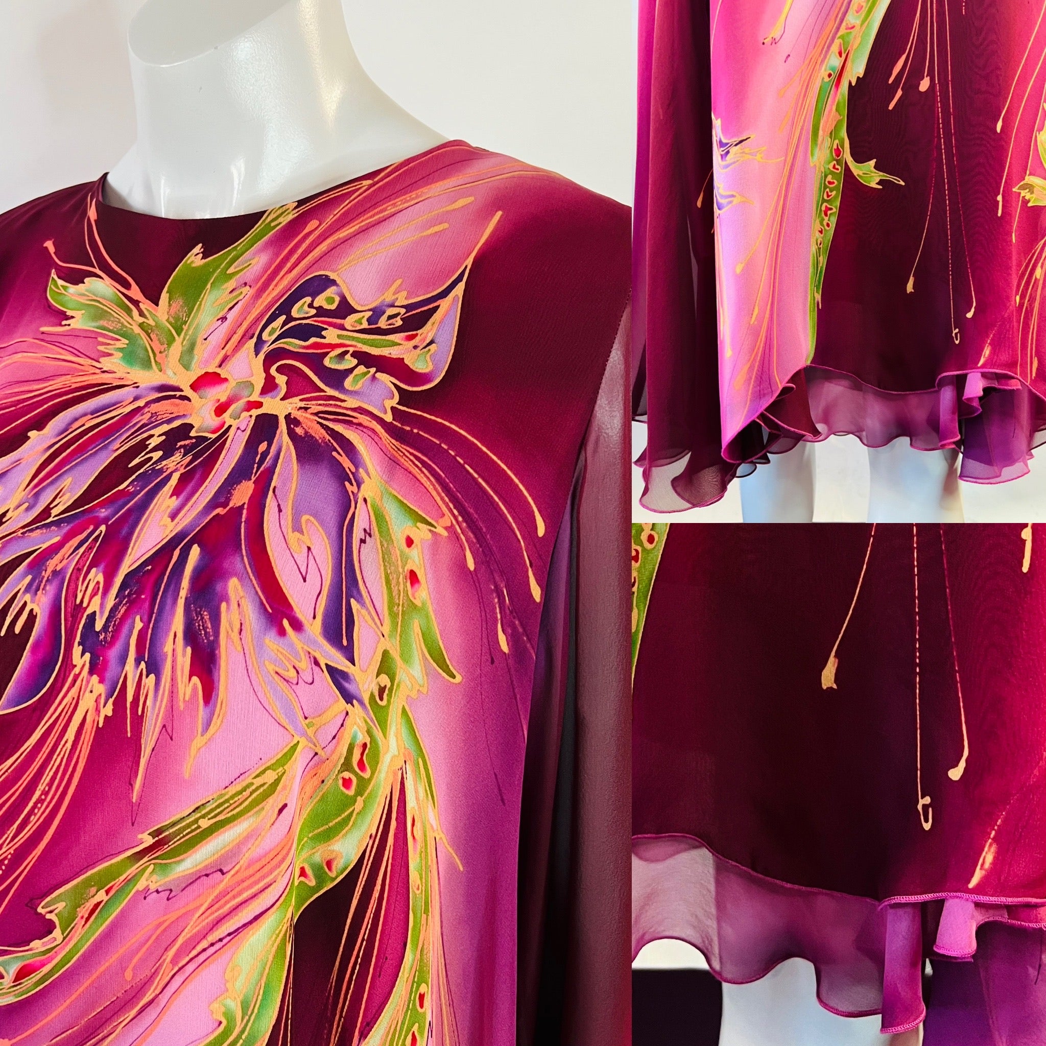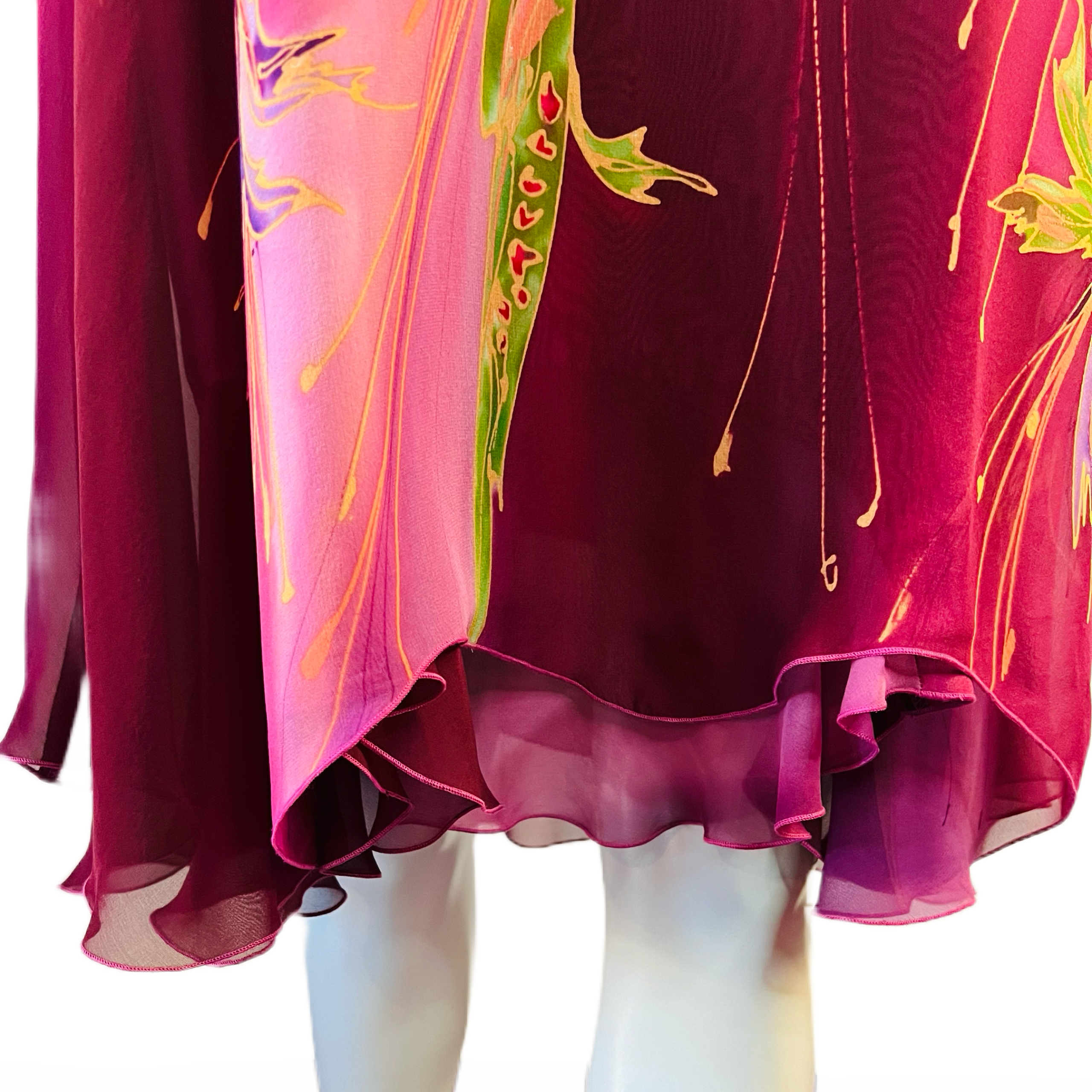 🎨Absolutely gorgeous burgundy & multicolor hand painted silk dress. Top sheer layer, bottom layer solid silk with sheer ruffle hem. Sheer ombre sleeves. Snaps at wrists to cinch if you'd like. Two buttons at back for closure. Stunning to wear as a shift or can be belted. Has gorgeous flow to the fabric.