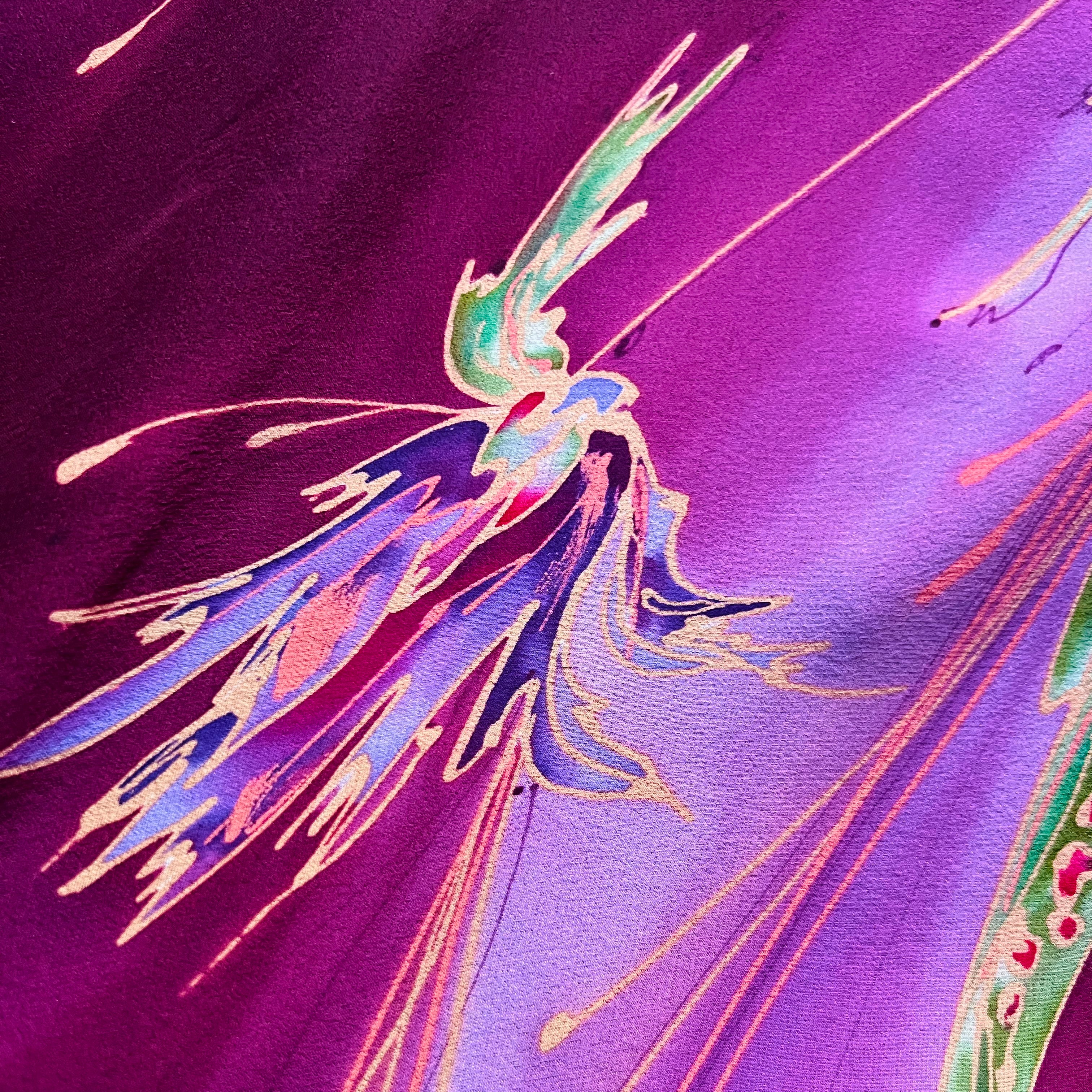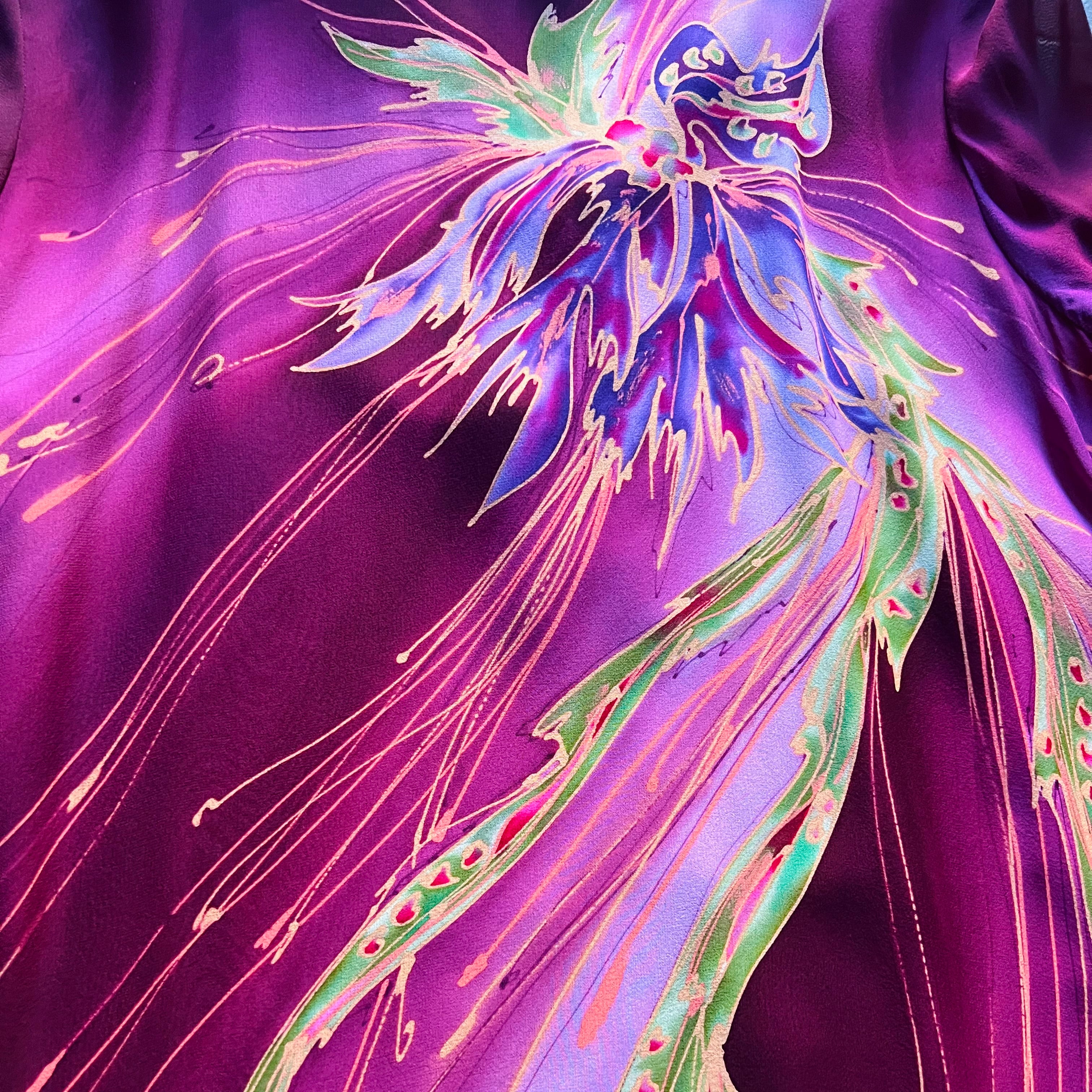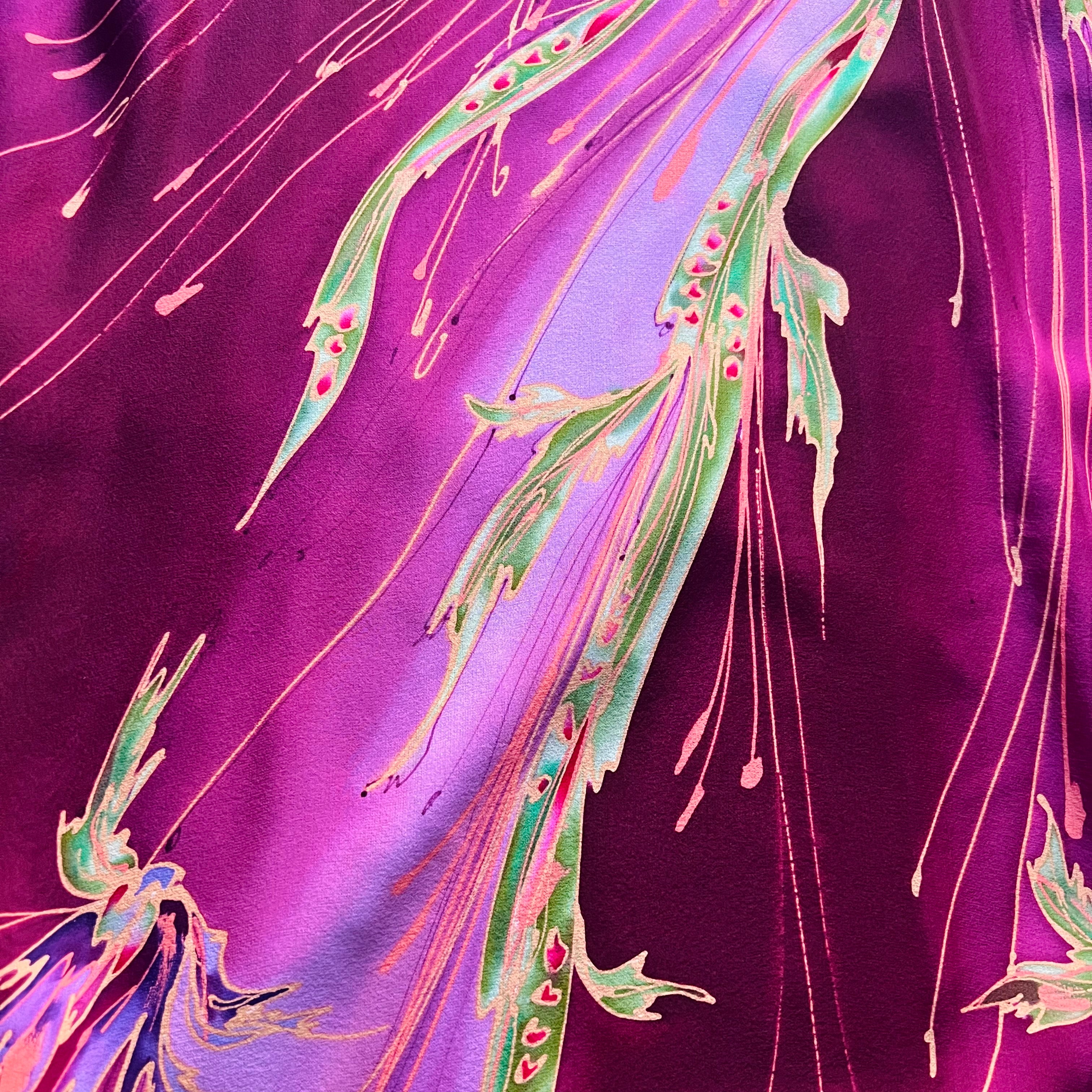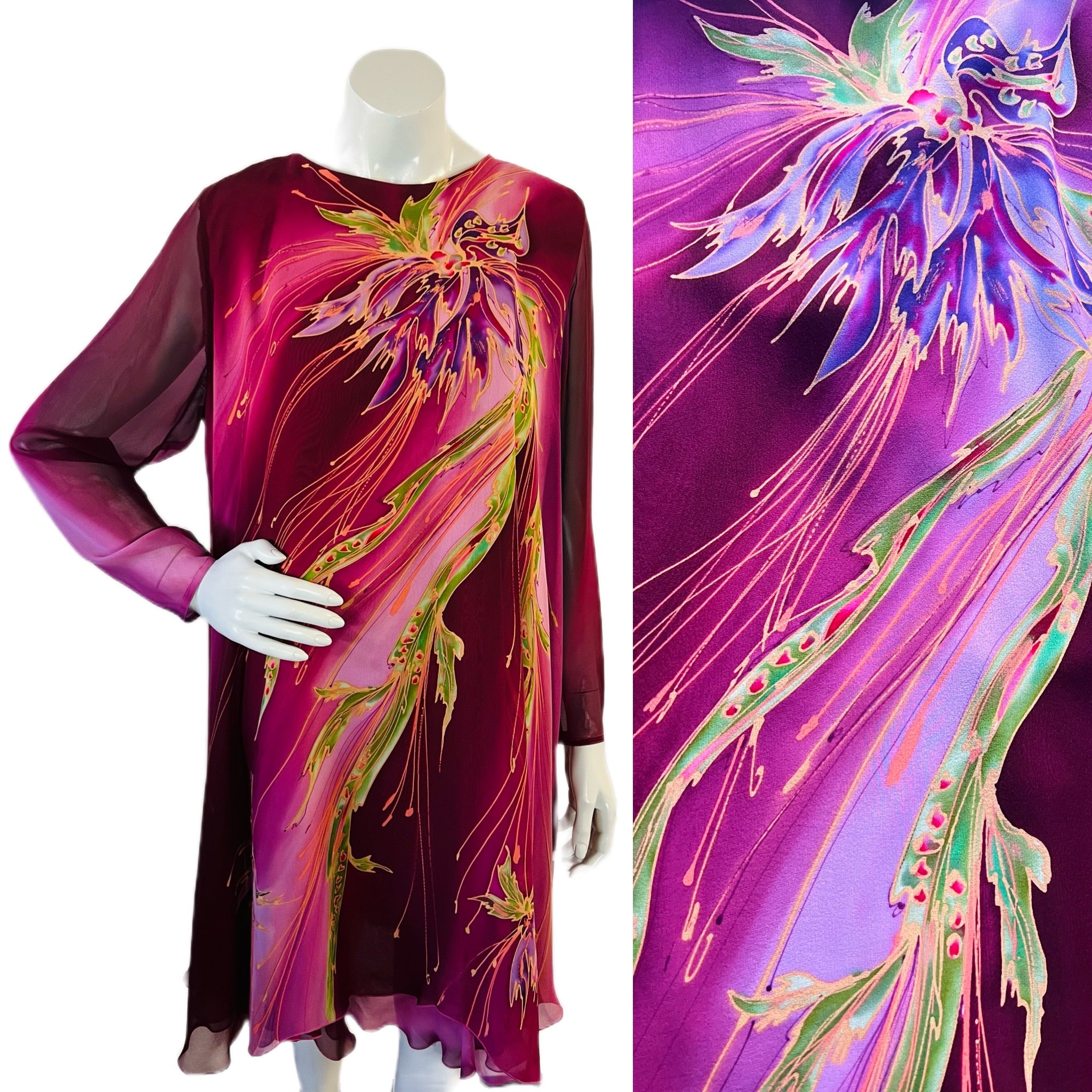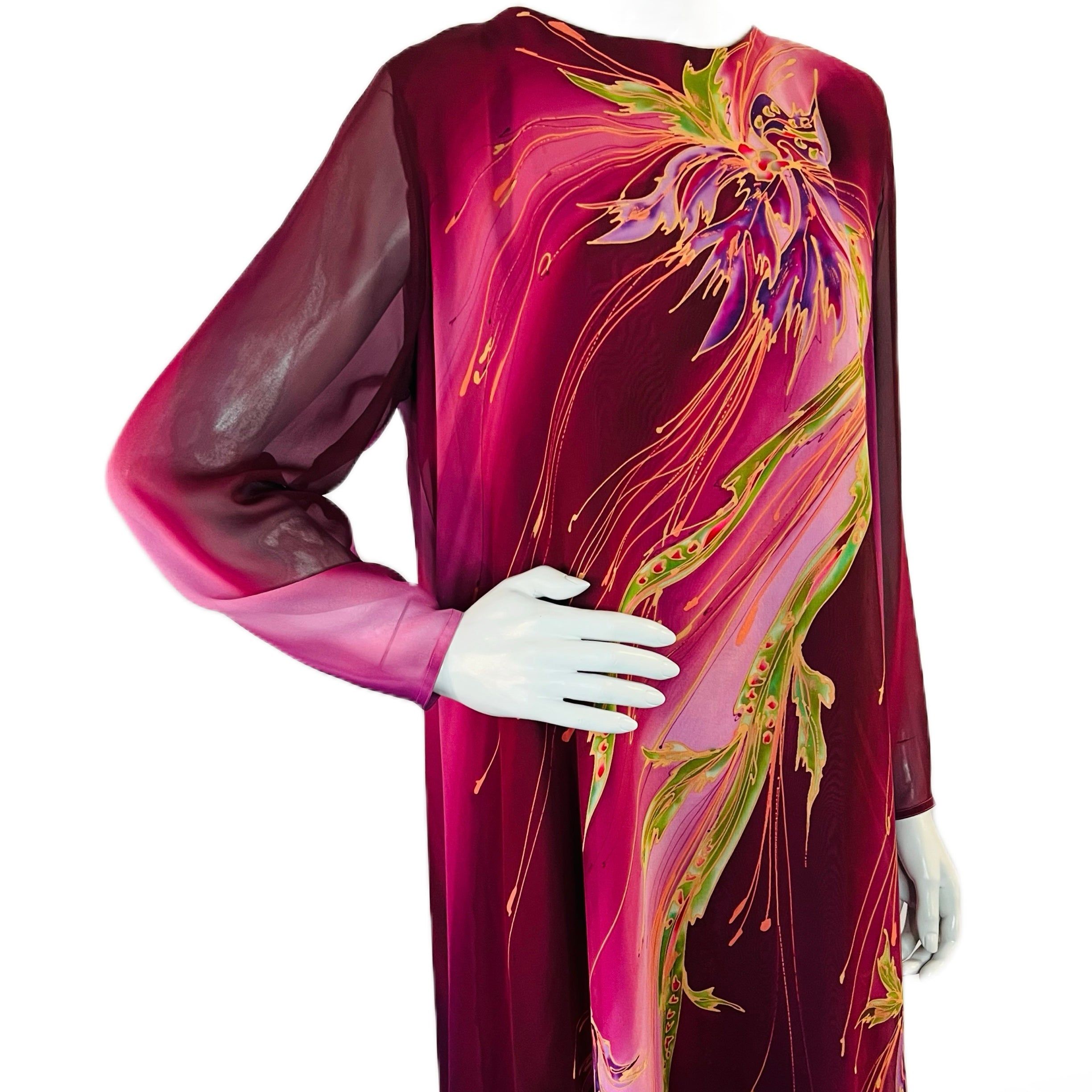🎨Absolutely gorgeous burgundy & multicolor hand painted silk dress. Top sheer layer, bottom layer solid silk with sheer ruffle hem. Sheer ombre sleeves. Snaps at wrists to cinch if you'd like. Two buttons at back for closure. Stunning to wear as a shift or can be belted. Has gorgeous flow to the fabric.