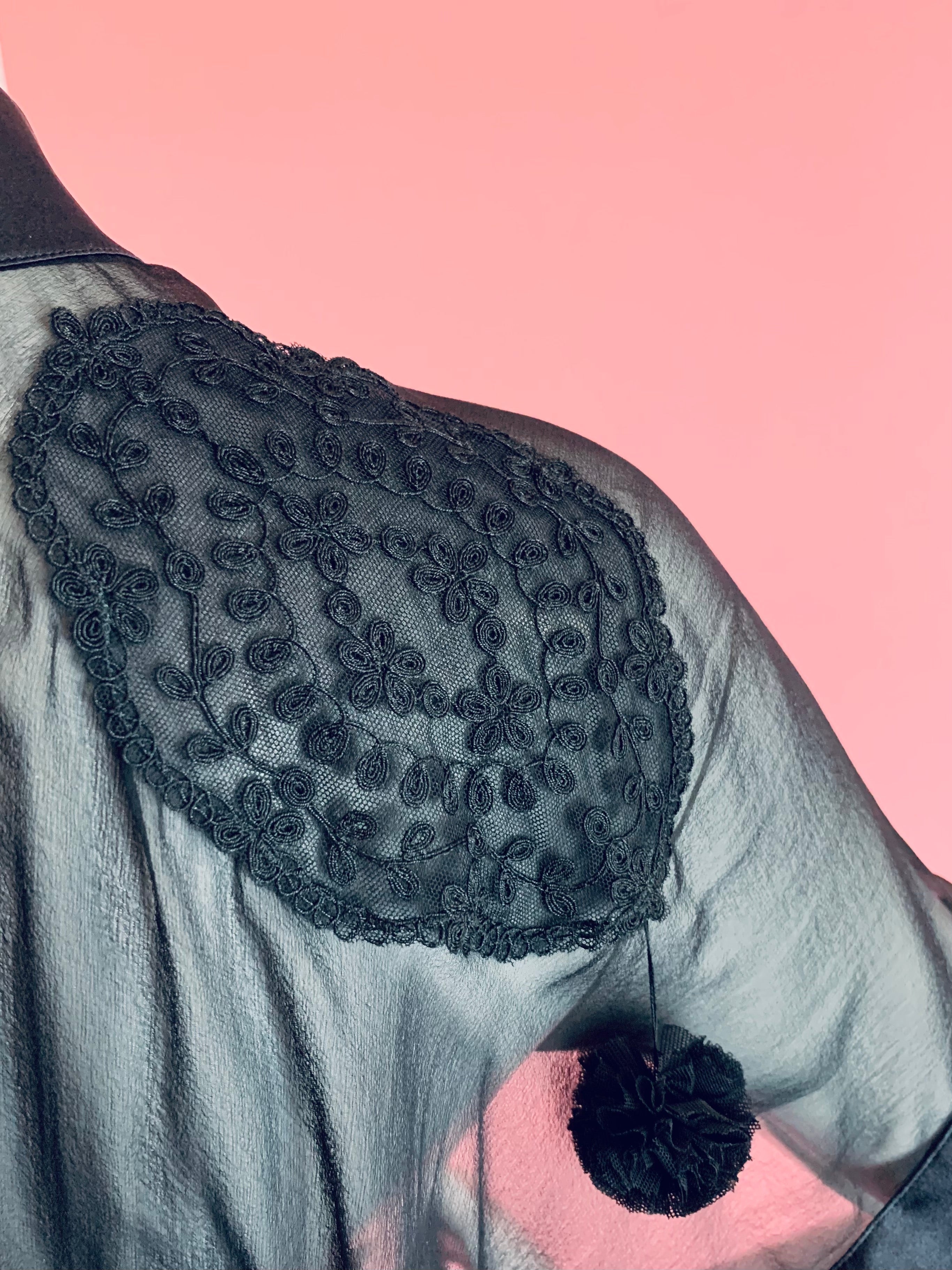 Stunning sheer silk capelet by La Perla. Black embroidered detailing with pom pom embellishment. Covered button for closure. Cropped in front. Dramatic v back. Comes with original dust bag. Pure gorgeousness!